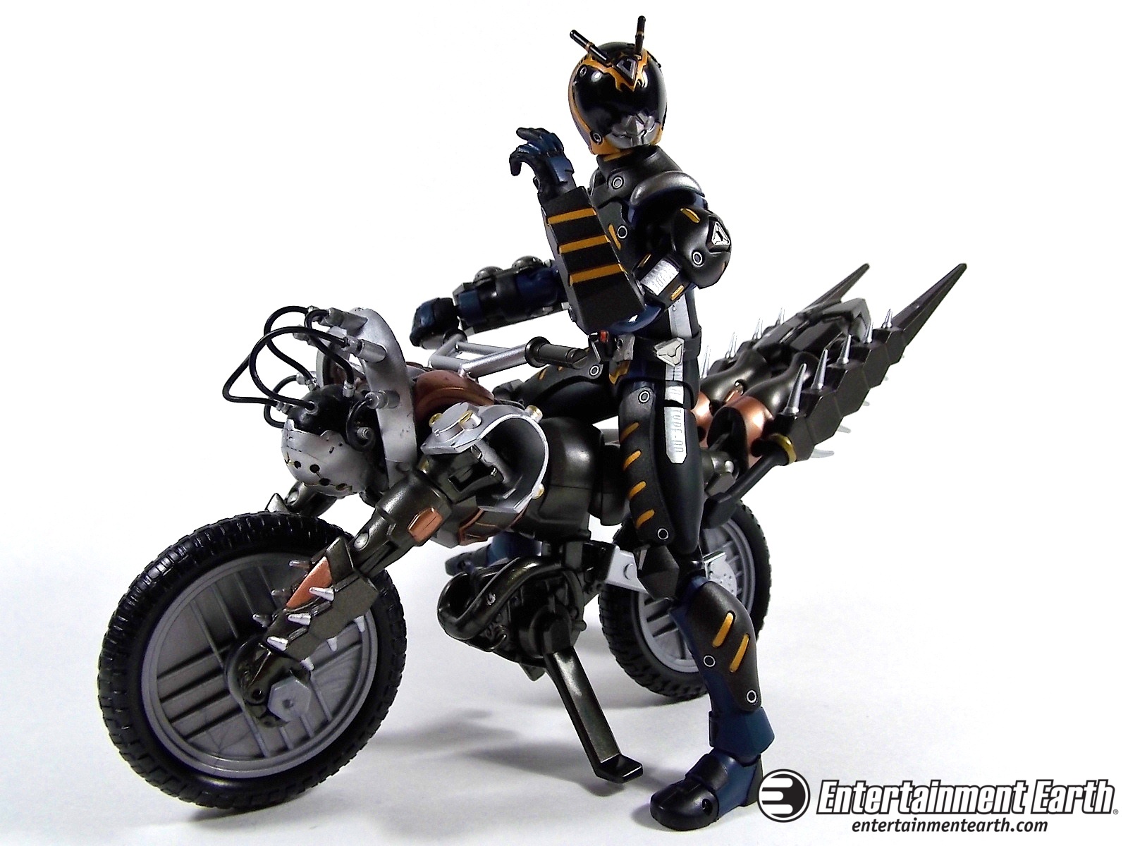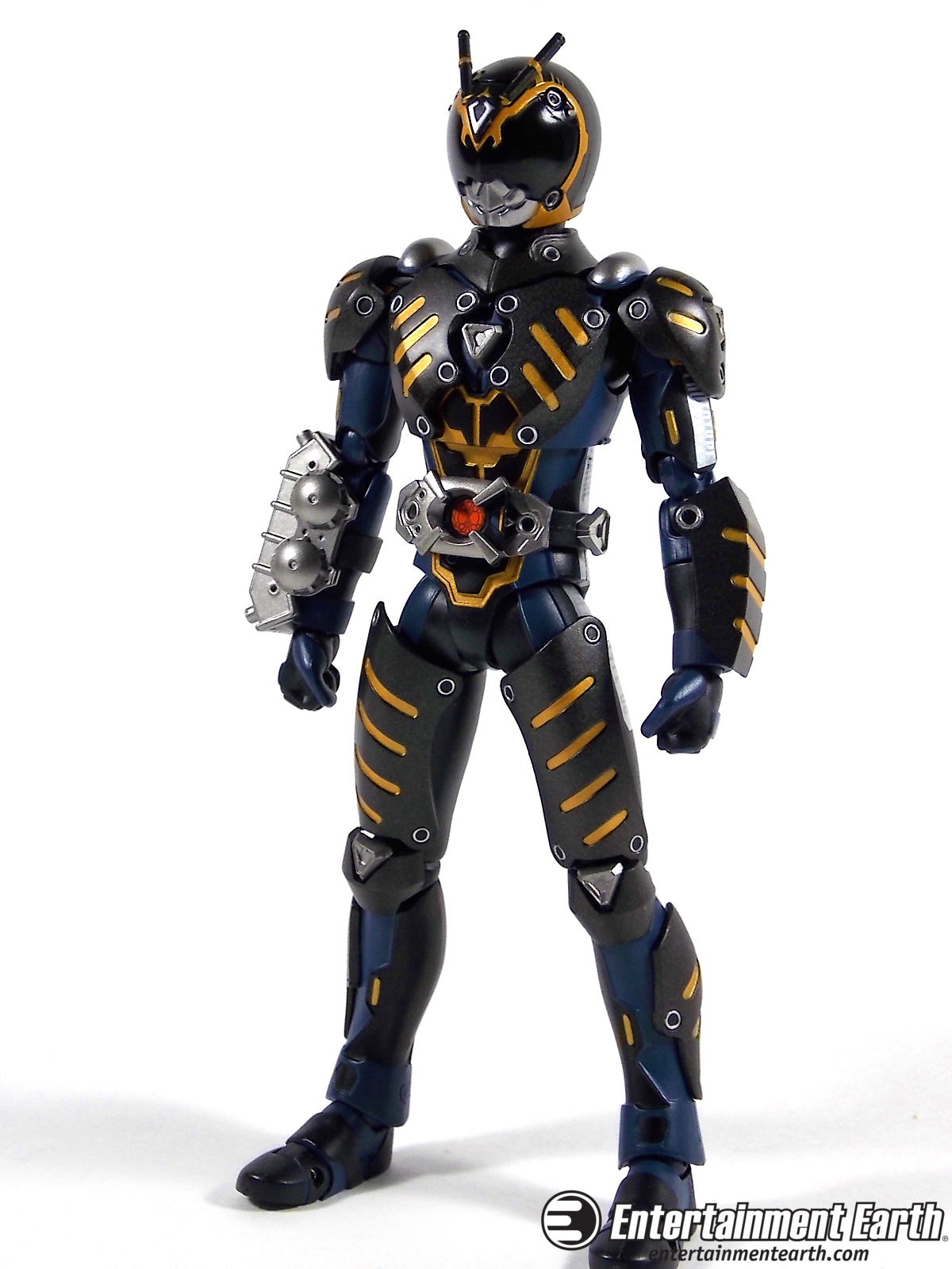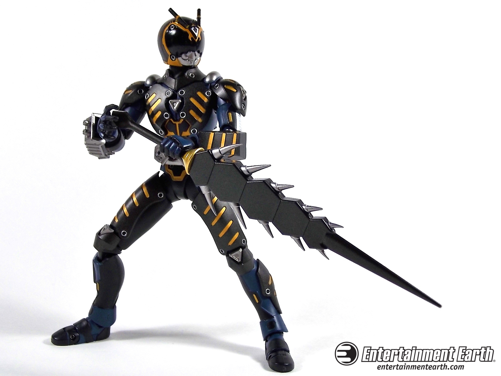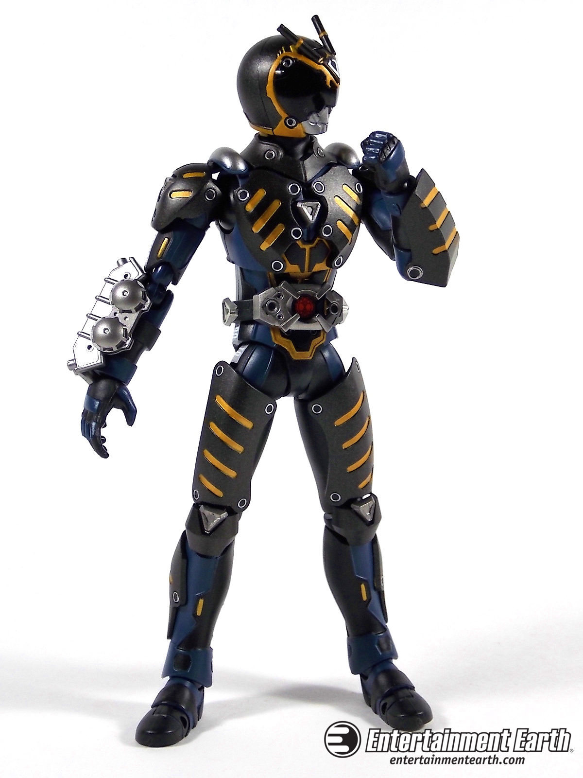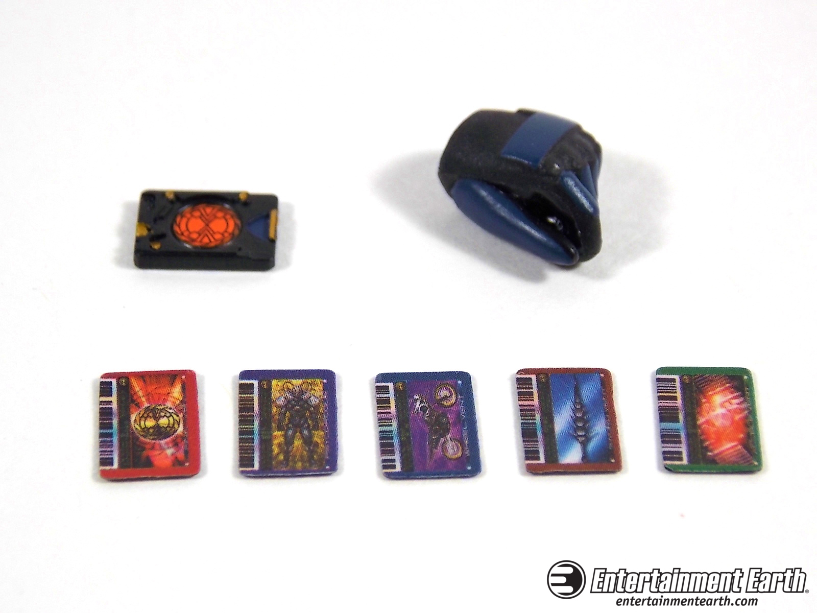 We're back with another gallery relating to Kamen Rider Ryuki! We're also happy to report and grateful that today's gallery was made possible by site sponsor Entertainment Earth. A little background. Alternative Zero, or rather the Alternative system itself, was created as an alternative (you see where this is going?) to the Kamen Rider Advent Decks made by Shiro Kanzaki. The mastermind behind this system was Hideyuki Kagawa. Who wound up becoming the user of the Zero system after the destruction of the only other system. Alternative was intended for mass production to counter the riders but only a single MP type, or simply 'Alternative', was ever made and subsequently destroyed. Leaving only Professor Kagawa and his Alternative Zero prototype system to fight the riders. An instigator of battles, even a victor of some, Kagawa as Zero would eventually meet his end at the hands of his twisted student Kamen Rider Tiger. All in the name of misguided heroism. As an S.H. Figuart Alternative Zero is absolutely gorgeous. Being one of the most intricately designed suits in Kamen Rider Ryuki, Alternative make this transition flawlessly. You'll notice that because this is Alternative Zero and not the standardized Alternative for mass production, that the prototype markings are still present on the suit. Down the rib cage and waste you'll see "prototype-00" tampographed on. The recently announced S.H. Figuarts Alternative will lack the proto applications and have a few minor paint apps that differentiate it from Zero. Just as in the show. Did I mention this figure is awesome? Despite being a very armored up character the articulation is superb. Perhaps the only hindrance is that the shoulder pads aren't on any sort of hinge. So it's best to swing the arm out somewhat before trying to pose it, so as not to knock the pad into the main body. An interesting byproduct of this figures articulation is that it can seriously hyper extend it's knees back allowing for some really dynamic posing. The headsculpt is dead on as well right down to the beautiful glossy black visor. Alternative Zero of course includes the regular compliment of extra hands as well as his trusty Sword Vent weapon, the spikes of which are quite sharp. And of course what would an S.H. Figuarts Ryuki release be without advent cards! Alternative Zero includes 5 Advent cards and just like his rider counterparts these cards can be "scanned" through his Slash visor, mounted on the right forearm. The included cards are: