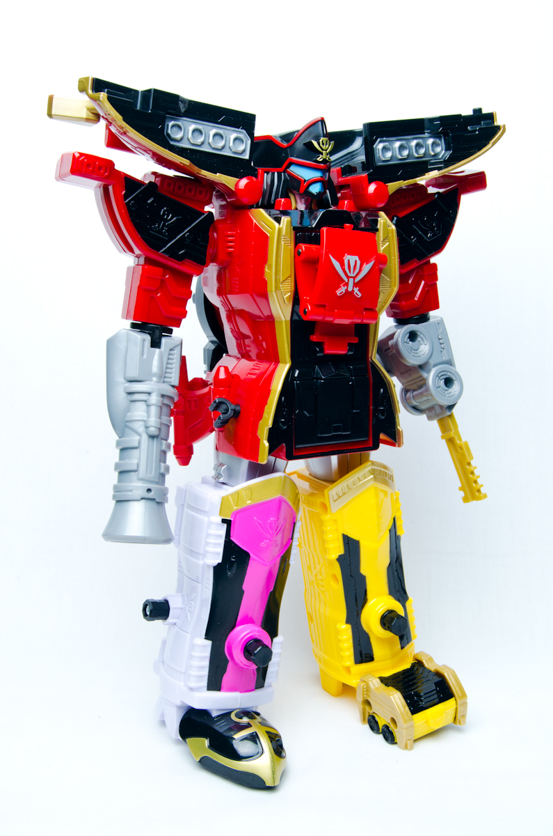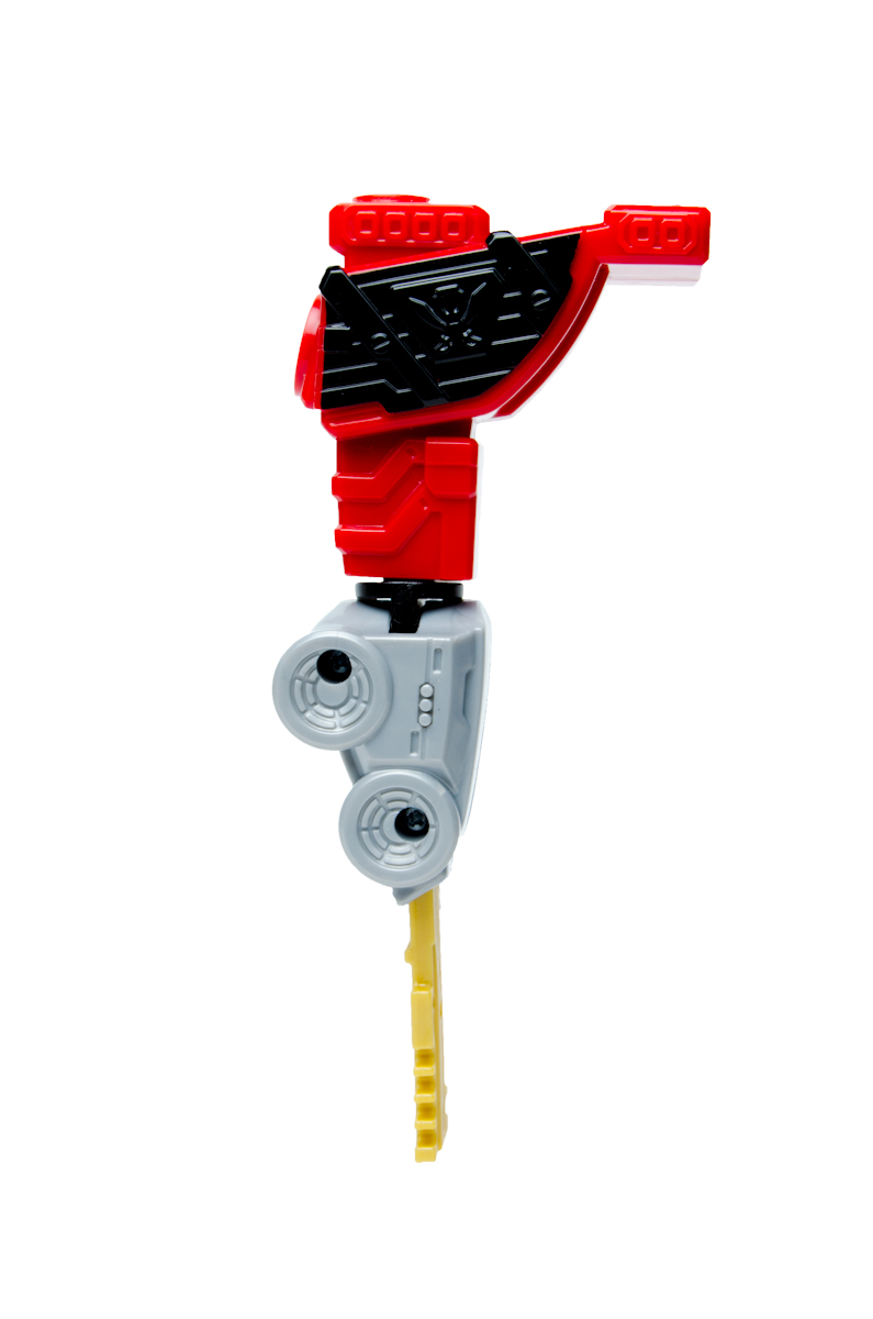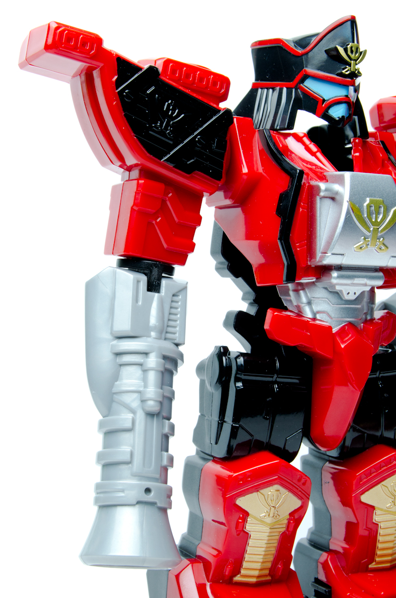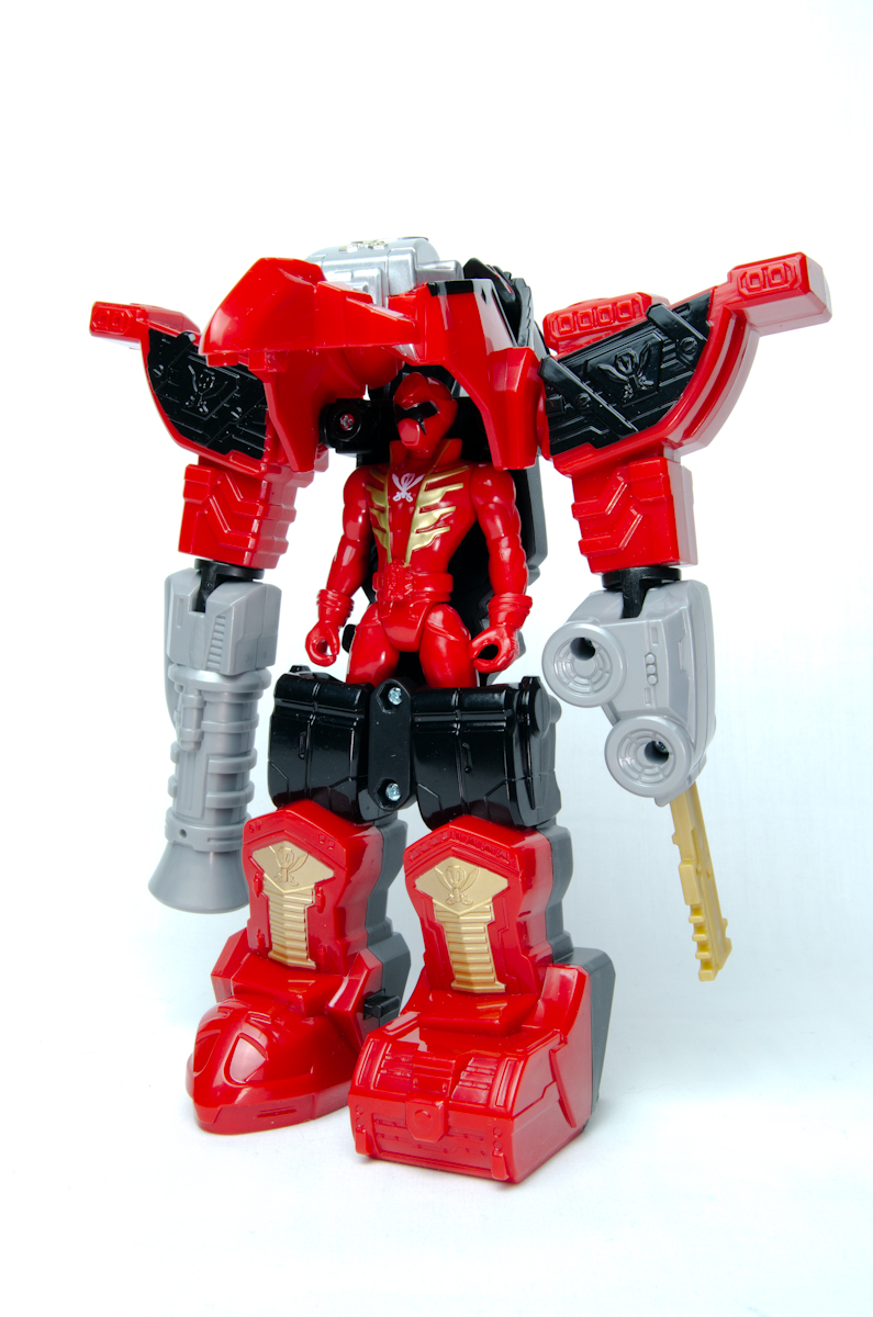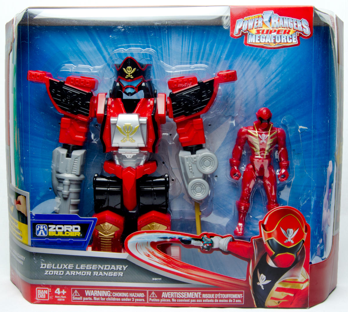 Today we're taking a look at the Deluxe Legendary Zord Armor Ranger set recently released with the Deluxe Gosei Great Zord Armor Ranger as part of the Power Rangers Super Megaforce toyline. This set is loosely based on the Legendary Megazord but has a more cohesive red, black, and silver color scheme. The Megazord has 8 limited points of articulation including 3 in each arm and 1 in each hip. As a part of the Zord Builder system, this Megazord has a total of 10 ports including 2 male connector pegs and 2 female ports on the torso, 1 male connector peg on each 'forearm weapon', 2 female ports in each shoulder piece, and 1 male connector peg in each hip. The set comes with a 4 inch Super Megaforce Red Ranger figure that is able to fit in and 'pilot' the Megazord. The Ranger figure has 4 points of articulation and a simplistic paint job on top of red plastic. The figure comes with no weapons. The right Cannon 'forearm' of the Zord Armor Megazord can be detached and placed in the chest of the DX Legendary Megazord. The left 'Key' forearm of the Zord Armor can be detached and used in either the DX Legendary Megazord or the DX Legendary Morpher. When used with the morpher it unlocks the Super Megaforce Red and Summon Skyship sounds. With the Zord Armor Megazord's multiple Zord builder pegs and ports, multiple cross-line combinations can be made. The two 'official' combinations shown between the item's box art and instructions are to attach the arms to the DX Legendary Megazord or to use the whole armor as an arm on the DX Megazord. All in all, the DX Legendary Zord Armor set is an odd one. It's a gimmick-filled toy simply made to pad out the toy line, but it does have a lot of playability. The integration of the key gimmick as a weapon/arm/ is clever and so far, this set is the only way to get the chest cannon to complete the DX Legendary Megazord. Last edited by conundrum; 02-02-2014 at 11:00 PM.. |
