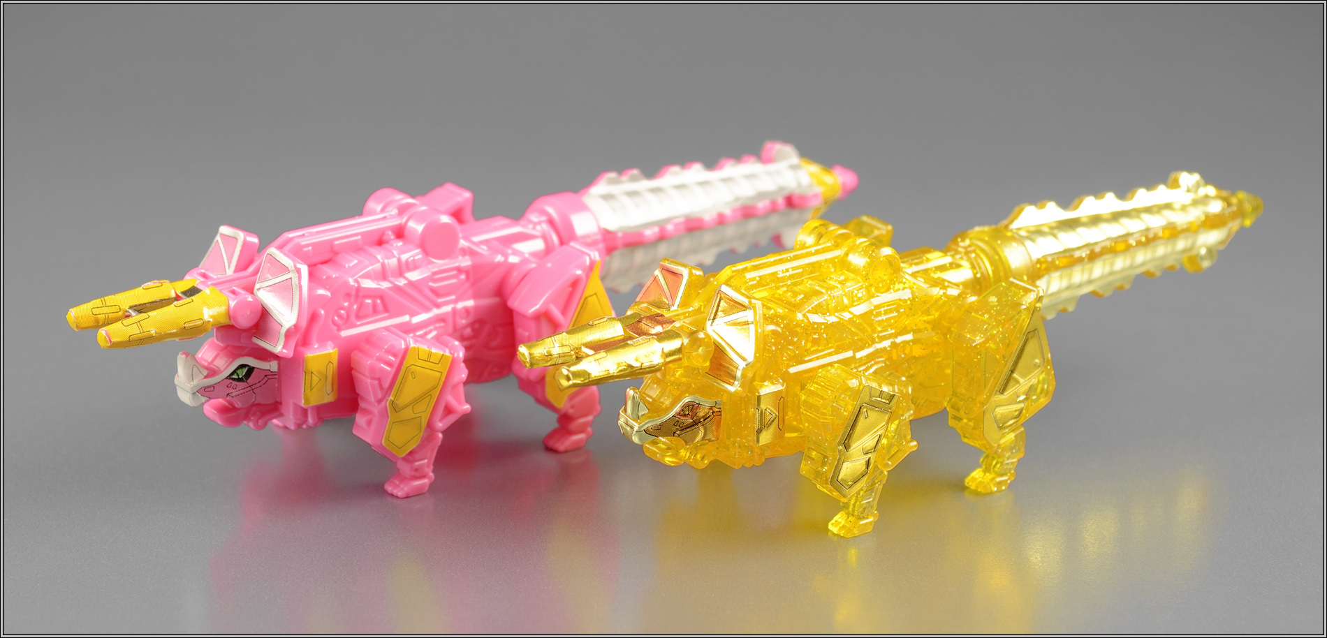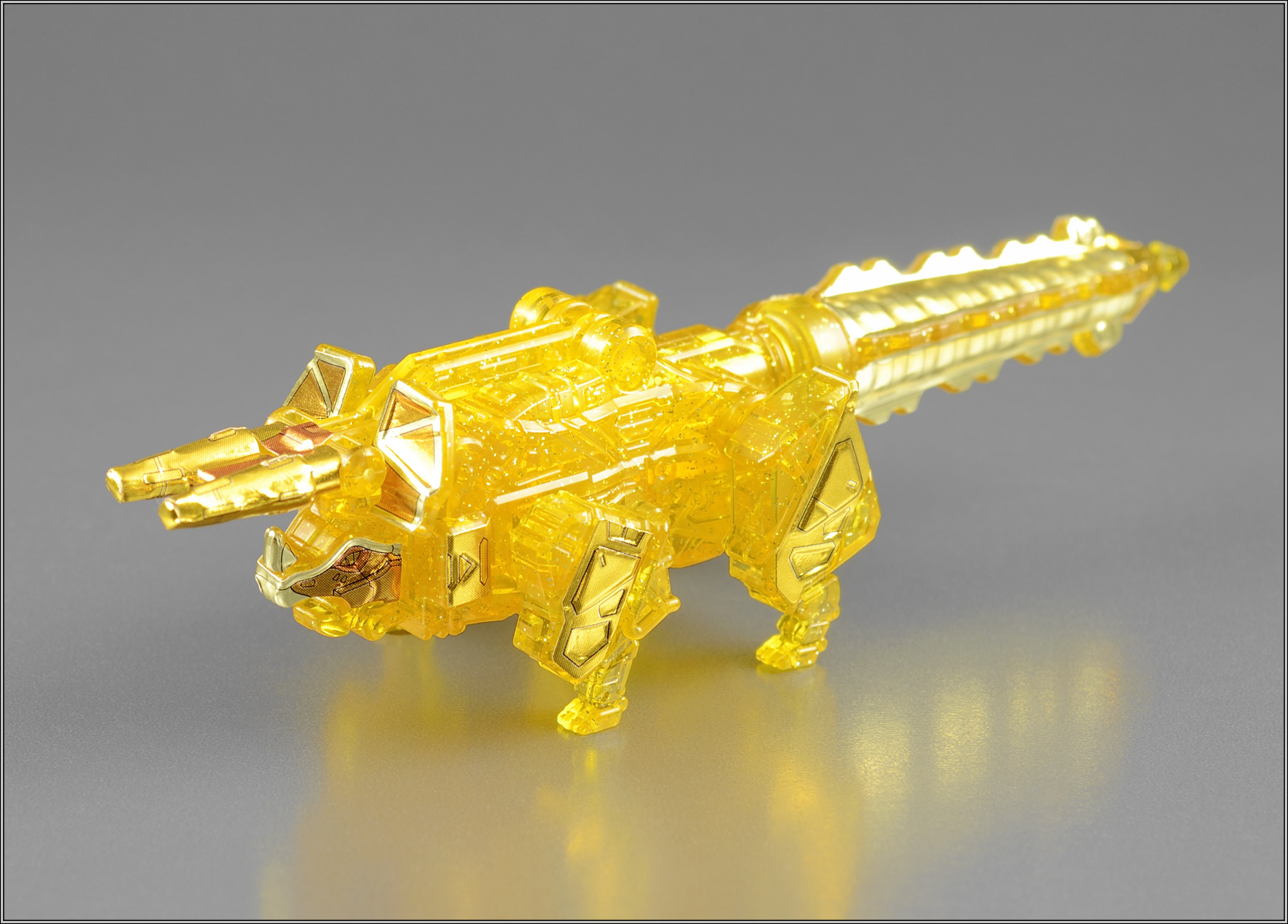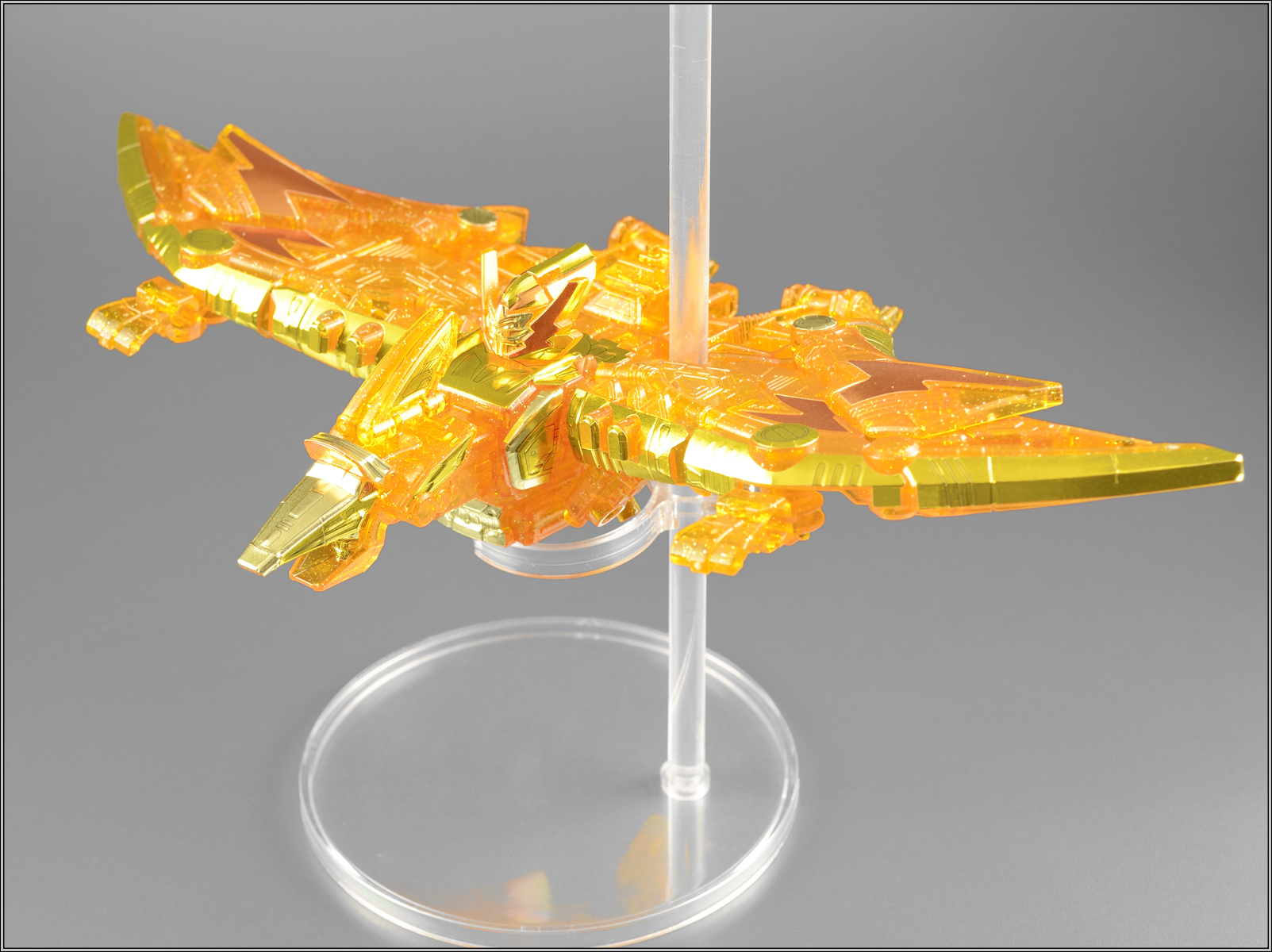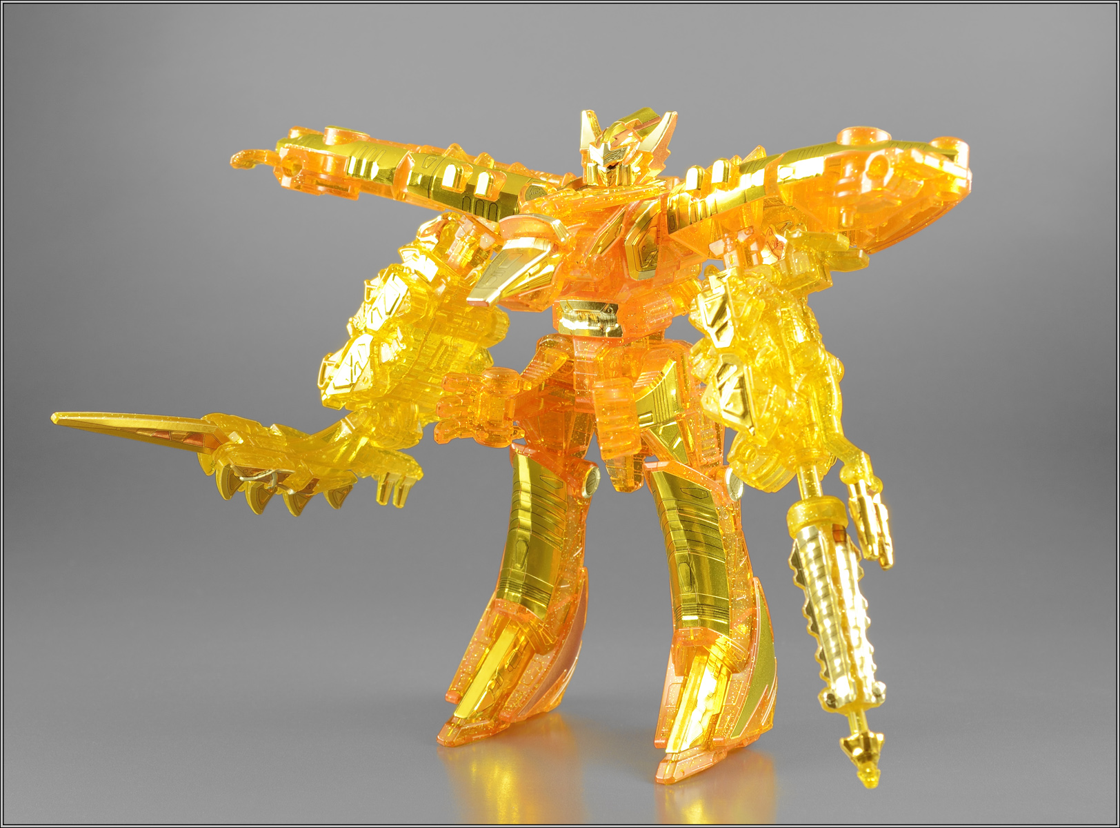 It isn't really worth mentioning but the Lighting edition only came with one piece of candy rather than six. That's normal for these types of box sets, but honestly one piece is more than enough. I still taste it.. Similare to the previous Pla special eidtion, Gobuster Oh Meteor, this set is done up in a glittery translucent plastic but has a unique orange and yellow color scheme, It also includes chrome gold/silver lables. The model is pretty impressive to see in person. The colors are meant to mimic Raiden Kyoryuzin's finishing move, Lightning Brave Finish, hints the model's name. With any luck we'll see a ToQoh done up in candy like transparent colors!