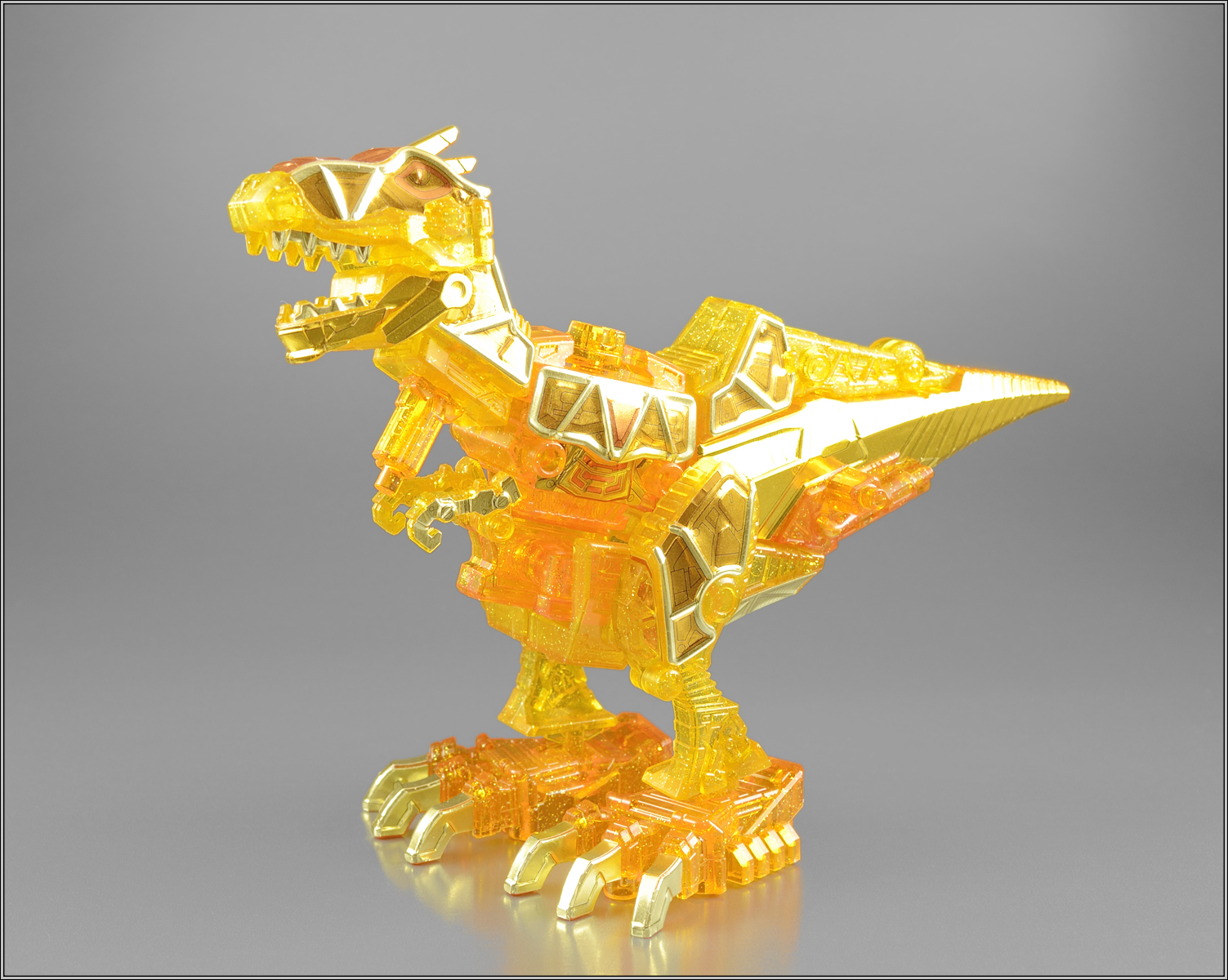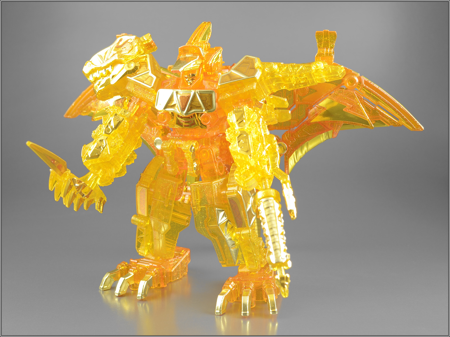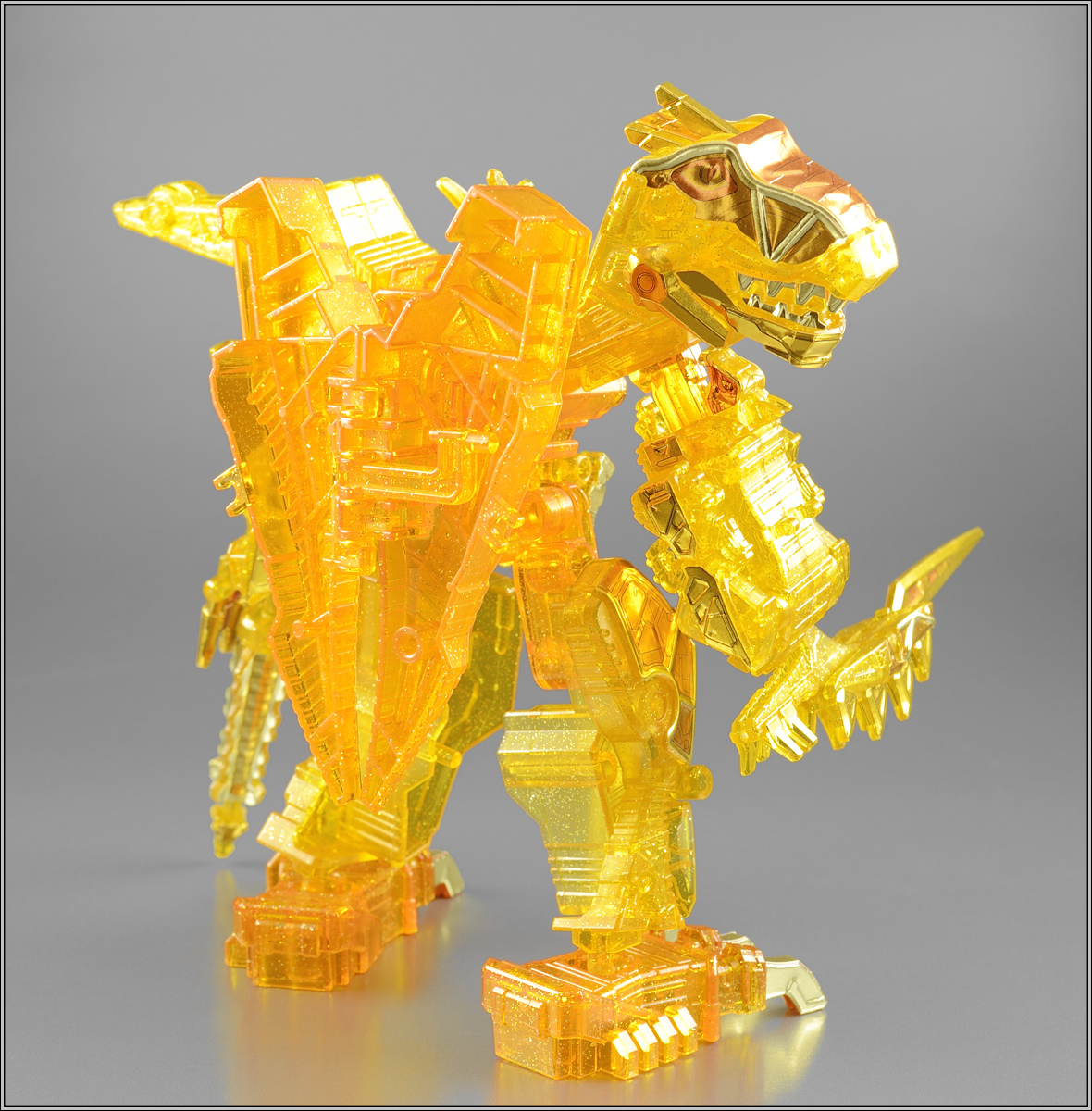 It isn't really worth mentioning but the Lighting edition only came with one piece of candy rather than six. That's normal for these types of box sets, but honestly one piece is more than enough. I still taste it.. Similare to the previous Pla special eidtion, Gobuster Oh Meteor, this set is done up in a glittery translucent plastic but has a unique orange and yellow color scheme, It also includes chrome gold/silver lables. The model is pretty impressive to see in person. The colors are meant to mimic Raiden Kyoryuzin's finishing move, Lightning Brave Finish, hints the model's name. With any luck we'll see a ToQoh done up in candy like transparent colors!