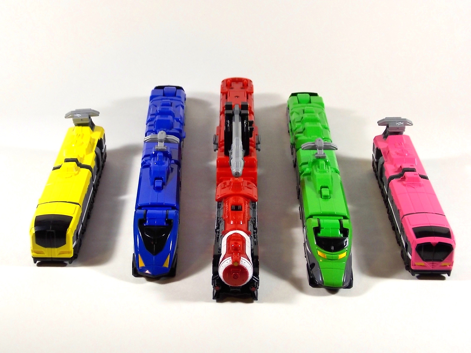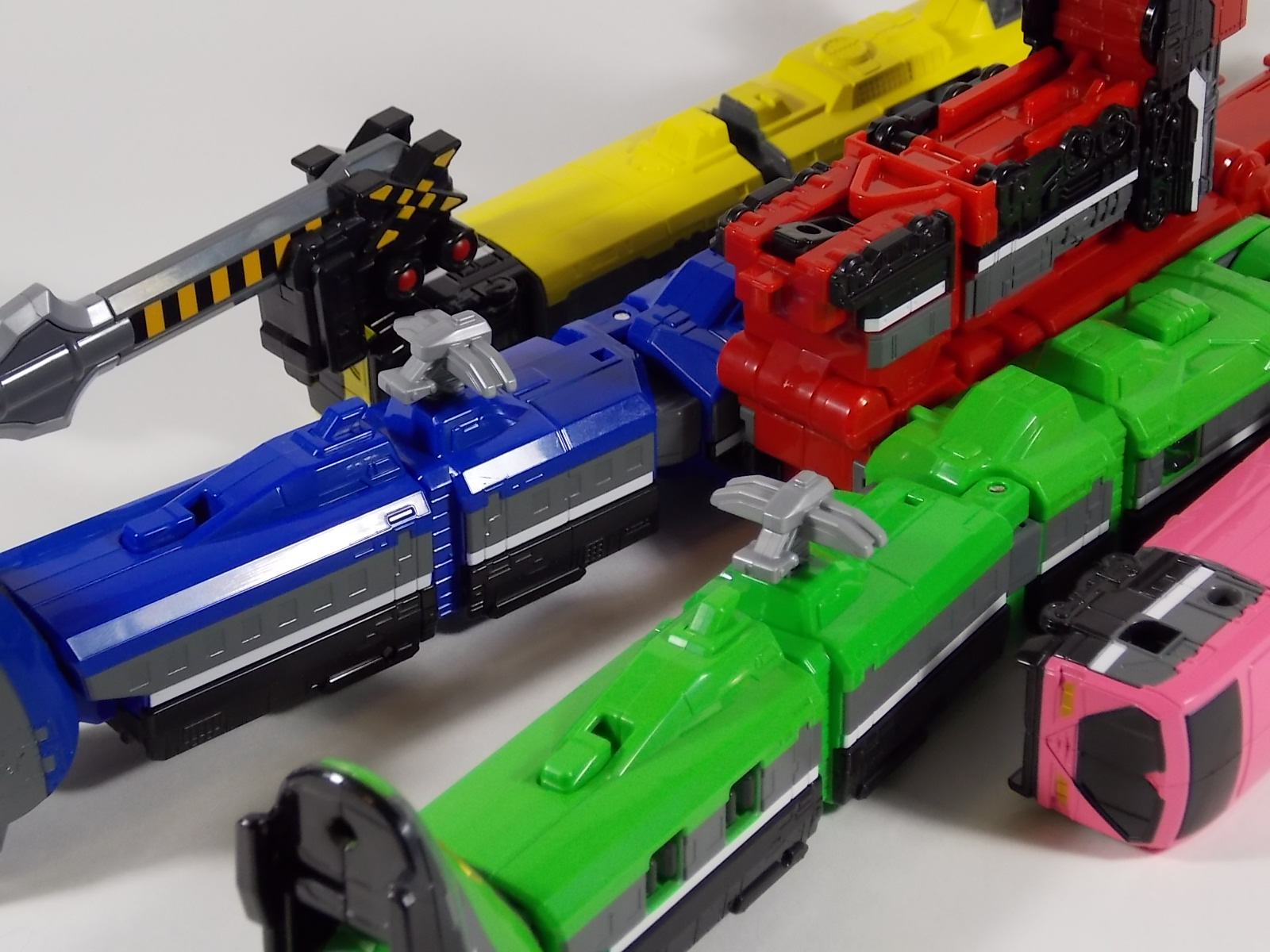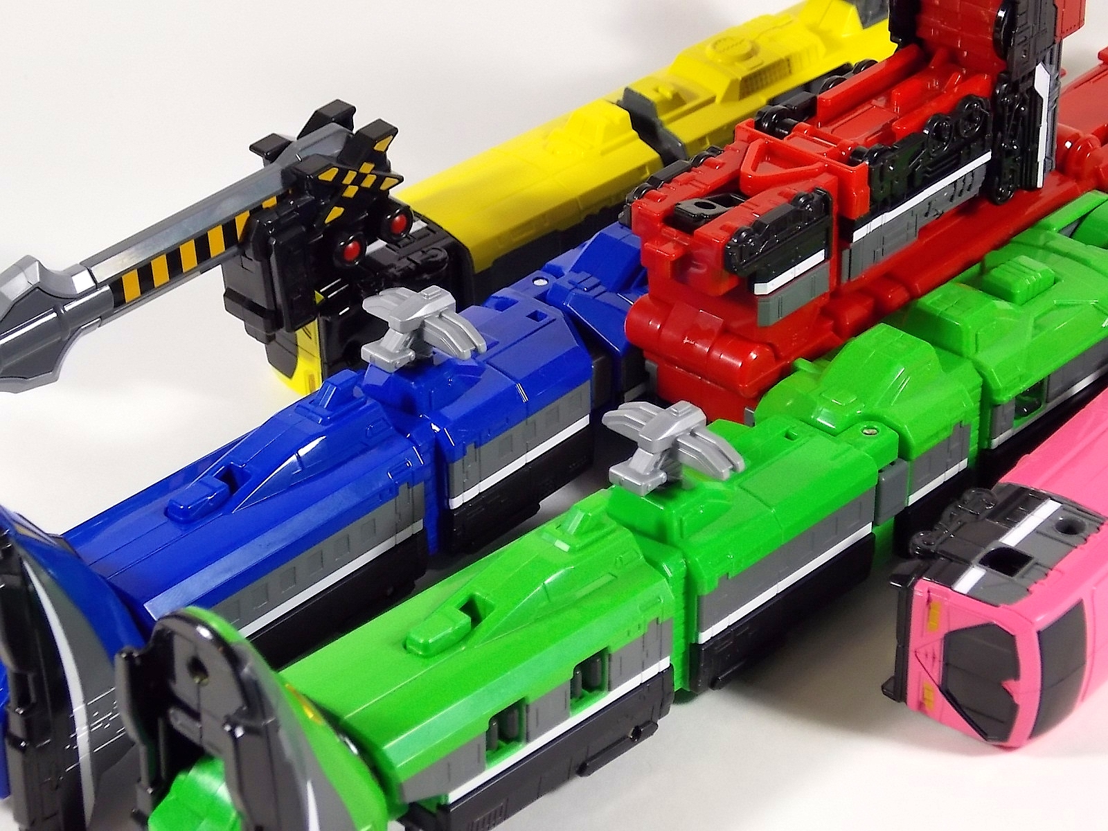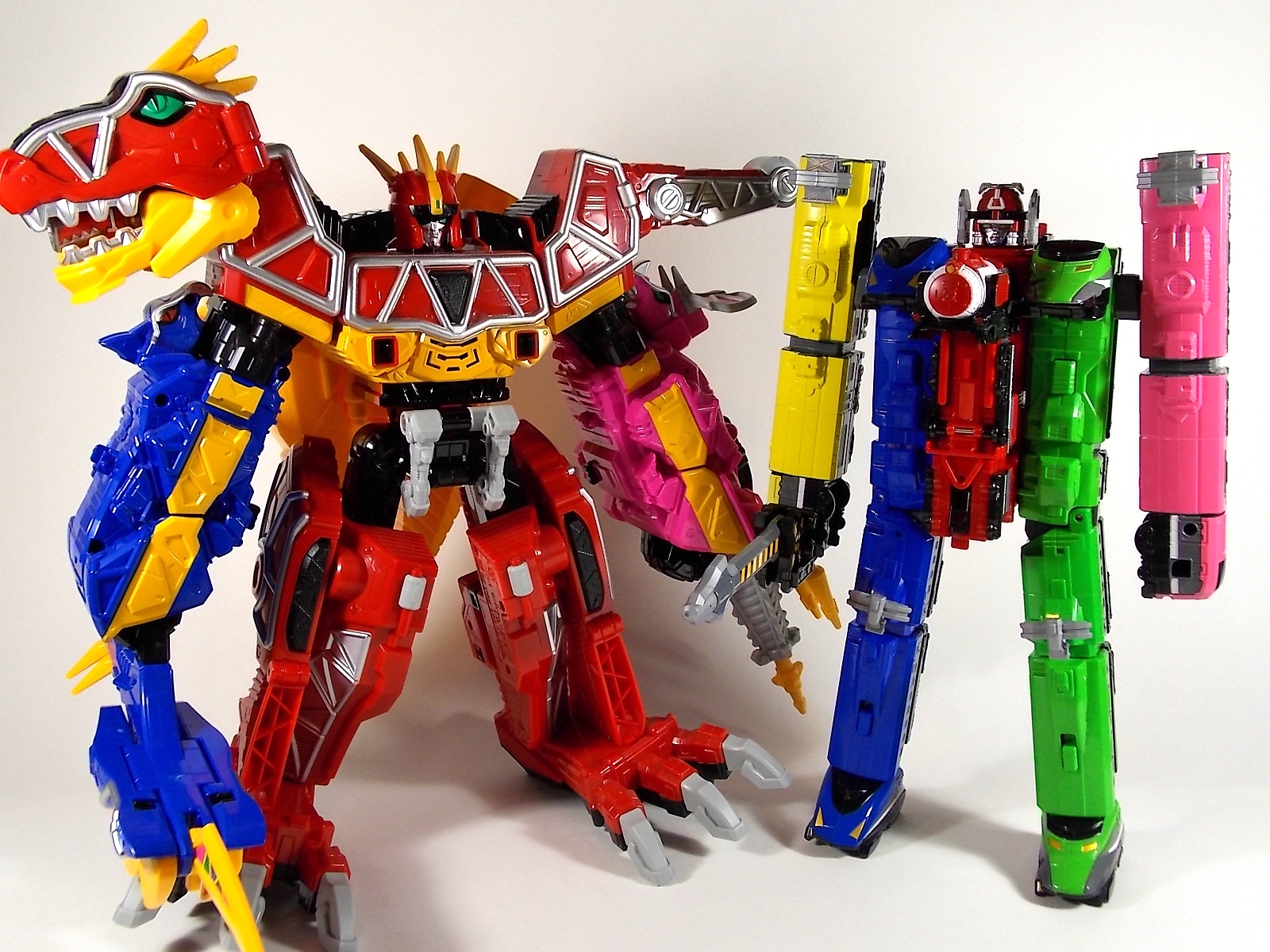 **We've got so many images that this bad boy takes up 80 images across two posts! Scroll down to the second post of this thread to see the second half! DX ToQ Oh is of course from everyone's favorite new train themed sentai, Ressha Sentai ToQger. And though we're only 3 episodes into the series it's already shaping up to be a really fun rider But enough about that, onto the toys! DX ToQ Oh is composed of the 5 main Resshas (trains) from the series. Red, Blue, Yellow, Green, and Pink Resshas. Plenty of people have expressed concerns that this mecha both on screen and in toy form is plain and simplistic. Let me assure you it is neither. To start with the Ressha's themselves are more complex than one would initially think. Out of the box they are each one long train piece with no moving parts. However, in the midsection of each Ressha is a really nice square connecting joint. Some pressure tabs hold these joints in place but I can safely say they are some of the sturdiest connections you'll find on a sentai robo. When released you can flip out an alternate tab underneath the peg that can hitch the two "cars" of each Ressha together. Thus giving them a moveable joint in the middle like the linkage between real rail cars. This joint is what also allows you to remove the main engine of each Ressha, to use them with the DX ToQ Changer. That's right, each forward section of the Resshas is fully compatible with the Changer. Small sets of tabs placed at varying intervals on the bottom of each car determine how the Changer detects them. Of course the secondary cars can not be used in this manner. But more to the point the joints in the middle of each train allow you to create one very long vehicle. These trains may be small but they more than make up for it in functionality. While the size has been a point of contention with this set, reasonably so, in hand you really don't notice. This set really needs to be seen in person to appreciate it. Neither my pictures nor baltmatrix's review can really get the point across the same way actually handling it would. To combine the resshas for ToQ Oh you can 100% mimic the TV counterpart. The Resshas line up in a row, then very nice very awesome sliding locks on either side of the Blue & Green Resshas slide right into place on Red. These are very firm connectors and Bandai NEEDS to use them more. Pink & Yellow have fold out peg joints to plug into the shoulder so that's pretty straightforward. Then we need to do the naughty bit of the transformation and fold up Red Ressha. Some traditional Bandai DX clips hold this piece in place but the ammount of force needed to use them is minimal. We probably won't see the same kinds of breakage occur like last year with Kyoryuzin. And in fact these clips are strategically placed all over ToQ Oh. We will most certainly be seeing some big combos when other Ressha are introduced. The clips on the bottom of both feet, the sides of the legs, and the tops of shoulders strongly imply this. Now you just need to fold the feet up and rotate the hands. The feet by the way have a pair of locks on them so they don't rotate while the robot is standing, much like DX Gosei Great. Again very smart, and very secure, thanks Bandai! Then rotate the shoulder pads down, stand him up, fold the second half of Red Ressha down, and pop the head up! Oh and open the awesomely detailed train "doors" that conceal the head, and ToQ Oh is formed! There's also the included train crossing themed sword Fumikiriken. Nicely enough it can be stored on Red Ressha while in vehicle form. Looking at this set as a whole I am impressed, damn impressed. Bandai has cleverly engineered this thing. It's as efficient as it can be and really pulls off the look of it's show counterpart. Could it have elbows? Sure, but then you would loose the separating pivoting joint the cars use in train form. Overall this is a very impressive piece that still stacks up well to the last few years of sentai DX robos. If anything it's size is indicative of much larger combinations to come just like the DX Go-Buster Ace of 2 years ago. I HIGHLY recommend you pick this set up. The Ressha modes are really well done with absolute mountains of detail and the Robo mode is a joy to see and handle. A+ Bandai!
