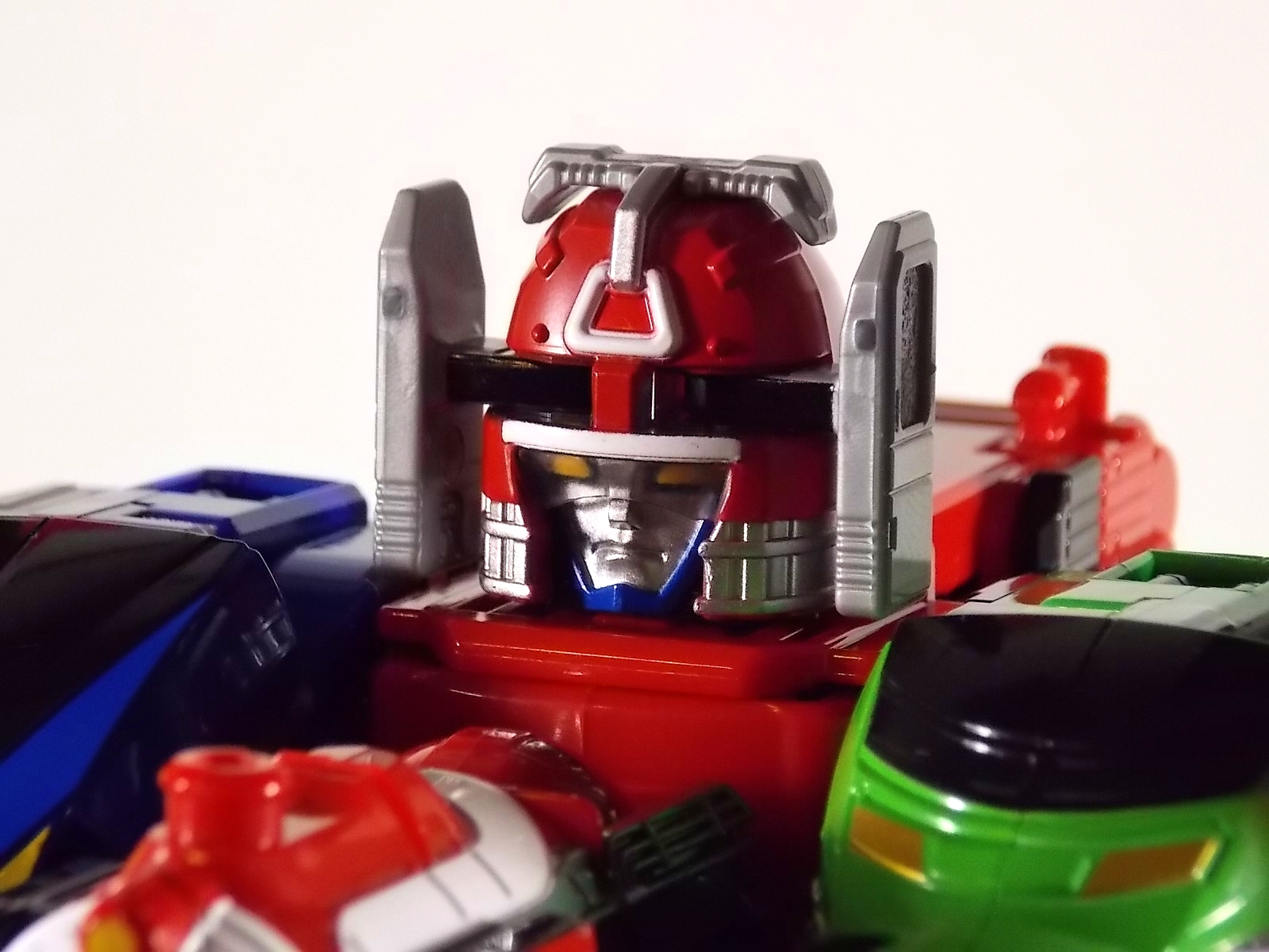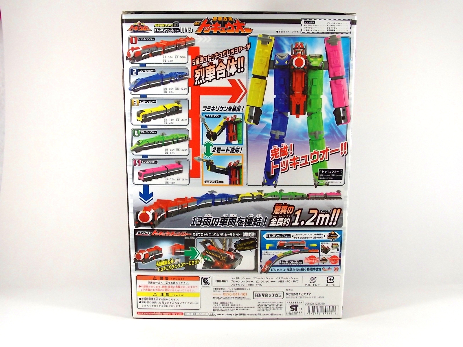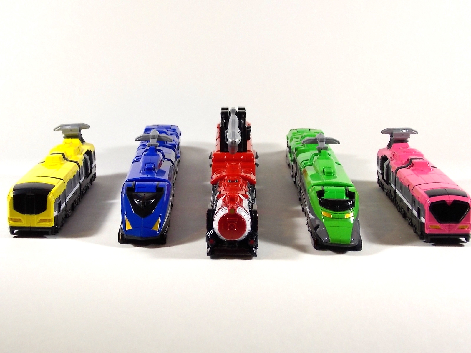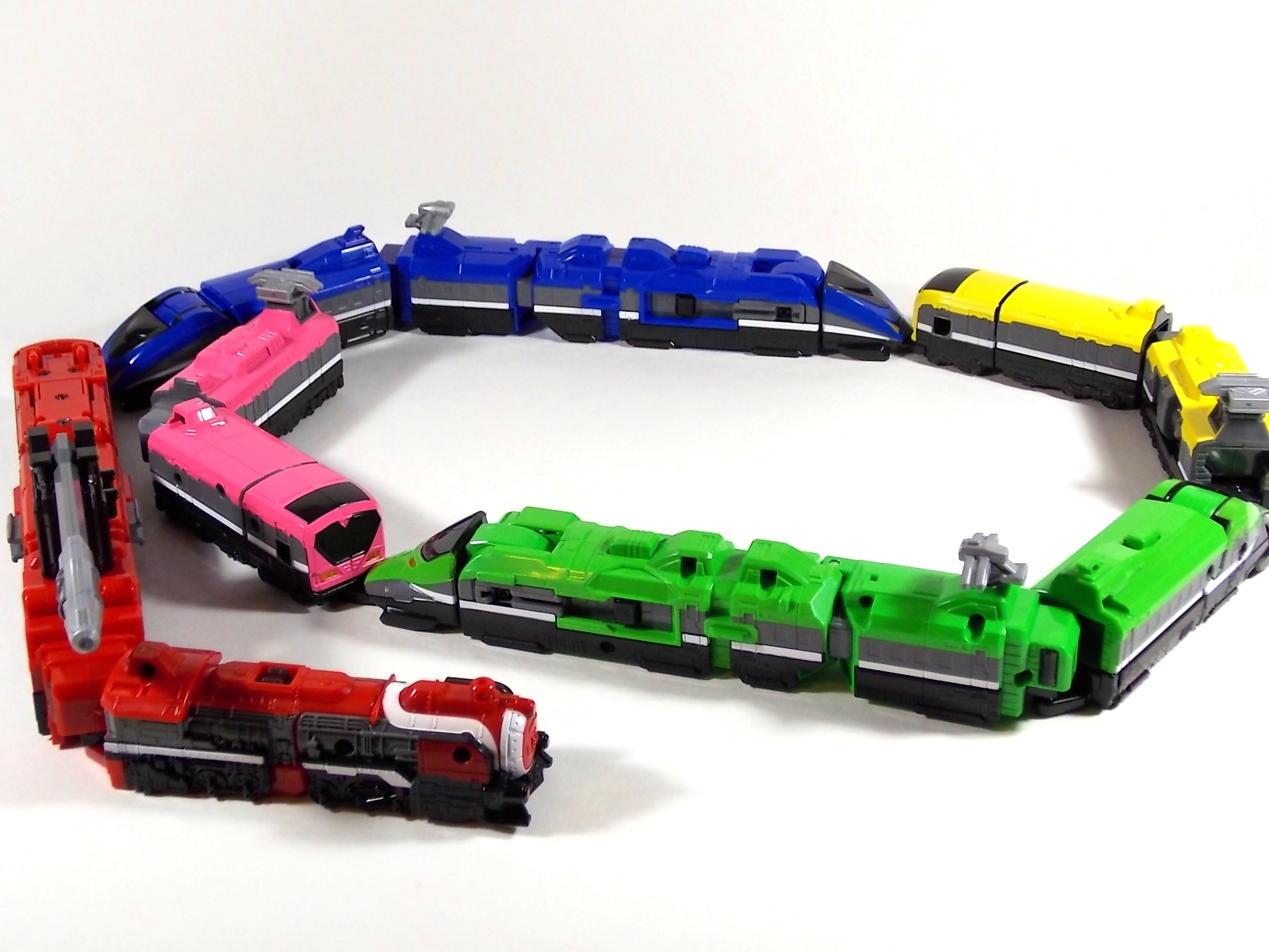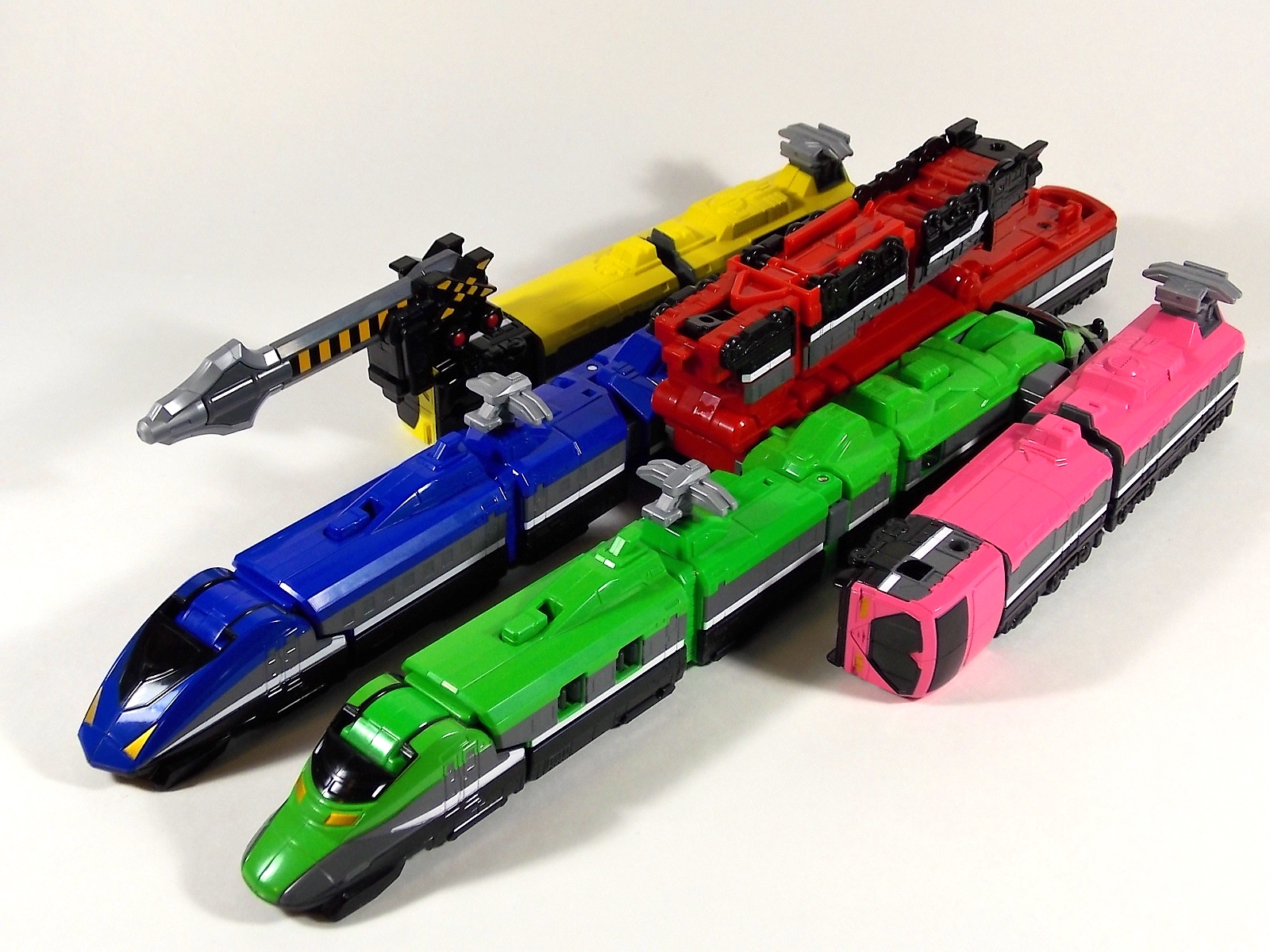 **We've got so many images that this bad boy takes up 80 images across two posts! Scroll down to the second post of this thread to see the second half! DX ToQ Oh is of course from everyone's favorite new train themed sentai, Ressha Sentai ToQger. And though we're only 3 episodes into the series it's already shaping up to be a really fun rider But enough about that, onto the toys! DX ToQ Oh is composed of the 5 main Resshas (trains) from the series. Red, Blue, Yellow, Green, and Pink Resshas. Plenty of people have expressed concerns that this mecha both on screen and in toy form is plain and simplistic. Let me assure you it is neither. To start with the Ressha's themselves are more complex than one would initially think. Out of the box they are each one long train piece with no moving parts. However, in the midsection of each Ressha is a really nice square connecting joint. Some pressure tabs hold these joints in place but I can safely say they are some of the sturdiest connections you'll find on a sentai robo. When released you can flip out an alternate tab underneath the peg that can hitch the two "cars" of each Ressha together. Thus giving them a moveable joint in the middle like the linkage between real rail cars. This joint is what also allows you to remove the main engine of each Ressha, to use them with the DX ToQ Changer. That's right, each forward section of the Resshas is fully compatible with the Changer. Small sets of tabs placed at varying intervals on the bottom of each car determine how the Changer detects them. Of course the secondary cars can not be used in this manner. But more to the point the joints in the middle of each train allow you to create one very long vehicle. These trains may be small but they more than make up for it in functionality. While the size has been a point of contention with this set, reasonably so, in hand you really don't notice. This set really needs to be seen in person to appreciate it. Neither my pictures nor baltmatrix's review can really get the point across the same way actually handling it would. To combine the resshas for ToQ Oh you can 100% mimic the TV counterpart. The Resshas line up in a row, then very nice very awesome sliding locks on either side of the Blue & Green Resshas slide right into place on Red. These are very firm connectors and Bandai NEEDS to use them more. Pink & Yellow have fold out peg joints to plug into the shoulder so that's pretty straightforward. Then we need to do the naughty bit of the transformation and fold up Red Ressha. Some traditional Bandai DX clips hold this piece in place but the ammount of force needed to use them is minimal. We probably won't see the same kinds of breakage occur like last year with Kyoryuzin. And in fact these clips are strategically placed all over ToQ Oh. We will most certainly be seeing some big combos when other Ressha are introduced. The clips on the bottom of both feet, the sides of the legs, and the tops of shoulders strongly imply this. Now you just need to fold the feet up and rotate the hands. The feet by the way have a pair of locks on them so they don't rotate while the robot is standing, much like DX Gosei Great. Again very smart, and very secure, thanks Bandai! Then rotate the shoulder pads down, stand him up, fold the second half of Red Ressha down, and pop the head up! Oh and open the awesomely detailed train "doors" that conceal the head, and ToQ Oh is formed! There's also the included train crossing themed sword Fumikiriken. Nicely enough it can be stored on Red Ressha while in vehicle form. Looking at this set as a whole I am impressed, damn impressed. Bandai has cleverly engineered this thing. It's as efficient as it can be and really pulls off the look of it's show counterpart. Could it have elbows? Sure, but then you would loose the separating pivoting joint the cars use in train form. Overall this is a very impressive piece that still stacks up well to the last few years of sentai DX robos. If anything it's size is indicative of much larger combinations to come just like the DX Go-Buster Ace of 2 years ago. I HIGHLY recommend you pick this set up. The Ressha modes are really well done with absolute mountains of detail and the Robo mode is a joy to see and handle. A+ Bandai!