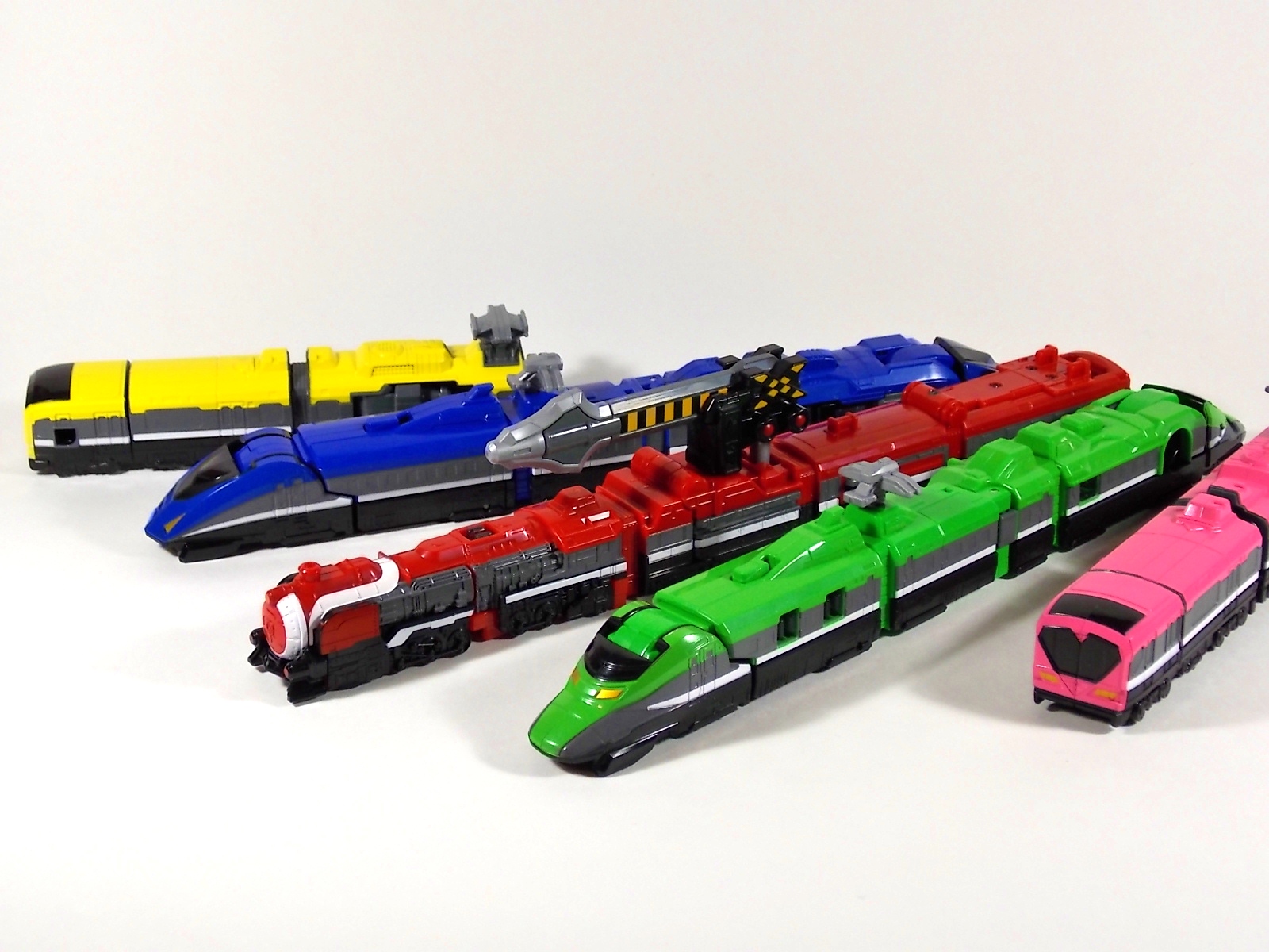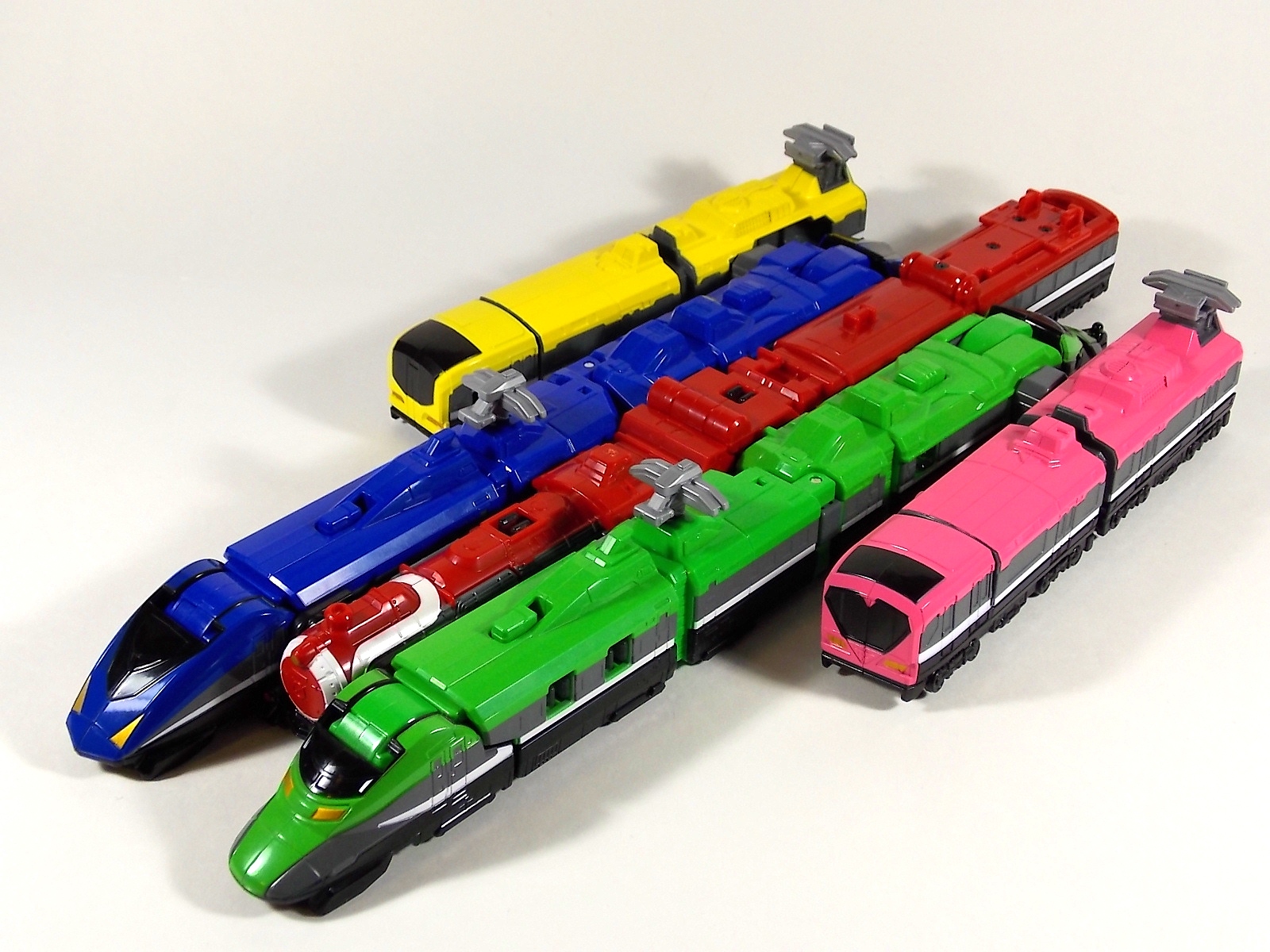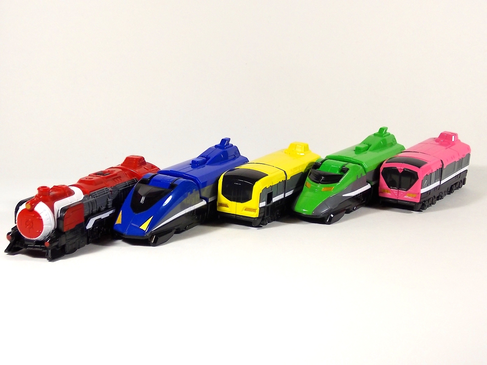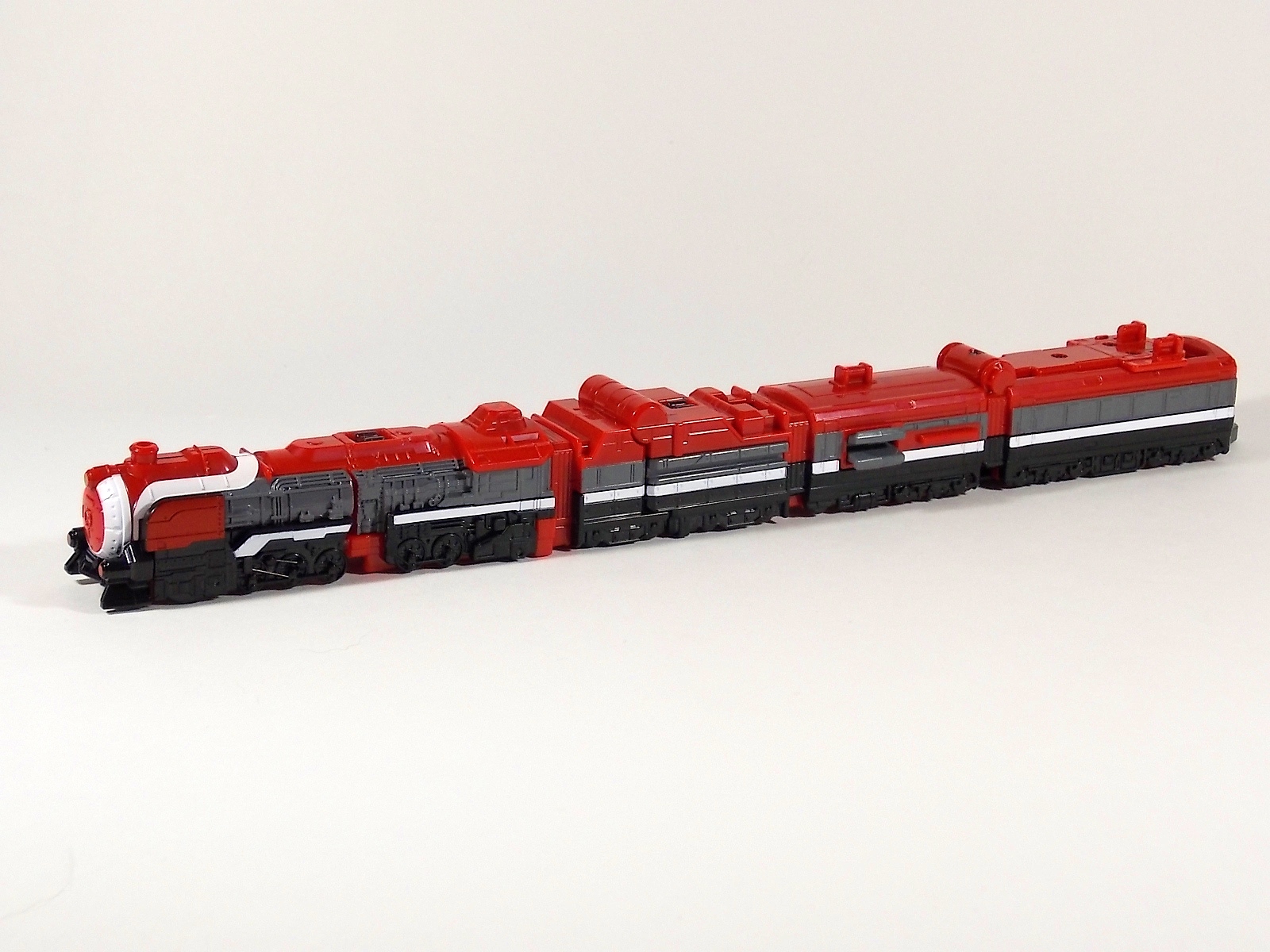 **We've got so many images that this bad boy takes up 80 images across two posts! Scroll down to the second post of this thread to see the second half! DX ToQ Oh is of course from everyone's favorite new train themed sentai, Ressha Sentai ToQger. And though we're only 3 episodes into the series it's already shaping up to be a really fun rider But enough about that, onto the toys! DX ToQ Oh is composed of the 5 main Resshas (trains) from the series. Red, Blue, Yellow, Green, and Pink Resshas. Plenty of people have expressed concerns that this mecha both on screen and in toy form is plain and simplistic. Let me assure you it is neither. To start with the Ressha's themselves are more complex than one would initially think. Out of the box they are each one long train piece with no moving parts. However, in the midsection of each Ressha is a really nice square connecting joint. Some pressure tabs hold these joints in place but I can safely say they are some of the sturdiest connections you'll find on a sentai robo. When released you can flip out an alternate tab underneath the peg that can hitch the two "cars" of each Ressha together. Thus giving them a moveable joint in the middle like the linkage between real rail cars. This joint is what also allows you to remove the main engine of each Ressha, to use them with the DX ToQ Changer. That's right, each forward section of the Resshas is fully compatible with the Changer. Small sets of tabs placed at varying intervals on the bottom of each car determine how the Changer detects them. Of course the secondary cars can not be used in this manner. But more to the point the joints in the middle of each train allow you to create one very long vehicle. These trains may be small but they more than make up for it in functionality. While the size has been a point of contention with this set, reasonably so, in hand you really don't notice. This set really needs to be seen in person to appreciate it. Neither my pictures nor baltmatrix's review can really get the point across the same way actually handling it would. To combine the resshas for ToQ Oh you can 100% mimic the TV counterpart. The Resshas line up in a row, then very nice very awesome sliding locks on either side of the Blue & Green Resshas slide right into place on Red. These are very firm connectors and Bandai NEEDS to use them more. Pink & Yellow have fold out peg joints to plug into the shoulder so that's pretty straightforward. Then we need to do the naughty bit of the transformation and fold up Red Ressha. Some traditional Bandai DX clips hold this piece in place but the ammount of force needed to use them is minimal. We probably won't see the same kinds of breakage occur like last year with Kyoryuzin. And in fact these clips are strategically placed all over ToQ Oh. We will most certainly be seeing some big combos when other Ressha are introduced. The clips on the bottom of both feet, the sides of the legs, and the tops of shoulders strongly imply this. Now you just need to fold the feet up and rotate the hands. The feet by the way have a pair of locks on them so they don't rotate while the robot is standing, much like DX Gosei Great. Again very smart, and very secure, thanks Bandai! Then rotate the shoulder pads down, stand him up, fold the second half of Red Ressha down, and pop the head up! Oh and open the awesomely detailed train "doors" that conceal the head, and ToQ Oh is formed! There's also the included train crossing themed sword Fumikiriken. Nicely enough it can be stored on Red Ressha while in vehicle form. Looking at this set as a whole I am impressed, damn impressed. Bandai has cleverly engineered this thing. It's as efficient as it can be and really pulls off the look of it's show counterpart. Could it have elbows? Sure, but then you would loose the separating pivoting joint the cars use in train form. Overall this is a very impressive piece that still stacks up well to the last few years of sentai DX robos. If anything it's size is indicative of much larger combinations to come just like the DX Go-Buster Ace of 2 years ago. I HIGHLY recommend you pick this set up. The Ressha modes are really well done with absolute mountains of detail and the Robo mode is a joy to see and handle. A+ Bandai!