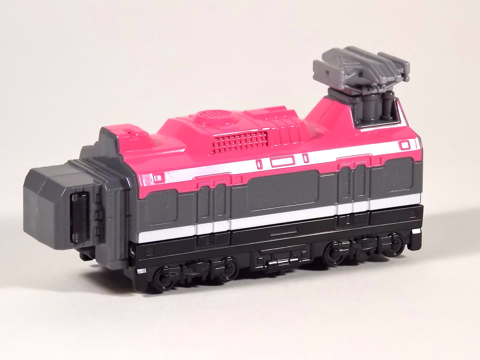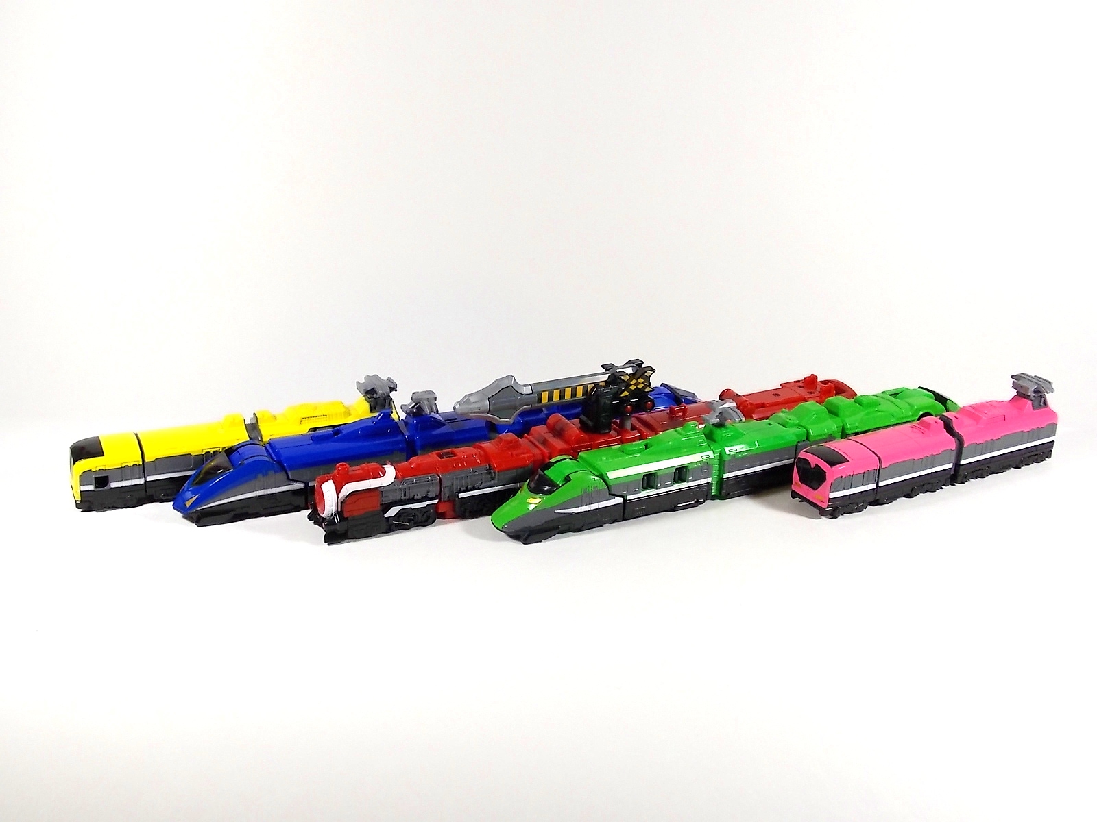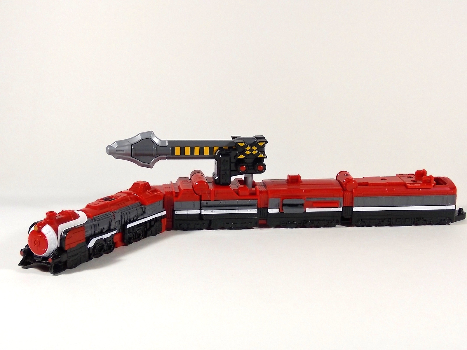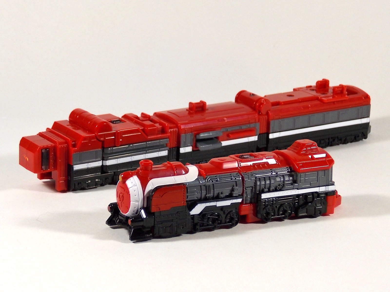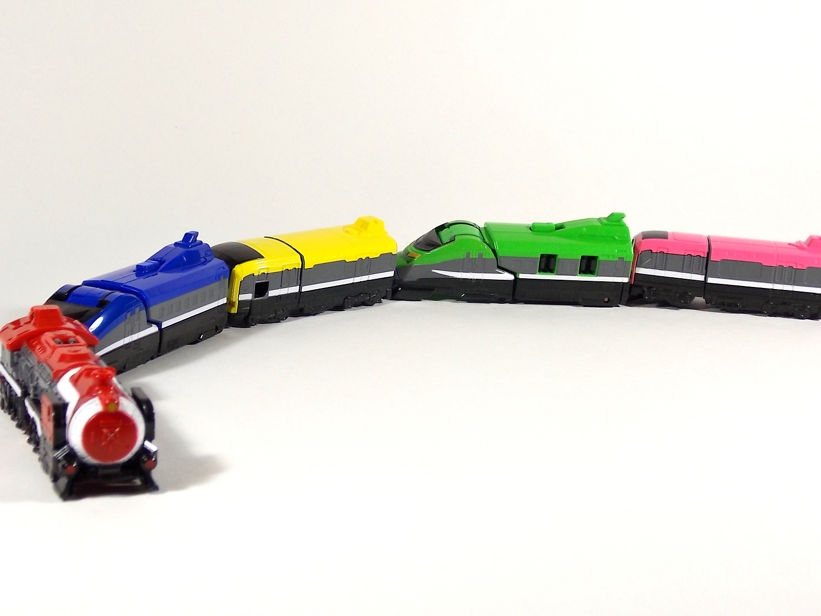 **We've got so many images that this bad boy takes up 80 images across two posts! Scroll down to the second post of this thread to see the second half! DX ToQ Oh is of course from everyone's favorite new train themed sentai, Ressha Sentai ToQger. And though we're only 3 episodes into the series it's already shaping up to be a really fun rider But enough about that, onto the toys! DX ToQ Oh is composed of the 5 main Resshas (trains) from the series. Red, Blue, Yellow, Green, and Pink Resshas. Plenty of people have expressed concerns that this mecha both on screen and in toy form is plain and simplistic. Let me assure you it is neither. To start with the Ressha's themselves are more complex than one would initially think. Out of the box they are each one long train piece with no moving parts. However, in the midsection of each Ressha is a really nice square connecting joint. Some pressure tabs hold these joints in place but I can safely say they are some of the sturdiest connections you'll find on a sentai robo. When released you can flip out an alternate tab underneath the peg that can hitch the two "cars" of each Ressha together. Thus giving them a moveable joint in the middle like the linkage between real rail cars. This joint is what also allows you to remove the main engine of each Ressha, to use them with the DX ToQ Changer. That's right, each forward section of the Resshas is fully compatible with the Changer. Small sets of tabs placed at varying intervals on the bottom of each car determine how the Changer detects them. Of course the secondary cars can not be used in this manner. But more to the point the joints in the middle of each train allow you to create one very long vehicle. These trains may be small but they more than make up for it in functionality. While the size has been a point of contention with this set, reasonably so, in hand you really don't notice. This set really needs to be seen in person to appreciate it. Neither my pictures nor baltmatrix's review can really get the point across the same way actually handling it would. To combine the resshas for ToQ Oh you can 100% mimic the TV counterpart. The Resshas line up in a row, then very nice very awesome sliding locks on either side of the Blue & Green Resshas slide right into place on Red. These are very firm connectors and Bandai NEEDS to use them more. Pink & Yellow have fold out peg joints to plug into the shoulder so that's pretty straightforward. Then we need to do the naughty bit of the transformation and fold up Red Ressha. Some traditional Bandai DX clips hold this piece in place but the ammount of force needed to use them is minimal. We probably won't see the same kinds of breakage occur like last year with Kyoryuzin. And in fact these clips are strategically placed all over ToQ Oh. We will most certainly be seeing some big combos when other Ressha are introduced. The clips on the bottom of both feet, the sides of the legs, and the tops of shoulders strongly imply this. Now you just need to fold the feet up and rotate the hands. The feet by the way have a pair of locks on them so they don't rotate while the robot is standing, much like DX Gosei Great. Again very smart, and very secure, thanks Bandai! Then rotate the shoulder pads down, stand him up, fold the second half of Red Ressha down, and pop the head up! Oh and open the awesomely detailed train "doors" that conceal the head, and ToQ Oh is formed! There's also the included train crossing themed sword Fumikiriken. Nicely enough it can be stored on Red Ressha while in vehicle form. Looking at this set as a whole I am impressed, damn impressed. Bandai has cleverly engineered this thing. It's as efficient as it can be and really pulls off the look of it's show counterpart. Could it have elbows? Sure, but then you would loose the separating pivoting joint the cars use in train form. Overall this is a very impressive piece that still stacks up well to the last few years of sentai DX robos. If anything it's size is indicative of much larger combinations to come just like the DX Go-Buster Ace of 2 years ago. I HIGHLY recommend you pick this set up. The Ressha modes are really well done with absolute mountains of detail and the Robo mode is a joy to see and handle. A+ Bandai!