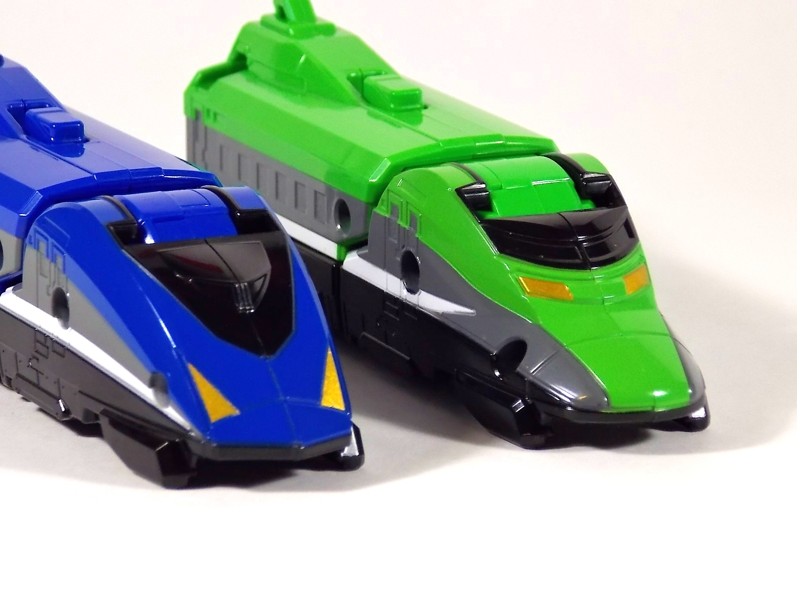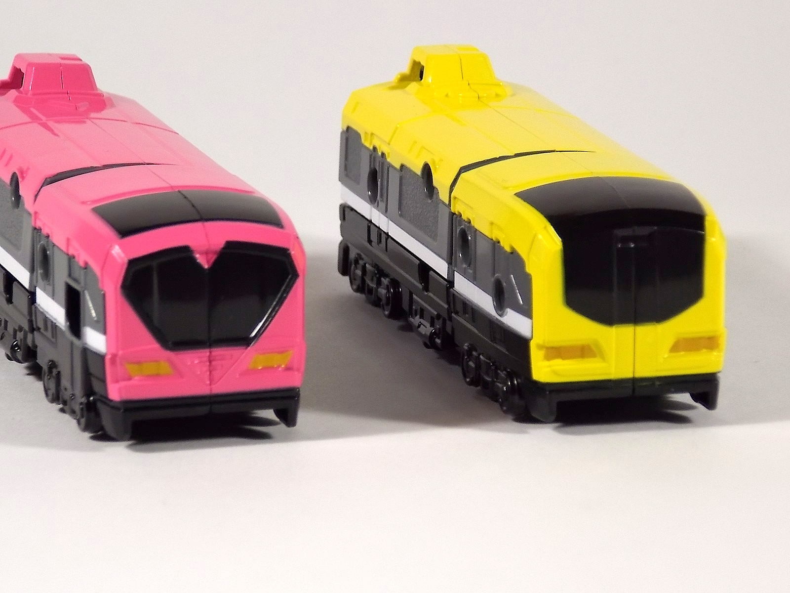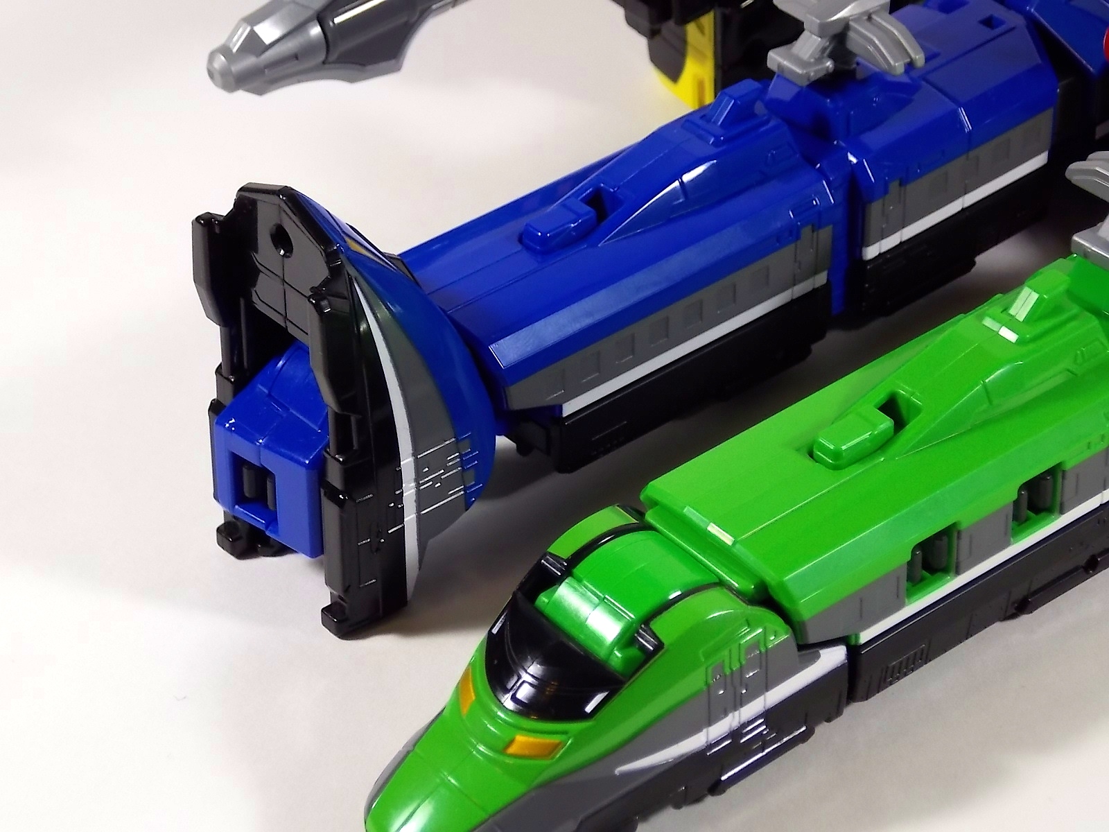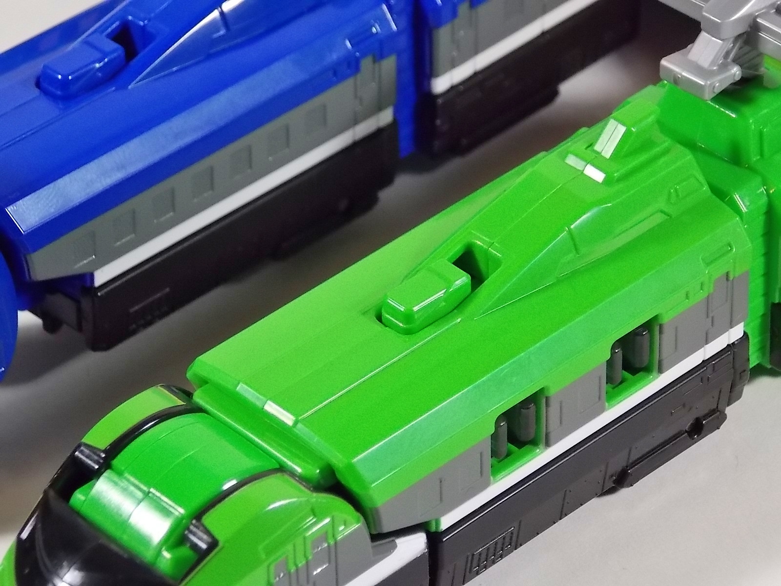 **We've got so many images that this bad boy takes up 80 images across two posts! Scroll down to the second post of this thread to see the second half! DX ToQ Oh is of course from everyone's favorite new train themed sentai, Ressha Sentai ToQger. And though we're only 3 episodes into the series it's already shaping up to be a really fun rider But enough about that, onto the toys! DX ToQ Oh is composed of the 5 main Resshas (trains) from the series. Red, Blue, Yellow, Green, and Pink Resshas. Plenty of people have expressed concerns that this mecha both on screen and in toy form is plain and simplistic. Let me assure you it is neither. To start with the Ressha's themselves are more complex than one would initially think. Out of the box they are each one long train piece with no moving parts. However, in the midsection of each Ressha is a really nice square connecting joint. Some pressure tabs hold these joints in place but I can safely say they are some of the sturdiest connections you'll find on a sentai robo. When released you can flip out an alternate tab underneath the peg that can hitch the two "cars" of each Ressha together. Thus giving them a moveable joint in the middle like the linkage between real rail cars. This joint is what also allows you to remove the main engine of each Ressha, to use them with the DX ToQ Changer. That's right, each forward section of the Resshas is fully compatible with the Changer. Small sets of tabs placed at varying intervals on the bottom of each car determine how the Changer detects them. Of course the secondary cars can not be used in this manner. But more to the point the joints in the middle of each train allow you to create one very long vehicle. These trains may be small but they more than make up for it in functionality. While the size has been a point of contention with this set, reasonably so, in hand you really don't notice. This set really needs to be seen in person to appreciate it. Neither my pictures nor baltmatrix's review can really get the point across the same way actually handling it would. To combine the resshas for ToQ Oh you can 100% mimic the TV counterpart. The Resshas line up in a row, then very nice very awesome sliding locks on either side of the Blue & Green Resshas slide right into place on Red. These are very firm connectors and Bandai NEEDS to use them more. Pink & Yellow have fold out peg joints to plug into the shoulder so that's pretty straightforward. Then we need to do the naughty bit of the transformation and fold up Red Ressha. Some traditional Bandai DX clips hold this piece in place but the ammount of force needed to use them is minimal. We probably won't see the same kinds of breakage occur like last year with Kyoryuzin. And in fact these clips are strategically placed all over ToQ Oh. We will most certainly be seeing some big combos when other Ressha are introduced. The clips on the bottom of both feet, the sides of the legs, and the tops of shoulders strongly imply this. Now you just need to fold the feet up and rotate the hands. The feet by the way have a pair of locks on them so they don't rotate while the robot is standing, much like DX Gosei Great. Again very smart, and very secure, thanks Bandai! Then rotate the shoulder pads down, stand him up, fold the second half of Red Ressha down, and pop the head up! Oh and open the awesomely detailed train "doors" that conceal the head, and ToQ Oh is formed! There's also the included train crossing themed sword Fumikiriken. Nicely enough it can be stored on Red Ressha while in vehicle form. Looking at this set as a whole I am impressed, damn impressed. Bandai has cleverly engineered this thing. It's as efficient as it can be and really pulls off the look of it's show counterpart. Could it have elbows? Sure, but then you would loose the separating pivoting joint the cars use in train form. Overall this is a very impressive piece that still stacks up well to the last few years of sentai DX robos. If anything it's size is indicative of much larger combinations to come just like the DX Go-Buster Ace of 2 years ago. I HIGHLY recommend you pick this set up. The Ressha modes are really well done with absolute mountains of detail and the Robo mode is a joy to see and handle. A+ Bandai!