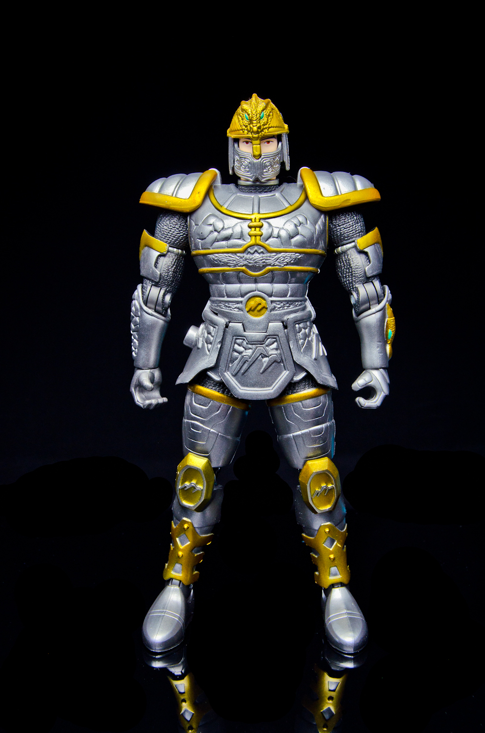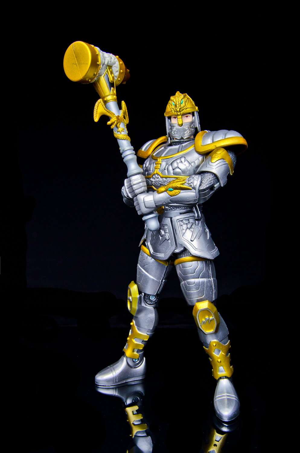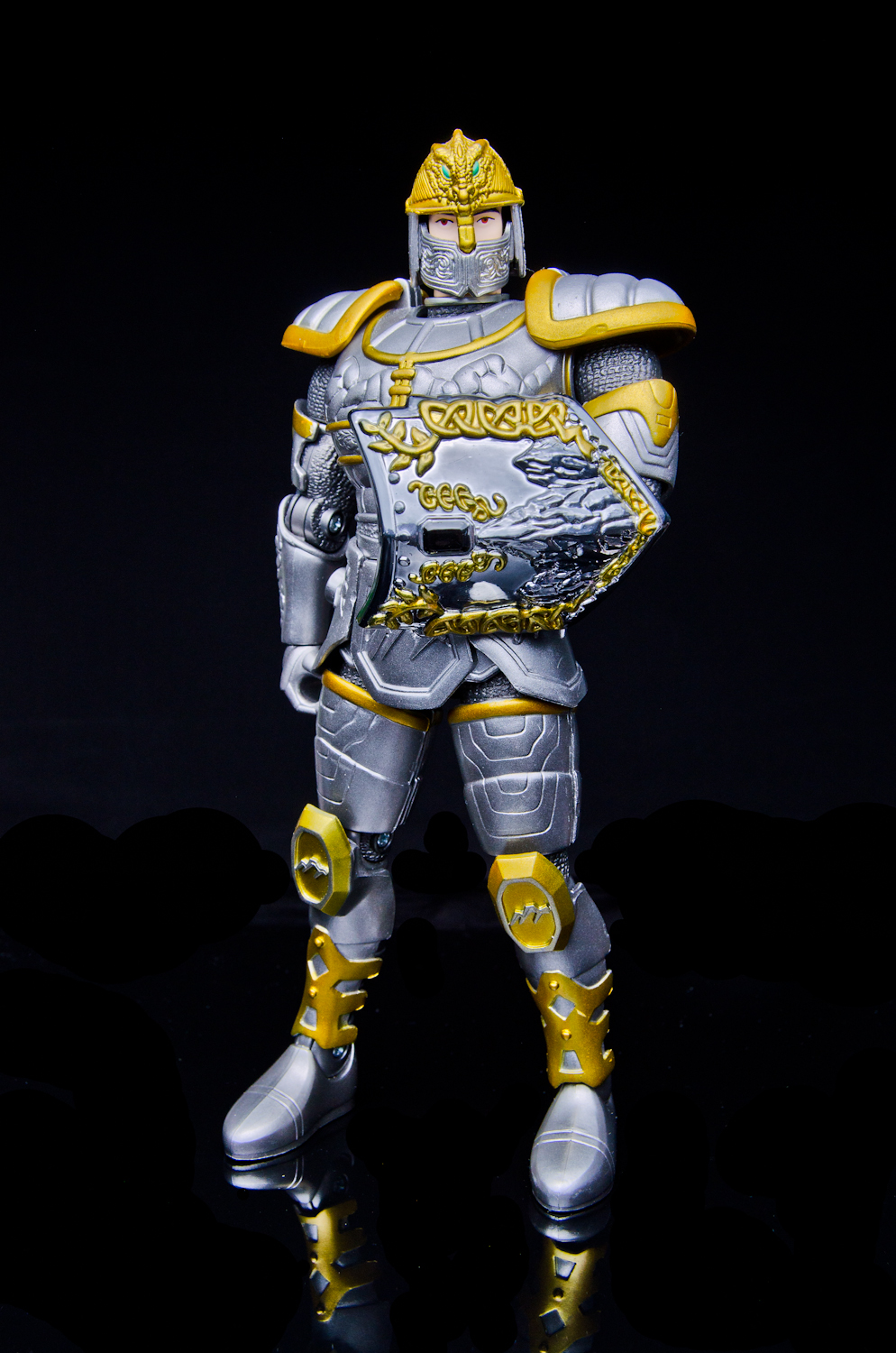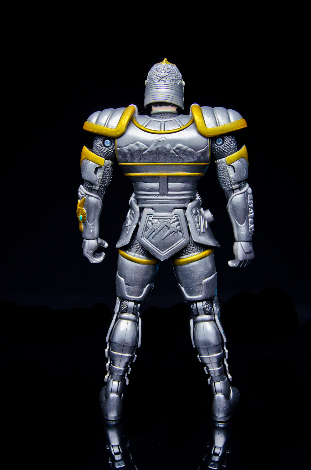 We're again firing up the Toku Time Machine to bring you a gallery of the 8 inch 'Armored Defender' Angus from Bandai of America's 1998 Mystic Knights of Tir Na Nog toy line. Everything that the 5 inch Mystic Knights do the 8 inch figures do better. Angus features 21 points of articulation, has 18 pieces of removable armor, and comes with the Terra Sling Mace, another sling, a war hammer, a Dragon's Breath Dagger, dagger sheath, and a shield. Unlike the 5 inch version, this larger Angus' shield cannot clip into the DX Pyre's chest. Angus is the Mystic Knight of Earth and the designer's managed to accurately capture all of the 'earthy' elements of the on-screen armor in this sculpt. It feels like every inch of the figure is packed with detail, from the helmet's crest all the way down to the boots. Despite the 'gimmick' of this figure being the removable armor, all of the pieces stay on rather well. The side skirts are on a hinge that allow for outward leg movement but unfortunately, forward and backward movement is restricted at the hip due to the front and back skirt pieces. The bicep armor pieces do not restrict elbow movement. The 8inch Armored Defender line of Mystic Knights is fantastic and it's rather disappointing that only 3 out of the 5 Knights were made in this scale. Everything about the figures are top notch, from the sculpt and paint detail to the accessory count. If you're able to find any of these 8inch figures complete and at a reasonable price, I strongly recommend them for any fan of Mystic Knights or American Tokusatsu in general. Miss our other Mystic Knights galleries? - 8 inch Armored Defender Rohan Gallery - 5 inch Rohan, Mystic Knight of Fire Gallery |