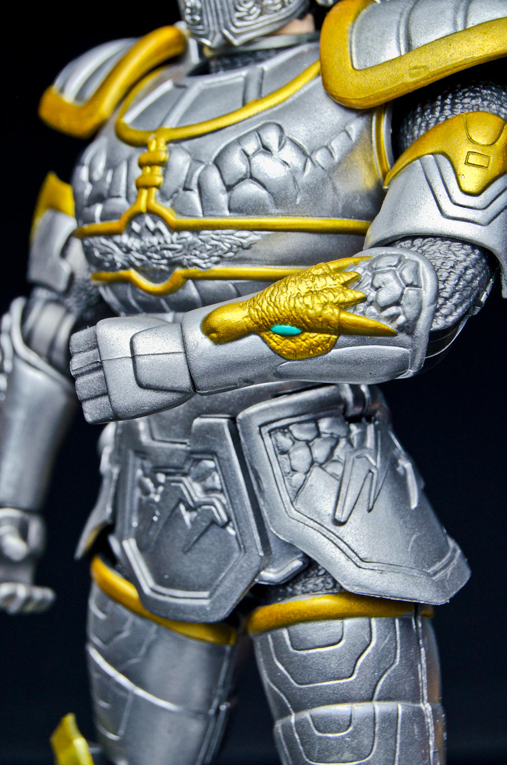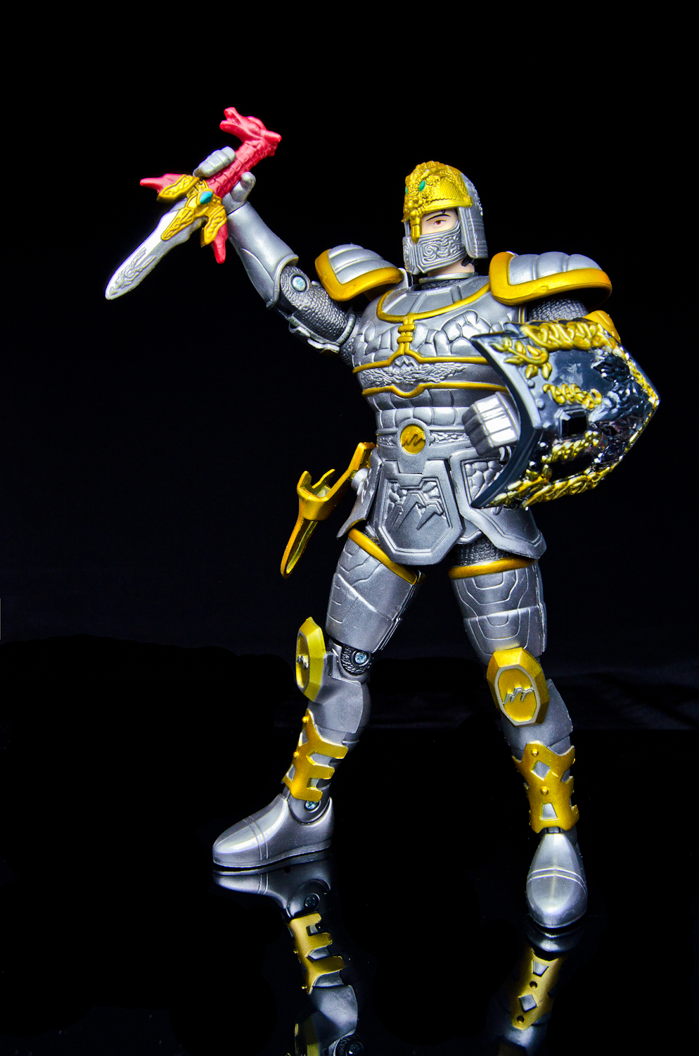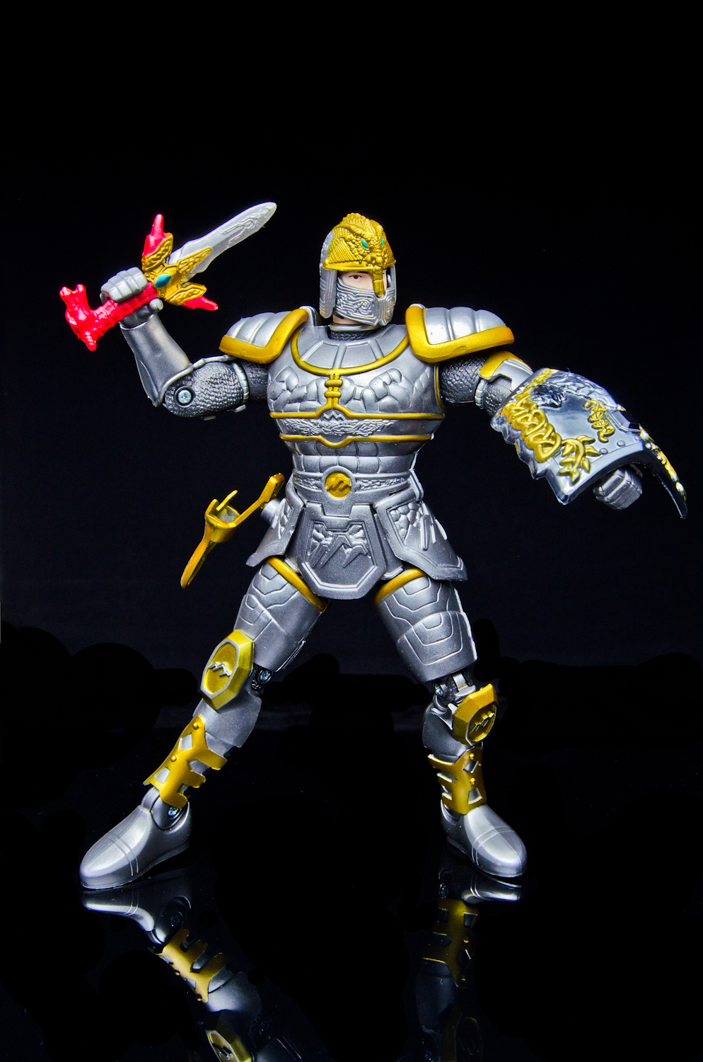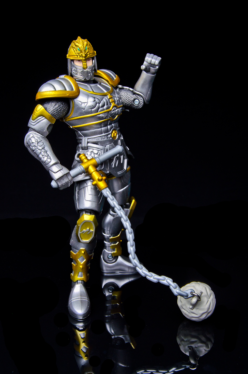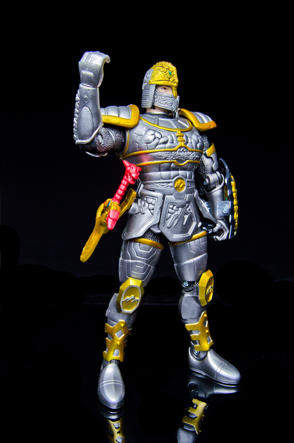 We're again firing up the Toku Time Machine to bring you a gallery of the 8 inch 'Armored Defender' Angus from Bandai of America's 1998 Mystic Knights of Tir Na Nog toy line. Everything that the 5 inch Mystic Knights do the 8 inch figures do better. Angus features 21 points of articulation, has 18 pieces of removable armor, and comes with the Terra Sling Mace, another sling, a war hammer, a Dragon's Breath Dagger, dagger sheath, and a shield. Unlike the 5 inch version, this larger Angus' shield cannot clip into the DX Pyre's chest. Angus is the Mystic Knight of Earth and the designer's managed to accurately capture all of the 'earthy' elements of the on-screen armor in this sculpt. It feels like every inch of the figure is packed with detail, from the helmet's crest all the way down to the boots. Despite the 'gimmick' of this figure being the removable armor, all of the pieces stay on rather well. The side skirts are on a hinge that allow for outward leg movement but unfortunately, forward and backward movement is restricted at the hip due to the front and back skirt pieces. The bicep armor pieces do not restrict elbow movement. The 8inch Armored Defender line of Mystic Knights is fantastic and it's rather disappointing that only 3 out of the 5 Knights were made in this scale. Everything about the figures are top notch, from the sculpt and paint detail to the accessory count. If you're able to find any of these 8inch figures complete and at a reasonable price, I strongly recommend them for any fan of Mystic Knights or American Tokusatsu in general. Miss our other Mystic Knights galleries? - 8 inch Armored Defender Rohan Gallery - 5 inch Rohan, Mystic Knight of Fire Gallery |