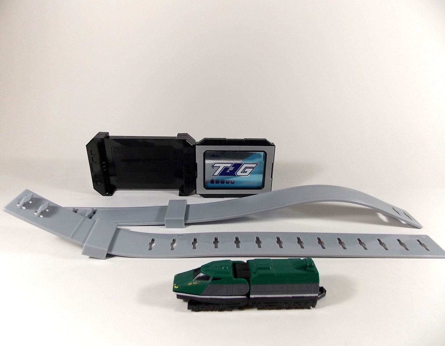 Today we've got a fairly simple gallery for you. The DX ToQ Buckle is a pretty straight forward release. Included is a basic buckle piece and DX belt strap set. Of course the straps are child sized so you'll need extenders if you want to try to wear it. The Buckle portion is made of a generic black back plate and the actual Rainbow Pass itself. The Pass is the main feature of the buckle. But "feature" is a generous term to use for this one. It can be removed via a clip in the buckle, and held? that's about it. In show the Rainbow Pass can be used to board the Rainbow line and is a bit like a smart phone touch screen, ala last years Mobuckle. However the toy has no functionality at all. There seems to be a slot that would allow you to slide cards in from the side to cover the face of the Pass. However no purpose has been revealed for this feature in show so for now it's pretty useless. As far as DX buckle/belt sets go, this one is a definite pass (haha! pun). But that's only if you're buying it for the pass. Which I did not. I specifically purchased this set, as well as the other DX role plays sets, in order to acquire the DX Resshas they come packed with. The ToQ Buckle set comes packed with the DX Shield Ressha. On it's own this ressha may not look like much. It's tiny, but it only appears so small because it's just the forward half of a train. The DX ToQ Oh components are composed of 2 cars each, and many of the upcoming additional Resshas will also be 2-car sets. However those included with role play devices are single car only. The Shield Ressha can functions just like any other Ressha in the line as far as connecting goes. In order to use it as an arm just pop off one of ToQ Oh's arms at the elbow socket, the appropriate one to remove is Pink Ressha. Then plug this on and fold the halves of it out to revealed the Shield Mode for Tqo Oh! And that about sums up this set, in more words than I'd originally intended. If you want all the DX Resshas, like myself, then buying a set like this is the only way to go. But that is the only reason I'd suggest buying it, other than it's pretty cheap price tag of about 1500-1800 yen most place. We'll be back in a few days with a review of the DX ToQ Blaster & DX ToQ Changer!
