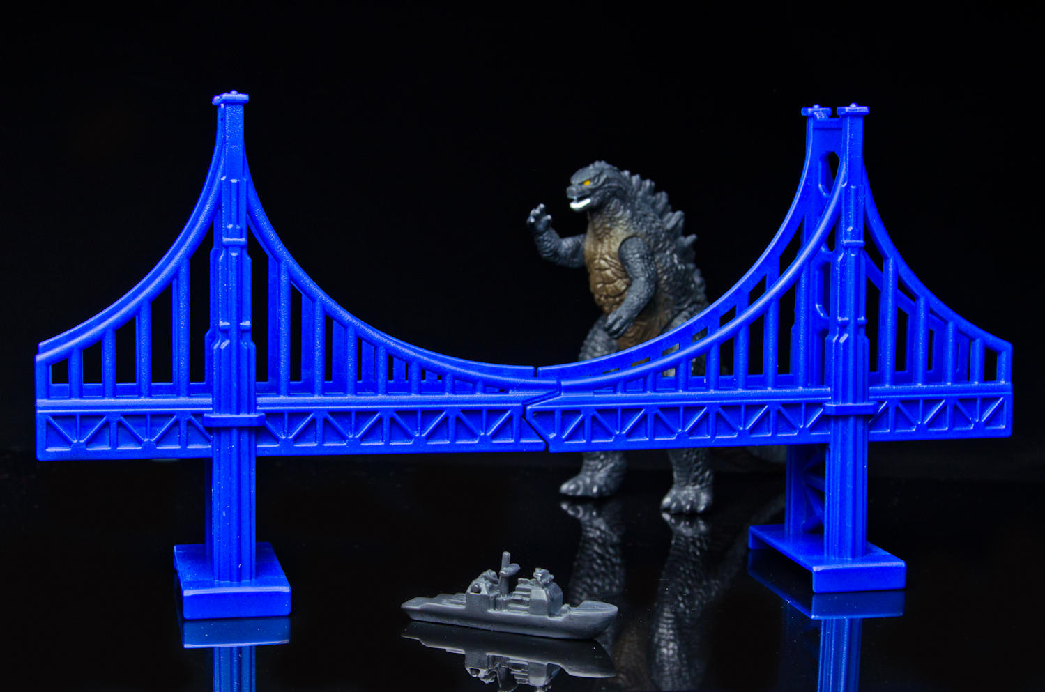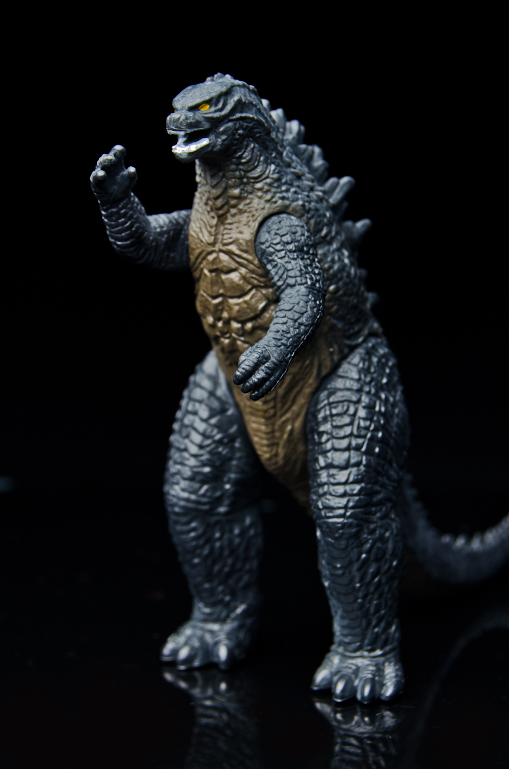 The set includes a Godzilla figure, a 'Muto' figure, 7 building pieces, 2 bridge pieces, 2 jets, 2 helicopters, and 1 battleship. Godzilla stands at approximately 3 inches tall and only has limited forward and backward movement at the shoulders and hips. Despite it's small size, there is a lot of intricate sculpted details all over the figure and the paint applications are minimal but effective. The 'Muto' figure also stands at approximately 3 inches tall and does not have any articulation. The figure has some detailing on the head and is cast in a reddish-black plastic. All of the vehicles in the set a little over in an inch in length and are cast in a mid-grey plastic. The helicopters do have moving rotors despite the reduced scale. The buildings are simple, molded in a single color, but they do have a lot of fine details on them from the windows to the numbers on the 'warehouses'. The different pieces do not clip or lock in place to form buildings, they just sit on top of one another. Overall, the Destruction City pack from the Godzilla line is a fun set with a lot of playability. |