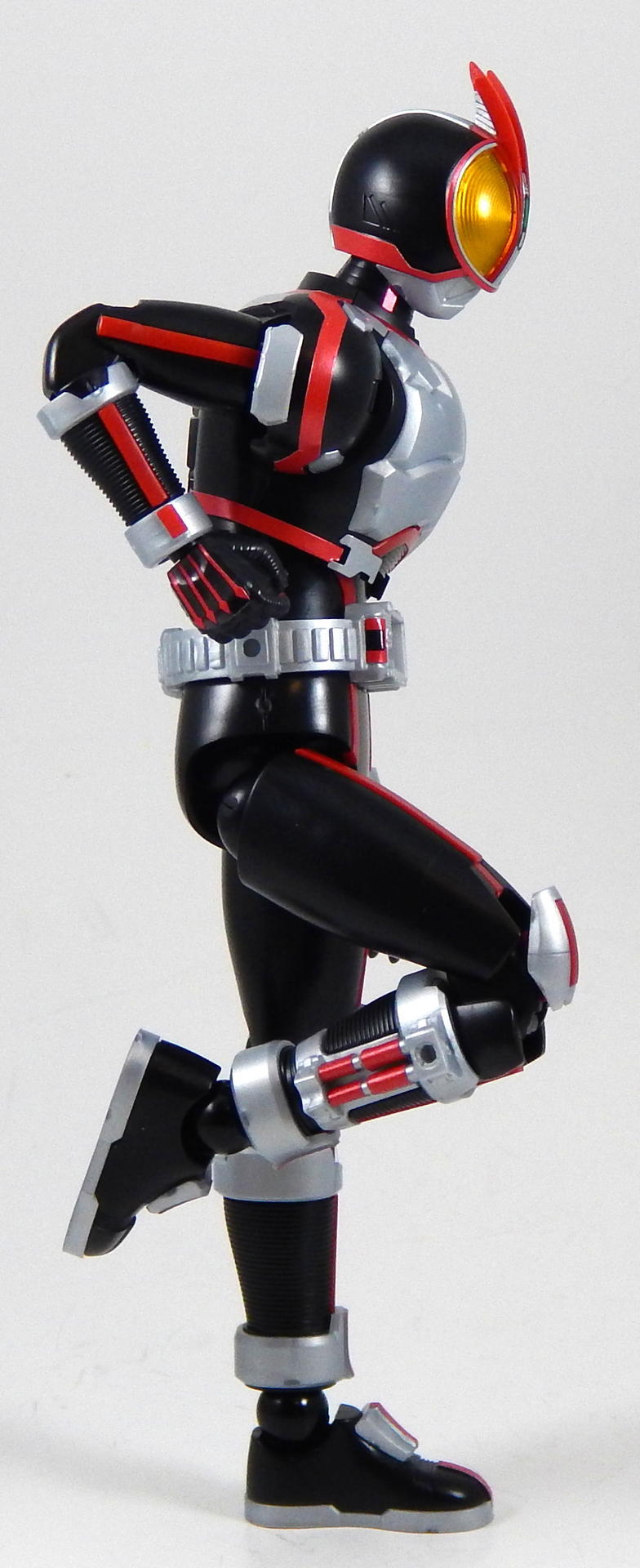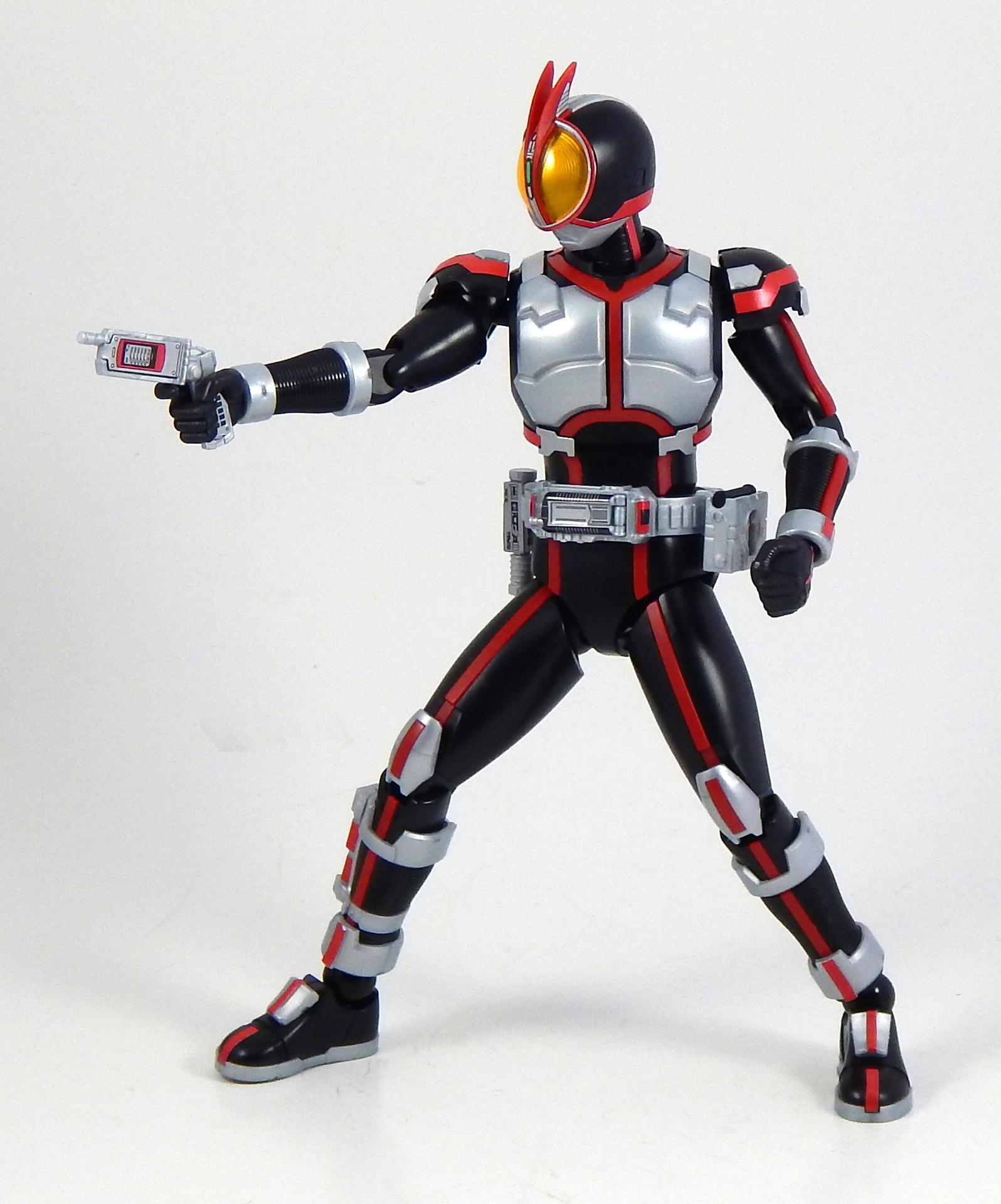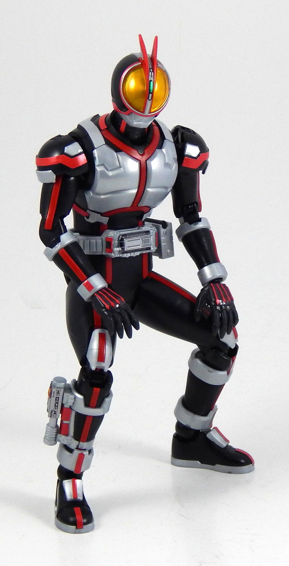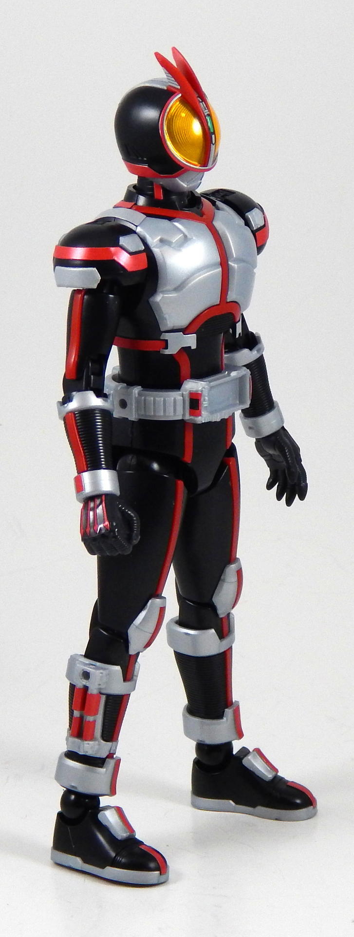 In short, this model kit was fun to build, it's quite detailed, it is very poseable, and has a great selection of accessories. It's a little bigger than the Figuarts, closer in scale to the Star Wars Black 6" figures and Marvel Legends. That's the minimum you should know about this kit. For further thoughts and info, read on. I have a smattering of experience with Bandai models, having assembled a couple each of Gundam High Grades, Master Grades and Real Grades, as well as some Kamen Rider Master Grade Figure-rise kits (TaToBa and all of the W kits, except CycloneJoker). This is my first experience with the Figure-rise 6 line, and it reminded me most of the more recent High Grade Gundam kits, in that it was both simpler than the Master Grade lines, but still surprisingly detailed. Consisting of 6 trees of parts (one of which is the stand, one being the effects pieces), Faiz doesn't have a super high parts count, but what he has is impressive. A lot of the detail is dealt with via stickers (there is an impressive sheet of around 60 labels), but a decent amount is managed through plastic. Take the red power lines all through Faiz' suit. It's about 50/50 split between red plastic and red stickers. The stickers are slightly metallic red, while the plastic is a more dull red, but the difference isn't all that noticeable. It is the main point where a Master Grade would be an improvement though, as I would expect much more of the red lines to be handled by plastic. I found the stickers to be a breeze to apply, even the longer straight ones weren't difficult to get aligned correctly. The only stickers that don't go one easily, or don't look pretty natural when applied, are those that go over the Mission Memory sculpts. It's hard to get them to lie smoothly on the big, rounded surface. The kit snaps together easily, everything fits together snugly. Some of the pieces require a decent amount of force to snap into place. I didn't push the arms into the shoulder joints hard enough at first, so you may notice that in some of the pictures there's a bit of a gap between the biceps and the shoulders. The articulation is quite good, nearly on part with a Figuarts, in most places. The biggest disappointment to me, is that the foot is one solid piece. I really like toys to have toe joints. The wrists are probably the most limited joint, with almost no range to them. Everything else is going to give you all the range you want. The two torso ball joints, in particular, I found to have a really good range of movement. The hips even hinge downward like the Figuarts to, allowing the legs to reach higher than the sculpt would otherwise allow (though it can introduce unsightly gaps in the sculpt in some poses). The figure is much lighter than the Faiz Figuarts, despite being a little bit larger. It balances very well, despite the light, plastic feet, though one of the one-legged poses I put him in require a couple extra minutes of fiddling with to get him to balance right. As for accessories, Figure-rise Faiz comes with everything he could possibly need for his default form, and a little more even. He has two pairs of hands, fists and open hands, and two gripping right hands. He has the Faiz Pointer in two modes, the Faiz Shot with working handle and holder, as well as an extra Faiz Shot sculpted into the holder. There are three versions of the phone, the Faiz Edge, and finally, there is the Axel Watch, which can attach to his left wrist. Comparing the accessories to those of the Figuarts, the Figure-rise versions are a little bit more detailed, in some respects, thanks to the stickers, but the Figuarts make up for it in paint. We get three variations on the Faiz Phone, one molded in gun mode (with a slight chunk removed from the handle so it fits in the gun-holding hand better). The other two phones are constructed of three pieces and are functional in ways I did not expect on a 6 inch figure, indeed, the Figuarts doesn't include functional phones like this either. The phones flip open and closed, and can even turn into the gun mode. It's definitely something I would have only expected for the larger MG Figure-rise line. The difference between them is that one is sculpted and stickered without the Mission Memory. The only drawbacks to the accessories is firstly, the Faiz Edge remains nearly colorless in the stock build. There is no red sticker for the blade part of it, nor the black grip. All we get is a Mission Memory sticker, and that's a bit disappointing, though likely stickers would have been unpleasant to apply, or looked bad. Secondly, I would have really liked a case to hold the Faiz Gear in. I have a thing for gear that stores neatly in cases, and the Double Driver case and memories that comes with MG Figure-rise Skull is honestly half of the reason that I bought that kit. But, while a case for the gear would have been an awesome addition, it is by no means a requirement for a kit such as this, so it's not something that really counts against it. For this review, I build the figure as directed by the manual, to show what the stock build looks like. It's mostly quite nice, but to improve it a little, all of the red plastic lines could be painted over with metallic red, to make them match the stickers better, and, like the Figuarts, the fingertips lack the silver paint that is one of the standout aspects of the Faiz suits. The silver plastic is noticeably swirly in places, so it would also benefit from some silver paint (I did so on the MG Figure-rise Accel kit, and it massively improved the look). Speaking of silver paint, this figure can be customized into Faiz Axel Form by painting all the red lines silver, and opening the chest pieces, which are constructed specifically for this option. Overall, I was very please with this kit. It's an excellent representation of one of my favorite suit designs, I would definitely buy a Faiz Blaster Form kit, as well as kits of the other Riders from this show. It feat