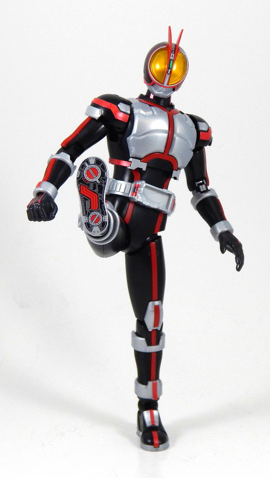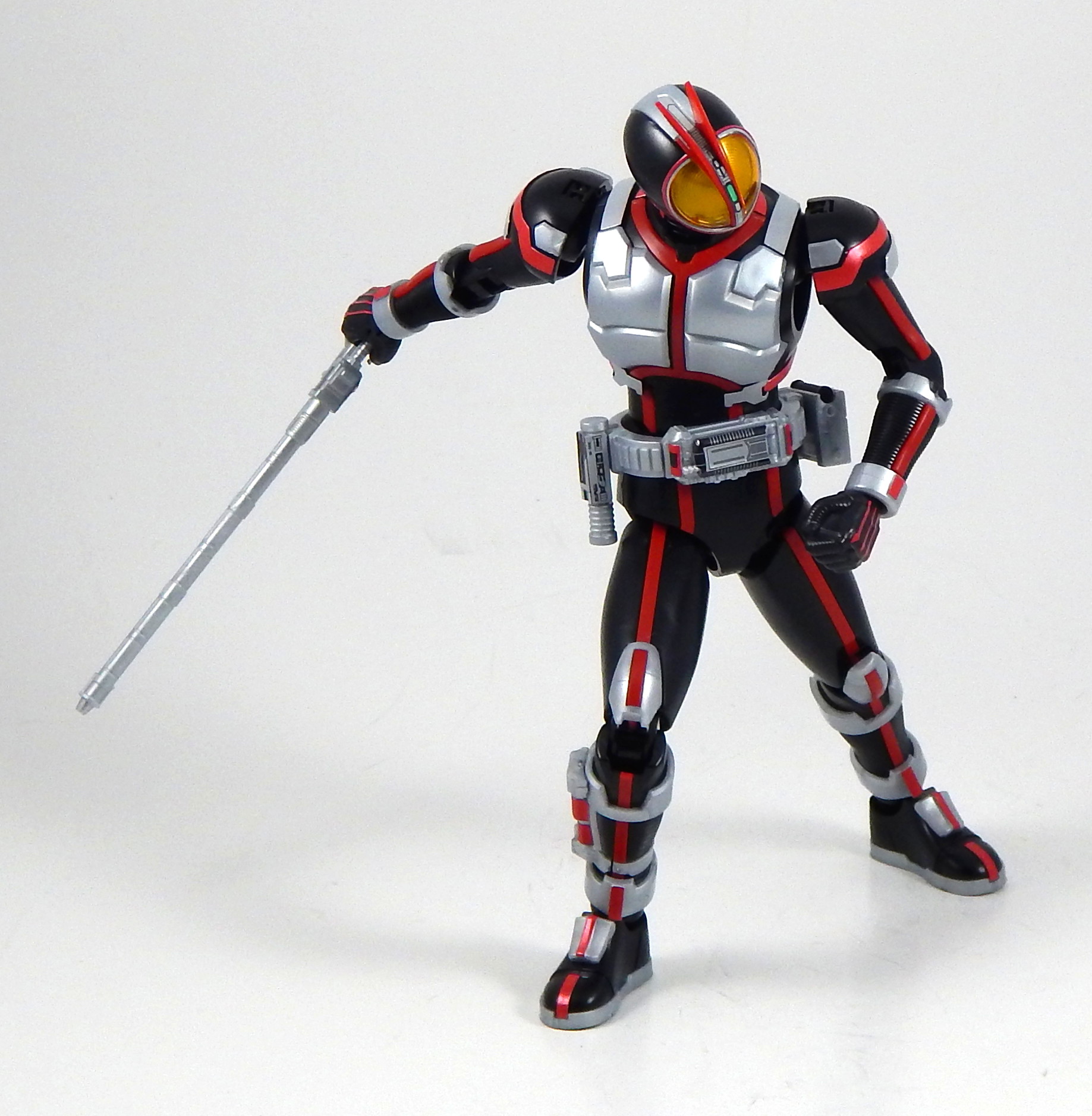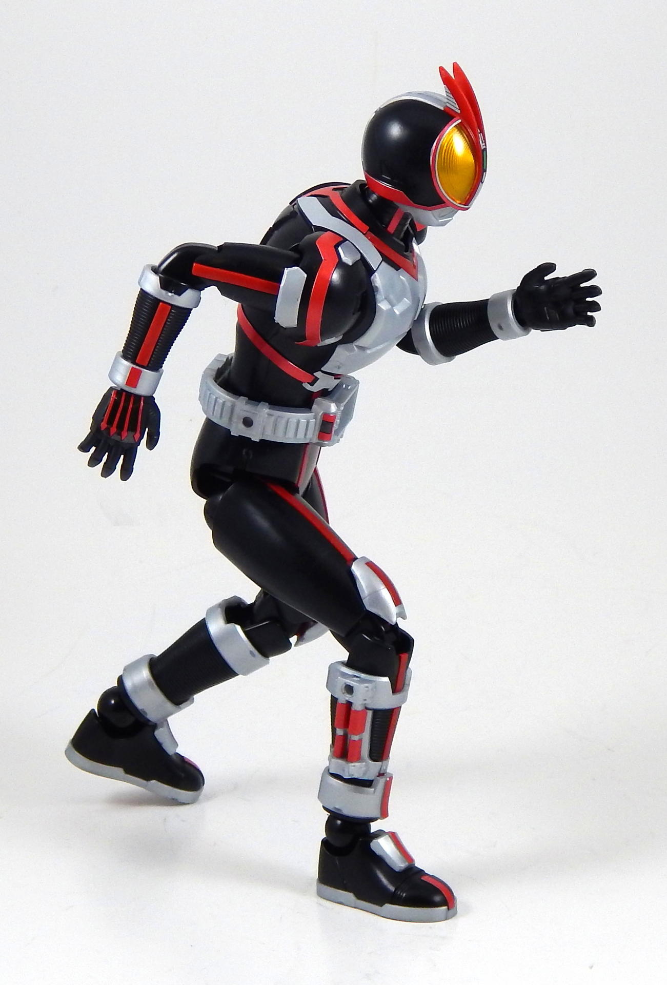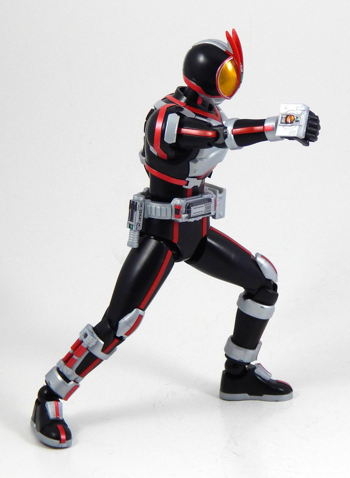 In short, this model kit was fun to build, it's quite detailed, it is very poseable, and has a great selection of accessories. It's a little bigger than the Figuarts, closer in scale to the Star Wars Black 6" figures and Marvel Legends. That's the minimum you should know about this kit. For further thoughts and info, read on. I have a smattering of experience with Bandai models, having assembled a couple each of Gundam High Grades, Master Grades and Real Grades, as well as some Kamen Rider Master Grade Figure-rise kits (TaToBa and all of the W kits, except CycloneJoker). This is my first experience with the Figure-rise 6 line, and it reminded me most of the more recent High Grade Gundam kits, in that it was both simpler than the Master Grade lines, but still surprisingly detailed. Consisting of 6 trees of parts (one of which is the stand, one being the effects pieces), Faiz doesn't have a super high parts count, but what he has is impressive. A lot of the detail is dealt with via stickers (there is an impressive sheet of around 60 labels), but a decent amount is managed through plastic. Take the red power lines all through Faiz' suit. It's about 50/50 split between red plastic and red stickers. The stickers are slightly metallic red, while the plastic is a more dull red, but the difference isn't all that noticeable. It is the main point where a Master Grade would be an improvement though, as I would expect much more of the red lines to be handled by plastic. I found the stickers to be a breeze to apply, even the longer straight ones weren't difficult to get aligned correctly. The only stickers that don't go one easily, or don't look pretty natural when applied, are those that go over the Mission Memory sculpts. It's hard to get them to lie smoothly on the big, rounded surface. The kit snaps together easily, everything fits together snugly. Some of the pieces require a decent amount of force to snap into place. I didn't push the arms into the shoulder joints hard enough at first, so you may notice that in some of the pictures there's a bit of a gap between the biceps and the shoulders. The articulation is quite good, nearly on part with a Figuarts, in most places. The biggest disappointment to me, is that the foot is one solid piece. I really like toys to have toe joints. The wrists are probably the most limited joint, with almost no range to them. Everything else is going to give you all the range you want. The two torso ball joints, in particular, I found to have a really good range of movement. The hips even hinge downward like the Figuarts to, allowing the legs to reach higher than the sculpt would otherwise allow (though it can introduce unsightly gaps in the sculpt in some poses). The figure is much lighter than the Faiz Figuarts, despite being a little bit larger. It balances very well, despite the light, plastic feet, though one of the one-legged poses I put him in require a couple extra minutes of fiddling with to get him to balance right. As for accessories, Figure-rise Faiz comes with everything he could possibly need for his default form, and a little more even. He has two pairs of hands, fists and open hands, and two gripping right hands. He has the Faiz Pointer in two modes, the Faiz Shot with working handle and holder, as well as an extra Faiz Shot sculpted into the holder. There are three versions of the phone, the Faiz Edge, and finally, there is the Axel Watch, which can attach to his left wrist. Comparing the accessories to those of the Figuarts, the Figure-rise versions are a little bit more detailed, in some respects, thanks to the stickers, but the Figuarts make up for it in paint. We get three variations on the Faiz Phone, one molded in gun mode (with a slight chunk removed from the handle so it fits in the gun-holding hand better). The other two phones are constructed of three pieces and are functional in ways I did not expect on a 6 inch figure, indeed, the Figuarts doesn't include functional phones like this either. The phones flip open and closed, and can even turn into the gun mode. It's definitely something I would have only expected for the larger MG Figure-rise line. The difference between them is that one is sculpted and stickered without the Mission Memory. The only drawbacks to the accessories is firstly, the Faiz Edge remains nearly colorless in the stock build. There is no red sticker for the blade part of it, nor the black grip. All we get is a Mission Memory sticker, and that's a bit disappointing, though likely stickers would have been unpleasant to apply, or looked bad. Secondly, I would have really liked a case to hold the Faiz Gear in. I have a thing for gear that stores neatly in cases, and the Double Driver case and memories that comes with MG Figure-rise Skull is honestly half of the reason that I bought that kit. But, while a case for the gear would have been an awesome addition, it is by no means a requirement for a kit such as this, so it's not something that really counts against it. For this review, I build the figure as directed by the manual, to show what the stock build looks like. It's mostly quite nice, but to improve it a little, all of the red plastic lines could be painted over with metallic red, to make them match the stickers better, and, like the Figuarts, the fingertips lack the silver paint that is one of the standout aspects of the Faiz suits. The silver plastic is noticeably swirly in places, so it would also benefit from some silver paint (I did so on the MG Figure-rise Accel kit, and it massively improved the look). Speaking of silver paint, this figure can be customized into Faiz Axel Form by painting all the red lines silver, and opening the chest pieces, which are constructed specifically for this option. Overall, I was very please with this kit. It's an excellent representation of one of my favorite suit designs, I would definitely buy a Faiz Blaster Form kit, as well as kits of the other Riders from this show. It feat