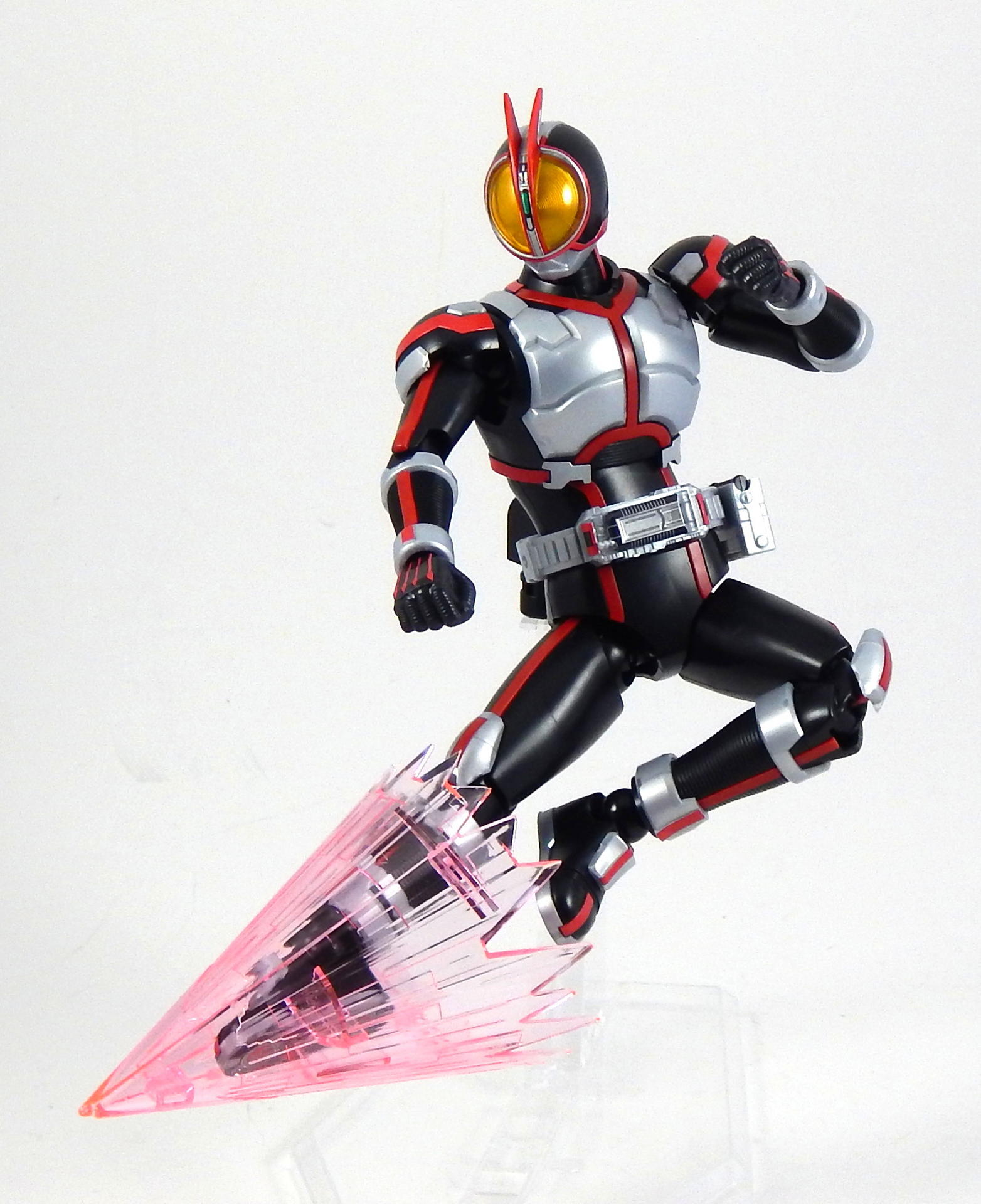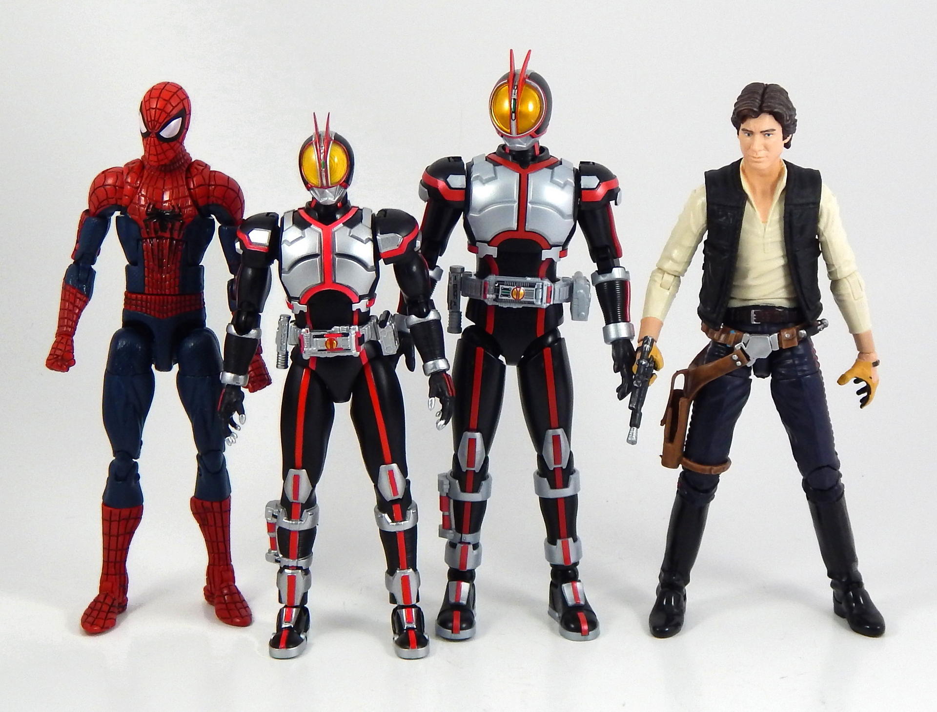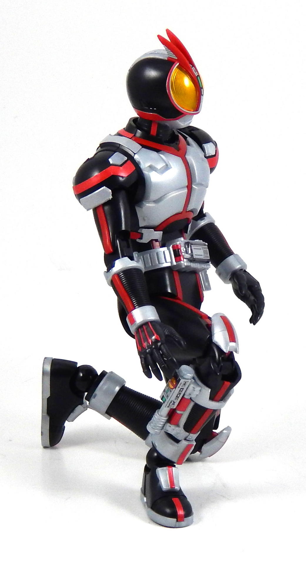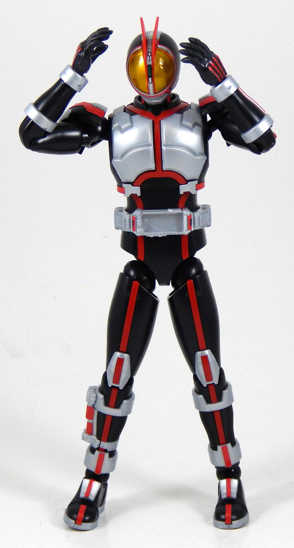 In short, this model kit was fun to build, it's quite detailed, it is very poseable, and has a great selection of accessories. It's a little bigger than the Figuarts, closer in scale to the Star Wars Black 6" figures and Marvel Legends. That's the minimum you should know about this kit. For further thoughts and info, read on. I have a smattering of experience with Bandai models, having assembled a couple each of Gundam High Grades, Master Grades and Real Grades, as well as some Kamen Rider Master Grade Figure-rise kits (TaToBa and all of the W kits, except CycloneJoker). This is my first experience with the Figure-rise 6 line, and it reminded me most of the more recent High Grade Gundam kits, in that it was both simpler than the Master Grade lines, but still surprisingly detailed. Consisting of 6 trees of parts (one of which is the stand, one being the effects pieces), Faiz doesn't have a super high parts count, but what he has is impressive. A lot of the detail is dealt with via stickers (there is an impressive sheet of around 60 labels), but a decent amount is managed through plastic. Take the red power lines all through Faiz' suit. It's about 50/50 split between red plastic and red stickers. The stickers are slightly metallic red, while the plastic is a more dull red, but the difference isn't all that noticeable. It is the main point where a Master Grade would be an improvement though, as I would expect much more of the red lines to be handled by plastic. I found the stickers to be a breeze to apply, even the longer straight ones weren't difficult to get aligned correctly. The only stickers that don't go one easily, or don't look pretty natural when applied, are those that go over the Mission Memory sculpts. It's hard to get them to lie smoothly on the big, rounded surface. The kit snaps together easily, everything fits together snugly. Some of the pieces require a decent amount of force to snap into place. I didn't push the arms into the shoulder joints hard enough at first, so you may notice that in some of the pictures there's a bit of a gap between the biceps and the shoulders. The articulation is quite good, nearly on part with a Figuarts, in most places. The biggest disappointment to me, is that the foot is one solid piece. I really like toys to have toe joints. The wrists are probably the most limited joint, with almost no range to them. Everything else is going to give you all the range you want. The two torso ball joints, in particular, I found to have a really good range of movement. The hips even hinge downward like the Figuarts to, allowing the legs to reach higher than the sculpt would otherwise allow (though it can introduce unsightly gaps in the sculpt in some poses). The figure is much lighter than the Faiz Figuarts, despite being a little bit larger. It balances very well, despite the light, plastic feet, though one of the one-legged poses I put him in require a couple extra minutes of fiddling with to get him to balance right. As for accessories, Figure-rise Faiz comes with everything he could possibly need for his default form, and a little more even. He has two pairs of hands, fists and open hands, and two gripping right hands. He has the Faiz Pointer in two modes, the Faiz Shot with working handle and holder, as well as an extra Faiz Shot sculpted into the holder. There are three versions of the phone, the Faiz Edge, and finally, there is the Axel Watch, which can attach to his left wrist. Comparing the accessories to those of the Figuarts, the Figure-rise versions are a little bit more detailed, in some respects, thanks to the stickers, but the Figuarts make up for it in paint. We get three variations on the Faiz Phone, one molded in gun mode (with a slight chunk removed from the handle so it fits in the gun-holding hand better). The other two phones are constructed of three pieces and are functional in ways I did not expect on a 6 inch figure, indeed, the Figuarts doesn't include functional phones like this either. The phones flip open and closed, and can even turn into the gun mode. It's definitely something I would have only expected for the larger MG Figure-rise line. The difference between them is that one is sculpted and stickered without the Mission Memory. The only drawbacks to the accessories is firstly, the Faiz Edge remains nearly colorless in the stock build. There is no red sticker for the blade part of it, nor the black grip. All we get is a Mission Memory sticker, and that's a bit disappointing, though likely stickers would have been unpleasant to apply, or looked bad. Secondly, I would have really liked a case to hold the Faiz Gear in. I have a thing for gear that stores neatly in cases, and the Double Driver case and memories that comes with MG Figure-rise Skull is honestly half of the reason that I bought that kit. But, while a case for the gear would have been an awesome addition, it is by no means a requirement for a kit such as this, so it's not something that really counts against it. For this review, I build the figure as directed by the manual, to show what the stock build looks like. It's mostly quite nice, but to improve it a little, all of the red plastic lines could be painted over with metallic red, to make them match the stickers better, and, like the Figuarts, the fingertips lack the silver paint that is one of the standout aspects of the Faiz suits. The silver plastic is noticeably swirly in places, so it would also benefit from some silver paint (I did so on the MG Figure-rise Accel kit, and it massively improved the look). Speaking of silver paint, this figure can be customized into Faiz Axel Form by painting all the red lines silver, and opening the chest pieces, which are constructed specifically for this option. Overall, I was very please with this kit. It's an excellent representation of one of my favorite suit designs, I would definitely buy a Faiz Blaster Form kit, as well as kits of the other Riders from this show. It feat