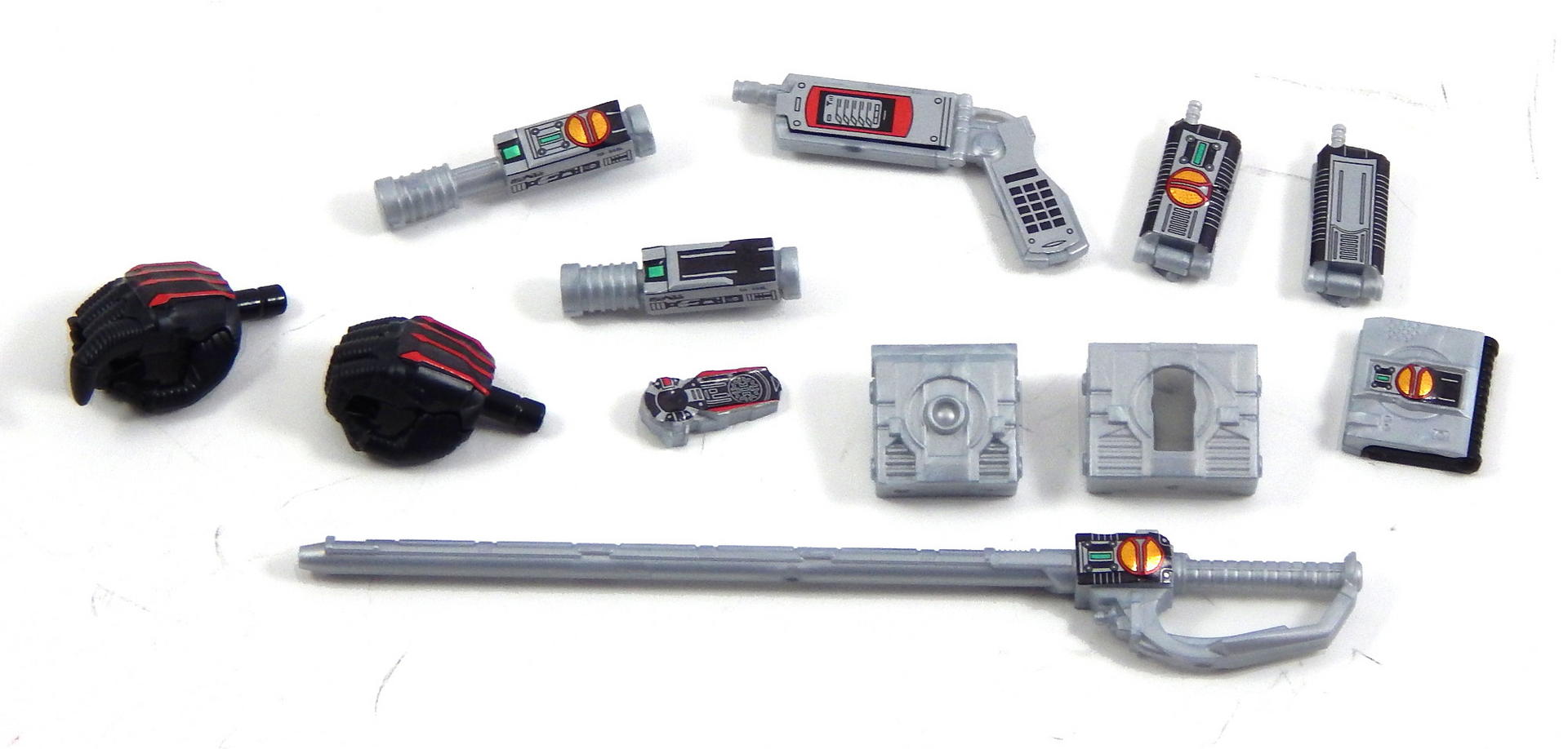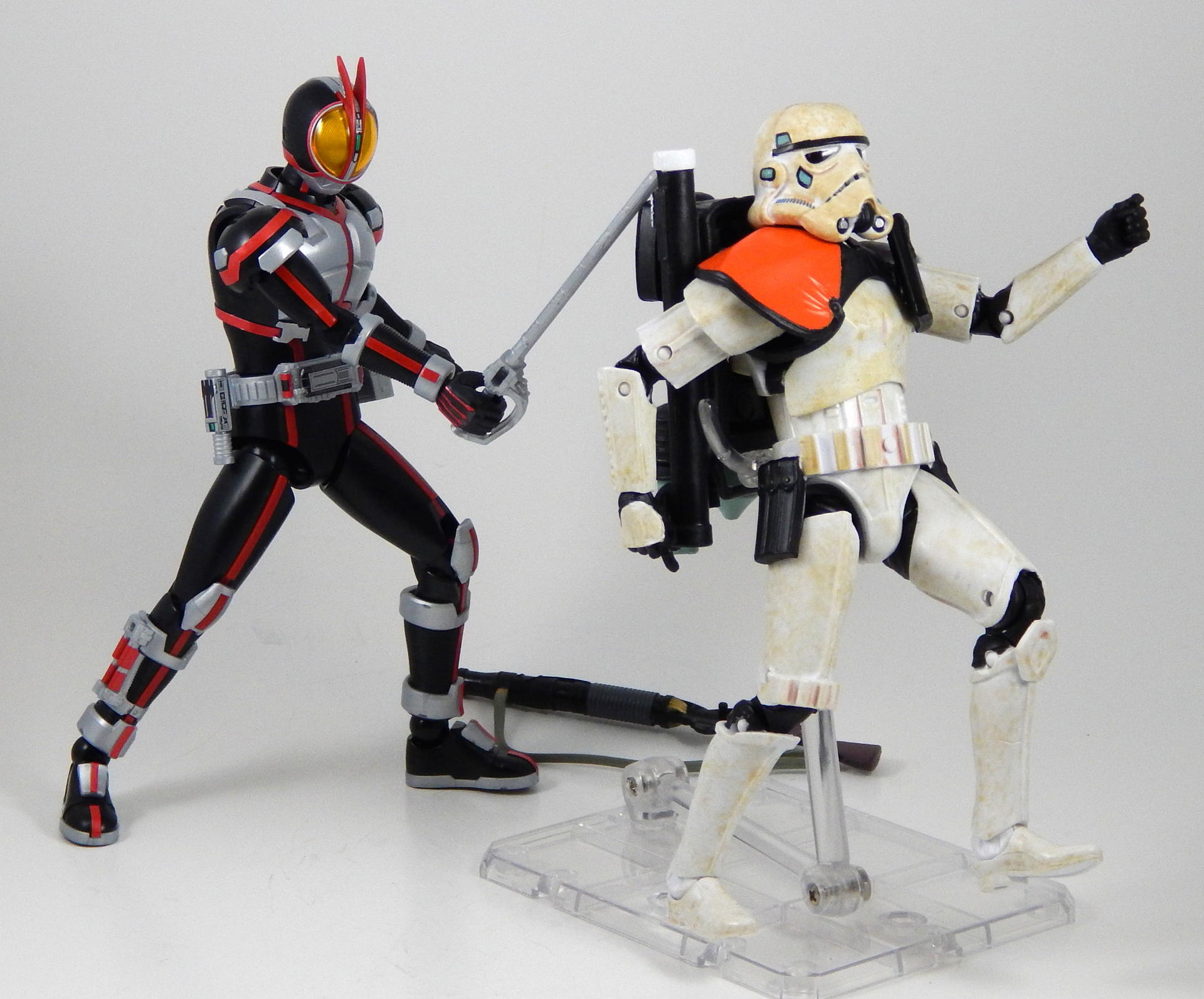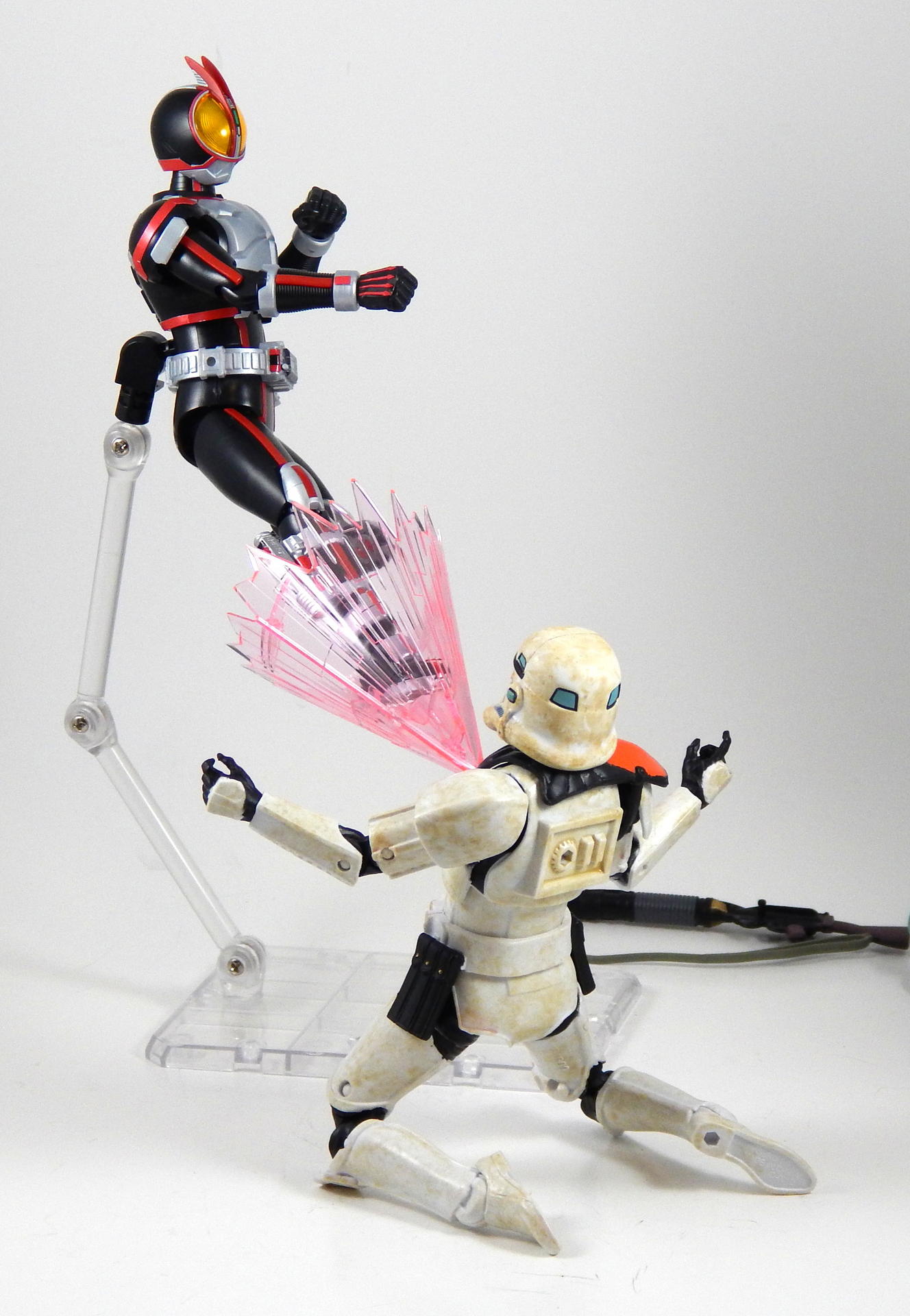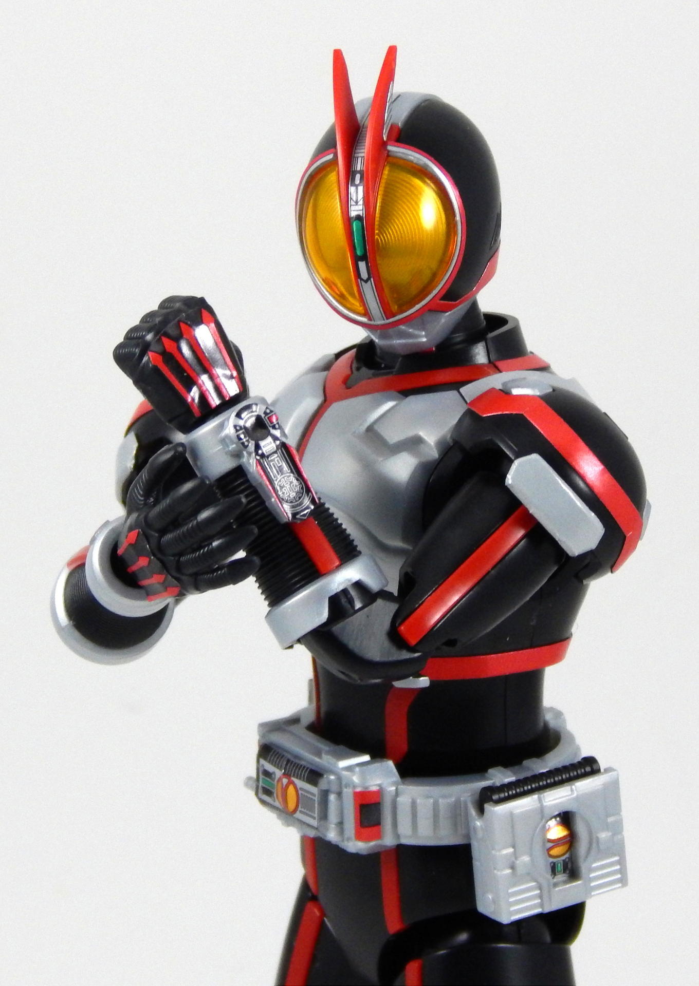 In short, this model kit was fun to build, it's quite detailed, it is very poseable, and has a great selection of accessories. It's a little bigger than the Figuarts, closer in scale to the Star Wars Black 6" figures and Marvel Legends. That's the minimum you should know about this kit. For further thoughts and info, read on. I have a smattering of experience with Bandai models, having assembled a couple each of Gundam High Grades, Master Grades and Real Grades, as well as some Kamen Rider Master Grade Figure-rise kits (TaToBa and all of the W kits, except CycloneJoker). This is my first experience with the Figure-rise 6 line, and it reminded me most of the more recent High Grade Gundam kits, in that it was both simpler than the Master Grade lines, but still surprisingly detailed. Consisting of 6 trees of parts (one of which is the stand, one being the effects pieces), Faiz doesn't have a super high parts count, but what he has is impressive. A lot of the detail is dealt with via stickers (there is an impressive sheet of around 60 labels), but a decent amount is managed through plastic. Take the red power lines all through Faiz' suit. It's about 50/50 split between red plastic and red stickers. The stickers are slightly metallic red, while the plastic is a more dull red, but the difference isn't all that noticeable. It is the main point where a Master Grade would be an improvement though, as I would expect much more of the red lines to be handled by plastic. I found the stickers to be a breeze to apply, even the longer straight ones weren't difficult to get aligned correctly. The only stickers that don't go one easily, or don't look pretty natural when applied, are those that go over the Mission Memory sculpts. It's hard to get them to lie smoothly on the big, rounded surface. The kit snaps together easily, everything fits together snugly. Some of the pieces require a decent amount of force to snap into place. I didn't push the arms into the shoulder joints hard enough at first, so you may notice that in some of the pictures there's a bit of a gap between the biceps and the shoulders. The articulation is quite good, nearly on part with a Figuarts, in most places. The biggest disappointment to me, is that the foot is one solid piece. I really like toys to have toe joints. The wrists are probably the most limited joint, with almost no range to them. Everything else is going to give you all the range you want. The two torso ball joints, in particular, I found to have a really good range of movement. The hips even hinge downward like the Figuarts to, allowing the legs to reach higher than the sculpt would otherwise allow (though it can introduce unsightly gaps in the sculpt in some poses). The figure is much lighter than the Faiz Figuarts, despite being a little bit larger. It balances very well, despite the light, plastic feet, though one of the one-legged poses I put him in require a couple extra minutes of fiddling with to get him to balance right. As for accessories, Figure-rise Faiz comes with everything he could possibly need for his default form, and a little more even. He has two pairs of hands, fists and open hands, and two gripping right hands. He has the Faiz Pointer in two modes, the Faiz Shot with working handle and holder, as well as an extra Faiz Shot sculpted into the holder. There are three versions of the phone, the Faiz Edge, and finally, there is the Axel Watch, which can attach to his left wrist. Comparing the accessories to those of the Figuarts, the Figure-rise versions are a little bit more detailed, in some respects, thanks to the stickers, but the Figuarts make up for it in paint. We get three variations on the Faiz Phone, one molded in gun mode (with a slight chunk removed from the handle so it fits in the gun-holding hand better). The other two phones are constructed of three pieces and are functional in ways I did not expect on a 6 inch figure, indeed, the Figuarts doesn't include functional phones like this either. The phones flip open and closed, and can even turn into the gun mode. It's definitely something I would have only expected for the larger MG Figure-rise line. The difference between them is that one is sculpted and stickered without the Mission Memory. The only drawbacks to the accessories is firstly, the Faiz Edge remains nearly colorless in the stock build. There is no red sticker for the blade part of it, nor the black grip. All we get is a Mission Memory sticker, and that's a bit disappointing, though likely stickers would have been unpleasant to apply, or looked bad. Secondly, I would have really liked a case to hold the Faiz Gear in. I have a thing for gear that stores neatly in cases, and the Double Driver case and memories that comes with MG Figure-rise Skull is honestly half of the reason that I bought that kit. But, while a case for the gear would have been an awesome addition, it is by no means a requirement for a kit such as this, so it's not something that really counts against it. For this review, I build the figure as directed by the manual, to show what the stock build looks like. It's mostly quite nice, but to improve it a little, all of the red plastic lines could be painted over with metallic red, to make them match the stickers better, and, like the Figuarts, the fingertips lack the silver paint that is one of the standout aspects of the Faiz suits. The silver plastic is noticeably swirly in places, so it would also benefit from some silver paint (I did so on the MG Figure-rise Accel kit, and it massively improved the look). Speaking of silver paint, this figure can be customized into Faiz Axel Form by painting all the red lines silver, and opening the chest pieces, which are constructed specifically for this option. Overall, I was very please with this kit. It's an excellent representation of one of my favorite suit designs, I would definitely buy a Faiz Blaster Form kit, as well as kits of the other Riders from this show. It feat