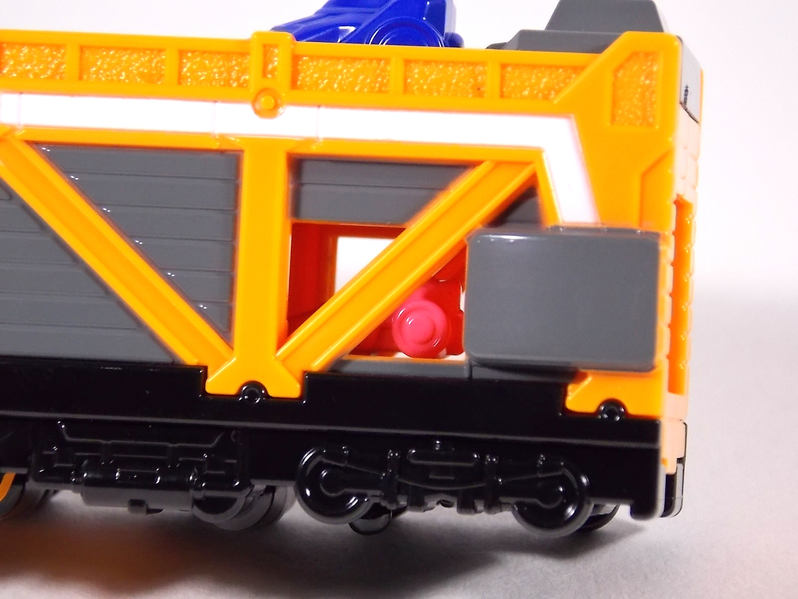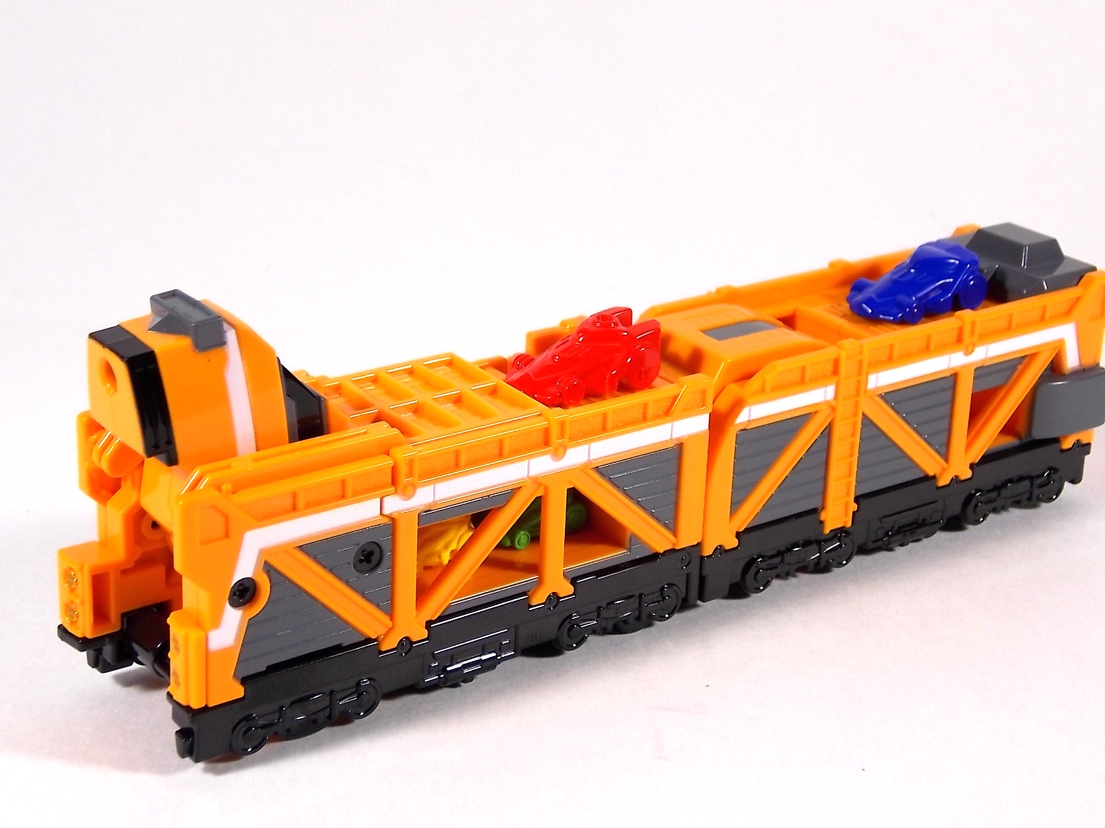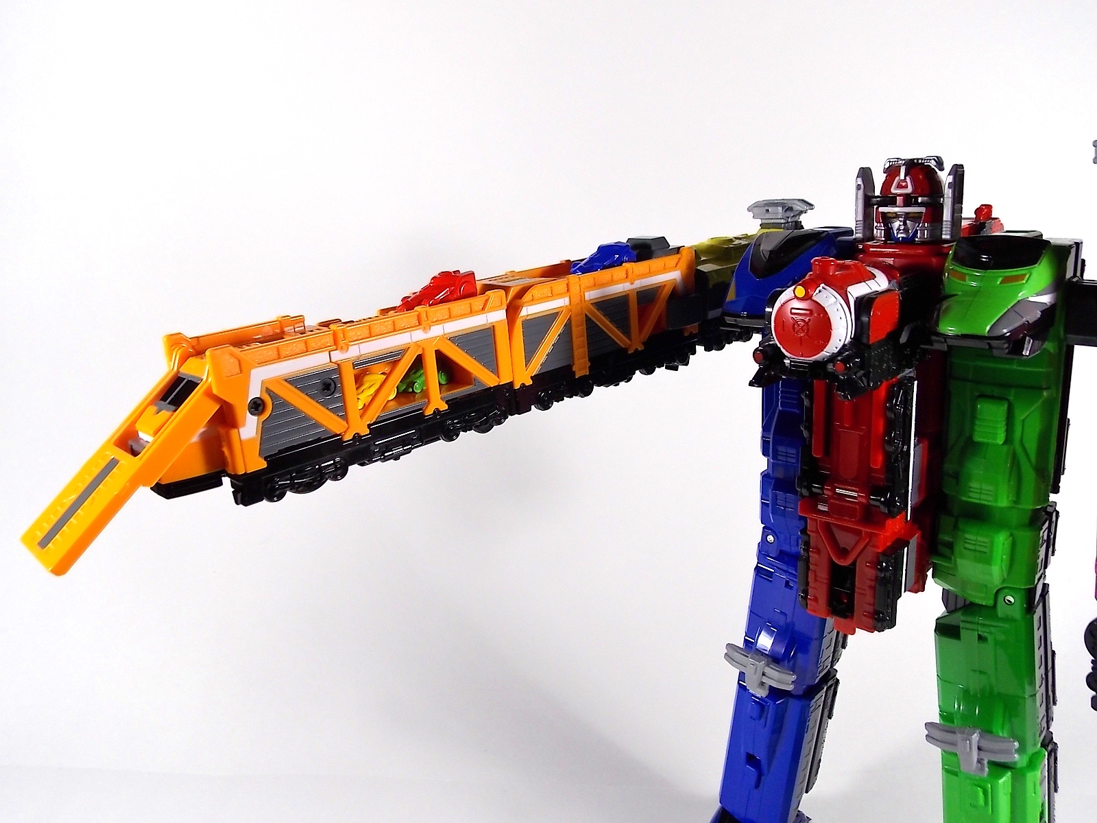 The train has made another pass at the TokuNation station for a glerry! Today we've got a doubled up one for you, the DX Car Carrier & Tank Resshas from Ressha Sentai ToQger! This pair was recently released ahead of their friend Diesel Ressha. We know they can combine with it to form Diesel Oh, but how do Tank & Car Carrier stand up on their own? Read on! Let's start with Car Carrier Ressha. This one is definitely unique. By now the size of DX Reshas should be no surprise, these things are fairly small for DX's, but they usually pack a punch, and this one is no different. Car Carrier is another 2 car Ressha with a separating forward and rear section. Just like the 5 ToQ Oh Resshas, it has a square plug in the center that keeps the two ends combined and simultaneously facilitates combinations. Just as with the other and alternate train hitch is available for use. Car Carrier's feature is of course it's car carrying ability! Sculpted into Car Carrier are all 5 of the TOQger "Cars". These mini racecar like vehicles are all non-removable save for Red's. It pegs right on top of Car Carrier. Blue is molded in place permanently, and the other store are "stored" inside Carrier permanently. Though the ability to remove red doesn't get you much, aside from a fear of losing it. As in show a ramp folds down to allows the cars to driver off. This Ressha can replace ToQ Oh's right forearm to create ToQ Oh Car Carrier. This arms is long and heavy. Tank Ressha is the next Support Ressha in the line. This piece doesn't have quite as much functionality as Car Carrier. But it does look as nice. In Ressha form it has all the same basic features as it's predecessors. Though it has no gimmick. There honestly isn't much to say about this one on it's own. When split in half Tank Resha replaces both forerams of ToQ Oh to form ToQ Oh Tank. When Carrier & Tank are used simultaneosuly, ToQ Oh Car Carrier Tank is formed! Now of course the main draw of these two is the upcoming combination Diesel Oh that they can achieve with the Diesel ressha. For now though with just these two in hand, I can show you the various moving joints and tabs that facilitate that future combo. As you can see they attach to ToQ Oh's legs with fold out clips. The way the open end of each of them points outward from the foot would suggest they have a purpose for future combos, but that's more of a guess. They can also be hilariously used as gigantic stilt leg for ToQ Oh is desired. There's lots of swap out fun possible. I can't help but recommend DX Resshas. Despite what people may think, having these things in hand will sell you on them. These toys may look like bricks, but they are crisply painted, well engineered, fun toys. As cheap as the additional Resshas are you should definitely do yourself a favor and pick some of them up.