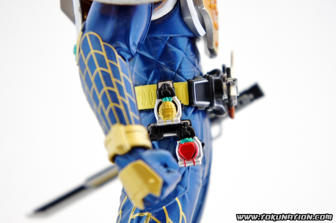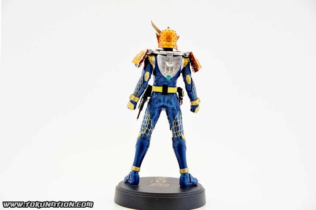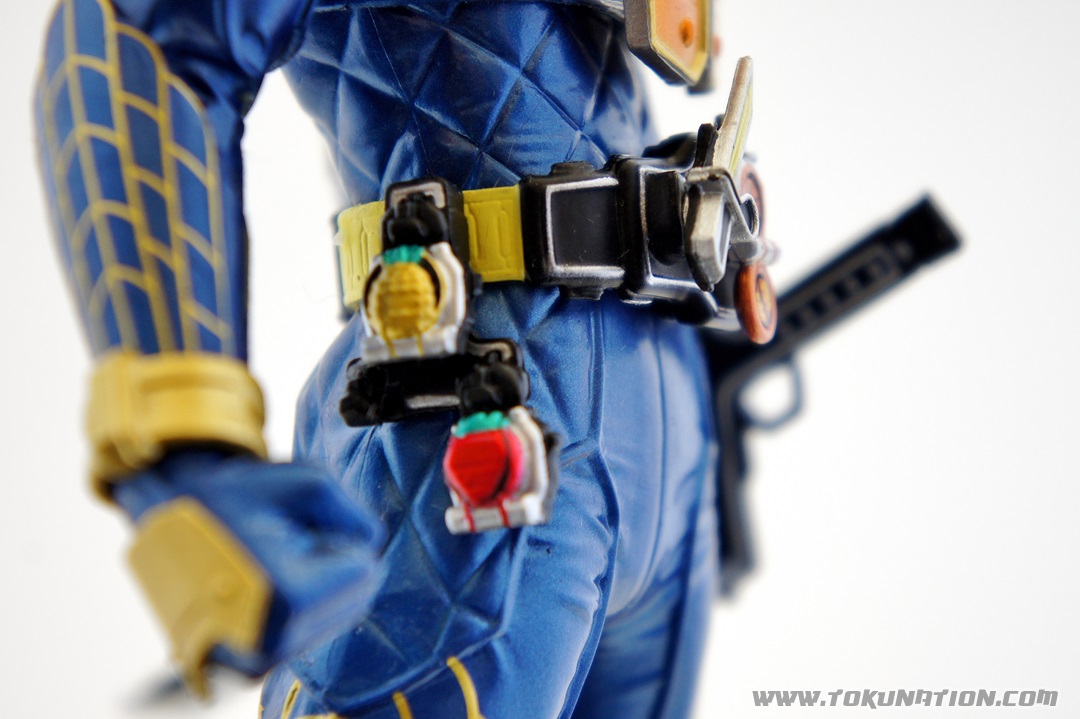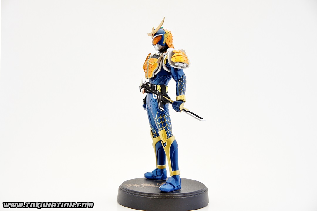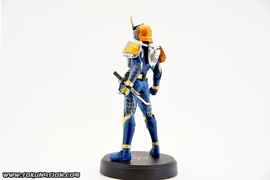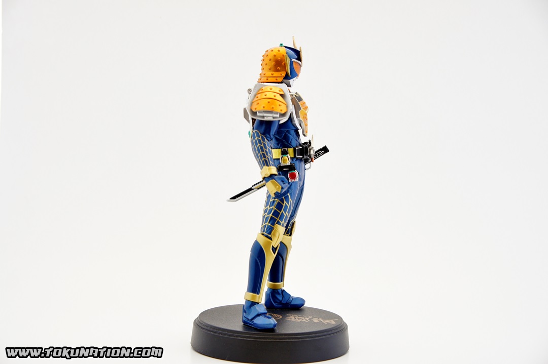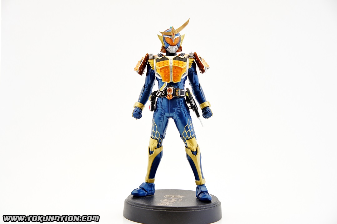 Known for making relatively good looking statues of the Kamen Rider heroes, Banpresto released their Kamen Rider Gaim statue of our favorite fruit-hero not long after the show began airing. Having seen a few vague previews of this statue, I thought it looked pretty neat, so I managed to snag one from Mandarake not long after they were released. And I was wrong - this thing doesn't look pretty neat. This thing looks absolutely gorgeous. The statue is, with the stand that the figure is on, over a foot tall (12 inches plus). The statue itself is hallow inside, making it incredibly light weight. The parts that you see (the Musou Saber, the crest on Gaim's helmet) may frighten you as "easily broken pieces", but that is not the case - the crest is actually made of either hardened rubber or super soft plastic, meaning that if the statue fell, that piece wouldn't be the first to pop off. The saber is a bit harder than that and, if you aim it right, could easily poke an eye out, but it's not going to cut you. The amount of detail that went in to this statue is incredible. The part that stands out to me the most is the effort that went in to the visor - as you can see in pictures, it just looks beautiful. Even the Sengoku Driver receives a nice bit of love that keeps it faithful to the show. The Pine and Ichigo Lockseeds that are attached to his belt do not have the same level of detail that you see with the rest of the statue, but it's a very minor complaint - they are so small and, compared to the rest of the figure, is easily forgivable. They do have some intricate details (the Pine Lockseed has the ridges and bumps actually sculpted in). Needless to say - if you're more than a casual fan of Kamen Rider Gaim then you need to pick this statue up. Banpresto outdid themselves with the Kamen Rider Gaim statue, and I cannot recommend it enough. While I am collecting nearly all the figurines from the Kamen Rider Gaim various toy lines, this will stand as a centerpiece to that collection because it just looks so cool. It's difficult to find this item still for sale in new condition at a reasonable price - however if you're familiar with Mandarake they have listings (as of the time of this post) for 1,500 yen. (For reference, I purchased mine for 2,500 yen).