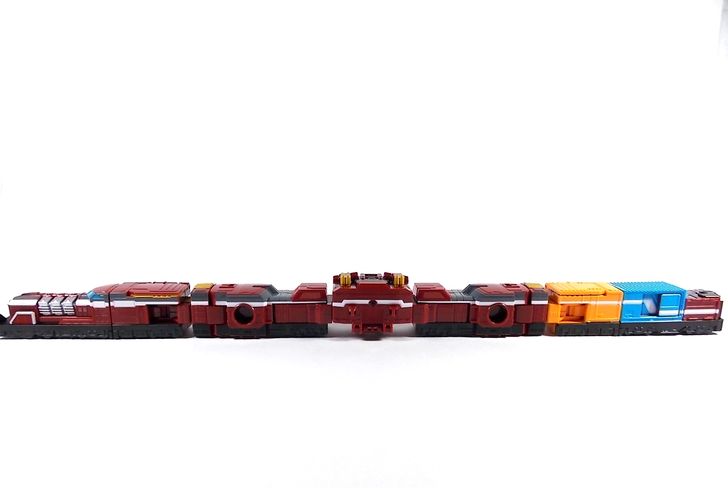 Another piece of merchandise from Ressha Sentai ToQger has just pulled into the station! And this time it's Grandpa himself, DX Diesel Ressha! Diesel Ressha of course facilitates a few new combinations with his fellow Resshas, so we'll get to those in the later part of the review. DX Disel Ressha on it's own is a big toy. Or rather it's a long toy. As you can see when packaged it comes in 5 separate pieces. The initial forward "engine" section is of course the actual Diesel Ressha. The one which is compatible with the ToQ Changer/Blaster/etc etc as a single car unit. The other 4 pieces form up to create the "second car" of this massive piece. At nearly twice the length of the full Red Ressha, it's a beast. Much like the initial ToQ Oh resshas it can separate and combine using the same square plug/socket system. However where this one is unique, is that the joints used for it's transformation are accessible in Ressha mode. Meaning you don't have to detach anything and fold out hitches like on the other Resshas, in order to get to move more naturally like a train would. though the hitches are still present as well. The best part about these joints being able to be used in this way, is that they can collapse and extend out from the main body of Ressha allowing them to be more easily hidden when not in use. An odd item of note is that at the verrrrry end of Diesel Ressha it has two colored sections at odds with the maroon of the main body. The tail end of the 4th "car" is orange and the 5th is half blue. Clearly meant to show how Diesel pairs up with Tank & Car Carrier Resshas for it's combined form. there are also some hidden panels on Diesel Oh's shoulders in robot mode that fold out and match this color scheme even better, really selling it. Now the odd part is that the small blue section of the 5th car has what's commonly referred to as a "hobo door". Referencing how people in older times would take a free rider on trains via these sliding doors. It's presence on the toy isn't explained, it's honestly a completely throwaway gimmick. Now, when combined with Tank Ressha & Car Carrier Resshas we form Diesel Oh! Diesel Oh may look boxy at first but I suggest taking a closer look to appreciate this form. Fans of GoGo Sentai Boukenger will notice an inherent resemblance to the Daibouken in it's various forms thanks to the molding of the chest, head & face as well as the glorious chrome chest. There's also an absolute ton of detail present on this thing. The molded in details on the body are very very sharp and plentiful. Just look at the back side of it for further proof. The afformentioned hidden panel gimmick really helps to sell the continuity of this piece. And the straight lines and boxy proportions really make this seem like a single robo with multiple colors on it, rather than 3 toys slapped together. It's a very fun toy that you need in hand to appreciate a little better. Now on to the final stop, Cho ToQ Oh! this big bulky robot is the combined form of Diesel Oh & ToQ Oh of course. the proportions of this form of course don't quite match up with the suits in show appearance. But that's not necessarily possible either. In show the Tank & Car Carrier outer legs shrink a bit as do the halves of Diesel that make up the new shoulders. The upper halves of Diesel become make shift shoulder mounted cannons that add to the imposing image of the figure. The new head created for this form is simply awesome. The extra tracks that fold out from the sides of the head and create the new head crest rock. DX Dieseal Ressha has made a pretty big splash. Bandai even decided to include a bonus with the first run releases of Diesel Ressha & the Diesel Oh boxed sets in the form of Rainbow Ressha! A so far toy exclusive Ressha which is a recast of the Gashapon Red Ressha. As such it isn't compatible with DX Resshas to form robo combinations. It can however be used with the ToQ Changer. When it is it should out the names of the 8 Resshas required to form Cho ToQ Oh and announces it's combination. If you haven't picked up DX Diesel Ressha then please do so. It may appear underwhelming at first but it's actually pretty damn awesome. At the prices it retails for along with the bonus Rainbow Ressha included with the first releases it's totally worth it. Den-O approves