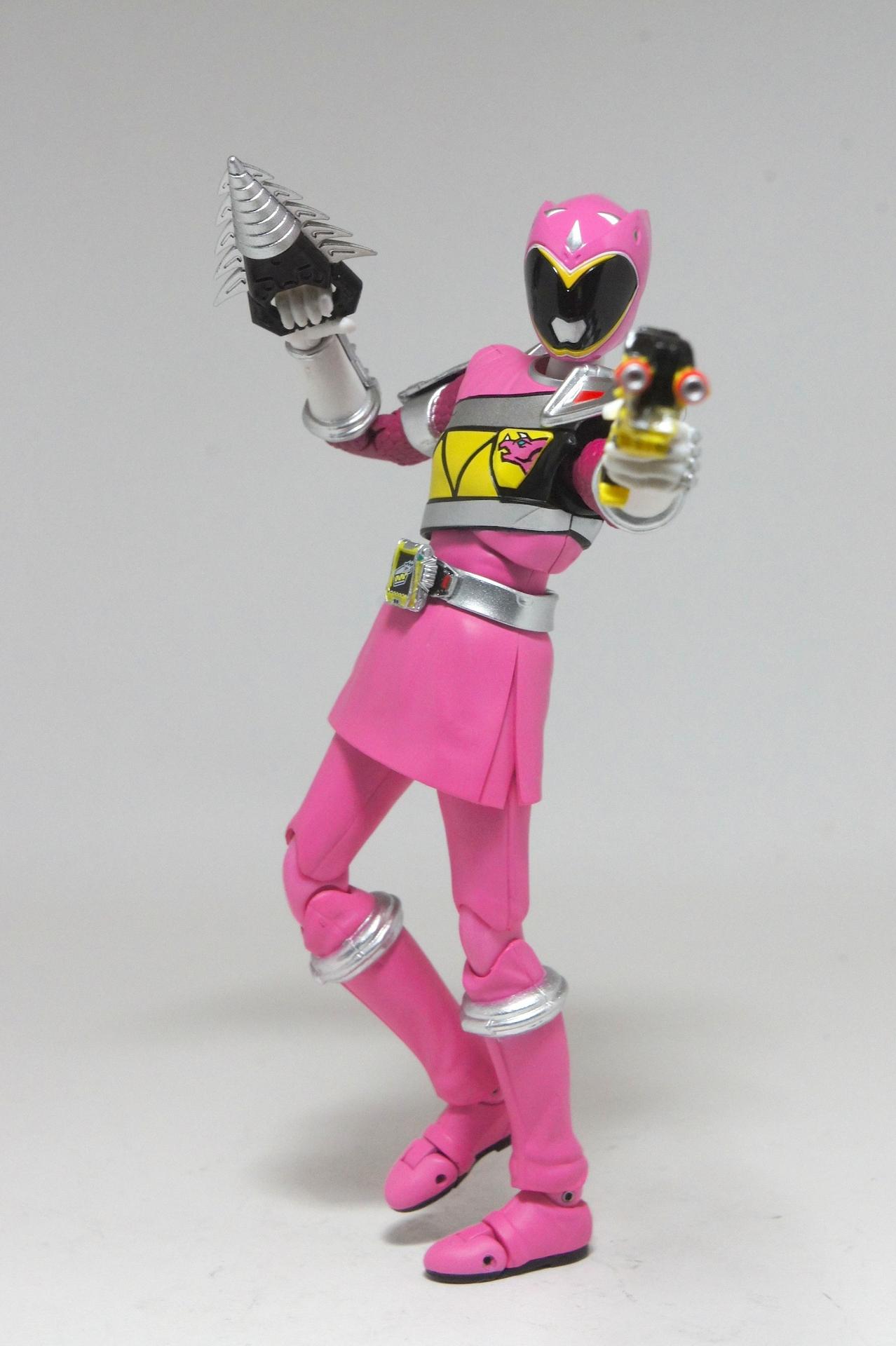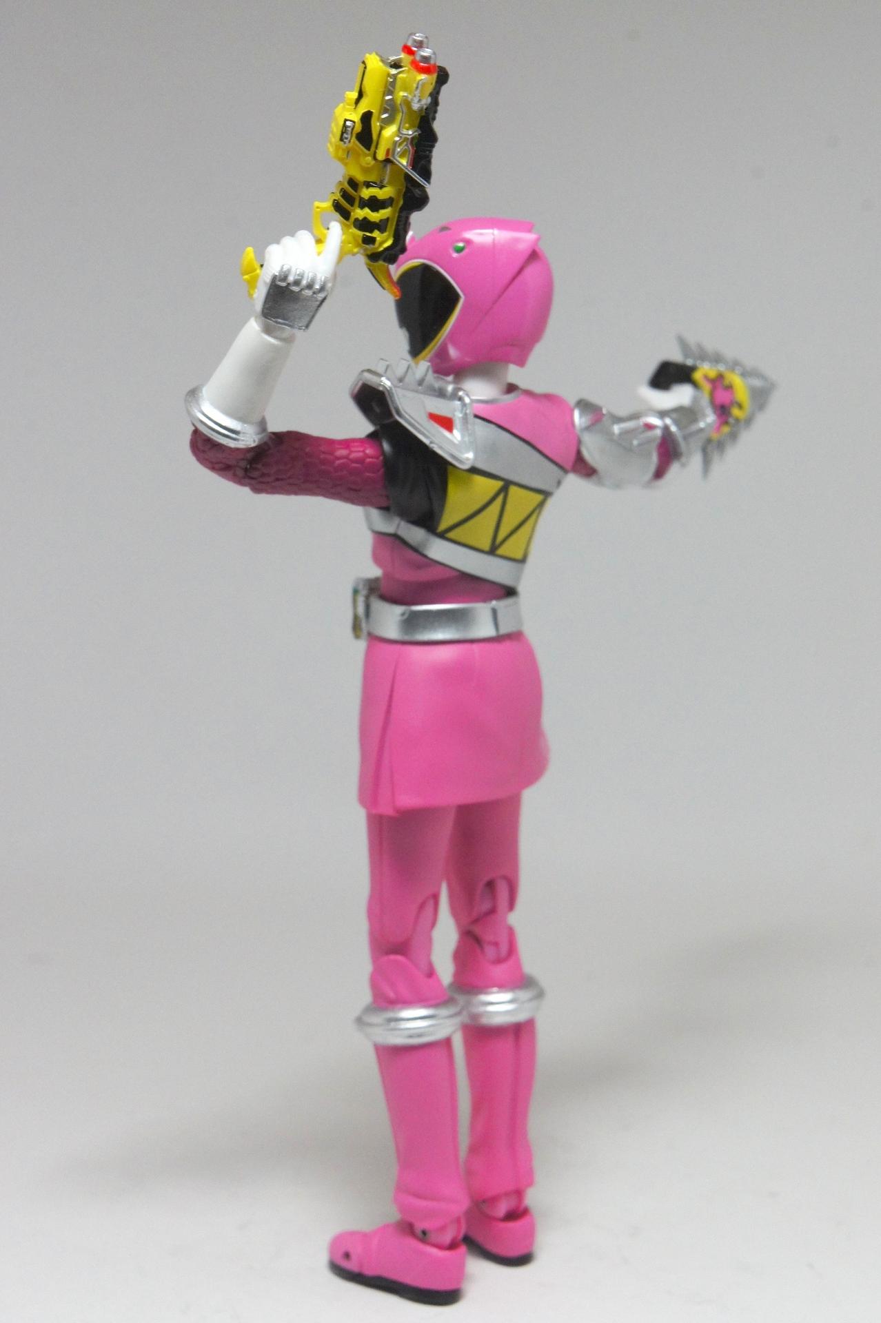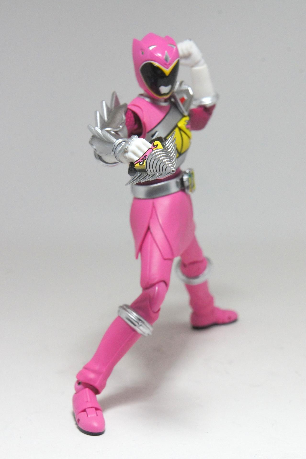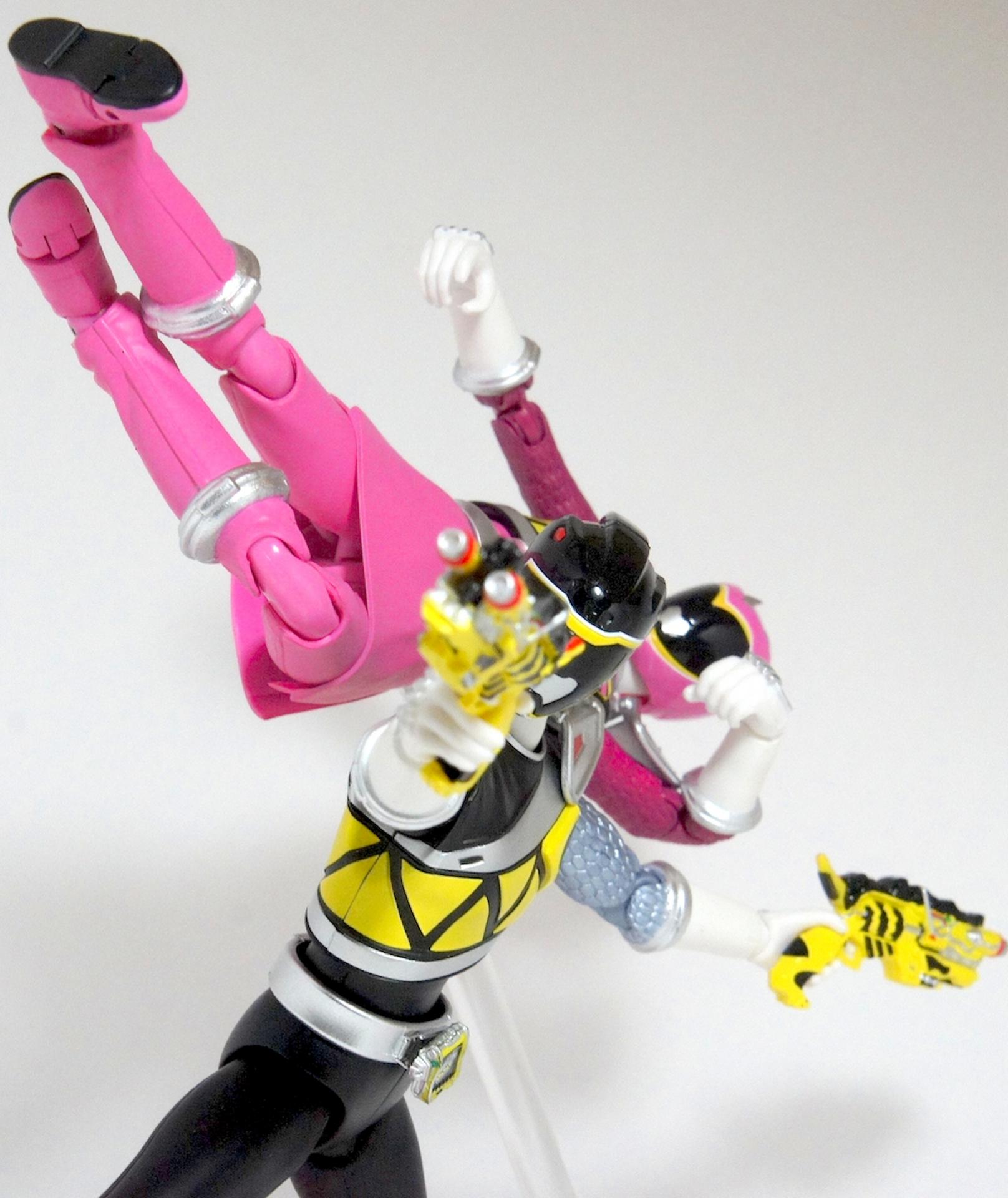 Tsuno No Yuusha! (The Horned Heroine) Kyoryu Pink! This gallery showcases 2 more members of the 37th Super Sentai, Zyuden Sentai Kyoryuger! The first of these figures is Kyoryu Black, otherwise known as Ian Yorkland! Ian is a young treasure hunter from Europe who became a Kyoryuger after an encounter with the Deboss Legion during a treasure hunt led to the death of his best friend. After falling and landing in front of a castle where his future partner Zyudenryu Parasagun was, Ian and the parasaurolophus battled until he was deemed worthy enough to be his partner. Although he makes his debut in the first episode, Ian doesn’t join the team until episode 4, when the very Deboss Legion member that he encountered months ago appears before him. A playboy, Ian is often at ends with his fellow teammate, Souji Rippukan/Kyoryu Green. Despite his playboy attitude, Ian cares for his teammates and for the girls he dates. He is designated as the leader of the team if Daigo is ever out of commission, proving to be a great strategist, but when he’s not, he’s shown to be their best sharpshooter, often dual wielding. Sharing the same body type as his fellow male Kyoryugers, Kyoryu Black is a glorious matte black body with a glossy black head and silver upper arms. Compared to the wrist issues seen on Kyoryu Red, Kyoryu Black’s hands are very easy to swap out. Just like his fellow Kyoryugers, Kyoryu Black comes with a number of accessories- 9 hands (3 for his role call poses, 2 for wielding the Gaburevolver, 2 for wielding the Gaburicalibur, and the standard Figuarts hands), a Gaburevolver, a small #2 Parasagun Zyudenchi, a Gaburicalibur, his Armed On arm and his Zyuden Arms weapon, the Parasa Shot bowgun. Just like the other Zyuden Arms weapons, the Parasa Shot has a thick handle, but can be held with the Gaburicalibur holding hand if you fiddle around with it. Also, the Parasa Shot can’t combine with the other weapons. The second figure in this set is Kyoryu Pink, representing Amy Yuuzuki! Amy is a young rich college student who resided in America when the Deboss Legion first attacked. After meeting her Zyudenryu partner, Dricera in the Grand Canyon, Amy fought the triceratops and was chosen by her to be her partner. The only girl on the team, Amy proves she is not to be messed with by being the resident kick chick- in fact; she once kicked two energy arrows behind her! Amy is the second/third member to join Daigo after witnessing him in action in episode 2. Amy is often seen at home with her butler Gentle, who tries to get her to act like the prim and proper heiress that she is. Despite this, Amy often works in the same restaurant that the team usually eats at/holds a portal into the Spirit Base. Kyoryu Pink stems away from the other Kyoryugers, with a smaller female body frame. Just like her teammates, she has multiple accessories- 4 hands for her different role call poses, 2 hands to hold the Gaburevolver, 2 hands to hold the Gaburicalibur, and the standard 2 Figuarts hands, the Gaburevolver, the Gaburicalibur, a small #5 Dricera Zyudenchi and her Armed On arm and her personal Zyuden Arms weapon, the DriceLance. As it turns out, the one included with the previous set, the Kyoryu Blue and Kyoryu Green Set, was the one for the Kentrospiker. Something to note is that she has the same sized hands as her other teammates and that her helmet seems a little small/her neck is too short. It is kind of difficult to get her into her role call pose as well. The shared accessory in this set is their Kentrospiker Part, a combination of Kyoryu Blue’s Stegochi Shield and Kyoryu Green’s Zakutor Slasher. Both can’t separate into their individual weapons. The DriceLance in that past set can combine with this accessory, forming the Shield LanSlasher! With the Fang Shot included with Kyoryu Gold, the team can complete the Kentrospiker accessory! They also lack the GaburiCannon as an accessory like the rest of their team. This set is really sweet, and I’m glad I managed to get them. They were initially released as a Tamashii Web Exclusive for April 2014. Stay tuned for Den-O’s gallery of the Thundering Hero! (See post 2 for more pics of Kyoryu Pink and the 5 Kyoryugers together!)