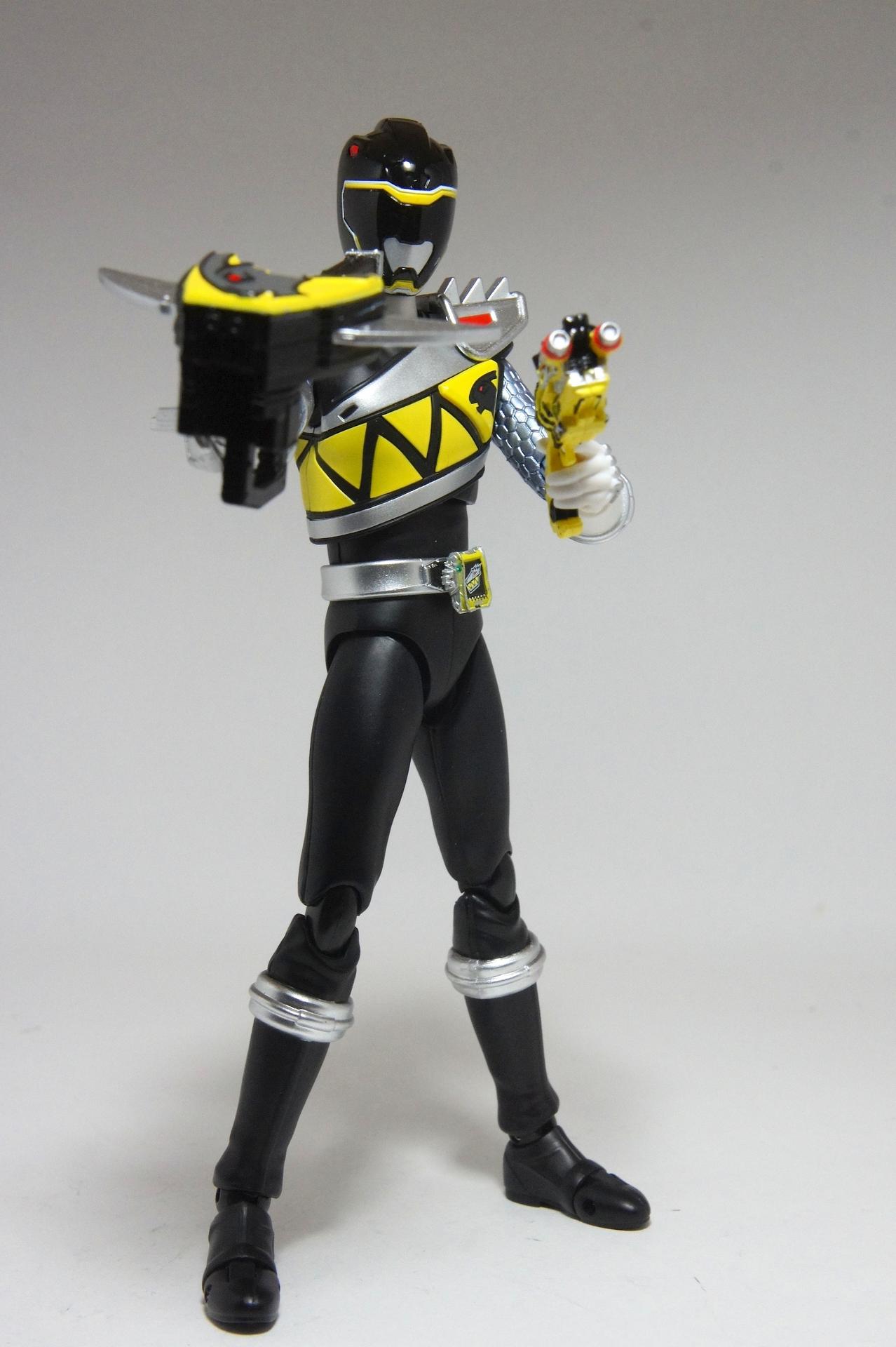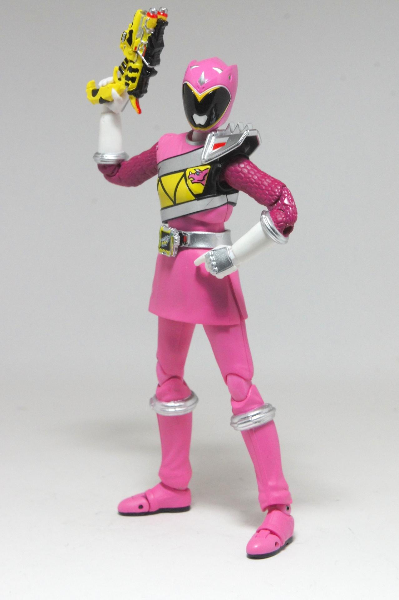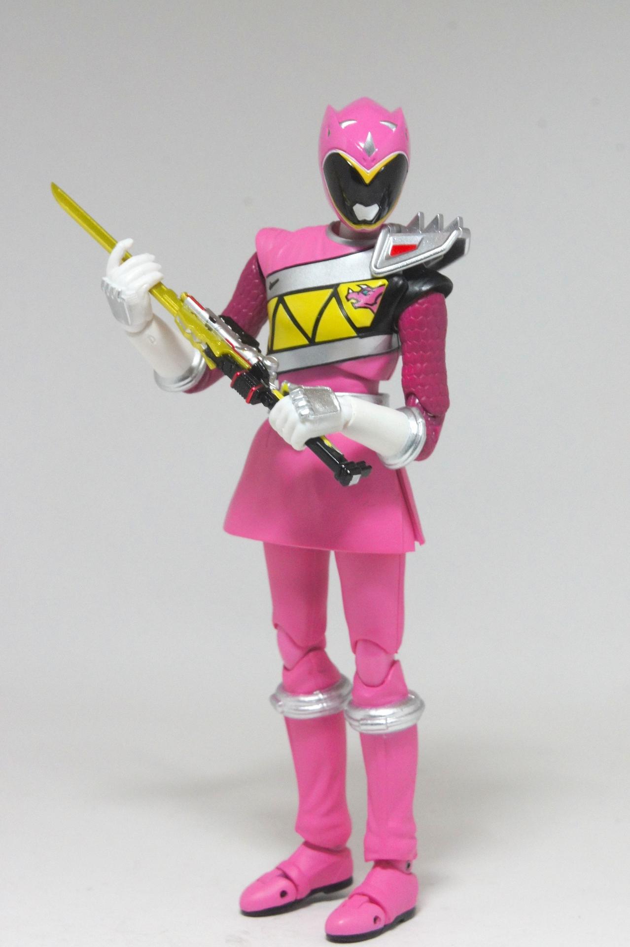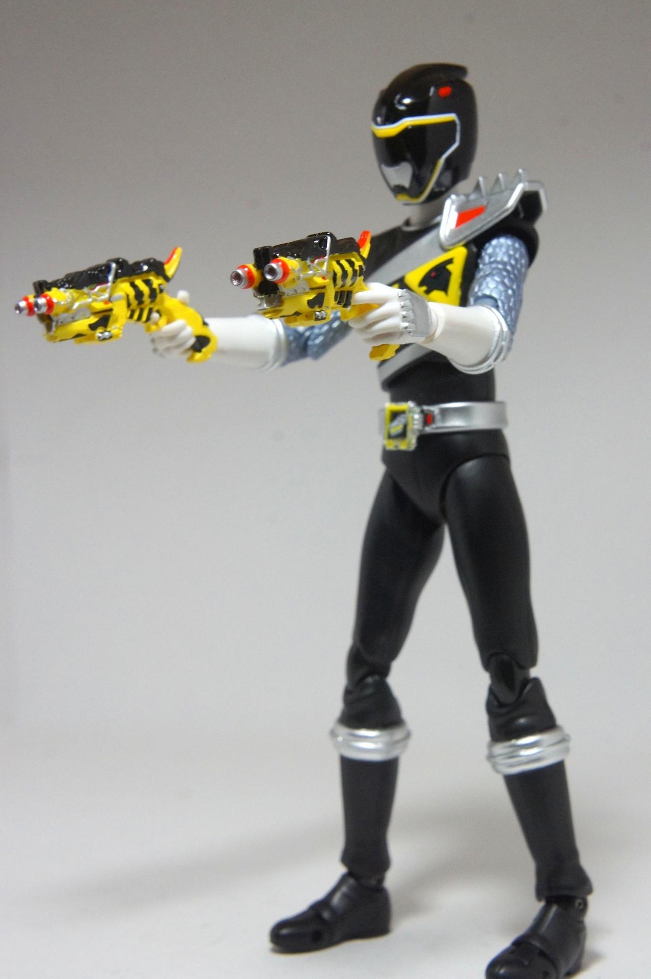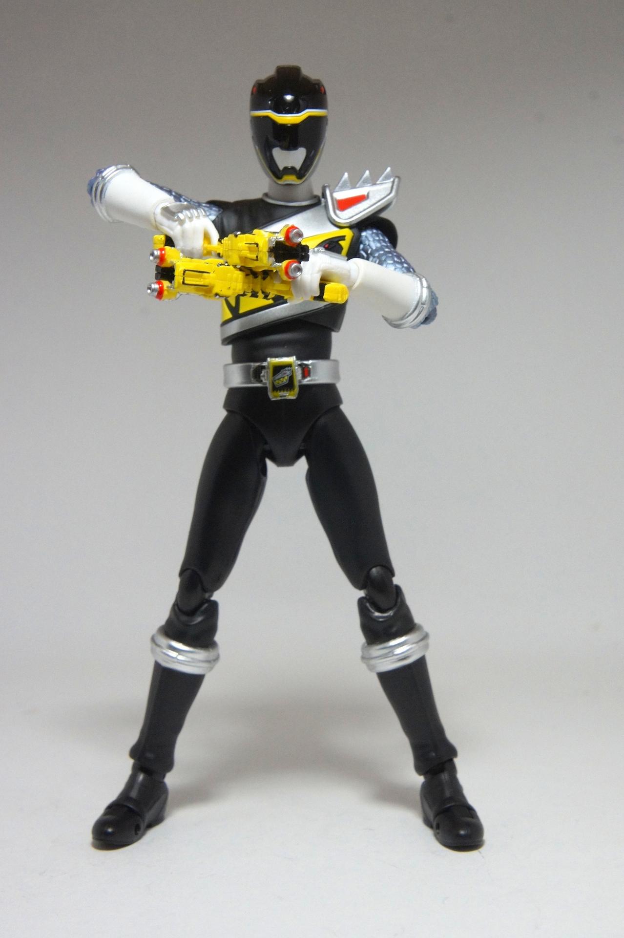 Tsuno No Yuusha! (The Horned Heroine) Kyoryu Pink! This gallery showcases 2 more members of the 37th Super Sentai, Zyuden Sentai Kyoryuger! The first of these figures is Kyoryu Black, otherwise known as Ian Yorkland! Ian is a young treasure hunter from Europe who became a Kyoryuger after an encounter with the Deboss Legion during a treasure hunt led to the death of his best friend. After falling and landing in front of a castle where his future partner Zyudenryu Parasagun was, Ian and the parasaurolophus battled until he was deemed worthy enough to be his partner. Although he makes his debut in the first episode, Ian doesn’t join the team until episode 4, when the very Deboss Legion member that he encountered months ago appears before him. A playboy, Ian is often at ends with his fellow teammate, Souji Rippukan/Kyoryu Green. Despite his playboy attitude, Ian cares for his teammates and for the girls he dates. He is designated as the leader of the team if Daigo is ever out of commission, proving to be a great strategist, but when he’s not, he’s shown to be their best sharpshooter, often dual wielding. Sharing the same body type as his fellow male Kyoryugers, Kyoryu Black is a glorious matte black body with a glossy black head and silver upper arms. Compared to the wrist issues seen on Kyoryu Red, Kyoryu Black’s hands are very easy to swap out. Just like his fellow Kyoryugers, Kyoryu Black comes with a number of accessories- 9 hands (3 for his role call poses, 2 for wielding the Gaburevolver, 2 for wielding the Gaburicalibur, and the standard Figuarts hands), a Gaburevolver, a small #2 Parasagun Zyudenchi, a Gaburicalibur, his Armed On arm and his Zyuden Arms weapon, the Parasa Shot bowgun. Just like the other Zyuden Arms weapons, the Parasa Shot has a thick handle, but can be held with the Gaburicalibur holding hand if you fiddle around with it. Also, the Parasa Shot can’t combine with the other weapons. The second figure in this set is Kyoryu Pink, representing Amy Yuuzuki! Amy is a young rich college student who resided in America when the Deboss Legion first attacked. After meeting her Zyudenryu partner, Dricera in the Grand Canyon, Amy fought the triceratops and was chosen by her to be her partner. The only girl on the team, Amy proves she is not to be messed with by being the resident kick chick- in fact; she once kicked two energy arrows behind her! Amy is the second/third member to join Daigo after witnessing him in action in episode 2. Amy is often seen at home with her butler Gentle, who tries to get her to act like the prim and proper heiress that she is. Despite this, Amy often works in the same restaurant that the team usually eats at/holds a portal into the Spirit Base. Kyoryu Pink stems away from the other Kyoryugers, with a smaller female body frame. Just like her teammates, she has multiple accessories- 4 hands for her different role call poses, 2 hands to hold the Gaburevolver, 2 hands to hold the Gaburicalibur, and the standard 2 Figuarts hands, the Gaburevolver, the Gaburicalibur, a small #5 Dricera Zyudenchi and her Armed On arm and her personal Zyuden Arms weapon, the DriceLance. As it turns out, the one included with the previous set, the Kyoryu Blue and Kyoryu Green Set, was the one for the Kentrospiker. Something to note is that she has the same sized hands as her other teammates and that her helmet seems a little small/her neck is too short. It is kind of difficult to get her into her role call pose as well. The shared accessory in this set is their Kentrospiker Part, a combination of Kyoryu Blue’s Stegochi Shield and Kyoryu Green’s Zakutor Slasher. Both can’t separate into their individual weapons. The DriceLance in that past set can combine with this accessory, forming the Shield LanSlasher! With the Fang Shot included with Kyoryu Gold, the team can complete the Kentrospiker accessory! They also lack the GaburiCannon as an accessory like the rest of their team. This set is really sweet, and I’m glad I managed to get them. They were initially released as a Tamashii Web Exclusive for April 2014. Stay tuned for Den-O’s gallery of the Thundering Hero! (See post 2 for more pics of Kyoryu Pink and the 5 Kyoryugers together!)