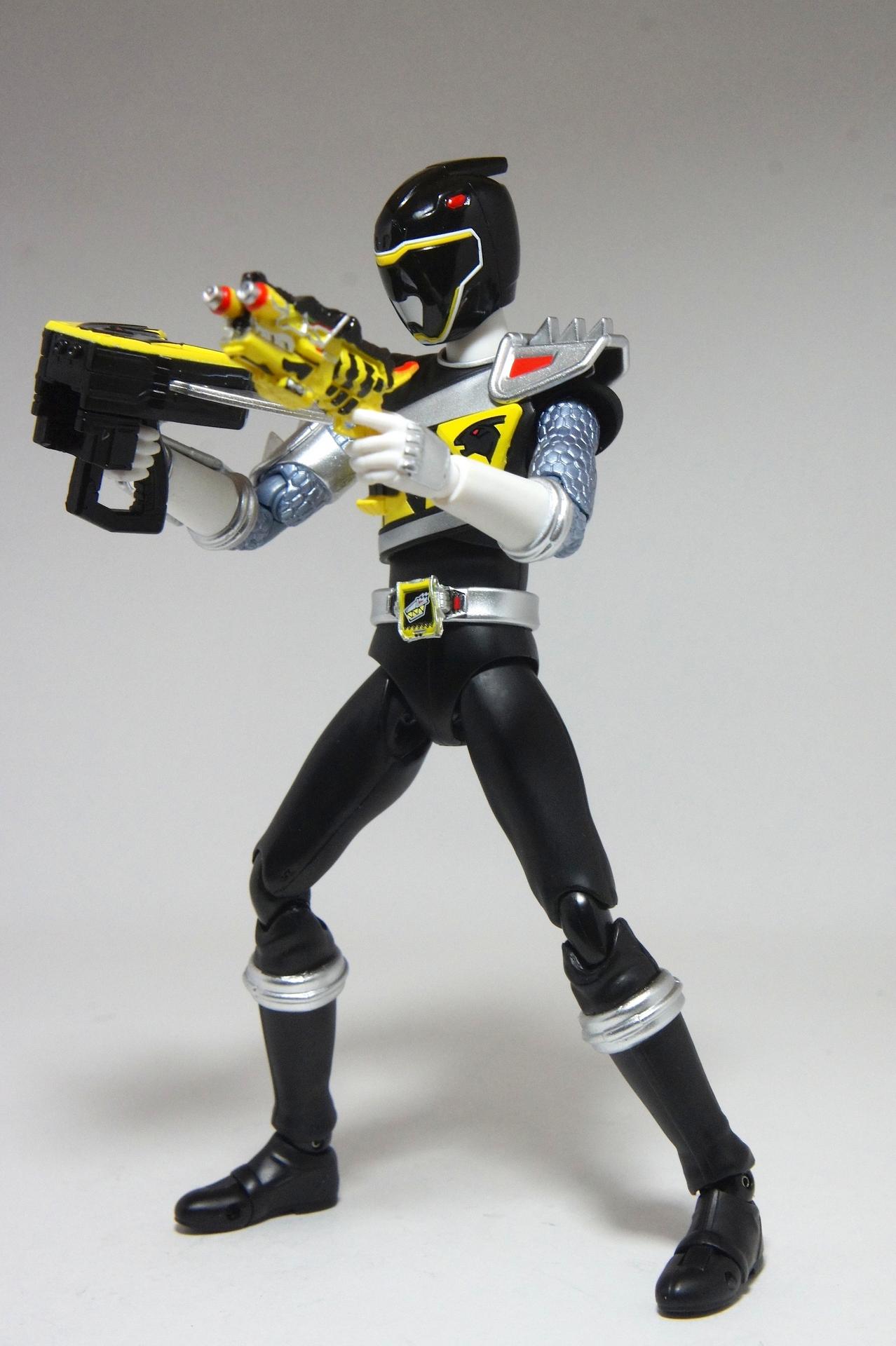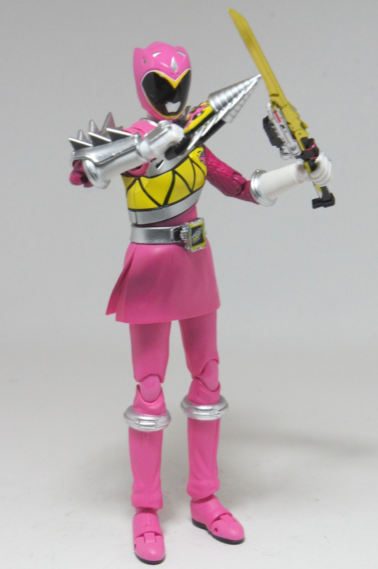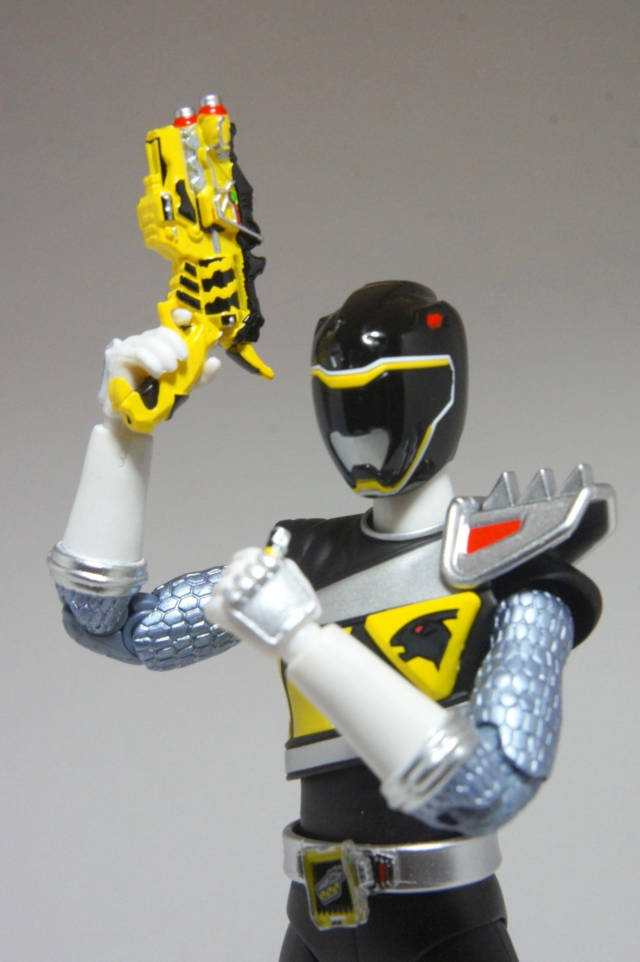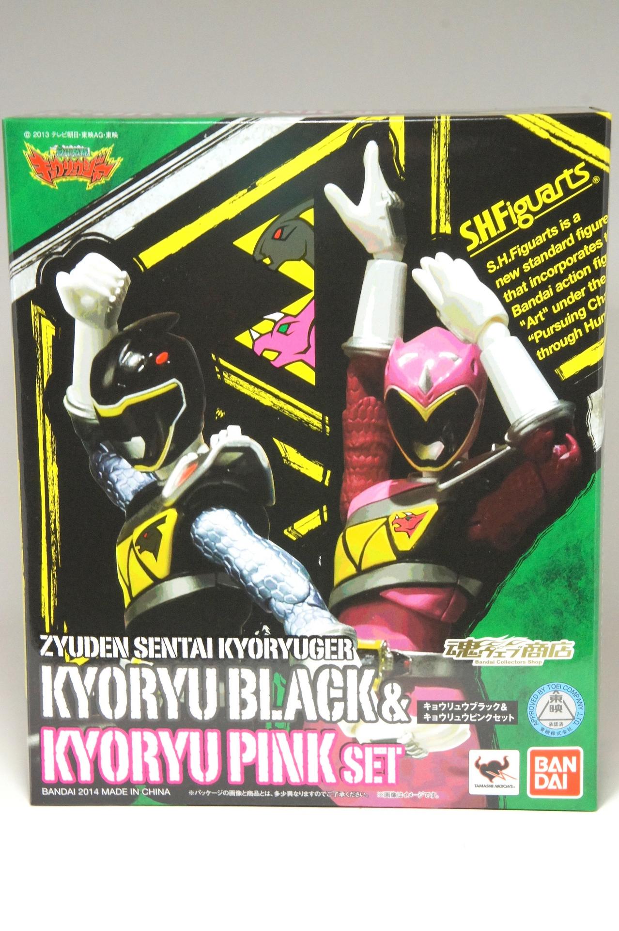 Tsuno No Yuusha! (The Horned Heroine) Kyoryu Pink! This gallery showcases 2 more members of the 37th Super Sentai, Zyuden Sentai Kyoryuger! The first of these figures is Kyoryu Black, otherwise known as Ian Yorkland! Ian is a young treasure hunter from Europe who became a Kyoryuger after an encounter with the Deboss Legion during a treasure hunt led to the death of his best friend. After falling and landing in front of a castle where his future partner Zyudenryu Parasagun was, Ian and the parasaurolophus battled until he was deemed worthy enough to be his partner. Although he makes his debut in the first episode, Ian doesn’t join the team until episode 4, when the very Deboss Legion member that he encountered months ago appears before him. A playboy, Ian is often at ends with his fellow teammate, Souji Rippukan/Kyoryu Green. Despite his playboy attitude, Ian cares for his teammates and for the girls he dates. He is designated as the leader of the team if Daigo is ever out of commission, proving to be a great strategist, but when he’s not, he’s shown to be their best sharpshooter, often dual wielding. Sharing the same body type as his fellow male Kyoryugers, Kyoryu Black is a glorious matte black body with a glossy black head and silver upper arms. Compared to the wrist issues seen on Kyoryu Red, Kyoryu Black’s hands are very easy to swap out. Just like his fellow Kyoryugers, Kyoryu Black comes with a number of accessories- 9 hands (3 for his role call poses, 2 for wielding the Gaburevolver, 2 for wielding the Gaburicalibur, and the standard Figuarts hands), a Gaburevolver, a small #2 Parasagun Zyudenchi, a Gaburicalibur, his Armed On arm and his Zyuden Arms weapon, the Parasa Shot bowgun. Just like the other Zyuden Arms weapons, the Parasa Shot has a thick handle, but can be held with the Gaburicalibur holding hand if you fiddle around with it. Also, the Parasa Shot can’t combine with the other weapons. The second figure in this set is Kyoryu Pink, representing Amy Yuuzuki! Amy is a young rich college student who resided in America when the Deboss Legion first attacked. After meeting her Zyudenryu partner, Dricera in the Grand Canyon, Amy fought the triceratops and was chosen by her to be her partner. The only girl on the team, Amy proves she is not to be messed with by being the resident kick chick- in fact; she once kicked two energy arrows behind her! Amy is the second/third member to join Daigo after witnessing him in action in episode 2. Amy is often seen at home with her butler Gentle, who tries to get her to act like the prim and proper heiress that she is. Despite this, Amy often works in the same restaurant that the team usually eats at/holds a portal into the Spirit Base. Kyoryu Pink stems away from the other Kyoryugers, with a smaller female body frame. Just like her teammates, she has multiple accessories- 4 hands for her different role call poses, 2 hands to hold the Gaburevolver, 2 hands to hold the Gaburicalibur, and the standard 2 Figuarts hands, the Gaburevolver, the Gaburicalibur, a small #5 Dricera Zyudenchi and her Armed On arm and her personal Zyuden Arms weapon, the DriceLance. As it turns out, the one included with the previous set, the Kyoryu Blue and Kyoryu Green Set, was the one for the Kentrospiker. Something to note is that she has the same sized hands as her other teammates and that her helmet seems a little small/her neck is too short. It is kind of difficult to get her into her role call pose as well. The shared accessory in this set is their Kentrospiker Part, a combination of Kyoryu Blue’s Stegochi Shield and Kyoryu Green’s Zakutor Slasher. Both can’t separate into their individual weapons. The DriceLance in that past set can combine with this accessory, forming the Shield LanSlasher! With the Fang Shot included with Kyoryu Gold, the team can complete the Kentrospiker accessory! They also lack the GaburiCannon as an accessory like the rest of their team. This set is really sweet, and I’m glad I managed to get them. They were initially released as a Tamashii Web Exclusive for April 2014. Stay tuned for Den-O’s gallery of the Thundering Hero! (See post 2 for more pics of Kyoryu Pink and the 5 Kyoryugers together!)