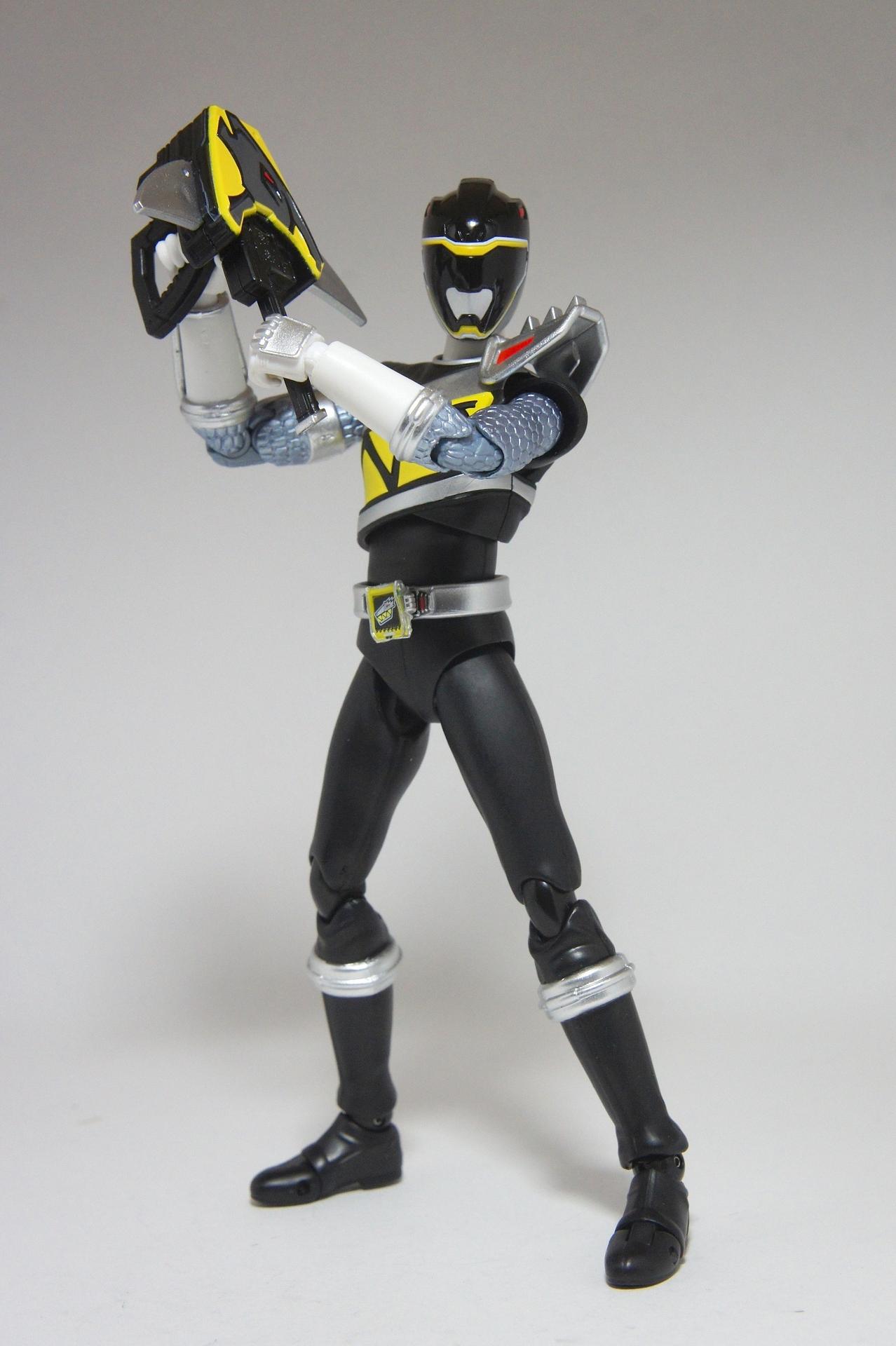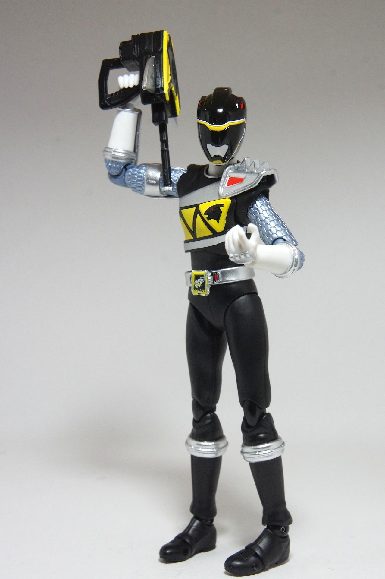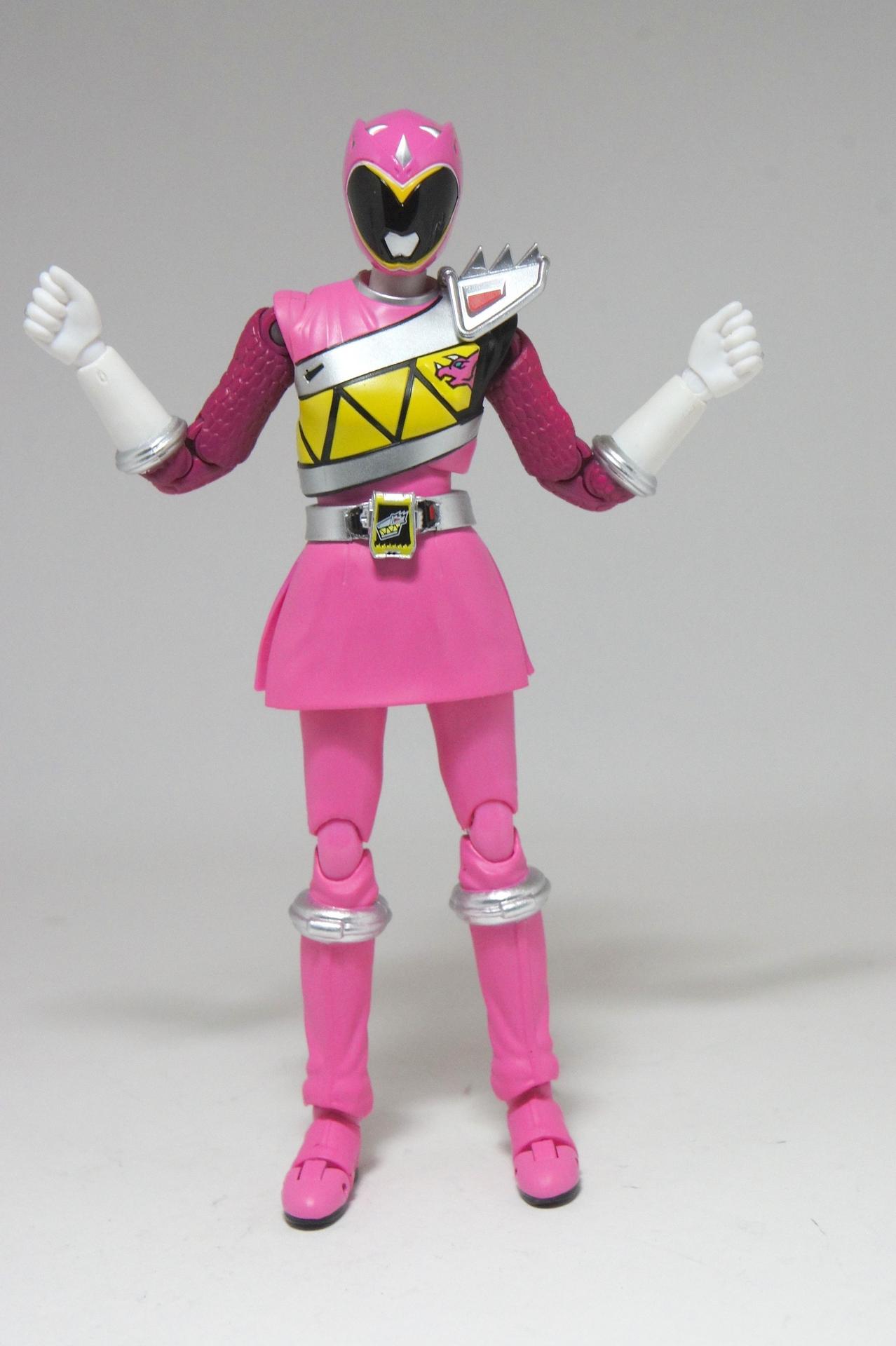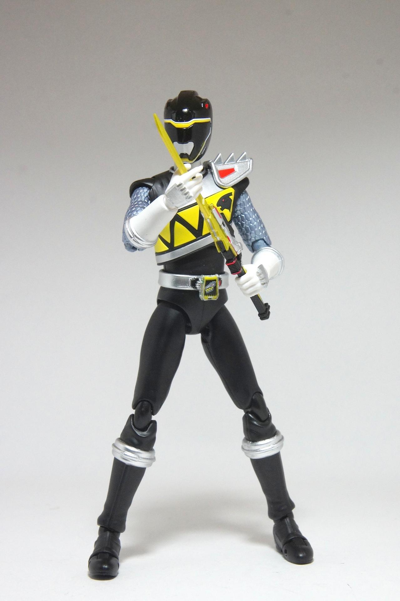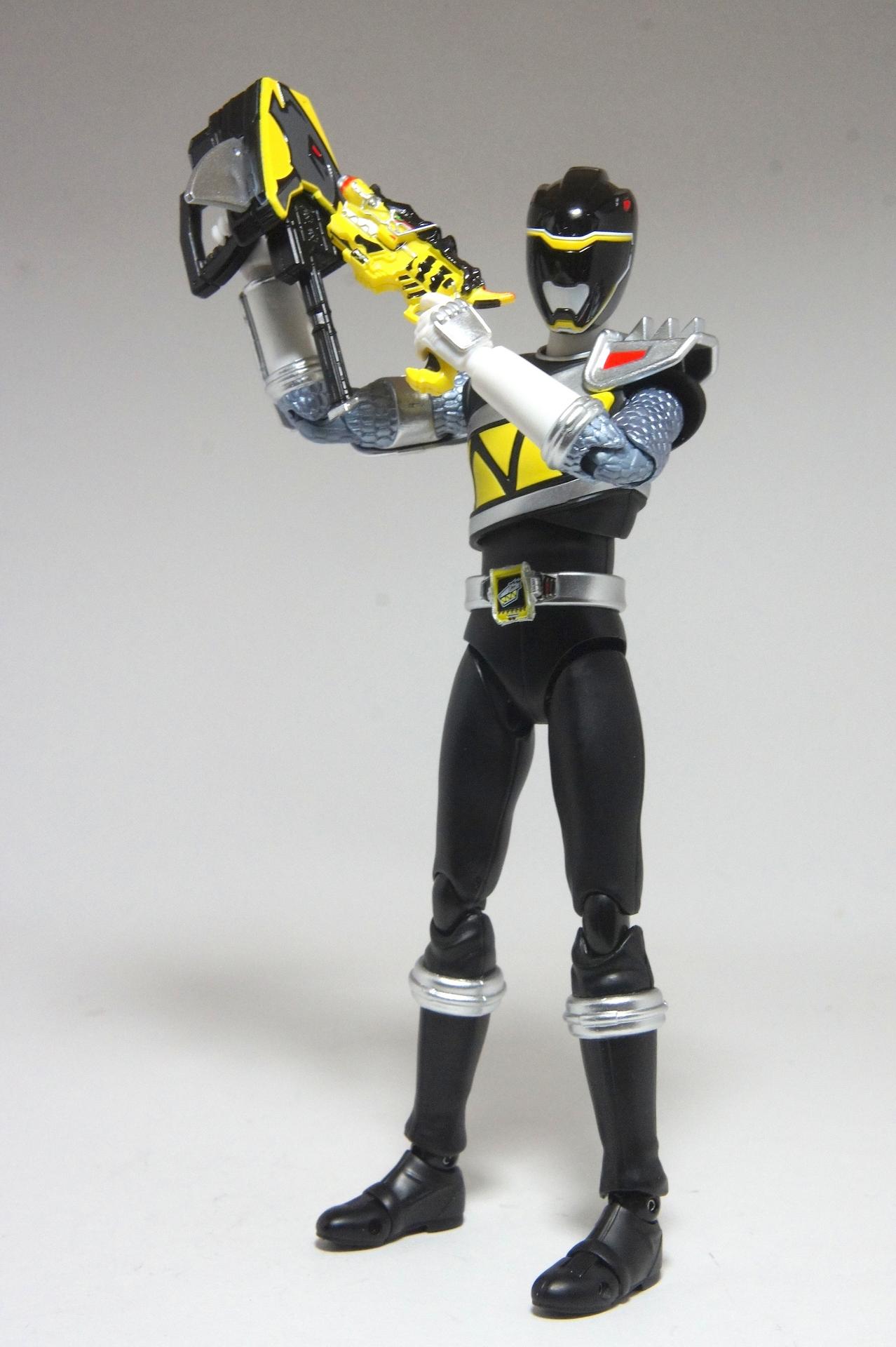 Tsuno No Yuusha! (The Horned Heroine) Kyoryu Pink! This gallery showcases 2 more members of the 37th Super Sentai, Zyuden Sentai Kyoryuger! The first of these figures is Kyoryu Black, otherwise known as Ian Yorkland! Ian is a young treasure hunter from Europe who became a Kyoryuger after an encounter with the Deboss Legion during a treasure hunt led to the death of his best friend. After falling and landing in front of a castle where his future partner Zyudenryu Parasagun was, Ian and the parasaurolophus battled until he was deemed worthy enough to be his partner. Although he makes his debut in the first episode, Ian doesn’t join the team until episode 4, when the very Deboss Legion member that he encountered months ago appears before him. A playboy, Ian is often at ends with his fellow teammate, Souji Rippukan/Kyoryu Green. Despite his playboy attitude, Ian cares for his teammates and for the girls he dates. He is designated as the leader of the team if Daigo is ever out of commission, proving to be a great strategist, but when he’s not, he’s shown to be their best sharpshooter, often dual wielding. Sharing the same body type as his fellow male Kyoryugers, Kyoryu Black is a glorious matte black body with a glossy black head and silver upper arms. Compared to the wrist issues seen on Kyoryu Red, Kyoryu Black’s hands are very easy to swap out. Just like his fellow Kyoryugers, Kyoryu Black comes with a number of accessories- 9 hands (3 for his role call poses, 2 for wielding the Gaburevolver, 2 for wielding the Gaburicalibur, and the standard Figuarts hands), a Gaburevolver, a small #2 Parasagun Zyudenchi, a Gaburicalibur, his Armed On arm and his Zyuden Arms weapon, the Parasa Shot bowgun. Just like the other Zyuden Arms weapons, the Parasa Shot has a thick handle, but can be held with the Gaburicalibur holding hand if you fiddle around with it. Also, the Parasa Shot can’t combine with the other weapons. The second figure in this set is Kyoryu Pink, representing Amy Yuuzuki! Amy is a young rich college student who resided in America when the Deboss Legion first attacked. After meeting her Zyudenryu partner, Dricera in the Grand Canyon, Amy fought the triceratops and was chosen by her to be her partner. The only girl on the team, Amy proves she is not to be messed with by being the resident kick chick- in fact; she once kicked two energy arrows behind her! Amy is the second/third member to join Daigo after witnessing him in action in episode 2. Amy is often seen at home with her butler Gentle, who tries to get her to act like the prim and proper heiress that she is. Despite this, Amy often works in the same restaurant that the team usually eats at/holds a portal into the Spirit Base. Kyoryu Pink stems away from the other Kyoryugers, with a smaller female body frame. Just like her teammates, she has multiple accessories- 4 hands for her different role call poses, 2 hands to hold the Gaburevolver, 2 hands to hold the Gaburicalibur, and the standard 2 Figuarts hands, the Gaburevolver, the Gaburicalibur, a small #5 Dricera Zyudenchi and her Armed On arm and her personal Zyuden Arms weapon, the DriceLance. As it turns out, the one included with the previous set, the Kyoryu Blue and Kyoryu Green Set, was the one for the Kentrospiker. Something to note is that she has the same sized hands as her other teammates and that her helmet seems a little small/her neck is too short. It is kind of difficult to get her into her role call pose as well. The shared accessory in this set is their Kentrospiker Part, a combination of Kyoryu Blue’s Stegochi Shield and Kyoryu Green’s Zakutor Slasher. Both can’t separate into their individual weapons. The DriceLance in that past set can combine with this accessory, forming the Shield LanSlasher! With the Fang Shot included with Kyoryu Gold, the team can complete the Kentrospiker accessory! They also lack the GaburiCannon as an accessory like the rest of their team. This set is really sweet, and I’m glad I managed to get them. They were initially released as a Tamashii Web Exclusive for April 2014. Stay tuned for Den-O’s gallery of the Thundering Hero! (See post 2 for more pics of Kyoryu Pink and the 5 Kyoryugers together!)