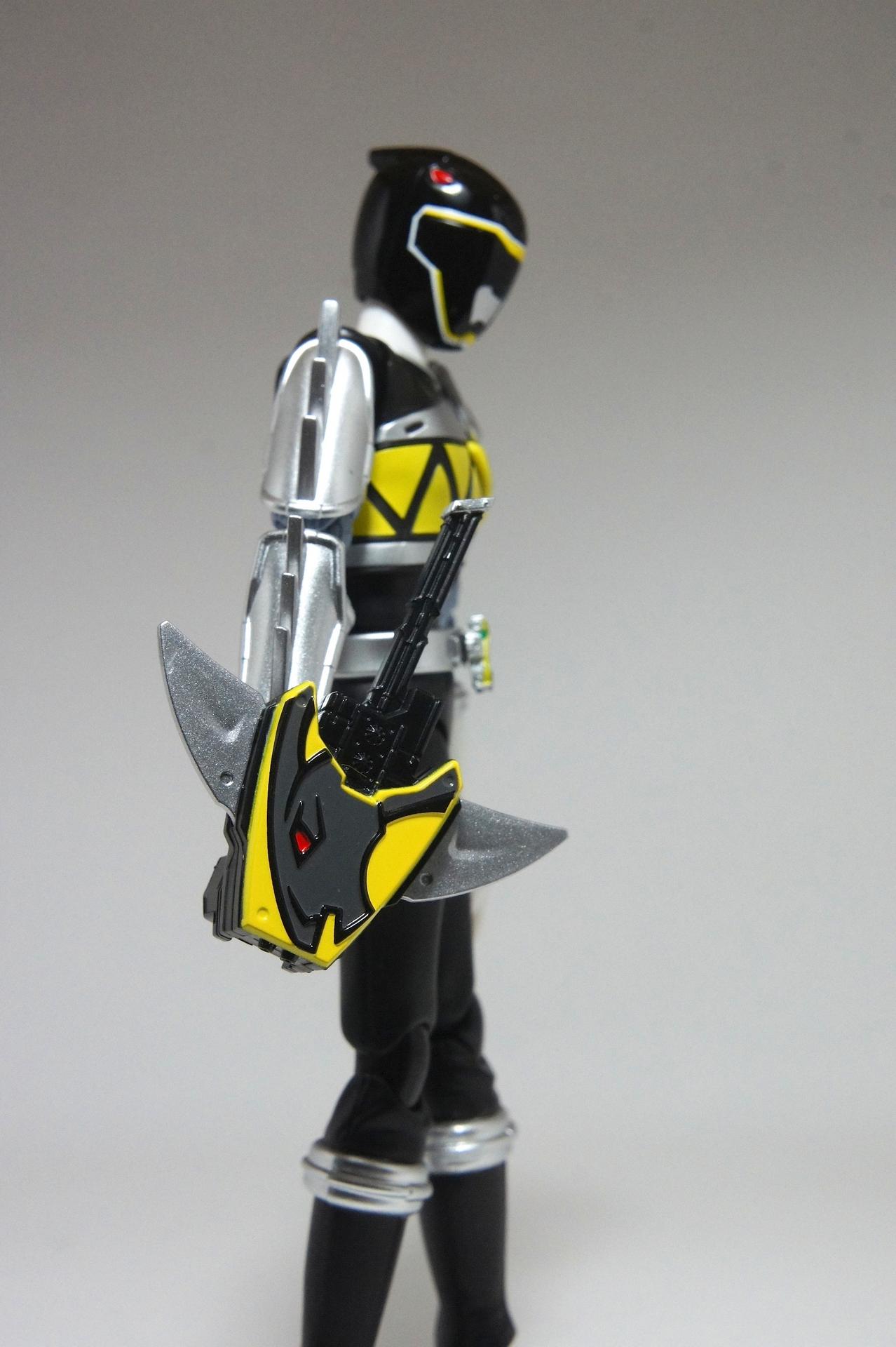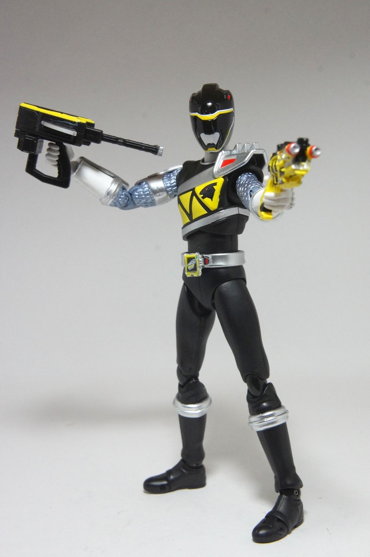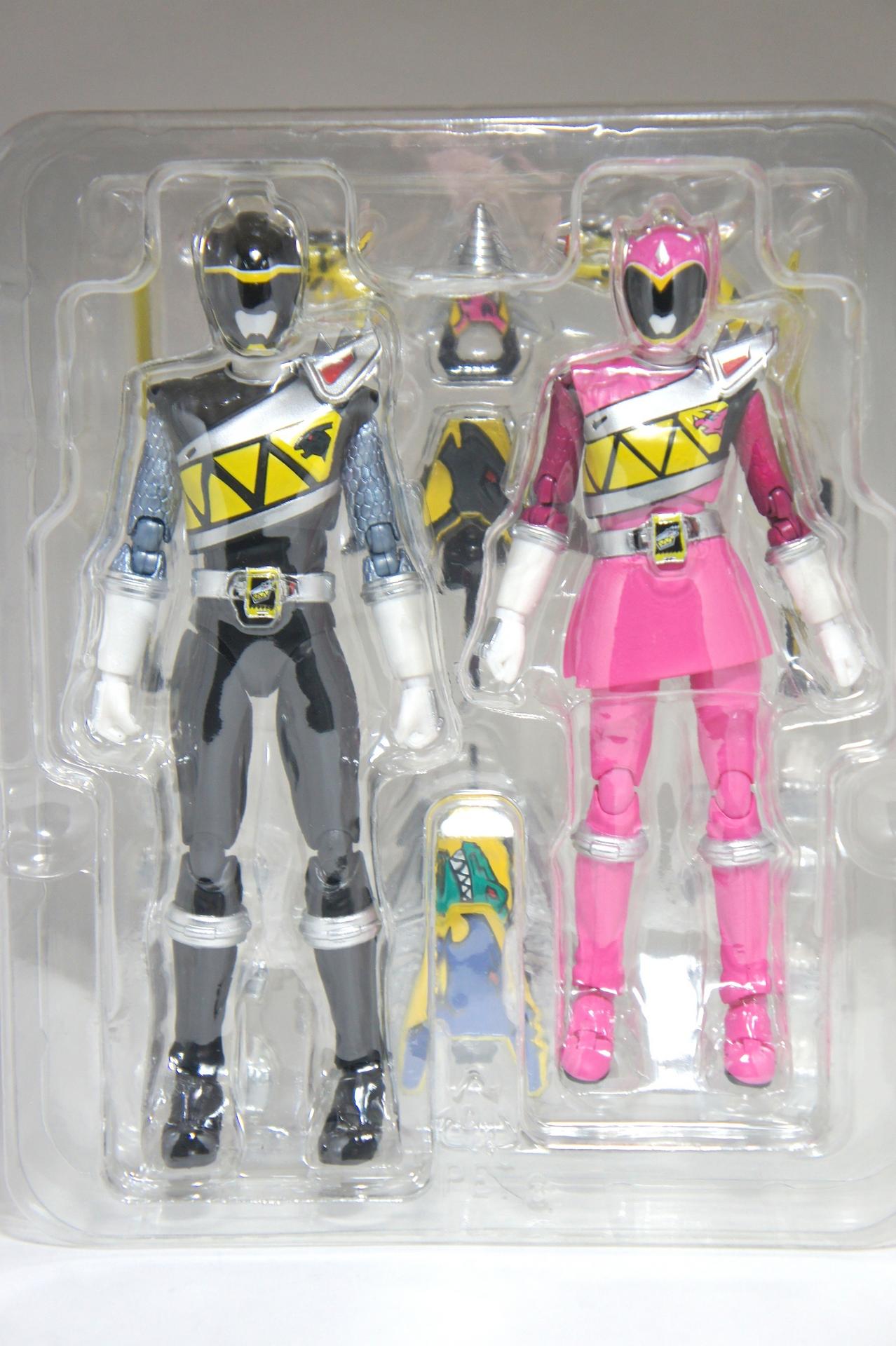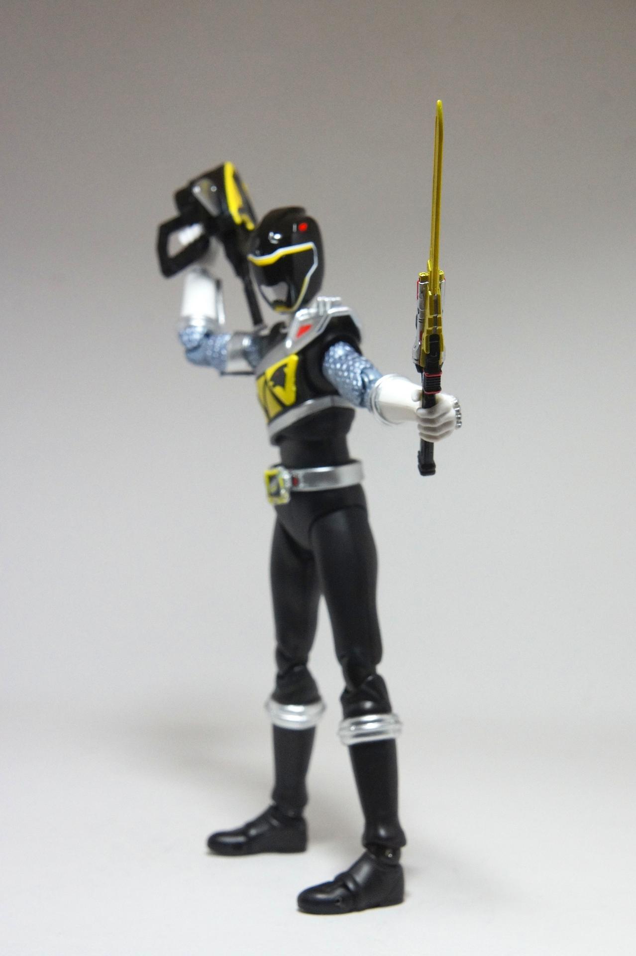Tsuno No Yuusha! (The Horned Heroine) Kyoryu Pink! This gallery showcases 2 more members of the 37th Super Sentai, Zyuden Sentai Kyoryuger! The first of these figures is Kyoryu Black, otherwise known as Ian Yorkland! Ian is a young treasure hunter from Europe who became a Kyoryuger after an encounter with the Deboss Legion during a treasure hunt led to the death of his best friend. After falling and landing in front of a castle where his future partner Zyudenryu Parasagun was, Ian and the parasaurolophus battled until he was deemed worthy enough to be his partner. Although he makes his debut in the first episode, Ian doesn’t join the team until episode 4, when the very Deboss Legion member that he encountered months ago appears before him. A playboy, Ian is often at ends with his fellow teammate, Souji Rippukan/Kyoryu Green. Despite his playboy attitude, Ian cares for his teammates and for the girls he dates. He is designated as the leader of the team if Daigo is ever out of commission, proving to be a great strategist, but when he’s not, he’s shown to be their best sharpshooter, often dual wielding. Sharing the same body type as his fellow male Kyoryugers, Kyoryu Black is a glorious matte black body with a glossy black head and silver upper arms. Compared to the wrist issues seen on Kyoryu Red, Kyoryu Black’s hands are very easy to swap out. Just like his fellow Kyoryugers, Kyoryu Black comes with a number of accessories- 9 hands (3 for his role call poses, 2 for wielding the Gaburevolver, 2 for wielding the Gaburicalibur, and the standard Figuarts hands), a Gaburevolver, a small #2 Parasagun Zyudenchi, a Gaburicalibur, his Armed On arm and his Zyuden Arms weapon, the Parasa Shot bowgun. Just like the other Zyuden Arms weapons, the Parasa Shot has a thick handle, but can be held with the Gaburicalibur holding hand if you fiddle around with it. Also, the Parasa Shot can’t combine with the other weapons. The second figure in this set is Kyoryu Pink, representing Amy Yuuzuki! Amy is a young rich college student who resided in America when the Deboss Legion first attacked. After meeting her Zyudenryu partner, Dricera in the Grand Canyon, Amy fought the triceratops and was chosen by her to be her partner. The only girl on the team, Amy proves she is not to be messed with by being the resident kick chick- in fact; she once kicked two energy arrows behind her! Amy is the second/third member to join Daigo after witnessing him in action in episode 2. Amy is often seen at home with her butler Gentle, who tries to get her to act like the prim and proper heiress that she is. Despite this, Amy often works in the same restaurant that the team usually eats at/holds a portal into the Spirit Base. Kyoryu Pink stems away from the other Kyoryugers, with a smaller female body frame. Just like her teammates, she has multiple accessories- 4 hands for her different role call poses, 2 hands to hold the Gaburevolver, 2 hands to hold the Gaburicalibur, and the standard 2 Figuarts hands, the Gaburevolver, the Gaburicalibur, a small #5 Dricera Zyudenchi and her Armed On arm and her personal Zyuden Arms weapon, the DriceLance. As it turns out, the one included with the previous set, the Kyoryu Blue and Kyoryu Green Set, was the one for the Kentrospiker. Something to note is that she has the same sized hands as her other teammates and that her helmet seems a little small/her neck is too short. It is kind of difficult to get her into her role call pose as well. The shared accessory in this set is their Kentrospiker Part, a combination of Kyoryu Blue’s Stegochi Shield and Kyoryu Green’s Zakutor Slasher. Both can’t separate into their individual weapons. The DriceLance in that past set can combine with this accessory, forming the Shield LanSlasher! With the Fang Shot included with Kyoryu Gold, the team can complete the Kentrospiker accessory! They also lack the GaburiCannon as an accessory like the rest of their team. This set is really sweet, and I’m glad I managed to get them. They were initially released as a Tamashii Web Exclusive for April 2014. Stay tuned for Den-O’s gallery of the Thundering Hero! (See post 2 for more pics of Kyoryu Pink and the 5 Kyoryugers together!)