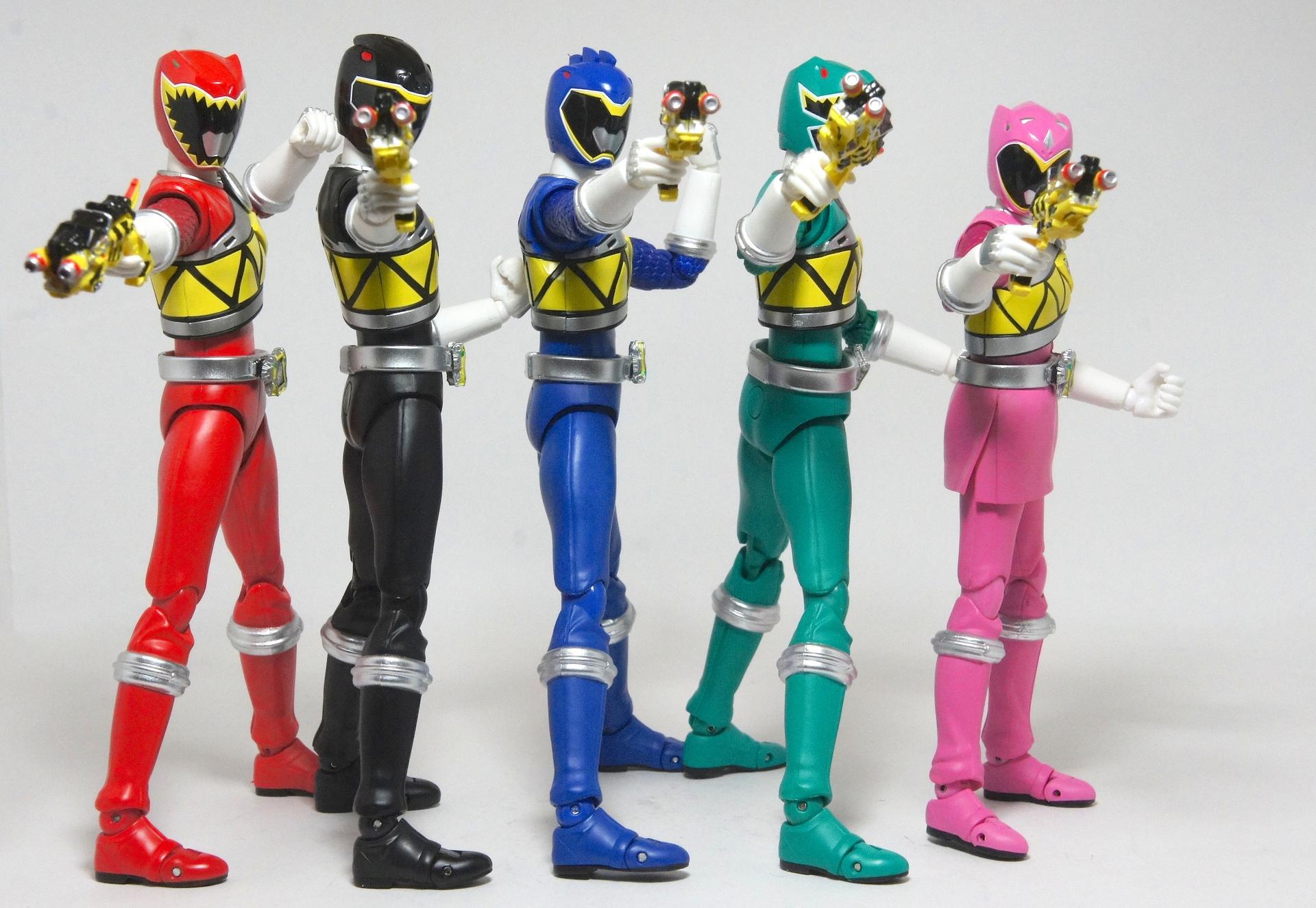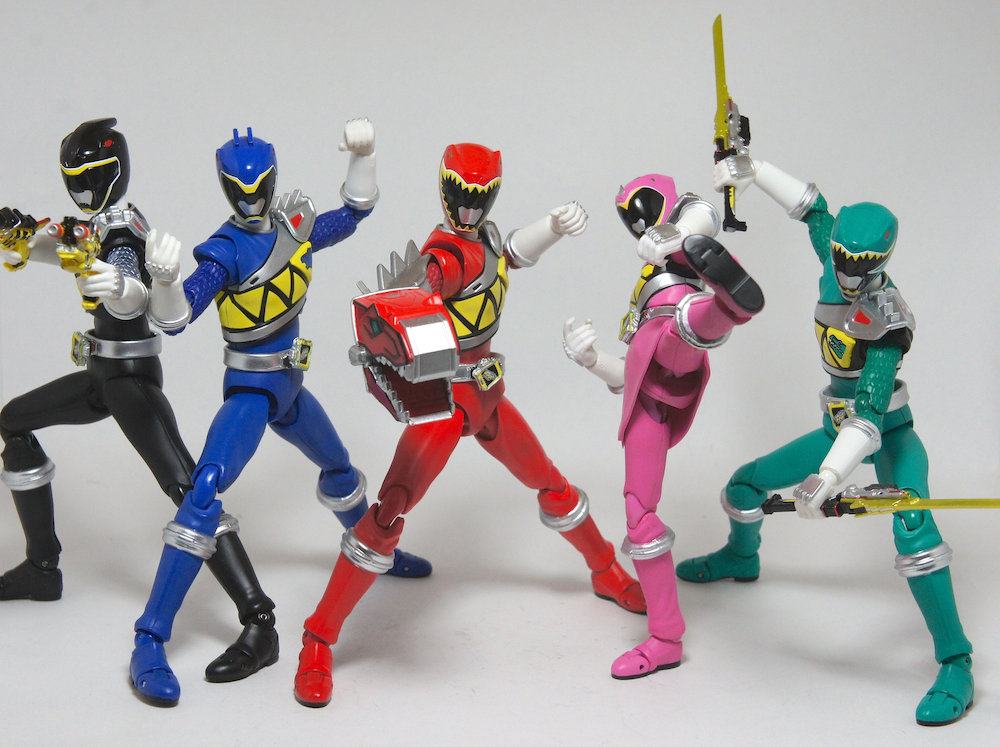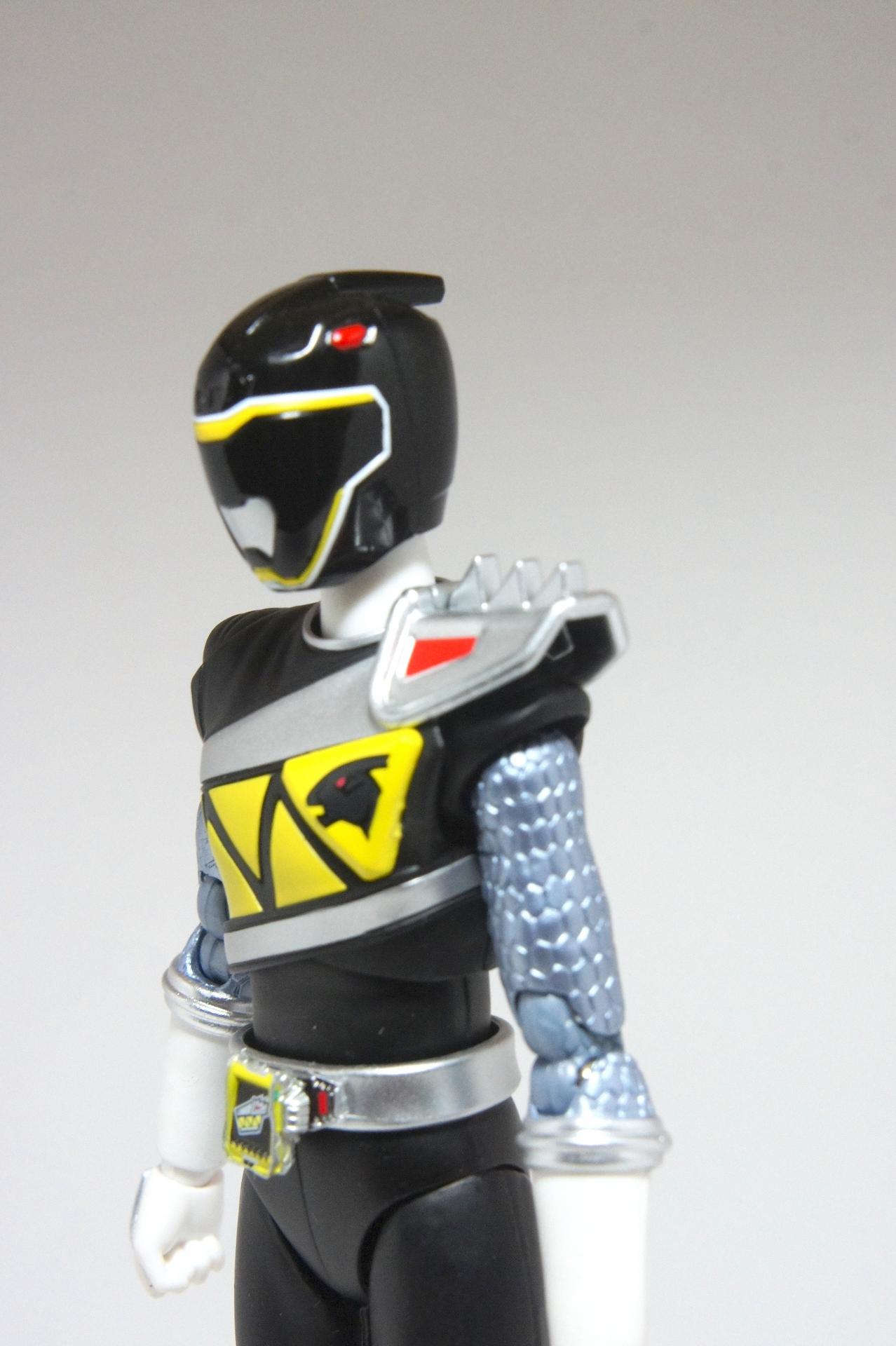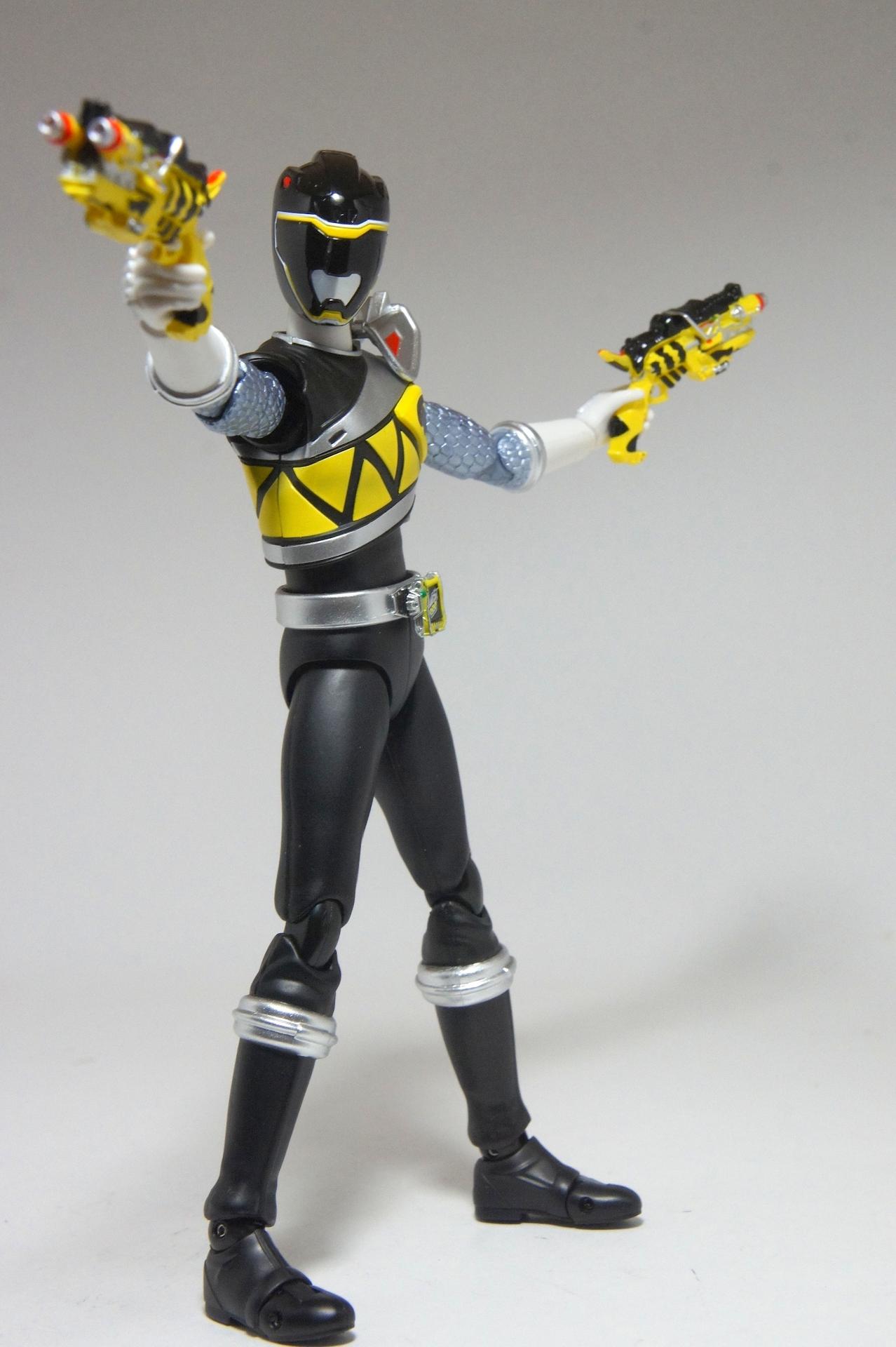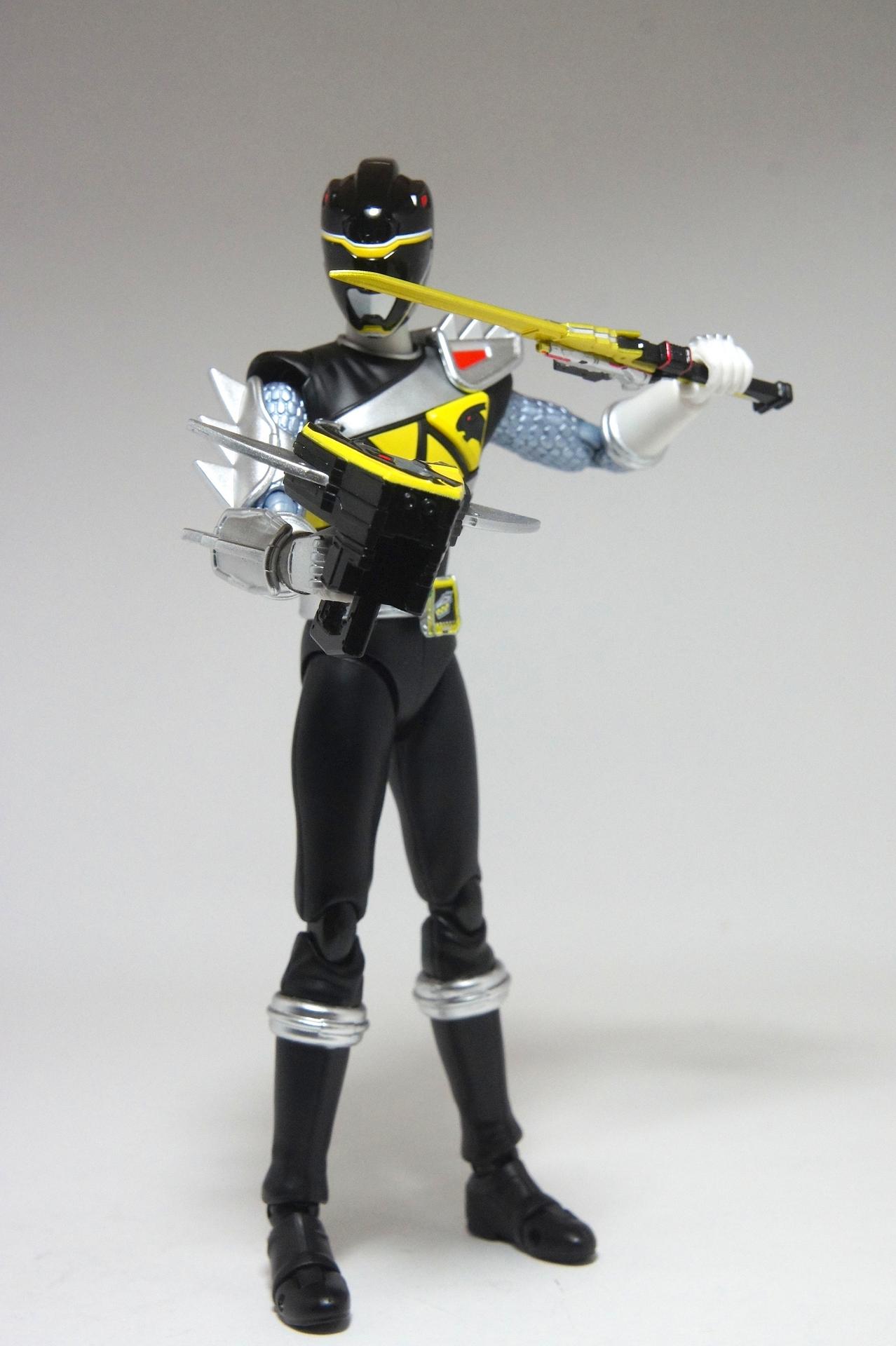 Tsuno No Yuusha! (The Horned Heroine) Kyoryu Pink! This gallery showcases 2 more members of the 37th Super Sentai, Zyuden Sentai Kyoryuger! The first of these figures is Kyoryu Black, otherwise known as Ian Yorkland! Ian is a young treasure hunter from Europe who became a Kyoryuger after an encounter with the Deboss Legion during a treasure hunt led to the death of his best friend. After falling and landing in front of a castle where his future partner Zyudenryu Parasagun was, Ian and the parasaurolophus battled until he was deemed worthy enough to be his partner. Although he makes his debut in the first episode, Ian doesn’t join the team until episode 4, when the very Deboss Legion member that he encountered months ago appears before him. A playboy, Ian is often at ends with his fellow teammate, Souji Rippukan/Kyoryu Green. Despite his playboy attitude, Ian cares for his teammates and for the girls he dates. He is designated as the leader of the team if Daigo is ever out of commission, proving to be a great strategist, but when he’s not, he’s shown to be their best sharpshooter, often dual wielding. Sharing the same body type as his fellow male Kyoryugers, Kyoryu Black is a glorious matte black body with a glossy black head and silver upper arms. Compared to the wrist issues seen on Kyoryu Red, Kyoryu Black’s hands are very easy to swap out. Just like his fellow Kyoryugers, Kyoryu Black comes with a number of accessories- 9 hands (3 for his role call poses, 2 for wielding the Gaburevolver, 2 for wielding the Gaburicalibur, and the standard Figuarts hands), a Gaburevolver, a small #2 Parasagun Zyudenchi, a Gaburicalibur, his Armed On arm and his Zyuden Arms weapon, the Parasa Shot bowgun. Just like the other Zyuden Arms weapons, the Parasa Shot has a thick handle, but can be held with the Gaburicalibur holding hand if you fiddle around with it. Also, the Parasa Shot can’t combine with the other weapons. The second figure in this set is Kyoryu Pink, representing Amy Yuuzuki! Amy is a young rich college student who resided in America when the Deboss Legion first attacked. After meeting her Zyudenryu partner, Dricera in the Grand Canyon, Amy fought the triceratops and was chosen by her to be her partner. The only girl on the team, Amy proves she is not to be messed with by being the resident kick chick- in fact; she once kicked two energy arrows behind her! Amy is the second/third member to join Daigo after witnessing him in action in episode 2. Amy is often seen at home with her butler Gentle, who tries to get her to act like the prim and proper heiress that she is. Despite this, Amy often works in the same restaurant that the team usually eats at/holds a portal into the Spirit Base. Kyoryu Pink stems away from the other Kyoryugers, with a smaller female body frame. Just like her teammates, she has multiple accessories- 4 hands for her different role call poses, 2 hands to hold the Gaburevolver, 2 hands to hold the Gaburicalibur, and the standard 2 Figuarts hands, the Gaburevolver, the Gaburicalibur, a small #5 Dricera Zyudenchi and her Armed On arm and her personal Zyuden Arms weapon, the DriceLance. As it turns out, the one included with the previous set, the Kyoryu Blue and Kyoryu Green Set, was the one for the Kentrospiker. Something to note is that she has the same sized hands as her other teammates and that her helmet seems a little small/her neck is too short. It is kind of difficult to get her into her role call pose as well. The shared accessory in this set is their Kentrospiker Part, a combination of Kyoryu Blue’s Stegochi Shield and Kyoryu Green’s Zakutor Slasher. Both can’t separate into their individual weapons. The DriceLance in that past set can combine with this accessory, forming the Shield LanSlasher! With the Fang Shot included with Kyoryu Gold, the team can complete the Kentrospiker accessory! They also lack the GaburiCannon as an accessory like the rest of their team. This set is really sweet, and I’m glad I managed to get them. They were initially released as a Tamashii Web Exclusive for April 2014. Stay tuned for Den-O’s gallery of the Thundering Hero! (See post 2 for more pics of Kyoryu Pink and the 5 Kyoryugers together!)