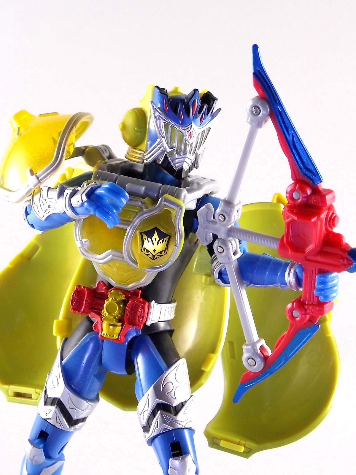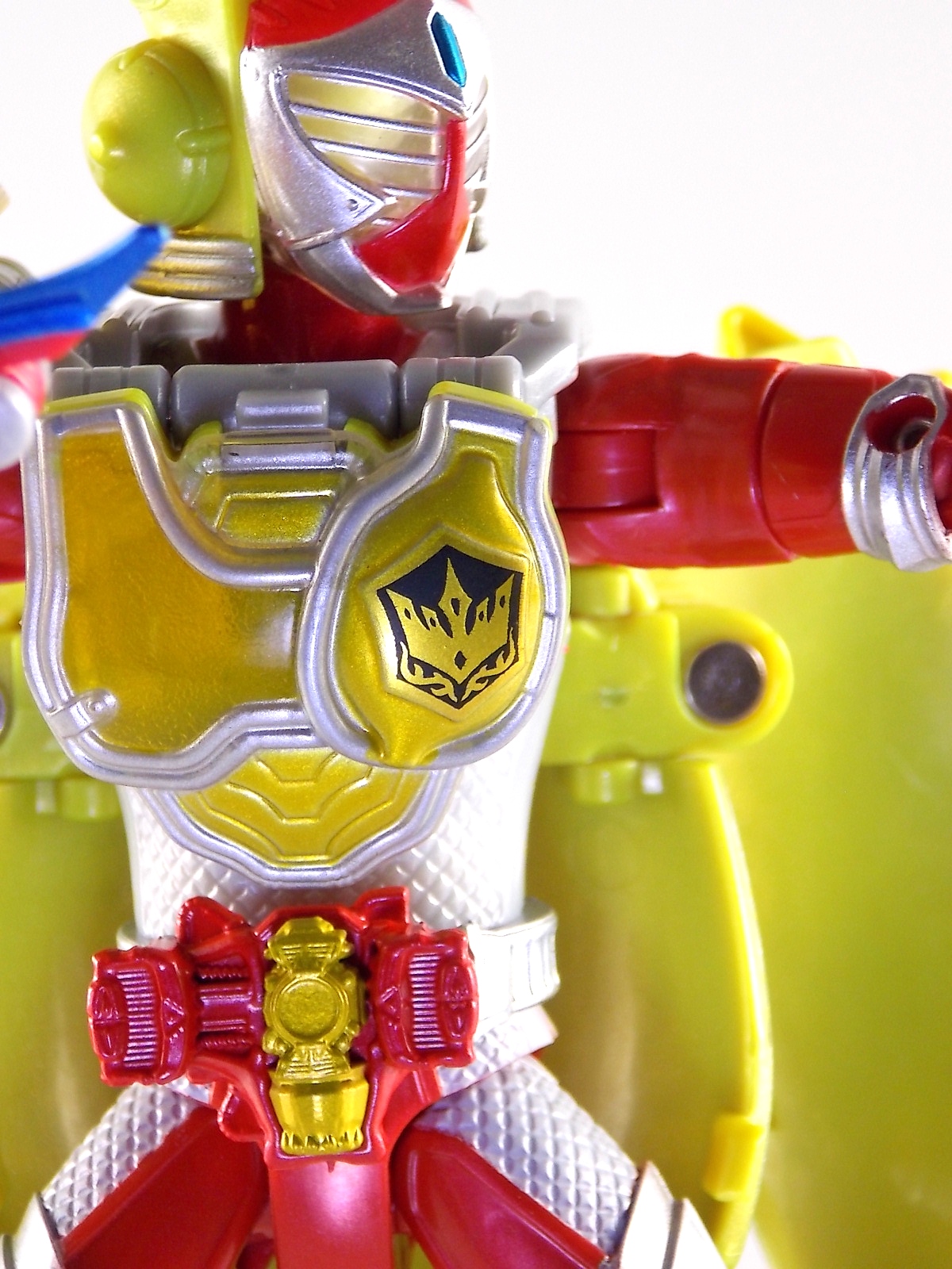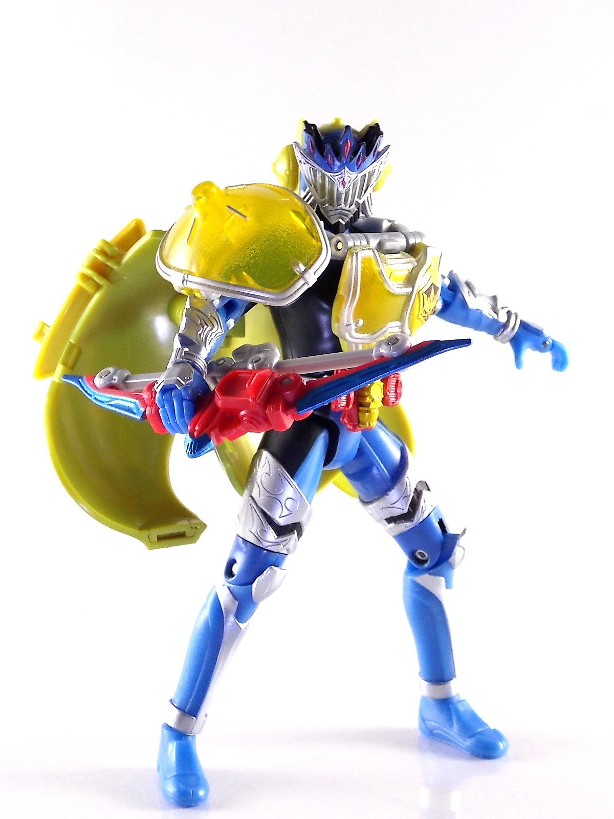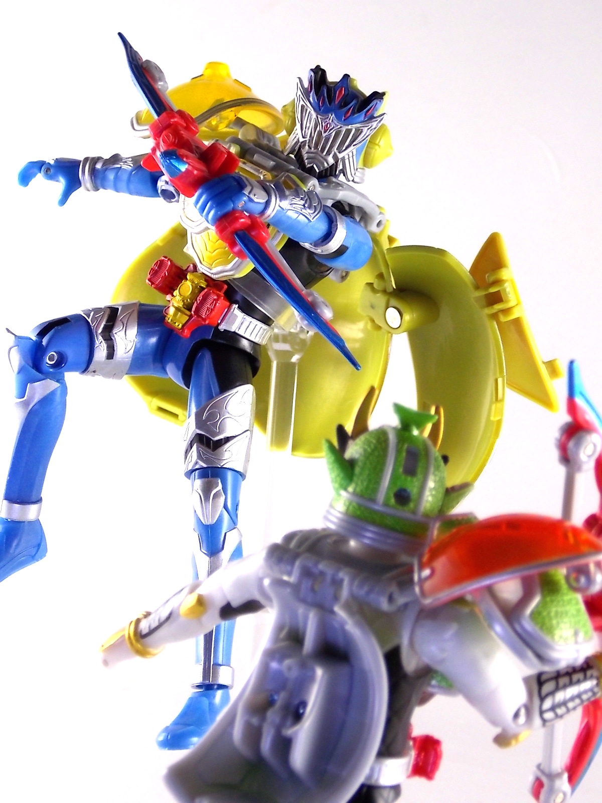 Arms Change Kamen Rider Duke was just released mere weeks ago. Timed perfectly to his rise back to prominence in the Kamen Rider Gaim series. Seen very elusively up to this point in the show, Duke is shaping up as quite the nice villain. But let's see how this figure shapes up shall we? **Post #2 Contains Additional images ***Post #3 Contains a Baron Lemon Energy Arms Custom Tutorial Arms Change Energy/Kamen Rider Duke is the 12th release in this highly popular line following the release of AC11 Kachidoki Arms Gaim. Duke is of course one of only two Energy Riders available at retail. The two remaining new generation riders, Marika & Sigurd, will be released as a Bandai Premium 2-pack. Duke is packaged in the now standard Arms Change box and plastic shell and includes his Lemon Energy Arms and the customary Sonic Arrow accessory. At a base body level Duke is the same sculpt as Baron. Whether intentional from the outset or not this is pretty damn awesome considering Baron's eventual use of the Lemon Energy Arms. Though that suit in the show was a quickly thrown together piece using spare parts, the sharing of a basic body hear makes it seem almost prophetic. Some of the textures from Baron's body have been removed in favor of more smooth surfaces on Duke. And the paint appear to be a bit more lavish and bright. The baby blue Duke is primarily cast in is especially gorgeous. The head is of course new, and oddly, much larger than the other AC's. Duke simply put has a big wide head. Onto the actual Lemon Energy Arms. At first glance most people assumed based on it's transformation that these Arms were just a remold of Mango Arms. However that was a very incorrect assumption. The mistake is easy to make considering the near identical transformation these two share. The way the shell opens, the cape pieces fold back and out, and even the way the helmet/visor stores. But they simply aren't the same at all. Lemon Energy is an entirely new mold. When combined with Duke the Lemon Arms look fantastic. However Duke's beautiful coloring lends itself well to most Arms, but he shines brightest with his Lemon. Luckily Lemon Arms also look good on just about every other rider as well, especially on Gaim, Zangetsu, and Ryugen. This figure also seems to be an improvement on the line from a QC perspective. Much more work was put into it's paint apps than any of the others. The joints are a bit tighter, the paint crisper, and the Sonic Arrows bow action feature is much stronger on this guy. Once again Bandai of japan has knocked it out of the park with Arms change! Up next in our series of Arms Change gallery is the first of the Bandai Premium Exclusives. ACPB01 Bujin Gaim Blood Orange Arms!