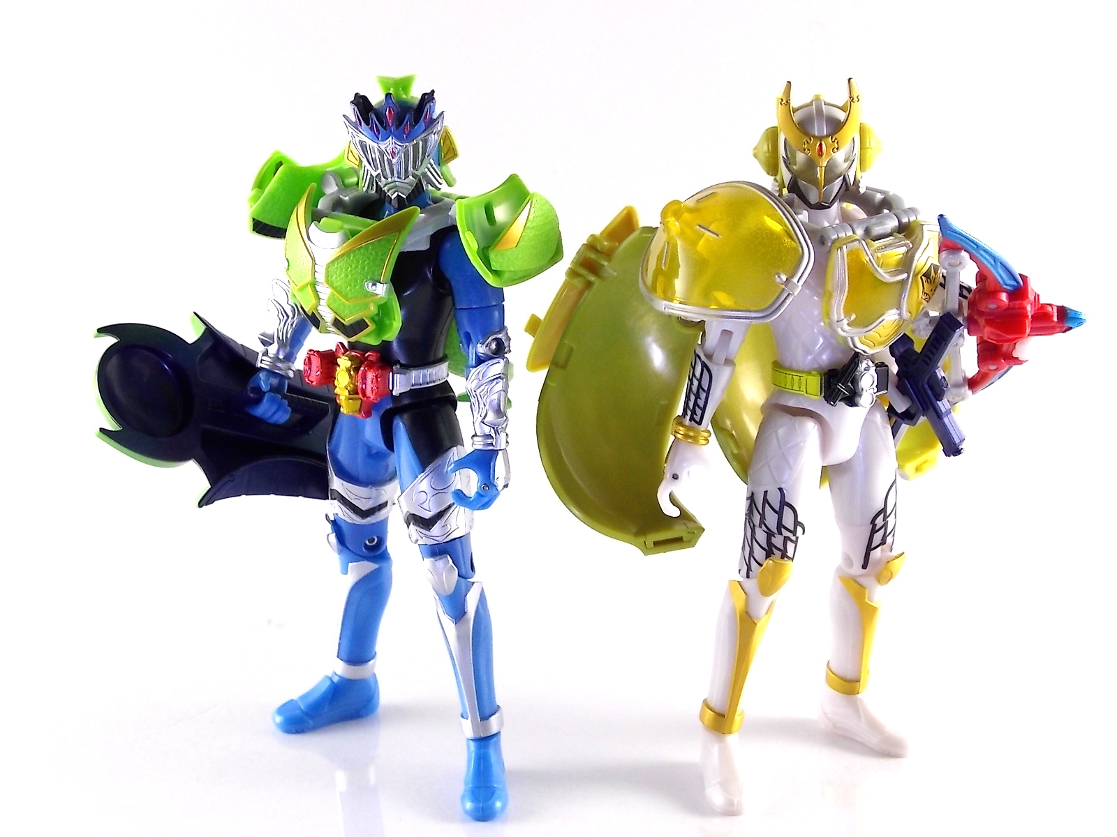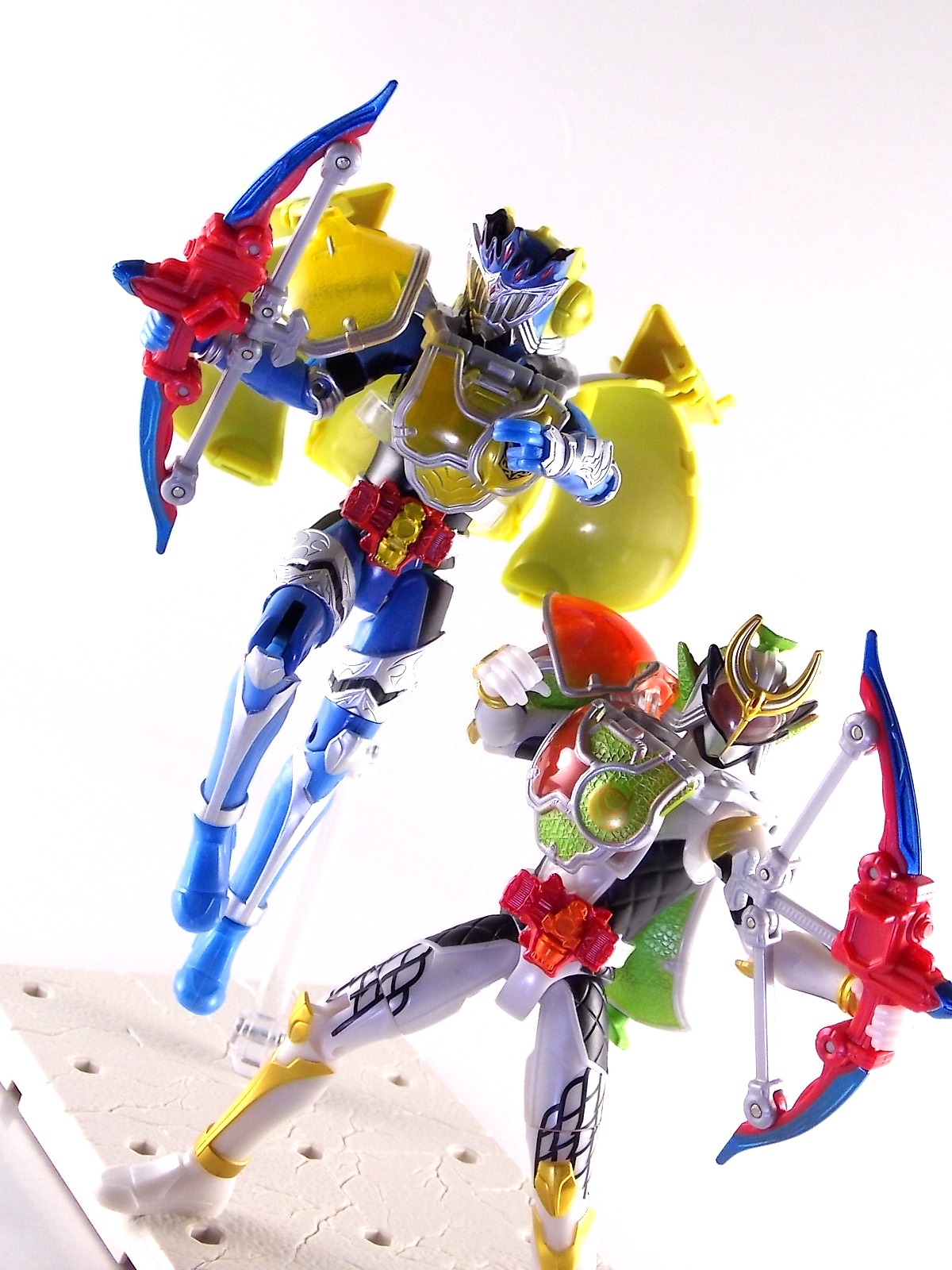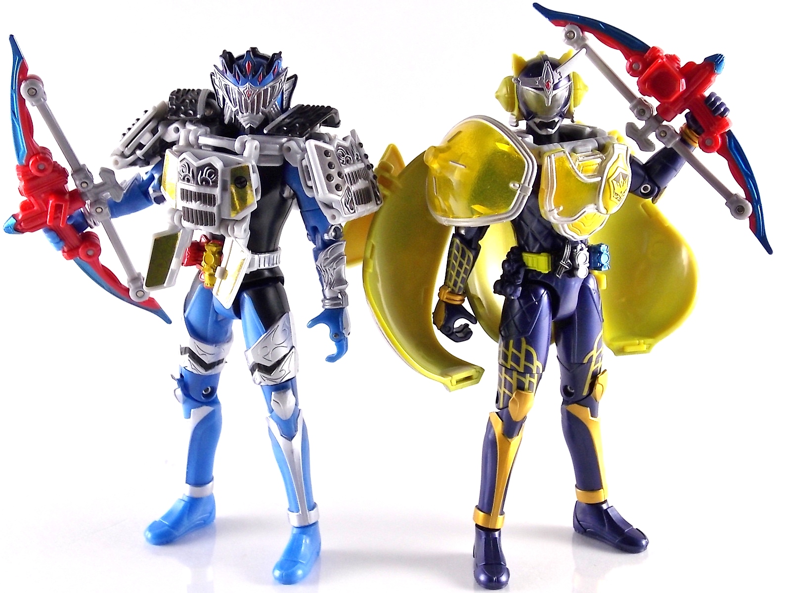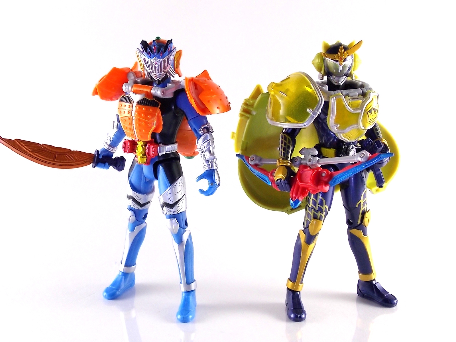 Arms Change Kamen Rider Duke was just released mere weeks ago. Timed perfectly to his rise back to prominence in the Kamen Rider Gaim series. Seen very elusively up to this point in the show, Duke is shaping up as quite the nice villain. But let's see how this figure shapes up shall we? **Post #2 Contains Additional images ***Post #3 Contains a Baron Lemon Energy Arms Custom Tutorial Arms Change Energy/Kamen Rider Duke is the 12th release in this highly popular line following the release of AC11 Kachidoki Arms Gaim. Duke is of course one of only two Energy Riders available at retail. The two remaining new generation riders, Marika & Sigurd, will be released as a Bandai Premium 2-pack. Duke is packaged in the now standard Arms Change box and plastic shell and includes his Lemon Energy Arms and the customary Sonic Arrow accessory. At a base body level Duke is the same sculpt as Baron. Whether intentional from the outset or not this is pretty damn awesome considering Baron's eventual use of the Lemon Energy Arms. Though that suit in the show was a quickly thrown together piece using spare parts, the sharing of a basic body hear makes it seem almost prophetic. Some of the textures from Baron's body have been removed in favor of more smooth surfaces on Duke. And the paint appear to be a bit more lavish and bright. The baby blue Duke is primarily cast in is especially gorgeous. The head is of course new, and oddly, much larger than the other AC's. Duke simply put has a big wide head. Onto the actual Lemon Energy Arms. At first glance most people assumed based on it's transformation that these Arms were just a remold of Mango Arms. However that was a very incorrect assumption. The mistake is easy to make considering the near identical transformation these two share. The way the shell opens, the cape pieces fold back and out, and even the way the helmet/visor stores. But they simply aren't the same at all. Lemon Energy is an entirely new mold. When combined with Duke the Lemon Arms look fantastic. However Duke's beautiful coloring lends itself well to most Arms, but he shines brightest with his Lemon. Luckily Lemon Arms also look good on just about every other rider as well, especially on Gaim, Zangetsu, and Ryugen. This figure also seems to be an improvement on the line from a QC perspective. Much more work was put into it's paint apps than any of the others. The joints are a bit tighter, the paint crisper, and the Sonic Arrows bow action feature is much stronger on this guy. Once again Bandai of japan has knocked it out of the park with Arms change! Up next in our series of Arms Change gallery is the first of the Bandai Premium Exclusives. ACPB01 Bujin Gaim Blood Orange Arms!