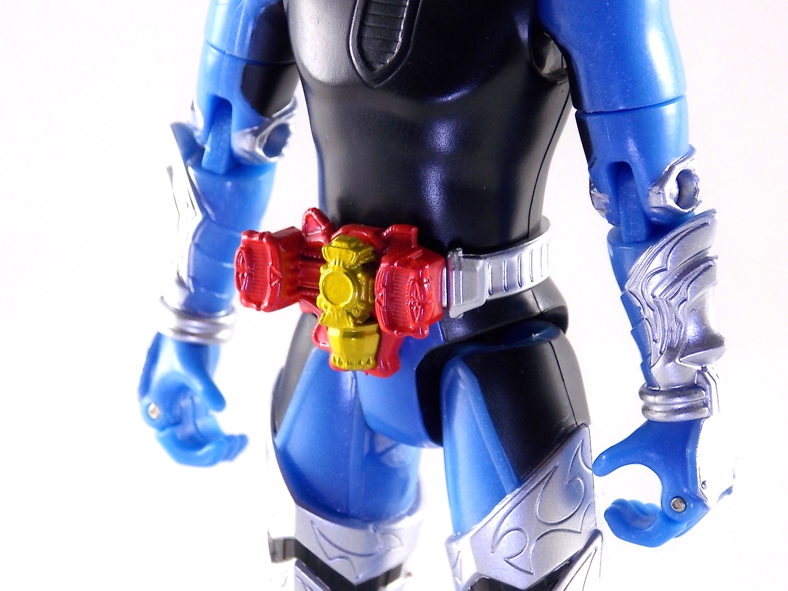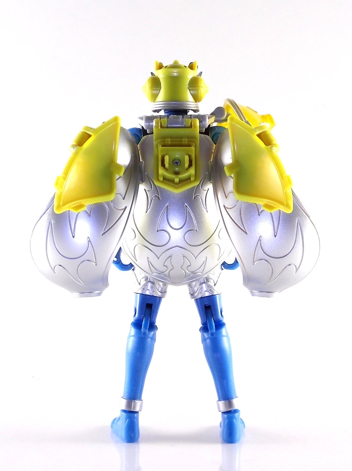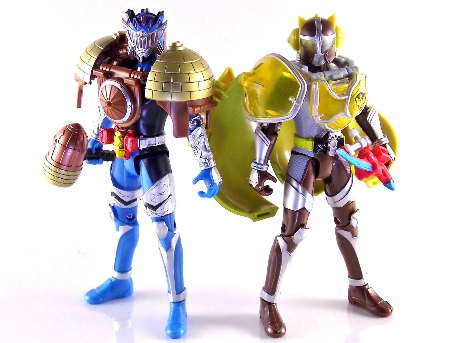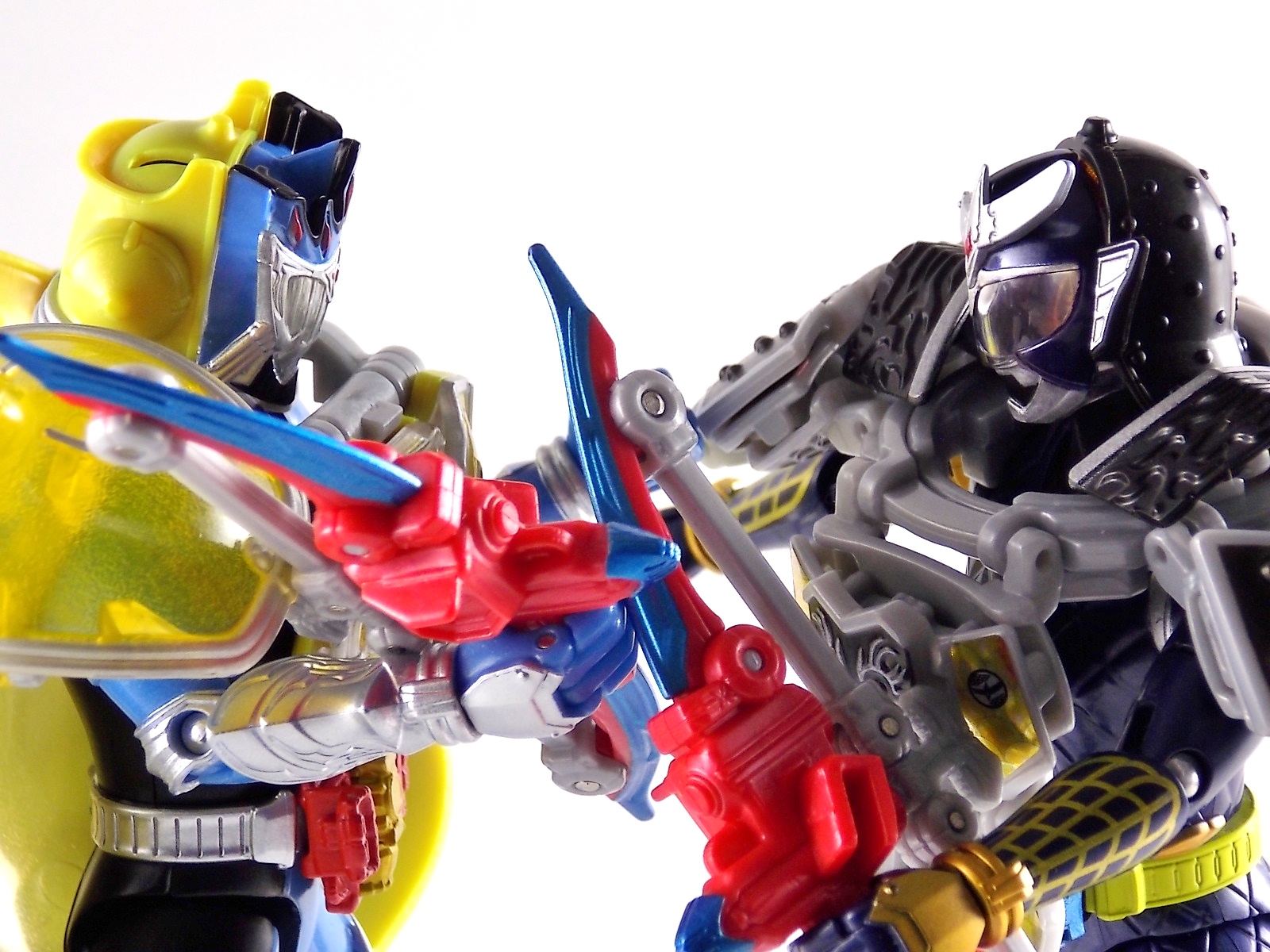 These images show you the quick and easy way you can custom up a Baron Lemon Energy Arms. And how you can use the spare parts leftover to make a pretty sweet Duke custom. Simply remove the 4 screws on the back plates of both Baron & Duke. Then remove their belts and swap. This is really easy considering these are just soft rubbery accessories. Though they are molded differently from one another so it'll be a snug fit to put either's belt on the opposite figure. Then reassemble and pop Lemon Arms onto Baron. Boom! you have your very own Arms Change Kamen Rider Baron Lemon Energy Arms. Side note. Duke's Lemon Arms feature his personal insignia on the chest. In show Baron's chest features his traditional Team Baron logo. Here the only way to recreate that on the toy would be to have a custom printed decal sized for the chest, or to skillfully paint the symbol on. Otherwise you just made yourself a cheap and easy banana lemon rider! Of not is that the AC Duke hodgepode you'll have leftover actually looks pretty damn solid with the Banana Arms and Sengoku Driver. You can basically use him as a spiffy dummy body for any of your extra Arms.