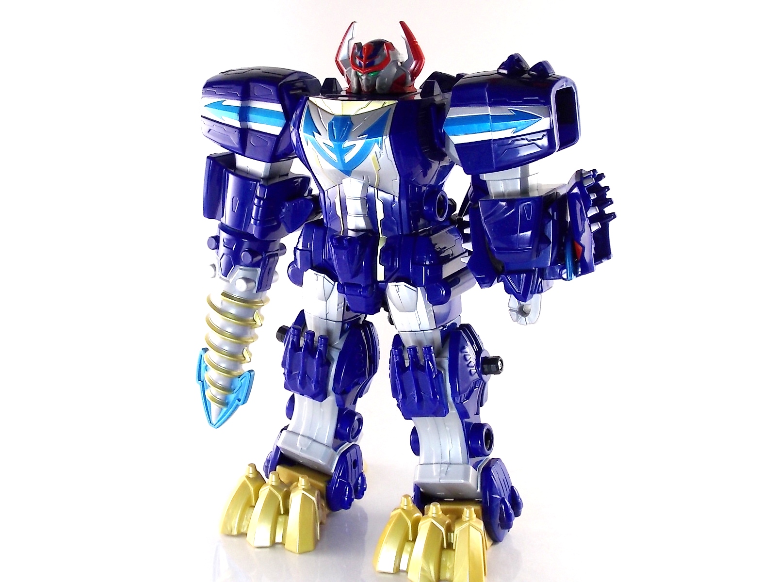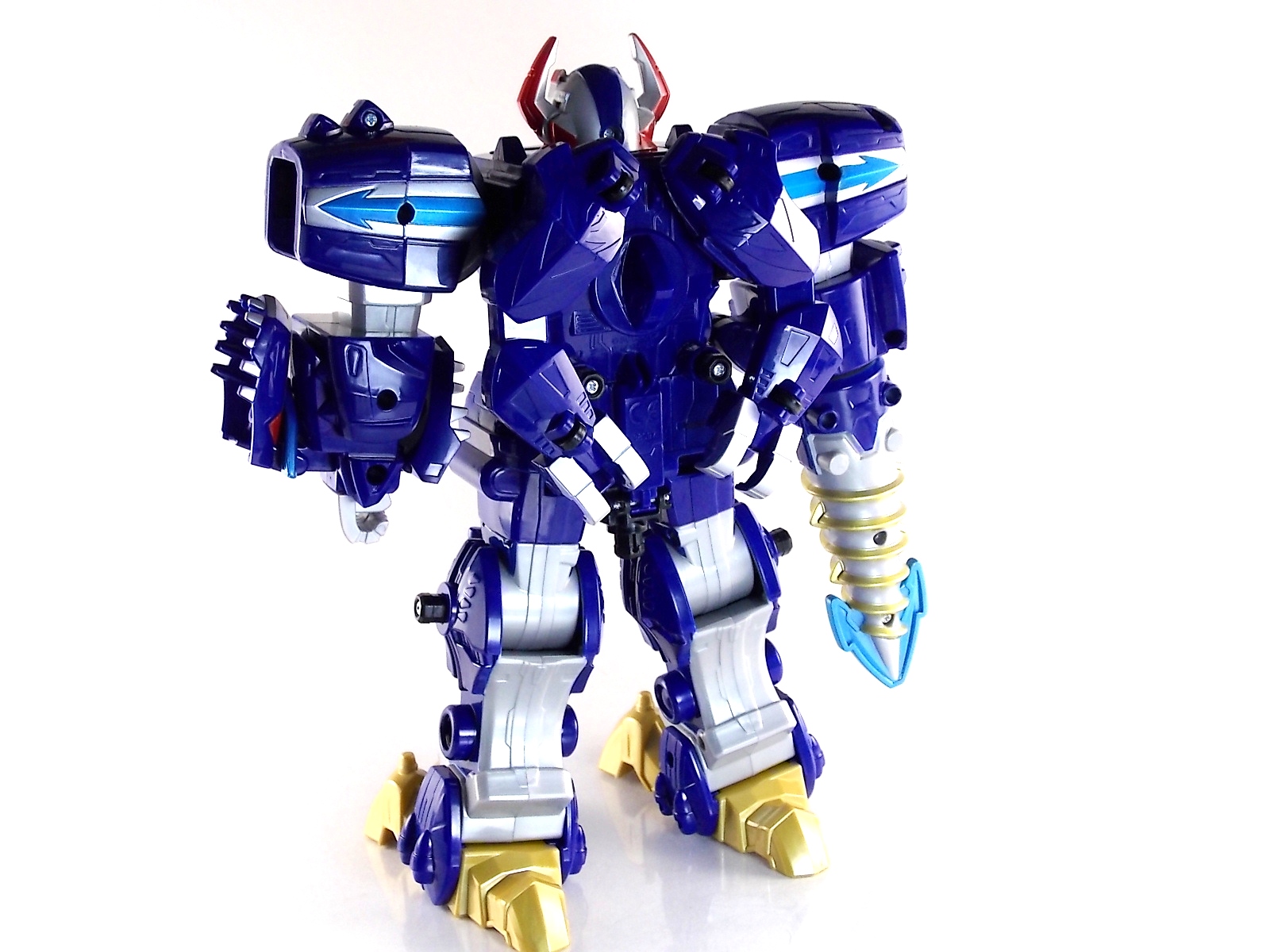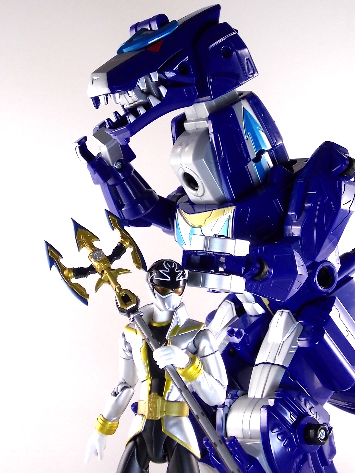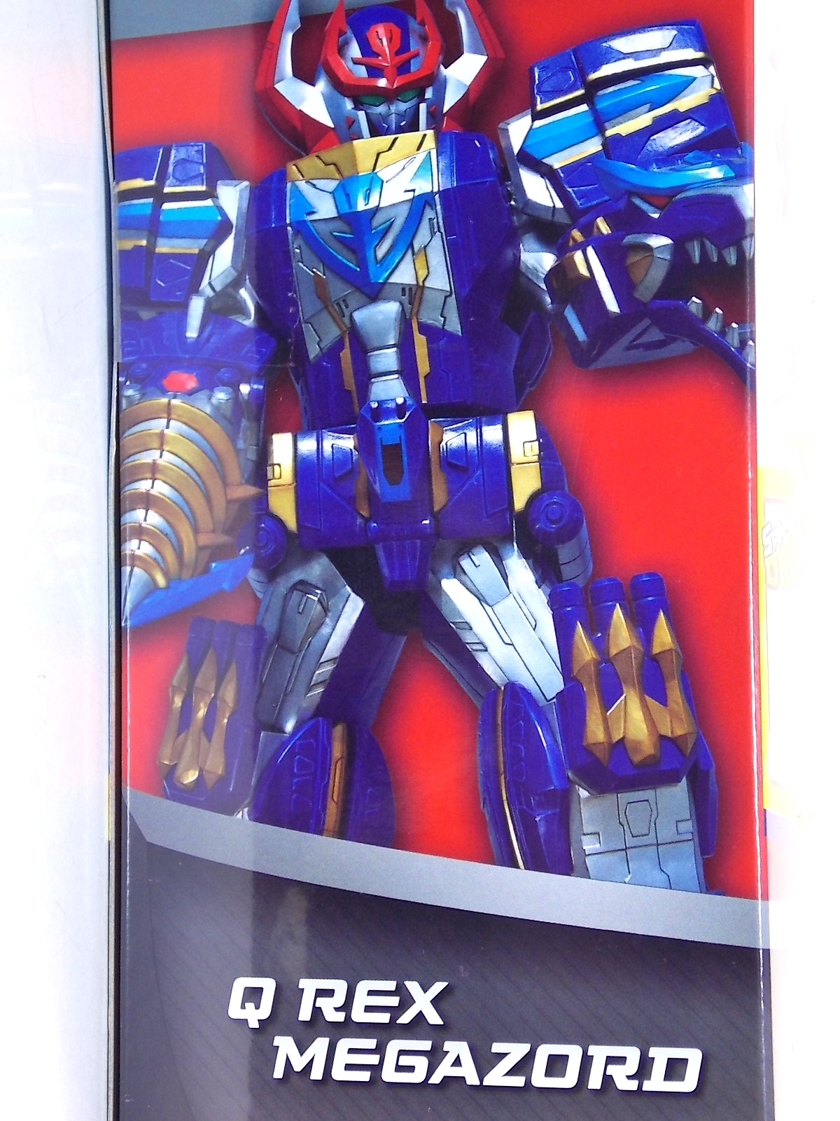 After weeks of sightings across the country it's time for TokuNation to take a look at the Power Rangers Super Megaforce Q-Rex Megazord! This recent release was first featured in the final episode of the first half of Super Megaforce; Silver Lining, Part 2. This toy is of course based on the DX Gozyujin from Kaizoku Sentai Gokaiger, and obviously the footage from Super Megaforce is taken from this series too. As a new interpretation of this previous toy, how does Q-Rex stack up? Let's find out! **A lengthy review of this toy follows but don't forget to check out Post #2 for some additional photos as well! To start the Q-Rex includes the Red Dino Thunder Ranger Key. Of the three shows to choose from a key to include, this is an odd one. As clearly evidenced in the source footage and in Super Megaforce, the 3 keys linked to this robot are MMPR Green Ranger, Dino Thunder White Ranger, & Time Force Quantum Ranger. So tossing in a red key seems odd when one of these others would have definitely been fit to include with it. Packaging The packaging for Q-Rex is the same standard open type box as the Legendary Megazord. Though this figure has come out much later than the initial Megazord assortment. As such it features new cross sells and advertisements. Such upcoming products as the Super Megaforce Ninja Zord, the new Legendary Cycles assortment, and the upcoming Ranger Keys from Wave 4. A new Ranger Key contest/event is also advertised on the packaging called the Unlock The Power Sweepstakes. All you need to do is participate is download the Ranger Key scanner app and start scanning your keys! Possible prizes including Legacy Titanus as well as the official rules for the contest can be found at the Ranger Crew blog courtesy of Fury Diamond! Dinozord Mode This mode in both the Japanese & US series is based on the Dragon Zord/Dragon Caesar & Q-Rex/V-Rex. When compared to the original Gozyujin some noticeable differences can be seen. The Q-Rex has quite a few missing paint apps, though the ones that are present are surprisingly well done. The stance of the Q-Rex is a bit more upright than Gozyujin as well making it appears bigger or rather taller in this mode.It's mostly due to the angle at which the legs are molded. This is actually a pretty great representation of the the megazords Q-Rex mode. I only take issue with how overly simplified the dino arms are. The elbow joint and poseable claws of the original Bandaj of Japan toy have been removed so these are just two solid pieces now. The arms really can't be very dynamic. The spring from the Rex head has been removed though so splaying the mouth open a little is a bit easier and more natural looking. Drill Mode Drill Mode is the form this Megazord assumes when travelling back in time from the year 3000. Sent by the Time Force Rangers for the Silver Ranger's use this form is based on the Q-Rex/V-Rex. Though it's mostly just the time travelling abilities this form inherits rather than any physical traits. In the context of the show this zord is referred as the Q-Rex by the rangers, as though it has always looked like this despite being very different from the one presented in Time Force. This form is roughly the same as the BOJ version. However there are some differences. DX Gozyujin has the ability to bend it's legs outward at 90 degree angles and fold them up against the torso to achieve this form. Due to the inclusion of the Zord Builder system in Q-Rex, rather making the legs fold, they have to be removed entirely from the mid-thigh down and then attached again to the torso via double Zord Builder joints. Unfortunately this leaves some glaring ports facing forward. The tail section becomes the forward drill in this mode as well, and despite some paint and size differences it achieves the look. The only issue I have with it is that mine has an incredibly loose joint on the drill. Where it would normally rotate down to form an arm the joint isn't solid at all, so it droops quite a bit, it does this in Dionzord mode as well. The folding landing gear have also been omitted from this toy. The Q-Rex mode dino arms have also been simplified making them a bit more difficult to store in this form. They actually stick out pretty far when attached to the back for drill mode, but extra wheels are attached to them to help balance this mode. Megazord Mode This mode is perhaps the best of the 3 intended forms. The Megazord mode succeeds in pulling off almost entirely the same look and feel as the original DX Gozyujin toy. However there is a sever lack of proper paint application to the front & backsides of this figure and there are some major physical differences here as well. Based as a double homage to the Thundersaurus Megazord & MMPR Dino Megazord, this figure shares an amalgamation of physical features between the two. Though the dino arms have a specified place to go in drill mode thanks to the instructions, here they are completely forgotten. According to the instructions you simply don't use them. And due to the permanent position the arms are molded in they can't be put in place properly on the back so you kind of have to make due. Another missing feature is the gear driven/wind up spinning gimmick of the Gozyujin. The dial to activate this gimmick in the original is merely a molded in unpainted feature here. I appreciate the molded detail still being there, but not being functional kind of hurts it. Likewise the two arms no longer feature that spin gimmick. The left arm/Q-rex head hand features no movement at all aside from being able to transform back and forth. The drill arm can still spin, but only in one direction and there is no locking mechanism to allow for any sort of tension build up or release. On the topic of the drill the trident mode has also been nixed. The Q-Rex opts for a single solid piece drill that can't split down the middle unlike it's predecessor Gozyujin. The rotating neck joint built into the torso with two lengths (1 for di