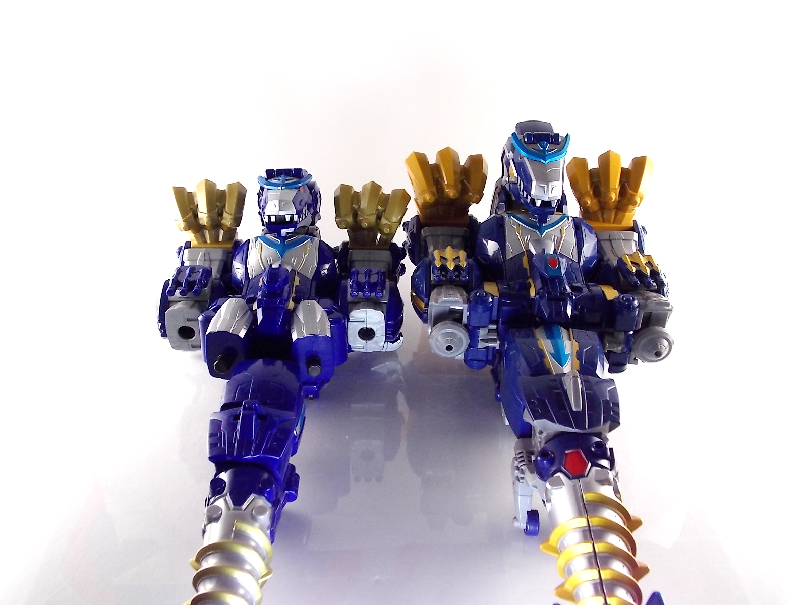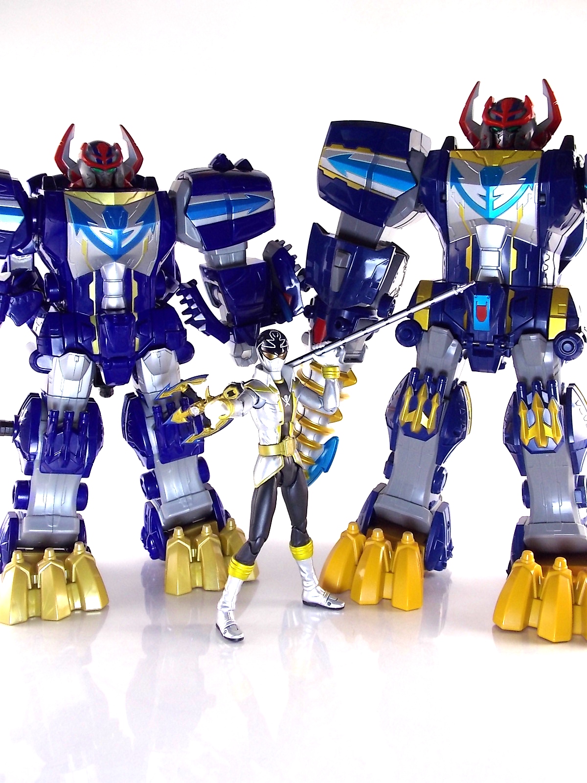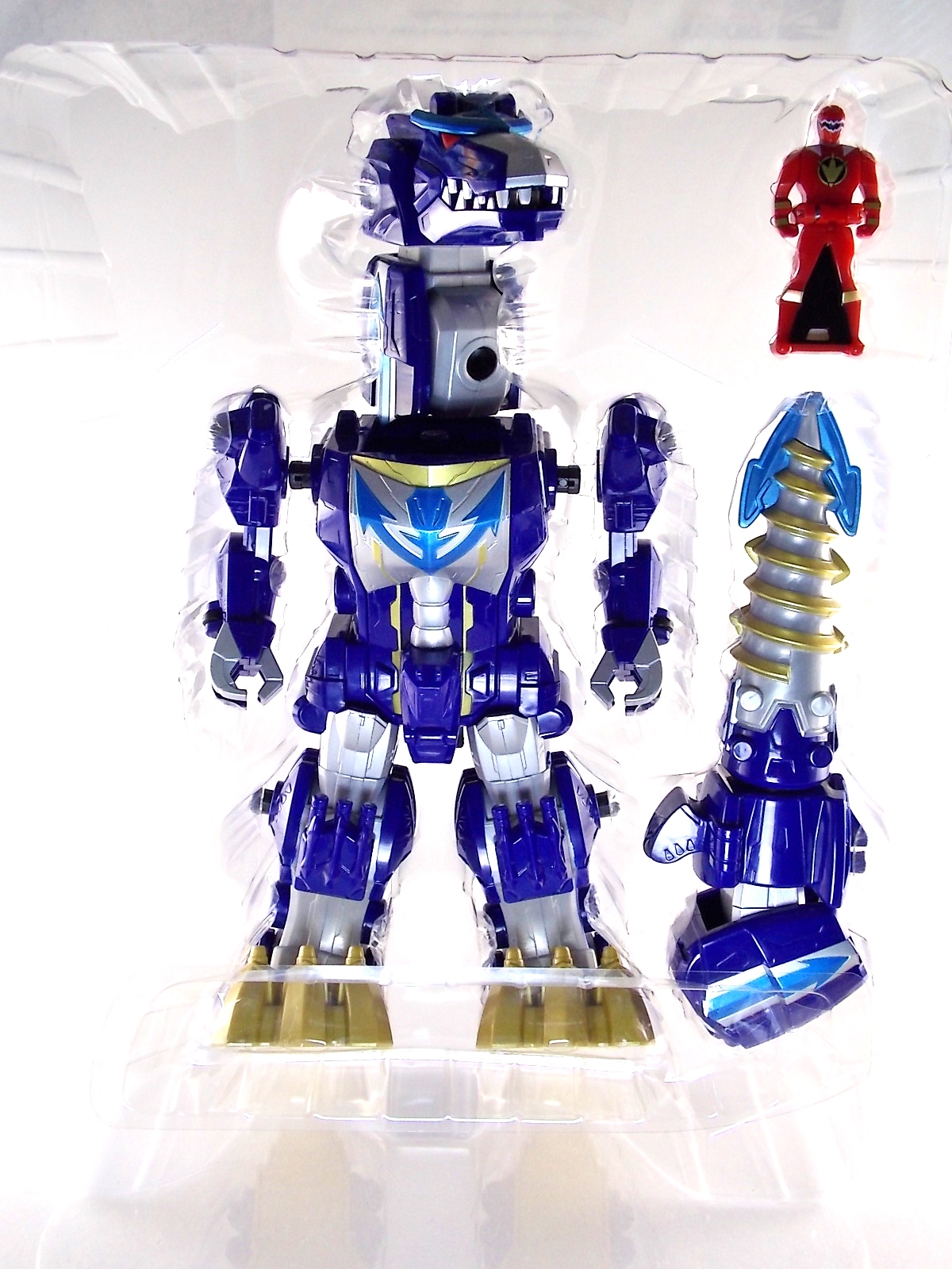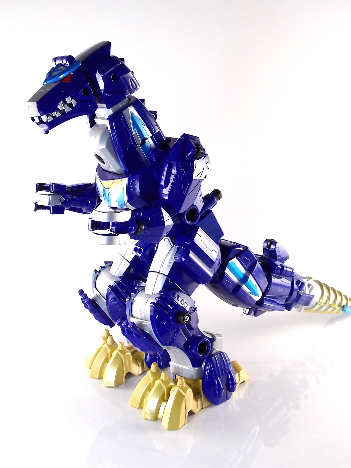 After weeks of sightings across the country it's time for TokuNation to take a look at the Power Rangers Super Megaforce Q-Rex Megazord! This recent release was first featured in the final episode of the first half of Super Megaforce; Silver Lining, Part 2. This toy is of course based on the DX Gozyujin from Kaizoku Sentai Gokaiger, and obviously the footage from Super Megaforce is taken from this series too. As a new interpretation of this previous toy, how does Q-Rex stack up? Let's find out! **A lengthy review of this toy follows but don't forget to check out Post #2 for some additional photos as well! To start the Q-Rex includes the Red Dino Thunder Ranger Key. Of the three shows to choose from a key to include, this is an odd one. As clearly evidenced in the source footage and in Super Megaforce, the 3 keys linked to this robot are MMPR Green Ranger, Dino Thunder White Ranger, & Time Force Quantum Ranger. So tossing in a red key seems odd when one of these others would have definitely been fit to include with it. Packaging The packaging for Q-Rex is the same standard open type box as the Legendary Megazord. Though this figure has come out much later than the initial Megazord assortment. As such it features new cross sells and advertisements. Such upcoming products as the Super Megaforce Ninja Zord, the new Legendary Cycles assortment, and the upcoming Ranger Keys from Wave 4. A new Ranger Key contest/event is also advertised on the packaging called the Unlock The Power Sweepstakes. All you need to do is participate is download the Ranger Key scanner app and start scanning your keys! Possible prizes including Legacy Titanus as well as the official rules for the contest can be found at the Ranger Crew blog courtesy of Fury Diamond! Dinozord Mode This mode in both the Japanese & US series is based on the Dragon Zord/Dragon Caesar & Q-Rex/V-Rex. When compared to the original Gozyujin some noticeable differences can be seen. The Q-Rex has quite a few missing paint apps, though the ones that are present are surprisingly well done. The stance of the Q-Rex is a bit more upright than Gozyujin as well making it appears bigger or rather taller in this mode.It's mostly due to the angle at which the legs are molded. This is actually a pretty great representation of the the megazords Q-Rex mode. I only take issue with how overly simplified the dino arms are. The elbow joint and poseable claws of the original Bandaj of Japan toy have been removed so these are just two solid pieces now. The arms really can't be very dynamic. The spring from the Rex head has been removed though so splaying the mouth open a little is a bit easier and more natural looking. Drill Mode Drill Mode is the form this Megazord assumes when travelling back in time from the year 3000. Sent by the Time Force Rangers for the Silver Ranger's use this form is based on the Q-Rex/V-Rex. Though it's mostly just the time travelling abilities this form inherits rather than any physical traits. In the context of the show this zord is referred as the Q-Rex by the rangers, as though it has always looked like this despite being very different from the one presented in Time Force. This form is roughly the same as the BOJ version. However there are some differences. DX Gozyujin has the ability to bend it's legs outward at 90 degree angles and fold them up against the torso to achieve this form. Due to the inclusion of the Zord Builder system in Q-Rex, rather making the legs fold, they have to be removed entirely from the mid-thigh down and then attached again to the torso via double Zord Builder joints. Unfortunately this leaves some glaring ports facing forward. The tail section becomes the forward drill in this mode as well, and despite some paint and size differences it achieves the look. The only issue I have with it is that mine has an incredibly loose joint on the drill. Where it would normally rotate down to form an arm the joint isn't solid at all, so it droops quite a bit, it does this in Dionzord mode as well. The folding landing gear have also been omitted from this toy. The Q-Rex mode dino arms have also been simplified making them a bit more difficult to store in this form. They actually stick out pretty far when attached to the back for drill mode, but extra wheels are attached to them to help balance this mode. Megazord Mode This mode is perhaps the best of the 3 intended forms. The Megazord mode succeeds in pulling off almost entirely the same look and feel as the original DX Gozyujin toy. However there is a sever lack of proper paint application to the front & backsides of this figure and there are some major physical differences here as well. Based as a double homage to the Thundersaurus Megazord & MMPR Dino Megazord, this figure shares an amalgamation of physical features between the two. Though the dino arms have a specified place to go in drill mode thanks to the instructions, here they are completely forgotten. According to the instructions you simply don't use them. And due to the permanent position the arms are molded in they can't be put in place properly on the back so you kind of have to make due. Another missing feature is the gear driven/wind up spinning gimmick of the Gozyujin. The dial to activate this gimmick in the original is merely a molded in unpainted feature here. I appreciate the molded detail still being there, but not being functional kind of hurts it. Likewise the two arms no longer feature that spin gimmick. The left arm/Q-rex head hand features no movement at all aside from being able to transform back and forth. The drill arm can still spin, but only in one direction and there is no locking mechanism to allow for any sort of tension build up or release. On the topic of the drill the trident mode has also been nixed. The Q-Rex opts for a single solid piece drill that can't split down the middle unlike it's predecessor Gozyujin. The rotating neck joint built into the torso with two lengths (1 for di