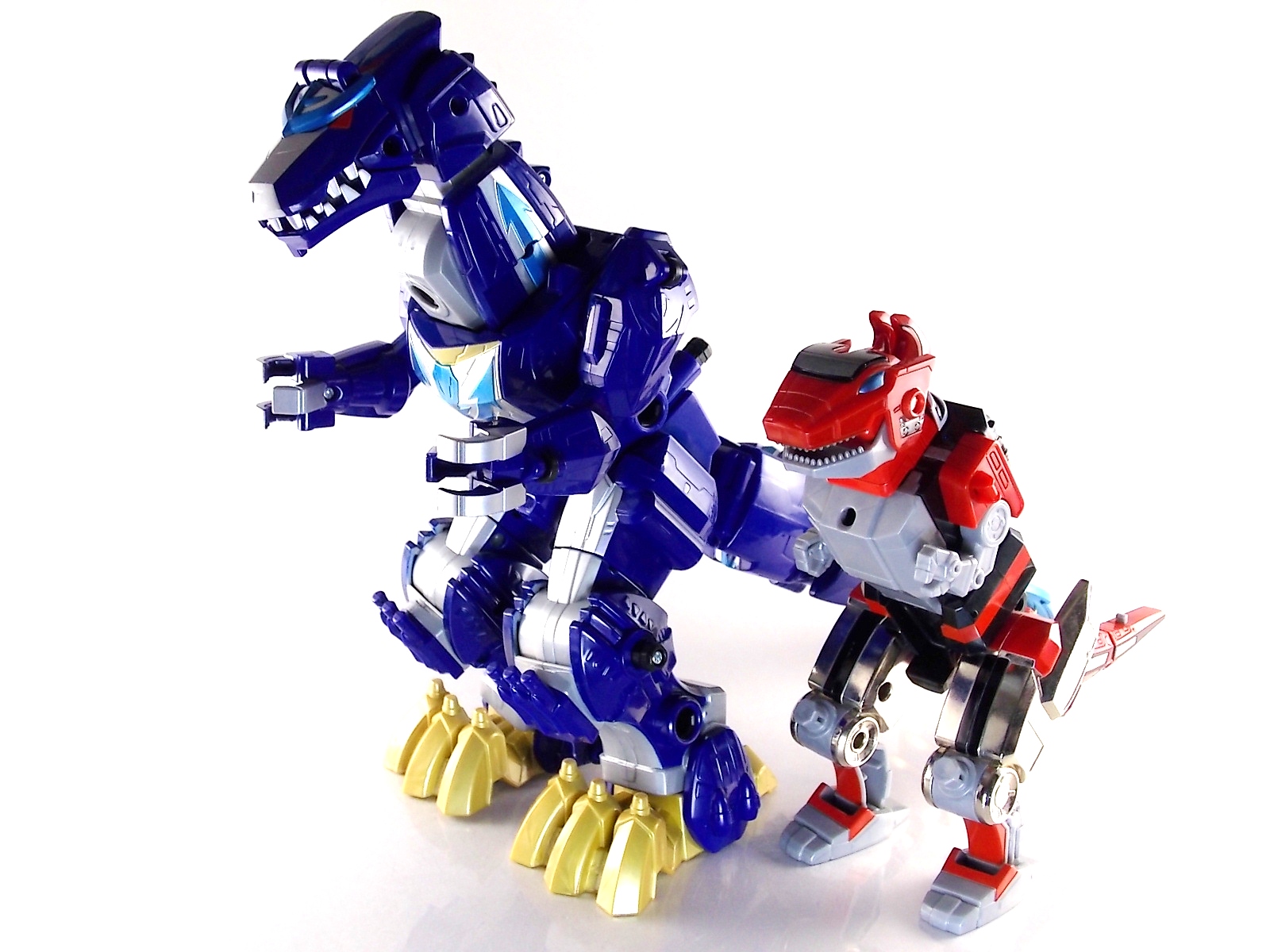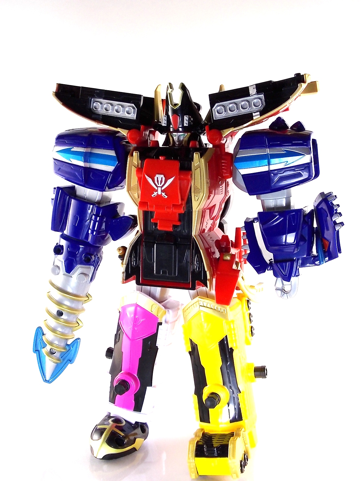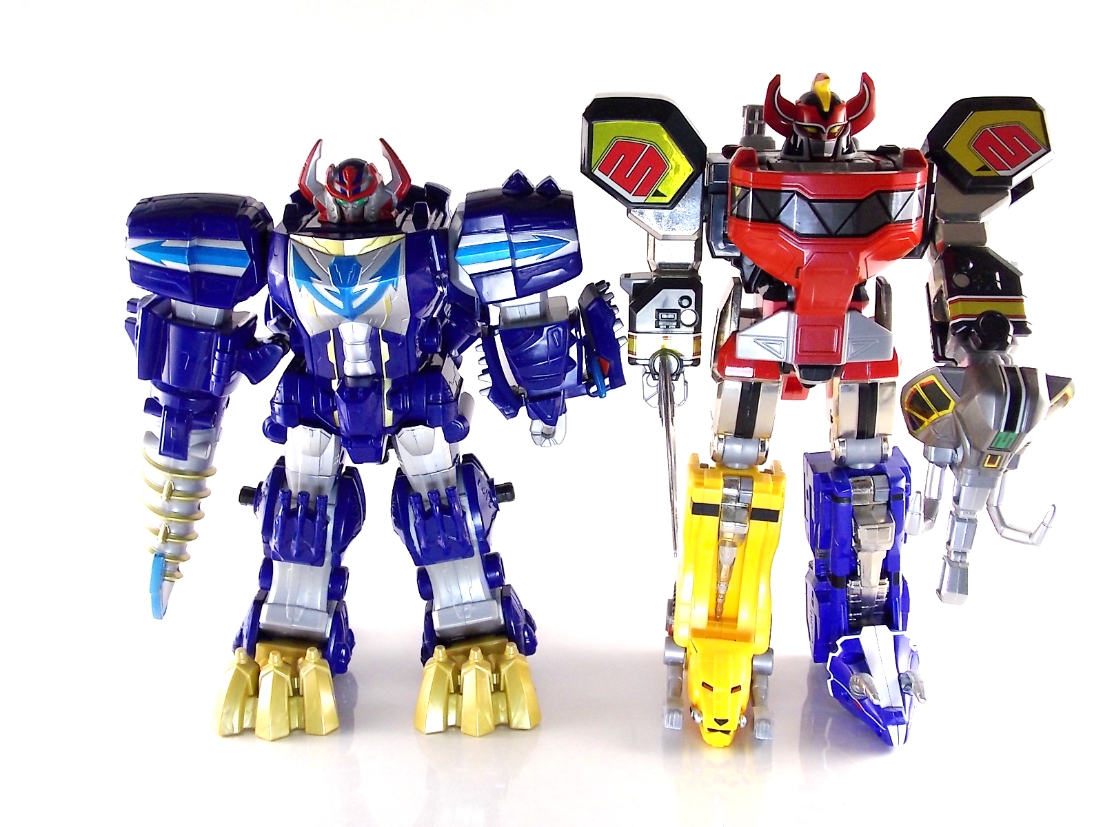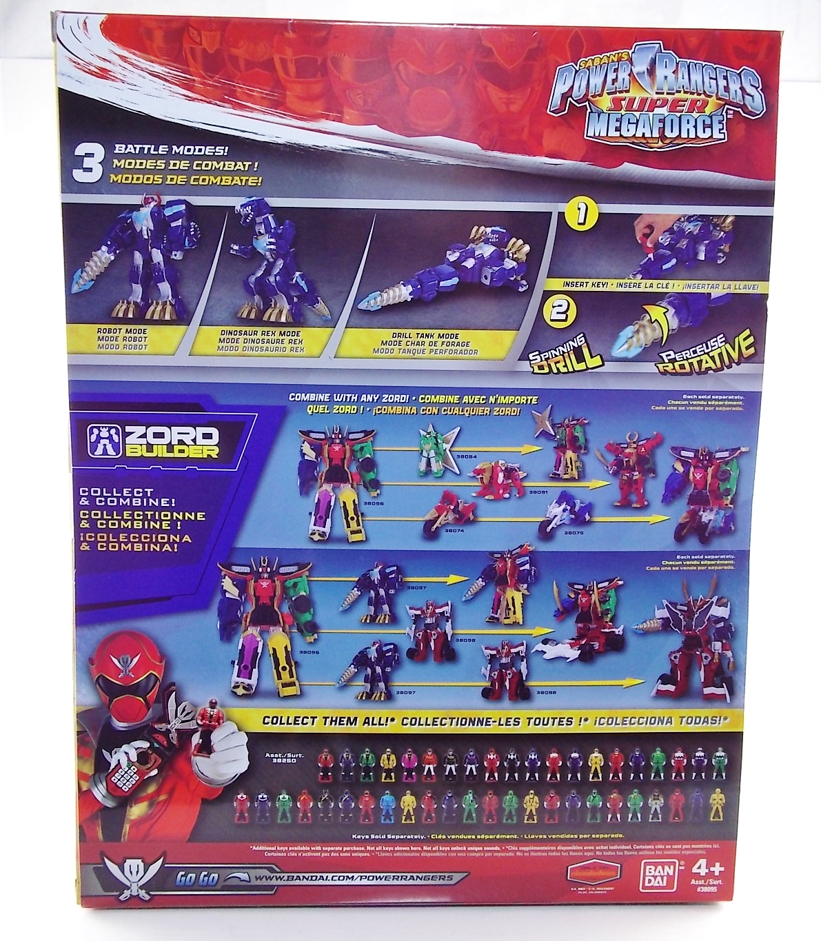 After weeks of sightings across the country it's time for TokuNation to take a look at the Power Rangers Super Megaforce Q-Rex Megazord! This recent release was first featured in the final episode of the first half of Super Megaforce; Silver Lining, Part 2. This toy is of course based on the DX Gozyujin from Kaizoku Sentai Gokaiger, and obviously the footage from Super Megaforce is taken from this series too. As a new interpretation of this previous toy, how does Q-Rex stack up? Let's find out! **A lengthy review of this toy follows but don't forget to check out Post #2 for some additional photos as well! To start the Q-Rex includes the Red Dino Thunder Ranger Key. Of the three shows to choose from a key to include, this is an odd one. As clearly evidenced in the source footage and in Super Megaforce, the 3 keys linked to this robot are MMPR Green Ranger, Dino Thunder White Ranger, & Time Force Quantum Ranger. So tossing in a red key seems odd when one of these others would have definitely been fit to include with it. Packaging The packaging for Q-Rex is the same standard open type box as the Legendary Megazord. Though this figure has come out much later than the initial Megazord assortment. As such it features new cross sells and advertisements. Such upcoming products as the Super Megaforce Ninja Zord, the new Legendary Cycles assortment, and the upcoming Ranger Keys from Wave 4. A new Ranger Key contest/event is also advertised on the packaging called the Unlock The Power Sweepstakes. All you need to do is participate is download the Ranger Key scanner app and start scanning your keys! Possible prizes including Legacy Titanus as well as the official rules for the contest can be found at the Ranger Crew blog courtesy of Fury Diamond! Dinozord Mode This mode in both the Japanese & US series is based on the Dragon Zord/Dragon Caesar & Q-Rex/V-Rex. When compared to the original Gozyujin some noticeable differences can be seen. The Q-Rex has quite a few missing paint apps, though the ones that are present are surprisingly well done. The stance of the Q-Rex is a bit more upright than Gozyujin as well making it appears bigger or rather taller in this mode.It's mostly due to the angle at which the legs are molded. This is actually a pretty great representation of the the megazords Q-Rex mode. I only take issue with how overly simplified the dino arms are. The elbow joint and poseable claws of the original Bandaj of Japan toy have been removed so these are just two solid pieces now. The arms really can't be very dynamic. The spring from the Rex head has been removed though so splaying the mouth open a little is a bit easier and more natural looking. Drill Mode Drill Mode is the form this Megazord assumes when travelling back in time from the year 3000. Sent by the Time Force Rangers for the Silver Ranger's use this form is based on the Q-Rex/V-Rex. Though it's mostly just the time travelling abilities this form inherits rather than any physical traits. In the context of the show this zord is referred as the Q-Rex by the rangers, as though it has always looked like this despite being very different from the one presented in Time Force. This form is roughly the same as the BOJ version. However there are some differences. DX Gozyujin has the ability to bend it's legs outward at 90 degree angles and fold them up against the torso to achieve this form. Due to the inclusion of the Zord Builder system in Q-Rex, rather making the legs fold, they have to be removed entirely from the mid-thigh down and then attached again to the torso via double Zord Builder joints. Unfortunately this leaves some glaring ports facing forward. The tail section becomes the forward drill in this mode as well, and despite some paint and size differences it achieves the look. The only issue I have with it is that mine has an incredibly loose joint on the drill. Where it would normally rotate down to form an arm the joint isn't solid at all, so it droops quite a bit, it does this in Dionzord mode as well. The folding landing gear have also been omitted from this toy. The Q-Rex mode dino arms have also been simplified making them a bit more difficult to store in this form. They actually stick out pretty far when attached to the back for drill mode, but extra wheels are attached to them to help balance this mode. Megazord Mode This mode is perhaps the best of the 3 intended forms. The Megazord mode succeeds in pulling off almost entirely the same look and feel as the original DX Gozyujin toy. However there is a sever lack of proper paint application to the front & backsides of this figure and there are some major physical differences here as well. Based as a double homage to the Thundersaurus Megazord & MMPR Dino Megazord, this figure shares an amalgamation of physical features between the two. Though the dino arms have a specified place to go in drill mode thanks to the instructions, here they are completely forgotten. According to the instructions you simply don't use them. And due to the permanent position the arms are molded in they can't be put in place properly on the back so you kind of have to make due. Another missing feature is the gear driven/wind up spinning gimmick of the Gozyujin. The dial to activate this gimmick in the original is merely a molded in unpainted feature here. I appreciate the molded detail still being there, but not being functional kind of hurts it. Likewise the two arms no longer feature that spin gimmick. The left arm/Q-rex head hand features no movement at all aside from being able to transform back and forth. The drill arm can still spin, but only in one direction and there is no locking mechanism to allow for any sort of tension build up or release. On the topic of the drill the trident mode has also been nixed. The Q-Rex opts for a single solid piece drill that can't split down the middle unlike it's predecessor Gozyujin. The rotating neck joint built into the torso with two lengths (1 for di