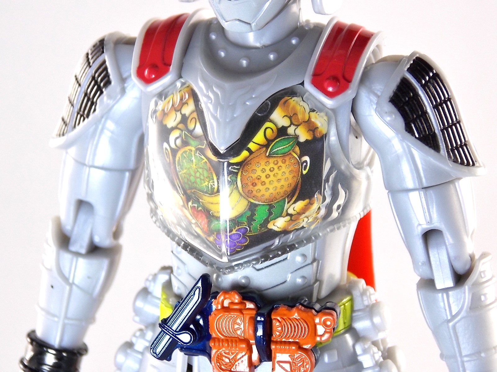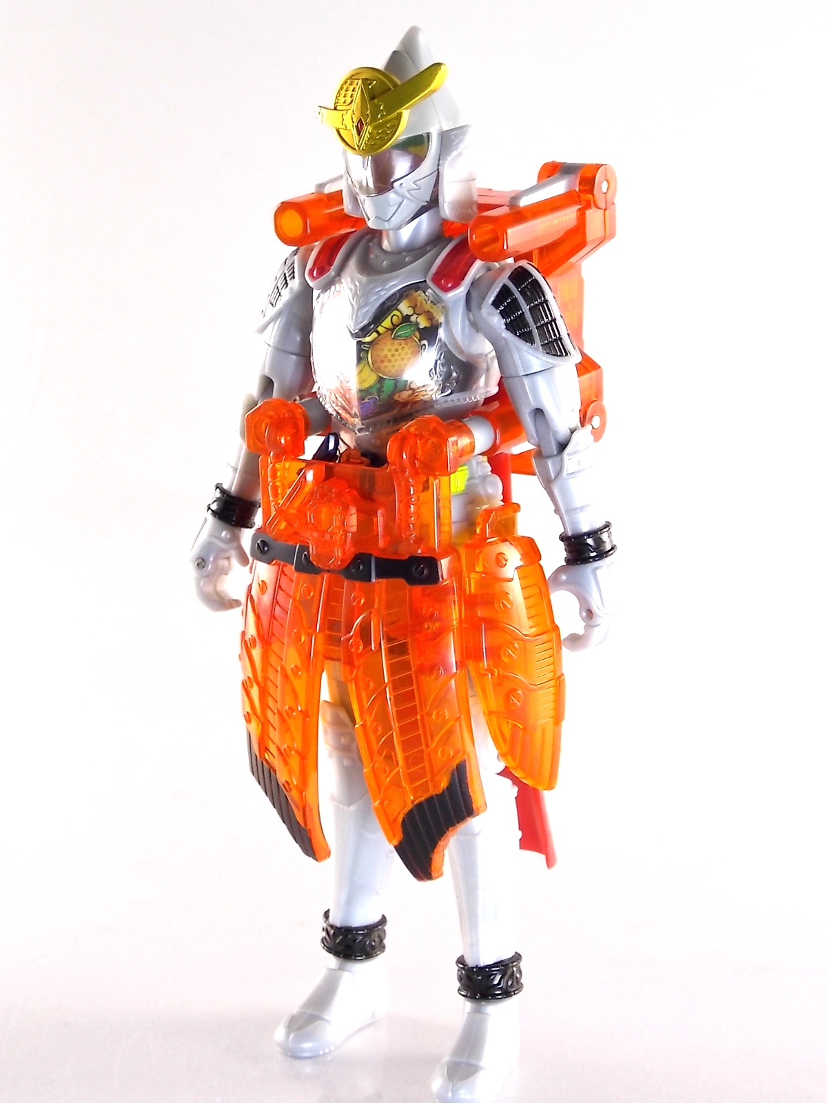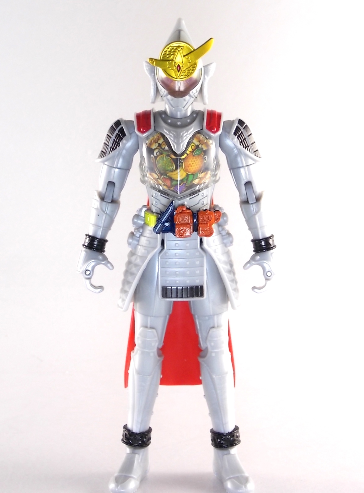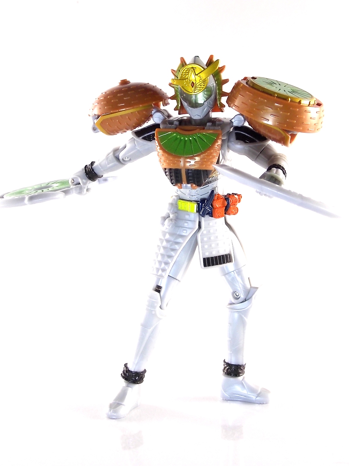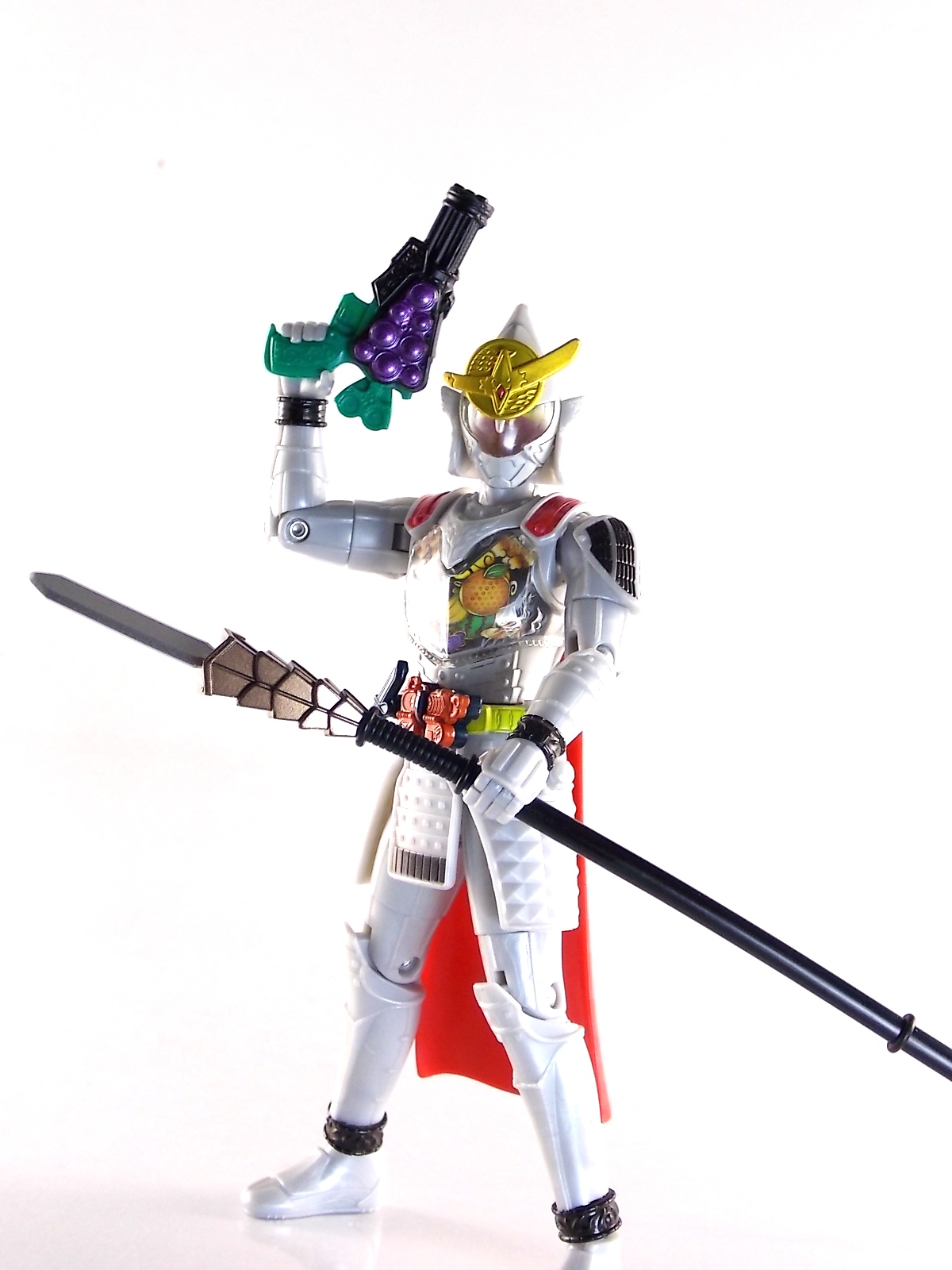 It's time for us take a look at the final retail release in Bandai Of Japan's magnificent Arms Change toy line! The mighty ultimate form of Gaim has finally been released, AC13 Kamen Rider Gaim Kiwami Arms! Below are over 50 images of this figure, but be sure to check out a video review on our front page by good friend baltmatrix! *Post #2 contains additional images! So let's lock on, or rather open, and dive into the review! Packaging AC13 is a unique release in this line. Rather than being a standard figure with a set of arms intended to used with it, you have a figure with a dummy set of arms meant to be "cast off" from it. So there isn't a nice tiny fruit to pack in here but rather a full set of additional armor molded in a single position. As such the packaging for Kiwami is about twice the width of standard AC boxes. Main Figure This form put a lot of fans off at first. The more muted color choices and deviation from Gaim's previous forms seemed to put people off. But thankfully seeing it in action in show really helped convey the level of badass this form represents. The figure really accomplishes this as well. When you take Kiwami Arms Gaim out of the box he's more or less all set to go in his basic form. Nothing needs to be attached or removed to represent this final combo. Looking at just this basic figure Bandai made sure to sculpt in plenty of detail since it's a primarily gray base body. Though according to the show it should be a more vibrant silvery/white. It shares minor elements with previous AC bodies but is mostly a creation all it's own. The chest emblem is actually really nicely done as well. It appears to be a single decal set into the chest with a clear shield over it. While not as shiny or awesome as the real thing, on a budget toy like this it gets the effect across just fine. The chest showcases Ichigo, Melon, Banana, Grape, Suika, & Orange. This version of Gaim also has a really nice rainbow colored visor inside his helmet. Of course this piece can be taken out of Kiwami and given to other AC figures as it fits the standard size of all their visor/faceplates. Removing it from Gaim let's you swap other AC arms onto him. But you'll also need to remove the neck/shoulder guard to expose the universal AC clips on the shoulders. Oh and the cape needs to be removed too. Yay for show accuracy from that one episode where he used it like a Matador! This allows you to put any Arms you choose onto Gaim. In the gallery below we've put every single Arms on him currently available. Aside from Blood Orange Arms & Durian Arms whose figures are in transit to me currently. As you can see this figure pulls of the look of most arms quite well. Much like Zangetsu & Shin Zangetsu, Kiwami Arms has a very basic color scheme making it compatible with almost anything. However due to the way the new chest is designed on Kiwami it sticks out a bit further than the other more flat AC figures. So the chest pieces for certain arms can't actually rest flat against his chest. Mango is the worst one for this issue followed closely by Lemon Energy. Either way the ability to use these Arms with Kiwami Arms helped bring this whole line and the gimmick full circle, even if this ability won't be demonstrated in the show. Accessories As mentioned before Kiwami Arms Gaim includes a very unique accessory. A full set of "dummy Kachidoki Arms! This is included of course to help replicate the "cast off" style transformation from Kachidoki to Kiwami Arms. In show Gaim uses the Kiwami Key to literally open the Kachidoki Lock on his belt. In doing so the armor shoots off and the suit changes color in the process. Now there's simply no way to have a toy version of that suit that's one color before a transformation and another color after. So the toy makes a compromise. The included Kachidoki armor, or rather "Crappydoki" as named by friend of the site Monkie Ranger, is cast in a translucent orange. This armor is pegged together via the back piece which has peg holes on the top and bottom to attach the torso and skirt armor to. Using this armor on Kiwami allows you to create a sort of mid transformation state just before the armor shoots off to create Kiwami Arms. And to help with that the armor is actually spring loaded. By turning a dial on the back of the Kachidoki you can shoot off the two forward sections. The back piece needs to be pulled off as it's physically connected to Kiwami Arms' cape. Again this armor is just a stand in piece to convey a gimmick. It's not meant to be a great Kachidoki Arms figure. If you want that then go by the real one like you're supposed to. The gimmick of this set of armor is literally to be a stand in for a set of magical CG armor about a second before it shoots off of a guy into the air and he goes into super badass mode. So I think it's hard to complain that this is a bad toy or a bad feature. If you don't like it you clearly aren't getting what it represents nor the primary point of the toy. If you want a proper Kachidoki Arms you should probably buy Kachidoki. This armor does exactly what it's supposed to here. And while it can be used on other Arms Change toys it isn't nearly as secure since it locks onto Kiwami via the cape peg and would have nowhere to do so on other figures. Also included with Kiwami Arms are both version of the DJ Gun! The standard DJ Gun form and the combined form created with the Musou Saber, Taiken Mode. Now both of these are cast in the wrong colors, predominantly white with some orange. The reasoning for this is that the figures main body and weapons are likely cast on the same runner at the factory. While they are a bit inaccurate both in color and size they work just fine. just like the ones included with Kachidoki Arms itself you get two versions. Though Taiken Mode here is literally one molded together combined piece rather than separate Gun & Musou Saber. Final Thoughts Kamen Rider Gaim's Arms Change line has been one of the most refreshin