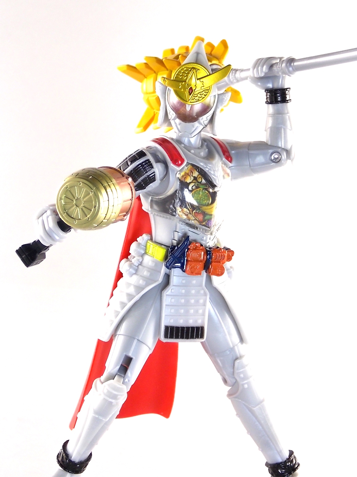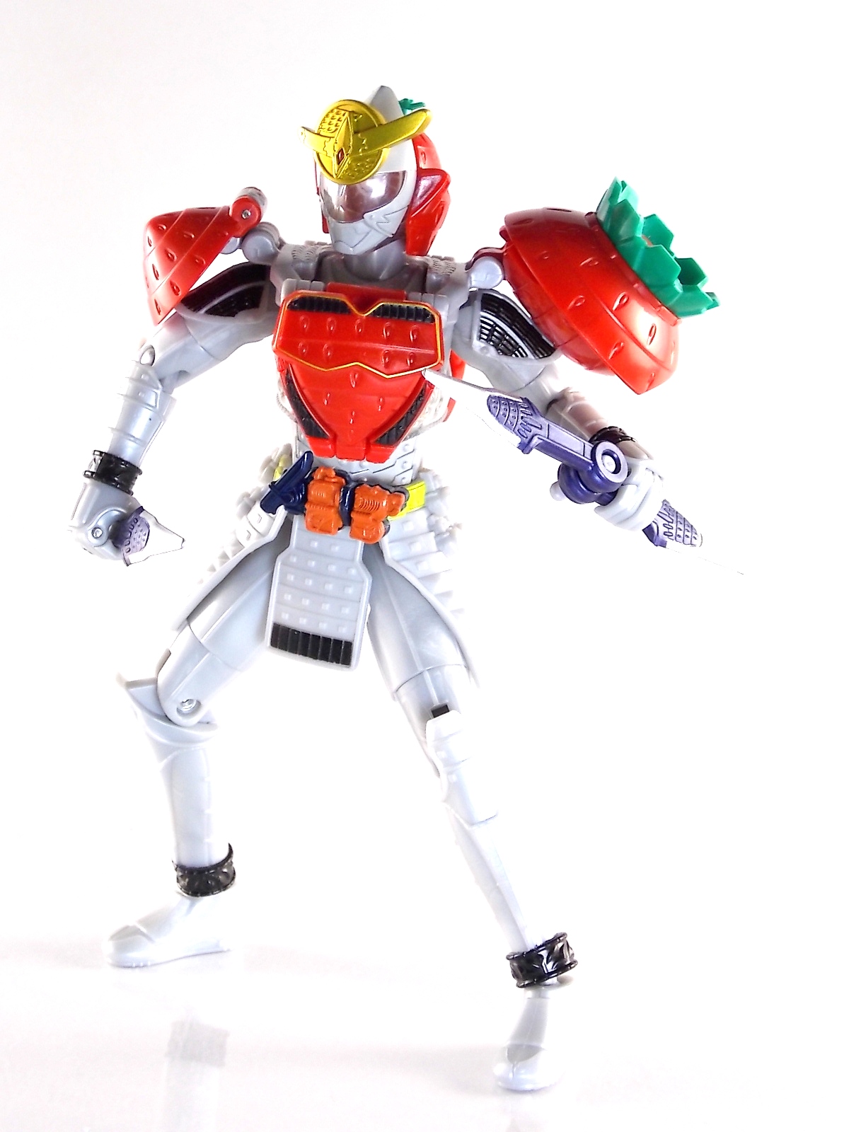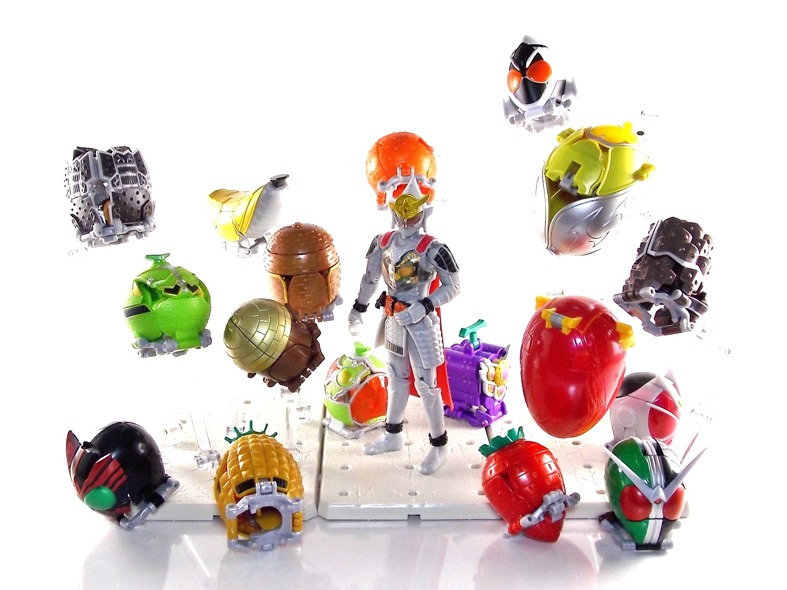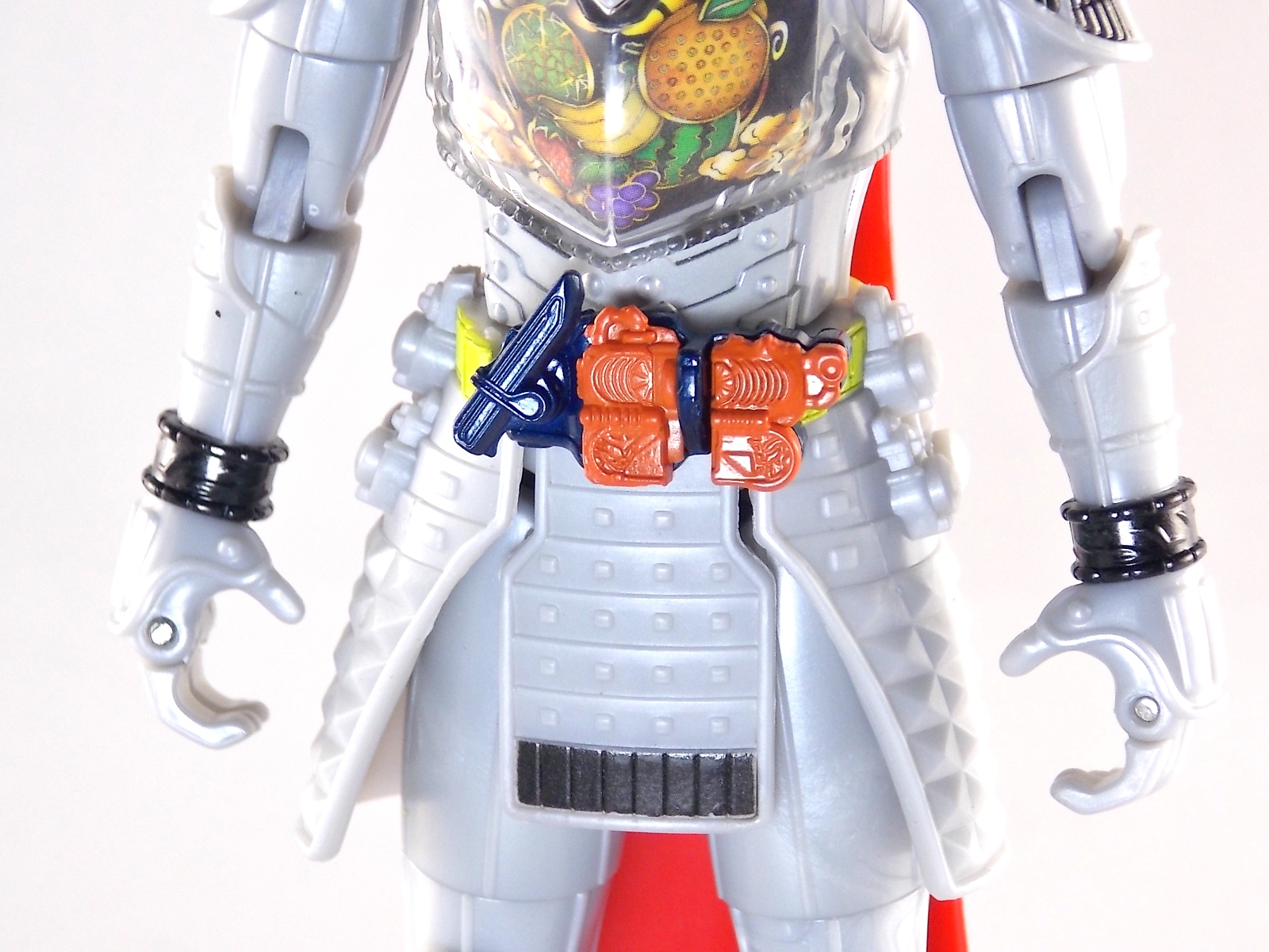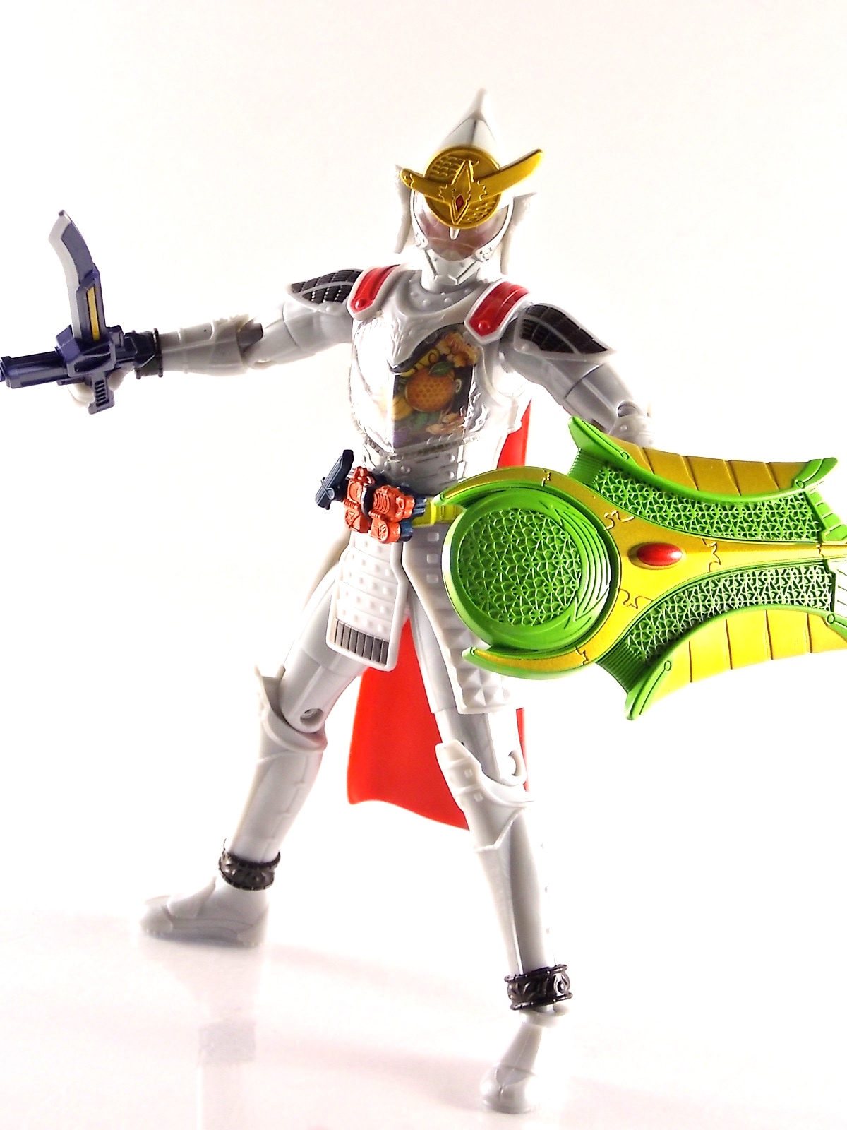 It's time for us take a look at the final retail release in Bandai Of Japan's magnificent Arms Change toy line! The mighty ultimate form of Gaim has finally been released, AC13 Kamen Rider Gaim Kiwami Arms! Below are over 50 images of this figure, but be sure to check out a video review on our front page by good friend baltmatrix! *Post #2 contains additional images! So let's lock on, or rather open, and dive into the review! Packaging AC13 is a unique release in this line. Rather than being a standard figure with a set of arms intended to used with it, you have a figure with a dummy set of arms meant to be "cast off" from it. So there isn't a nice tiny fruit to pack in here but rather a full set of additional armor molded in a single position. As such the packaging for Kiwami is about twice the width of standard AC boxes. Main Figure This form put a lot of fans off at first. The more muted color choices and deviation from Gaim's previous forms seemed to put people off. But thankfully seeing it in action in show really helped convey the level of badass this form represents. The figure really accomplishes this as well. When you take Kiwami Arms Gaim out of the box he's more or less all set to go in his basic form. Nothing needs to be attached or removed to represent this final combo. Looking at just this basic figure Bandai made sure to sculpt in plenty of detail since it's a primarily gray base body. Though according to the show it should be a more vibrant silvery/white. It shares minor elements with previous AC bodies but is mostly a creation all it's own. The chest emblem is actually really nicely done as well. It appears to be a single decal set into the chest with a clear shield over it. While not as shiny or awesome as the real thing, on a budget toy like this it gets the effect across just fine. The chest showcases Ichigo, Melon, Banana, Grape, Suika, & Orange. This version of Gaim also has a really nice rainbow colored visor inside his helmet. Of course this piece can be taken out of Kiwami and given to other AC figures as it fits the standard size of all their visor/faceplates. Removing it from Gaim let's you swap other AC arms onto him. But you'll also need to remove the neck/shoulder guard to expose the universal AC clips on the shoulders. Oh and the cape needs to be removed too. Yay for show accuracy from that one episode where he used it like a Matador! This allows you to put any Arms you choose onto Gaim. In the gallery below we've put every single Arms on him currently available. Aside from Blood Orange Arms & Durian Arms whose figures are in transit to me currently. As you can see this figure pulls of the look of most arms quite well. Much like Zangetsu & Shin Zangetsu, Kiwami Arms has a very basic color scheme making it compatible with almost anything. However due to the way the new chest is designed on Kiwami it sticks out a bit further than the other more flat AC figures. So the chest pieces for certain arms can't actually rest flat against his chest. Mango is the worst one for this issue followed closely by Lemon Energy. Either way the ability to use these Arms with Kiwami Arms helped bring this whole line and the gimmick full circle, even if this ability won't be demonstrated in the show. Accessories As mentioned before Kiwami Arms Gaim includes a very unique accessory. A full set of "dummy Kachidoki Arms! This is included of course to help replicate the "cast off" style transformation from Kachidoki to Kiwami Arms. In show Gaim uses the Kiwami Key to literally open the Kachidoki Lock on his belt. In doing so the armor shoots off and the suit changes color in the process. Now there's simply no way to have a toy version of that suit that's one color before a transformation and another color after. So the toy makes a compromise. The included Kachidoki armor, or rather "Crappydoki" as named by friend of the site Monkie Ranger, is cast in a translucent orange. This armor is pegged together via the back piece which has peg holes on the top and bottom to attach the torso and skirt armor to. Using this armor on Kiwami allows you to create a sort of mid transformation state just before the armor shoots off to create Kiwami Arms. And to help with that the armor is actually spring loaded. By turning a dial on the back of the Kachidoki you can shoot off the two forward sections. The back piece needs to be pulled off as it's physically connected to Kiwami Arms' cape. Again this armor is just a stand in piece to convey a gimmick. It's not meant to be a great Kachidoki Arms figure. If you want that then go by the real one like you're supposed to. The gimmick of this set of armor is literally to be a stand in for a set of magical CG armor about a second before it shoots off of a guy into the air and he goes into super badass mode. So I think it's hard to complain that this is a bad toy or a bad feature. If you don't like it you clearly aren't getting what it represents nor the primary point of the toy. If you want a proper Kachidoki Arms you should probably buy Kachidoki. This armor does exactly what it's supposed to here. And while it can be used on other Arms Change toys it isn't nearly as secure since it locks onto Kiwami via the cape peg and would have nowhere to do so on other figures. Also included with Kiwami Arms are both version of the DJ Gun! The standard DJ Gun form and the combined form created with the Musou Saber, Taiken Mode. Now both of these are cast in the wrong colors, predominantly white with some orange. The reasoning for this is that the figures main body and weapons are likely cast on the same runner at the factory. While they are a bit inaccurate both in color and size they work just fine. just like the ones included with Kachidoki Arms itself you get two versions. Though Taiken Mode here is literally one molded together combined piece rather than separate Gun & Musou Saber. Final Thoughts Kamen Rider Gaim's Arms Change line has been one of the most refreshin