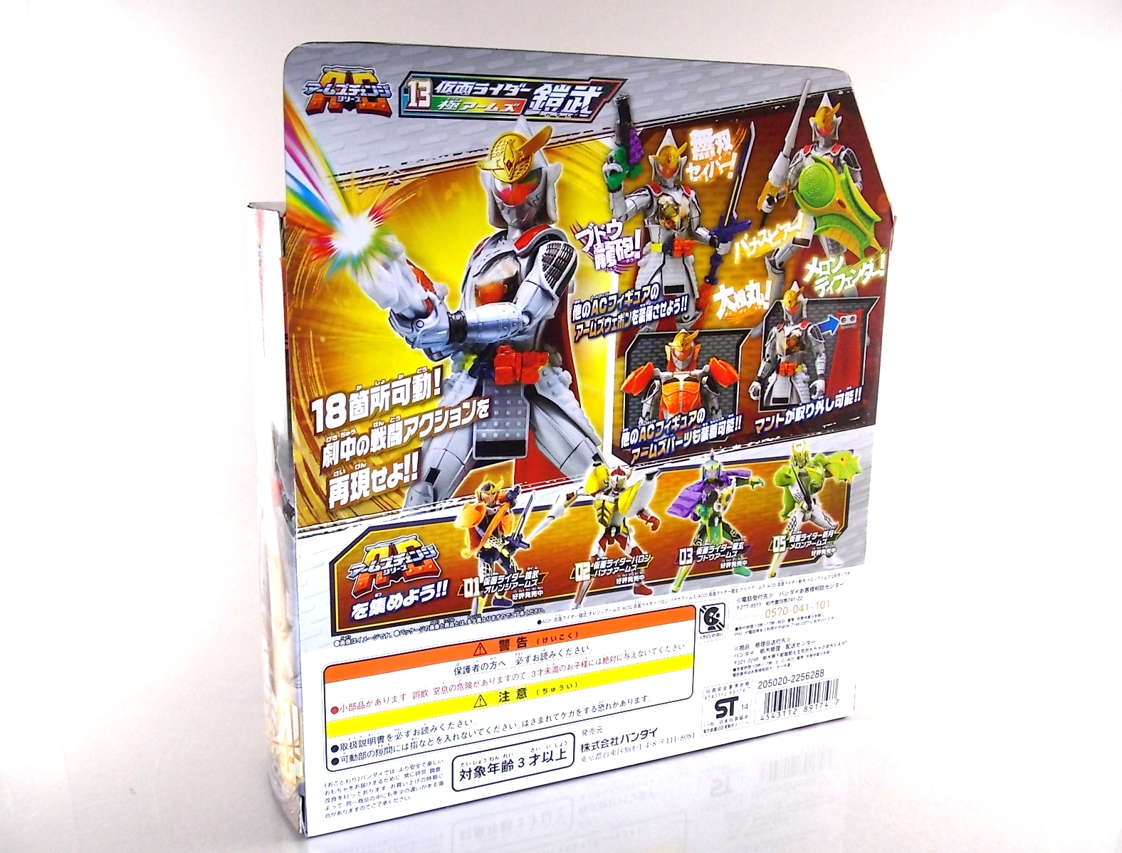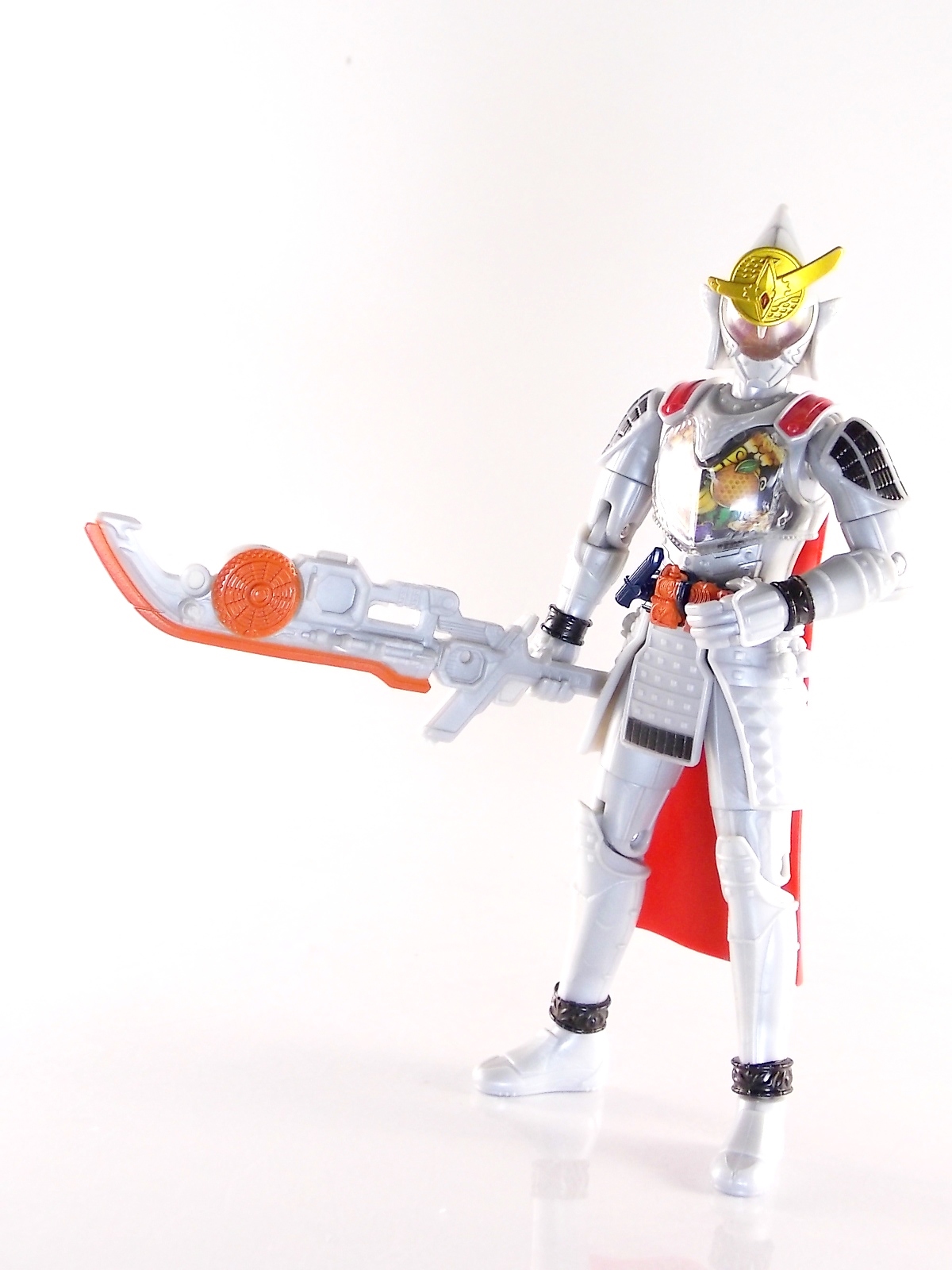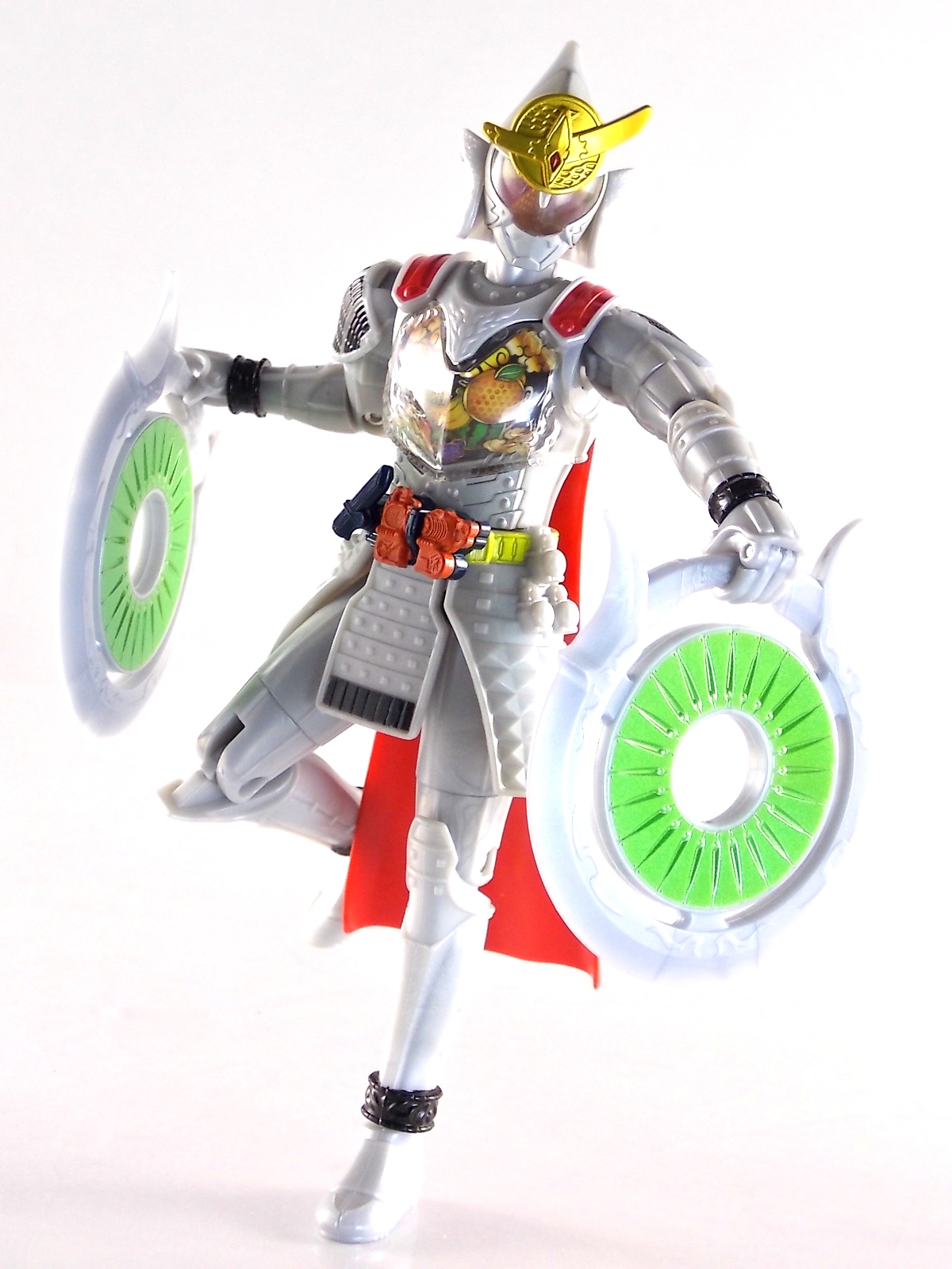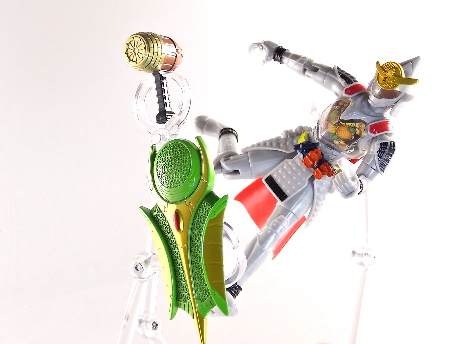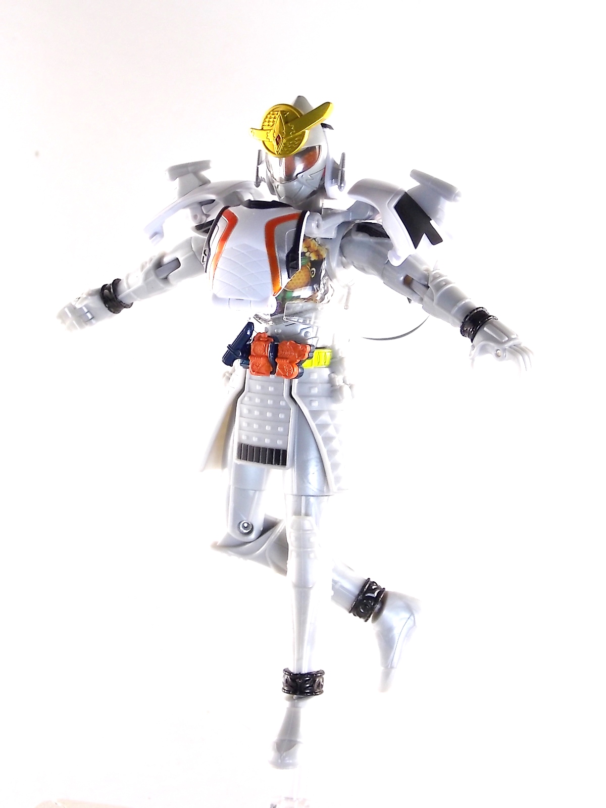 It's time for us take a look at the final retail release in Bandai Of Japan's magnificent Arms Change toy line! The mighty ultimate form of Gaim has finally been released, AC13 Kamen Rider Gaim Kiwami Arms! Below are over 50 images of this figure, but be sure to check out a video review on our front page by good friend baltmatrix! *Post #2 contains additional images! So let's lock on, or rather open, and dive into the review! Packaging AC13 is a unique release in this line. Rather than being a standard figure with a set of arms intended to used with it, you have a figure with a dummy set of arms meant to be "cast off" from it. So there isn't a nice tiny fruit to pack in here but rather a full set of additional armor molded in a single position. As such the packaging for Kiwami is about twice the width of standard AC boxes. Main Figure This form put a lot of fans off at first. The more muted color choices and deviation from Gaim's previous forms seemed to put people off. But thankfully seeing it in action in show really helped convey the level of badass this form represents. The figure really accomplishes this as well. When you take Kiwami Arms Gaim out of the box he's more or less all set to go in his basic form. Nothing needs to be attached or removed to represent this final combo. Looking at just this basic figure Bandai made sure to sculpt in plenty of detail since it's a primarily gray base body. Though according to the show it should be a more vibrant silvery/white. It shares minor elements with previous AC bodies but is mostly a creation all it's own. The chest emblem is actually really nicely done as well. It appears to be a single decal set into the chest with a clear shield over it. While not as shiny or awesome as the real thing, on a budget toy like this it gets the effect across just fine. The chest showcases Ichigo, Melon, Banana, Grape, Suika, & Orange. This version of Gaim also has a really nice rainbow colored visor inside his helmet. Of course this piece can be taken out of Kiwami and given to other AC figures as it fits the standard size of all their visor/faceplates. Removing it from Gaim let's you swap other AC arms onto him. But you'll also need to remove the neck/shoulder guard to expose the universal AC clips on the shoulders. Oh and the cape needs to be removed too. Yay for show accuracy from that one episode where he used it like a Matador! This allows you to put any Arms you choose onto Gaim. In the gallery below we've put every single Arms on him currently available. Aside from Blood Orange Arms & Durian Arms whose figures are in transit to me currently. As you can see this figure pulls of the look of most arms quite well. Much like Zangetsu & Shin Zangetsu, Kiwami Arms has a very basic color scheme making it compatible with almost anything. However due to the way the new chest is designed on Kiwami it sticks out a bit further than the other more flat AC figures. So the chest pieces for certain arms can't actually rest flat against his chest. Mango is the worst one for this issue followed closely by Lemon Energy. Either way the ability to use these Arms with Kiwami Arms helped bring this whole line and the gimmick full circle, even if this ability won't be demonstrated in the show. Accessories As mentioned before Kiwami Arms Gaim includes a very unique accessory. A full set of "dummy Kachidoki Arms! This is included of course to help replicate the "cast off" style transformation from Kachidoki to Kiwami Arms. In show Gaim uses the Kiwami Key to literally open the Kachidoki Lock on his belt. In doing so the armor shoots off and the suit changes color in the process. Now there's simply no way to have a toy version of that suit that's one color before a transformation and another color after. So the toy makes a compromise. The included Kachidoki armor, or rather "Crappydoki" as named by friend of the site Monkie Ranger, is cast in a translucent orange. This armor is pegged together via the back piece which has peg holes on the top and bottom to attach the torso and skirt armor to. Using this armor on Kiwami allows you to create a sort of mid transformation state just before the armor shoots off to create Kiwami Arms. And to help with that the armor is actually spring loaded. By turning a dial on the back of the Kachidoki you can shoot off the two forward sections. The back piece needs to be pulled off as it's physically connected to Kiwami Arms' cape. Again this armor is just a stand in piece to convey a gimmick. It's not meant to be a great Kachidoki Arms figure. If you want that then go by the real one like you're supposed to. The gimmick of this set of armor is literally to be a stand in for a set of magical CG armor about a second before it shoots off of a guy into the air and he goes into super badass mode. So I think it's hard to complain that this is a bad toy or a bad feature. If you don't like it you clearly aren't getting what it represents nor the primary point of the toy. If you want a proper Kachidoki Arms you should probably buy Kachidoki. This armor does exactly what it's supposed to here. And while it can be used on other Arms Change toys it isn't nearly as secure since it locks onto Kiwami via the cape peg and would have nowhere to do so on other figures. Also included with Kiwami Arms are both version of the DJ Gun! The standard DJ Gun form and the combined form created with the Musou Saber, Taiken Mode. Now both of these are cast in the wrong colors, predominantly white with some orange. The reasoning for this is that the figures main body and weapons are likely cast on the same runner at the factory. While they are a bit inaccurate both in color and size they work just fine. just like the ones included with Kachidoki Arms itself you get two versions. Though Taiken Mode here is literally one molded together combined piece rather than separate Gun & Musou Saber. Final Thoughts Kamen Rider Gaim's Arms Change line has been one of the most refreshin