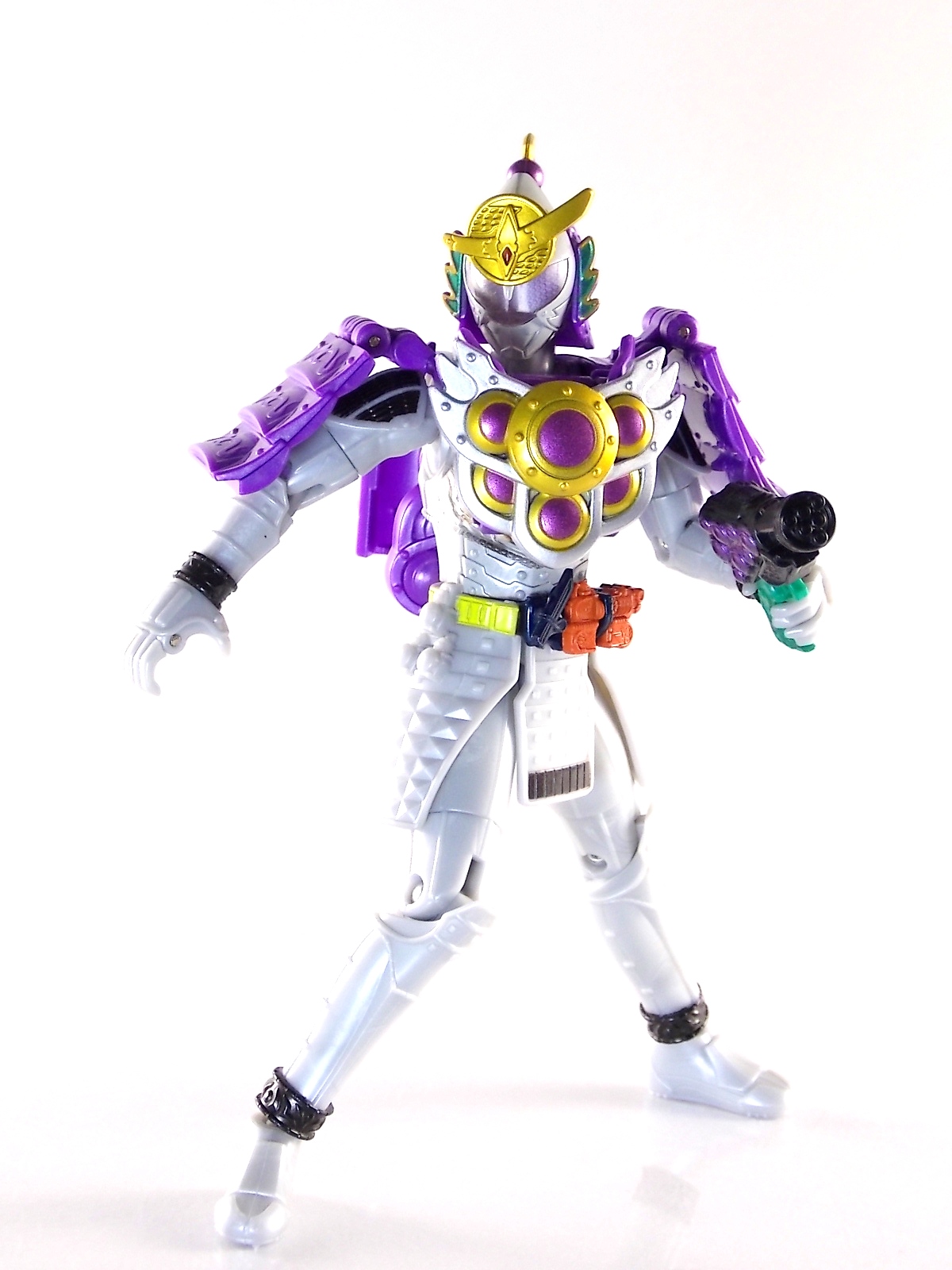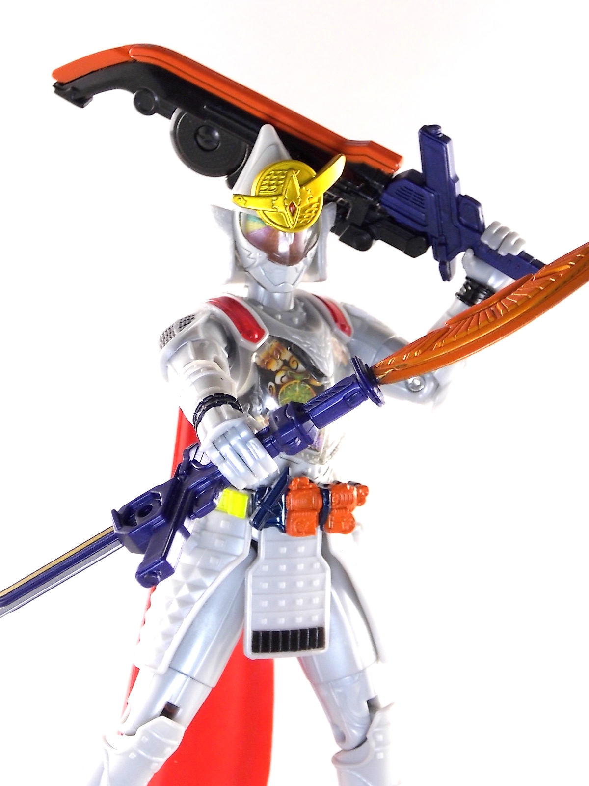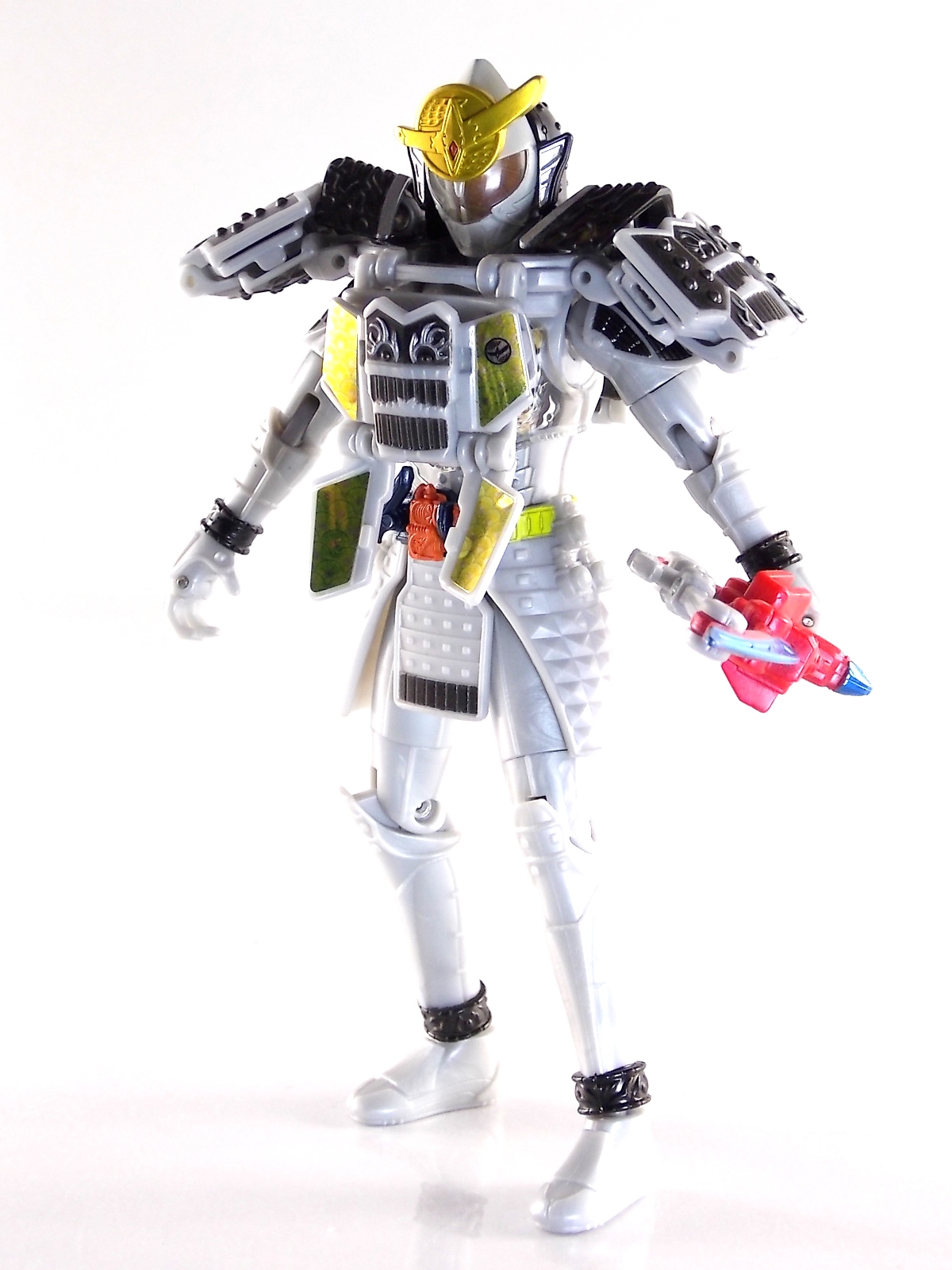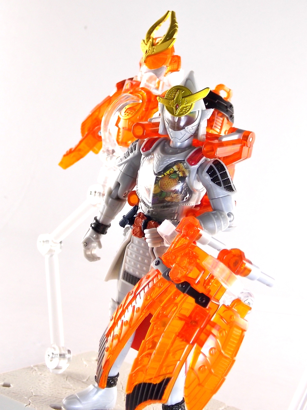 It's time for us take a look at the final retail release in Bandai Of Japan's magnificent Arms Change toy line! The mighty ultimate form of Gaim has finally been released, AC13 Kamen Rider Gaim Kiwami Arms! Below are over 50 images of this figure, but be sure to check out a video review on our front page by good friend baltmatrix! *Post #2 contains additional images! So let's lock on, or rather open, and dive into the review! Packaging AC13 is a unique release in this line. Rather than being a standard figure with a set of arms intended to used with it, you have a figure with a dummy set of arms meant to be "cast off" from it. So there isn't a nice tiny fruit to pack in here but rather a full set of additional armor molded in a single position. As such the packaging for Kiwami is about twice the width of standard AC boxes. Main Figure This form put a lot of fans off at first. The more muted color choices and deviation from Gaim's previous forms seemed to put people off. But thankfully seeing it in action in show really helped convey the level of badass this form represents. The figure really accomplishes this as well. When you take Kiwami Arms Gaim out of the box he's more or less all set to go in his basic form. Nothing needs to be attached or removed to represent this final combo. Looking at just this basic figure Bandai made sure to sculpt in plenty of detail since it's a primarily gray base body. Though according to the show it should be a more vibrant silvery/white. It shares minor elements with previous AC bodies but is mostly a creation all it's own. The chest emblem is actually really nicely done as well. It appears to be a single decal set into the chest with a clear shield over it. While not as shiny or awesome as the real thing, on a budget toy like this it gets the effect across just fine. The chest showcases Ichigo, Melon, Banana, Grape, Suika, & Orange. This version of Gaim also has a really nice rainbow colored visor inside his helmet. Of course this piece can be taken out of Kiwami and given to other AC figures as it fits the standard size of all their visor/faceplates. Removing it from Gaim let's you swap other AC arms onto him. But you'll also need to remove the neck/shoulder guard to expose the universal AC clips on the shoulders. Oh and the cape needs to be removed too. Yay for show accuracy from that one episode where he used it like a Matador! This allows you to put any Arms you choose onto Gaim. In the gallery below we've put every single Arms on him currently available. Aside from Blood Orange Arms & Durian Arms whose figures are in transit to me currently. As you can see this figure pulls of the look of most arms quite well. Much like Zangetsu & Shin Zangetsu, Kiwami Arms has a very basic color scheme making it compatible with almost anything. However due to the way the new chest is designed on Kiwami it sticks out a bit further than the other more flat AC figures. So the chest pieces for certain arms can't actually rest flat against his chest. Mango is the worst one for this issue followed closely by Lemon Energy. Either way the ability to use these Arms with Kiwami Arms helped bring this whole line and the gimmick full circle, even if this ability won't be demonstrated in the show. Accessories As mentioned before Kiwami Arms Gaim includes a very unique accessory. A full set of "dummy Kachidoki Arms! This is included of course to help replicate the "cast off" style transformation from Kachidoki to Kiwami Arms. In show Gaim uses the Kiwami Key to literally open the Kachidoki Lock on his belt. In doing so the armor shoots off and the suit changes color in the process. Now there's simply no way to have a toy version of that suit that's one color before a transformation and another color after. So the toy makes a compromise. The included Kachidoki armor, or rather "Crappydoki" as named by friend of the site Monkie Ranger, is cast in a translucent orange. This armor is pegged together via the back piece which has peg holes on the top and bottom to attach the torso and skirt armor to. Using this armor on Kiwami allows you to create a sort of mid transformation state just before the armor shoots off to create Kiwami Arms. And to help with that the armor is actually spring loaded. By turning a dial on the back of the Kachidoki you can shoot off the two forward sections. The back piece needs to be pulled off as it's physically connected to Kiwami Arms' cape. Again this armor is just a stand in piece to convey a gimmick. It's not meant to be a great Kachidoki Arms figure. If you want that then go by the real one like you're supposed to. The gimmick of this set of armor is literally to be a stand in for a set of magical CG armor about a second before it shoots off of a guy into the air and he goes into super badass mode. So I think it's hard to complain that this is a bad toy or a bad feature. If you don't like it you clearly aren't getting what it represents nor the primary point of the toy. If you want a proper Kachidoki Arms you should probably buy Kachidoki. This armor does exactly what it's supposed to here. And while it can be used on other Arms Change toys it isn't nearly as secure since it locks onto Kiwami via the cape peg and would have nowhere to do so on other figures. Also included with Kiwami Arms are both version of the DJ Gun! The standard DJ Gun form and the combined form created with the Musou Saber, Taiken Mode. Now both of these are cast in the wrong colors, predominantly white with some orange. The reasoning for this is that the figures main body and weapons are likely cast on the same runner at the factory. While they are a bit inaccurate both in color and size they work just fine. just like the ones included with Kachidoki Arms itself you get two versions. Though Taiken Mode here is literally one molded together combined piece rather than separate Gun & Musou Saber. Final Thoughts Kamen Rider Gaim's Arms Change line has been one of the most refreshin