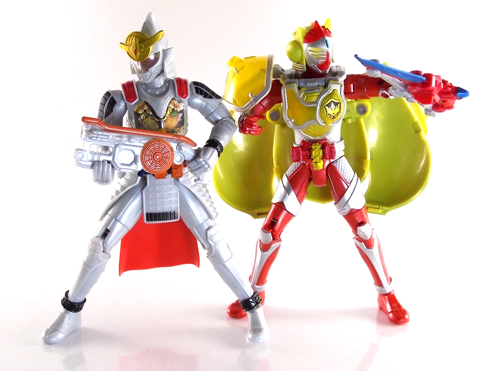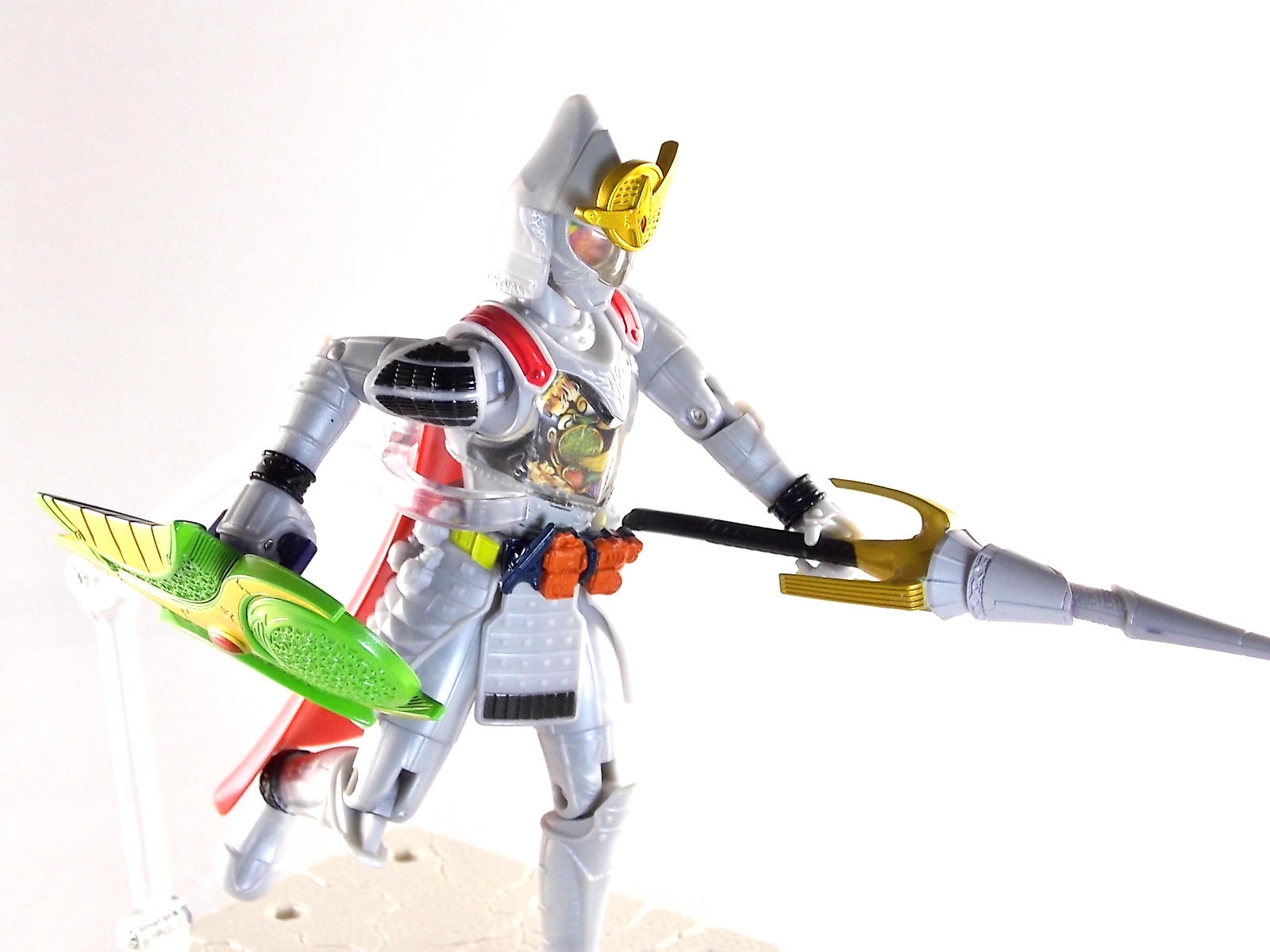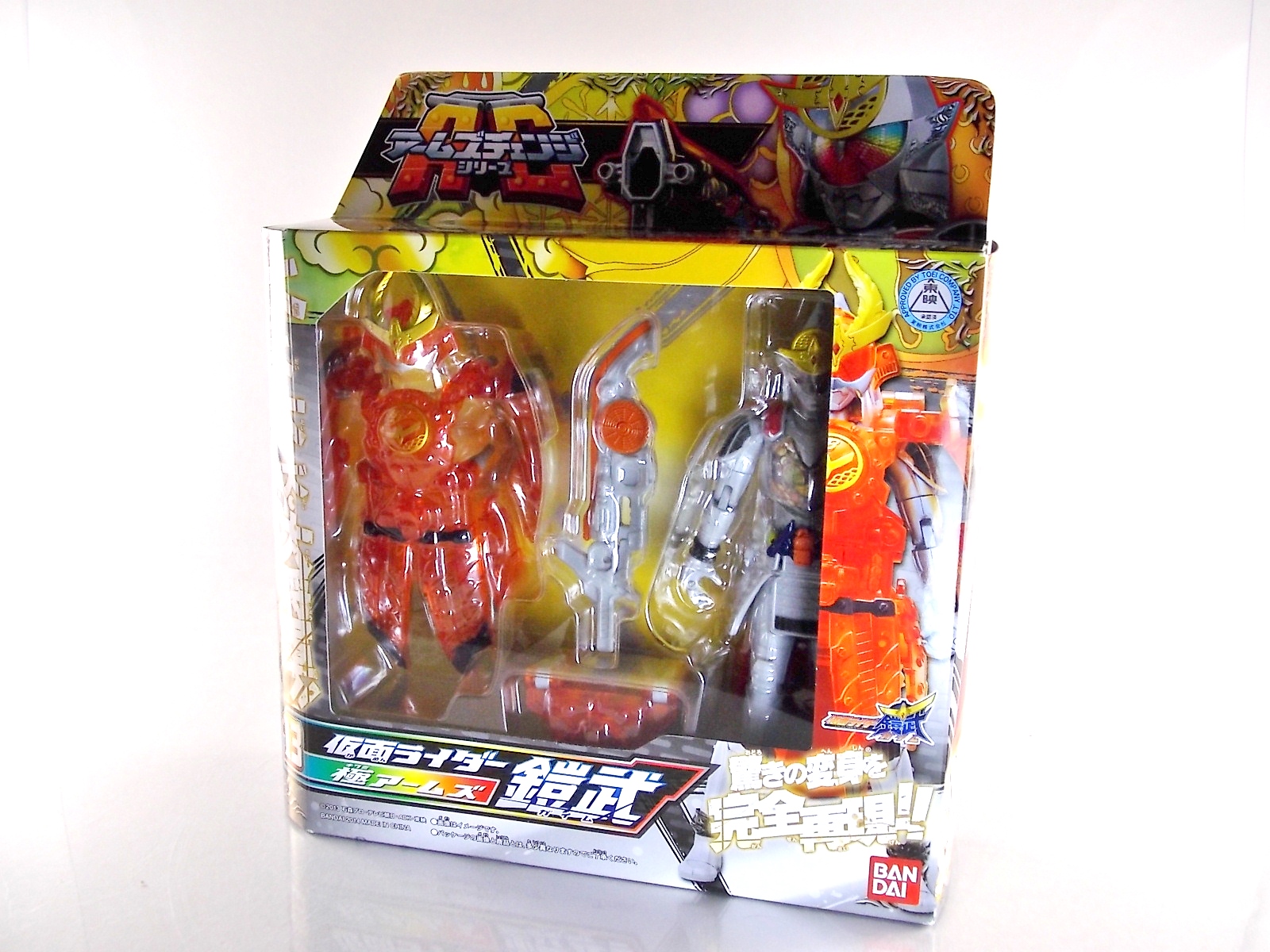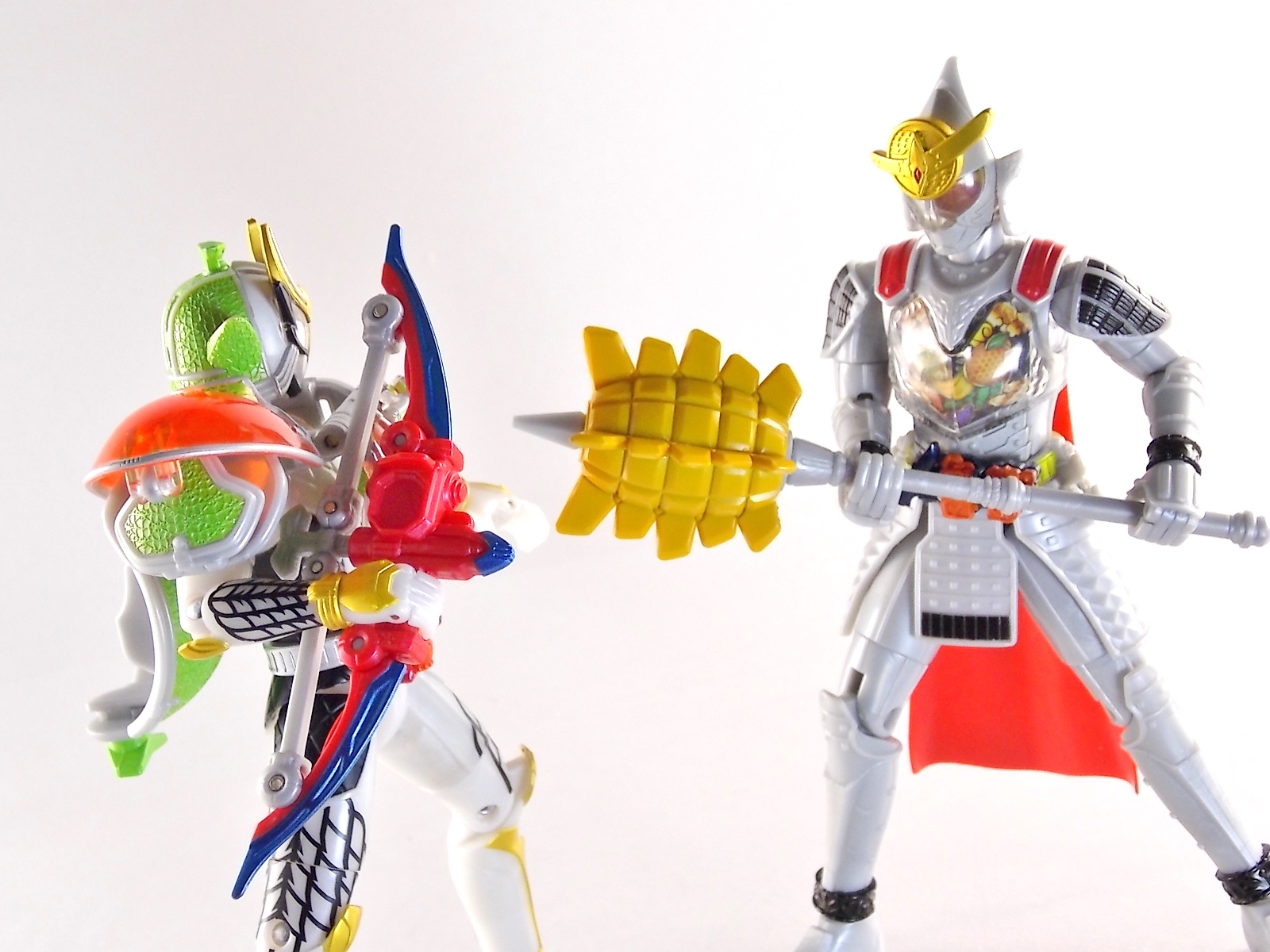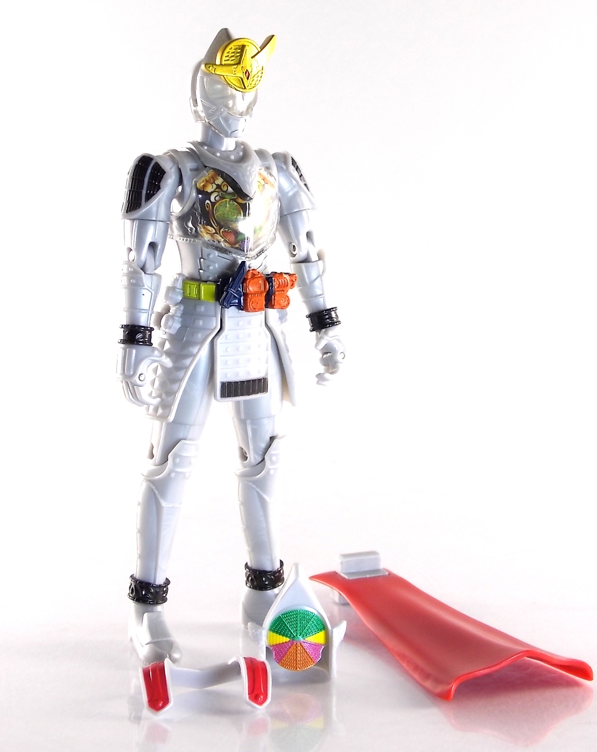 It's time for us take a look at the final retail release in Bandai Of Japan's magnificent Arms Change toy line! The mighty ultimate form of Gaim has finally been released, AC13 Kamen Rider Gaim Kiwami Arms! Below are over 50 images of this figure, but be sure to check out a video review on our front page by good friend baltmatrix! *Post #2 contains additional images! So let's lock on, or rather open, and dive into the review! Packaging AC13 is a unique release in this line. Rather than being a standard figure with a set of arms intended to used with it, you have a figure with a dummy set of arms meant to be "cast off" from it. So there isn't a nice tiny fruit to pack in here but rather a full set of additional armor molded in a single position. As such the packaging for Kiwami is about twice the width of standard AC boxes. Main Figure This form put a lot of fans off at first. The more muted color choices and deviation from Gaim's previous forms seemed to put people off. But thankfully seeing it in action in show really helped convey the level of badass this form represents. The figure really accomplishes this as well. When you take Kiwami Arms Gaim out of the box he's more or less all set to go in his basic form. Nothing needs to be attached or removed to represent this final combo. Looking at just this basic figure Bandai made sure to sculpt in plenty of detail since it's a primarily gray base body. Though according to the show it should be a more vibrant silvery/white. It shares minor elements with previous AC bodies but is mostly a creation all it's own. The chest emblem is actually really nicely done as well. It appears to be a single decal set into the chest with a clear shield over it. While not as shiny or awesome as the real thing, on a budget toy like this it gets the effect across just fine. The chest showcases Ichigo, Melon, Banana, Grape, Suika, & Orange. This version of Gaim also has a really nice rainbow colored visor inside his helmet. Of course this piece can be taken out of Kiwami and given to other AC figures as it fits the standard size of all their visor/faceplates. Removing it from Gaim let's you swap other AC arms onto him. But you'll also need to remove the neck/shoulder guard to expose the universal AC clips on the shoulders. Oh and the cape needs to be removed too. Yay for show accuracy from that one episode where he used it like a Matador! This allows you to put any Arms you choose onto Gaim. In the gallery below we've put every single Arms on him currently available. Aside from Blood Orange Arms & Durian Arms whose figures are in transit to me currently. As you can see this figure pulls of the look of most arms quite well. Much like Zangetsu & Shin Zangetsu, Kiwami Arms has a very basic color scheme making it compatible with almost anything. However due to the way the new chest is designed on Kiwami it sticks out a bit further than the other more flat AC figures. So the chest pieces for certain arms can't actually rest flat against his chest. Mango is the worst one for this issue followed closely by Lemon Energy. Either way the ability to use these Arms with Kiwami Arms helped bring this whole line and the gimmick full circle, even if this ability won't be demonstrated in the show. Accessories As mentioned before Kiwami Arms Gaim includes a very unique accessory. A full set of "dummy Kachidoki Arms! This is included of course to help replicate the "cast off" style transformation from Kachidoki to Kiwami Arms. In show Gaim uses the Kiwami Key to literally open the Kachidoki Lock on his belt. In doing so the armor shoots off and the suit changes color in the process. Now there's simply no way to have a toy version of that suit that's one color before a transformation and another color after. So the toy makes a compromise. The included Kachidoki armor, or rather "Crappydoki" as named by friend of the site Monkie Ranger, is cast in a translucent orange. This armor is pegged together via the back piece which has peg holes on the top and bottom to attach the torso and skirt armor to. Using this armor on Kiwami allows you to create a sort of mid transformation state just before the armor shoots off to create Kiwami Arms. And to help with that the armor is actually spring loaded. By turning a dial on the back of the Kachidoki you can shoot off the two forward sections. The back piece needs to be pulled off as it's physically connected to Kiwami Arms' cape. Again this armor is just a stand in piece to convey a gimmick. It's not meant to be a great Kachidoki Arms figure. If you want that then go by the real one like you're supposed to. The gimmick of this set of armor is literally to be a stand in for a set of magical CG armor about a second before it shoots off of a guy into the air and he goes into super badass mode. So I think it's hard to complain that this is a bad toy or a bad feature. If you don't like it you clearly aren't getting what it represents nor the primary point of the toy. If you want a proper Kachidoki Arms you should probably buy Kachidoki. This armor does exactly what it's supposed to here. And while it can be used on other Arms Change toys it isn't nearly as secure since it locks onto Kiwami via the cape peg and would have nowhere to do so on other figures. Also included with Kiwami Arms are both version of the DJ Gun! The standard DJ Gun form and the combined form created with the Musou Saber, Taiken Mode. Now both of these are cast in the wrong colors, predominantly white with some orange. The reasoning for this is that the figures main body and weapons are likely cast on the same runner at the factory. While they are a bit inaccurate both in color and size they work just fine. just like the ones included with Kachidoki Arms itself you get two versions. Though Taiken Mode here is literally one molded together combined piece rather than separate Gun & Musou Saber. Final Thoughts Kamen Rider Gaim's Arms Change line has been one of the most refreshin
