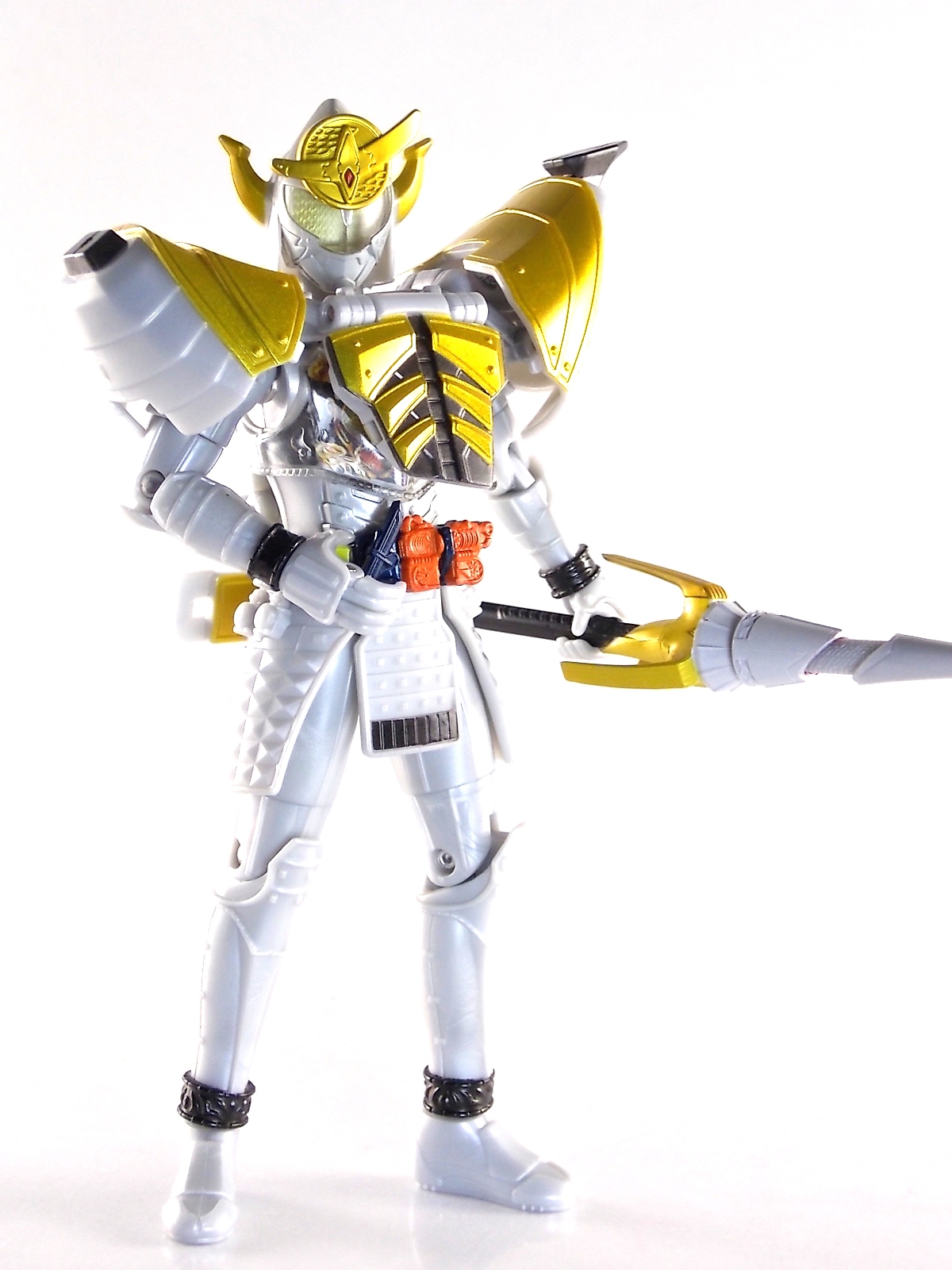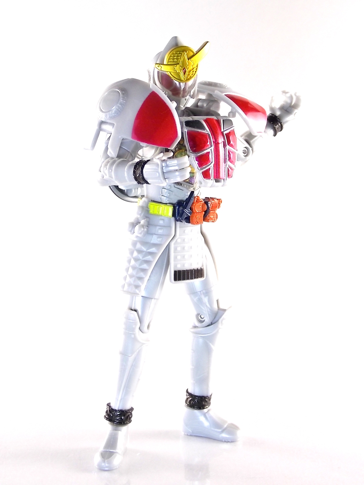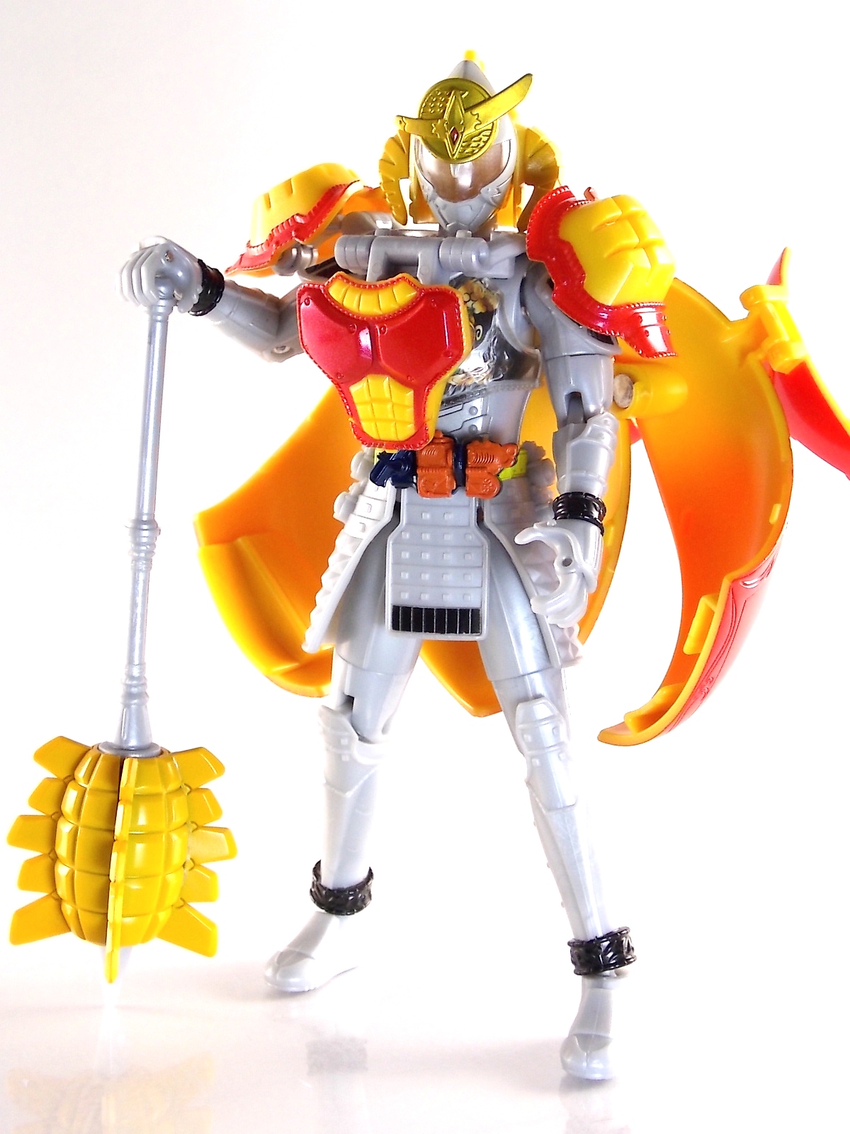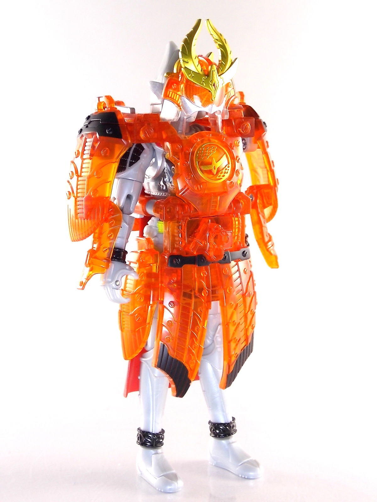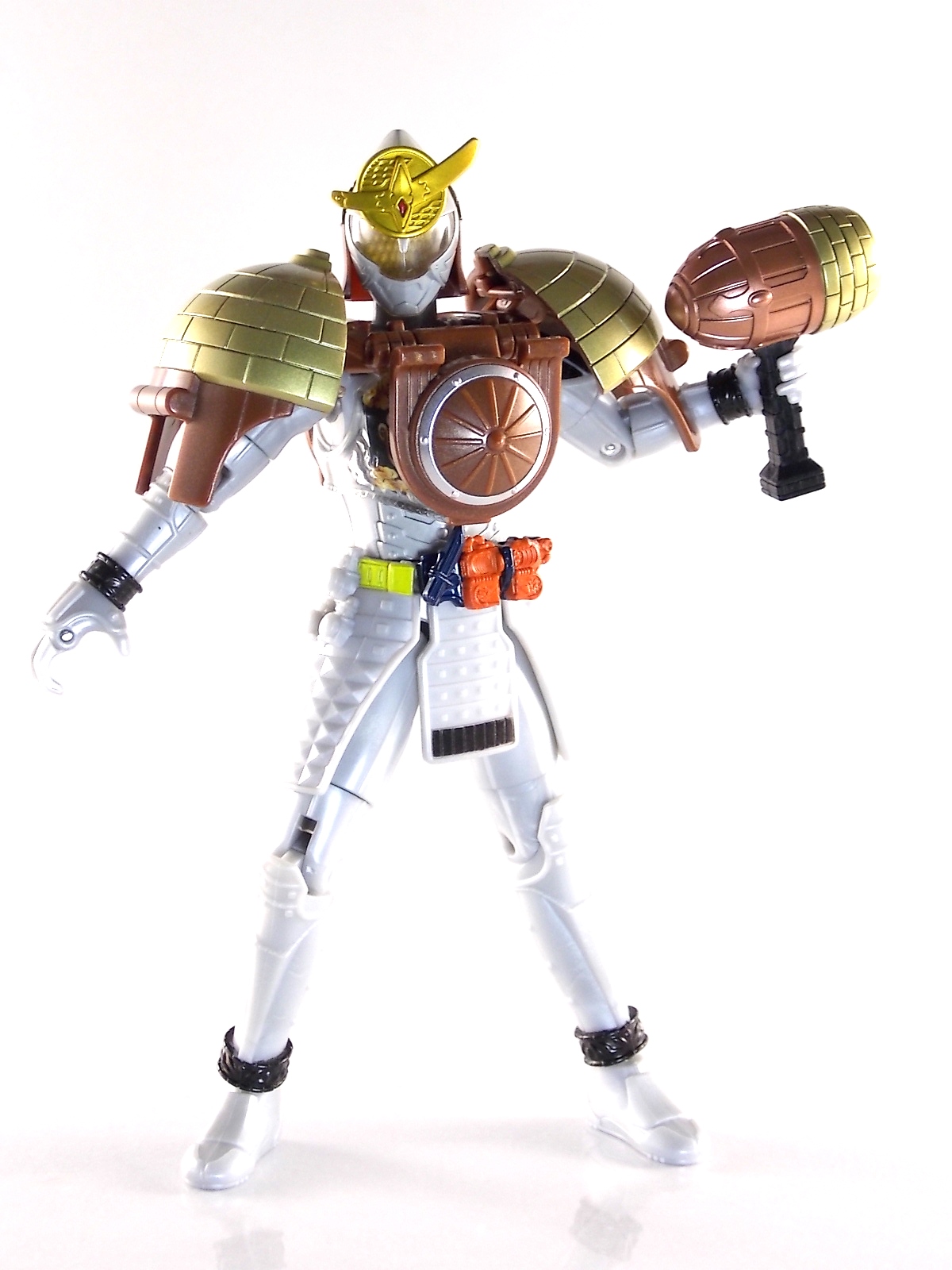 It's time for us take a look at the final retail release in Bandai Of Japan's magnificent Arms Change toy line! The mighty ultimate form of Gaim has finally been released, AC13 Kamen Rider Gaim Kiwami Arms! Below are over 50 images of this figure, but be sure to check out a video review on our front page by good friend baltmatrix! *Post #2 contains additional images! So let's lock on, or rather open, and dive into the review! Packaging AC13 is a unique release in this line. Rather than being a standard figure with a set of arms intended to used with it, you have a figure with a dummy set of arms meant to be "cast off" from it. So there isn't a nice tiny fruit to pack in here but rather a full set of additional armor molded in a single position. As such the packaging for Kiwami is about twice the width of standard AC boxes. Main Figure This form put a lot of fans off at first. The more muted color choices and deviation from Gaim's previous forms seemed to put people off. But thankfully seeing it in action in show really helped convey the level of badass this form represents. The figure really accomplishes this as well. When you take Kiwami Arms Gaim out of the box he's more or less all set to go in his basic form. Nothing needs to be attached or removed to represent this final combo. Looking at just this basic figure Bandai made sure to sculpt in plenty of detail since it's a primarily gray base body. Though according to the show it should be a more vibrant silvery/white. It shares minor elements with previous AC bodies but is mostly a creation all it's own. The chest emblem is actually really nicely done as well. It appears to be a single decal set into the chest with a clear shield over it. While not as shiny or awesome as the real thing, on a budget toy like this it gets the effect across just fine. The chest showcases Ichigo, Melon, Banana, Grape, Suika, & Orange. This version of Gaim also has a really nice rainbow colored visor inside his helmet. Of course this piece can be taken out of Kiwami and given to other AC figures as it fits the standard size of all their visor/faceplates. Removing it from Gaim let's you swap other AC arms onto him. But you'll also need to remove the neck/shoulder guard to expose the universal AC clips on the shoulders. Oh and the cape needs to be removed too. Yay for show accuracy from that one episode where he used it like a Matador! This allows you to put any Arms you choose onto Gaim. In the gallery below we've put every single Arms on him currently available. Aside from Blood Orange Arms & Durian Arms whose figures are in transit to me currently. As you can see this figure pulls of the look of most arms quite well. Much like Zangetsu & Shin Zangetsu, Kiwami Arms has a very basic color scheme making it compatible with almost anything. However due to the way the new chest is designed on Kiwami it sticks out a bit further than the other more flat AC figures. So the chest pieces for certain arms can't actually rest flat against his chest. Mango is the worst one for this issue followed closely by Lemon Energy. Either way the ability to use these Arms with Kiwami Arms helped bring this whole line and the gimmick full circle, even if this ability won't be demonstrated in the show. Accessories As mentioned before Kiwami Arms Gaim includes a very unique accessory. A full set of "dummy Kachidoki Arms! This is included of course to help replicate the "cast off" style transformation from Kachidoki to Kiwami Arms. In show Gaim uses the Kiwami Key to literally open the Kachidoki Lock on his belt. In doing so the armor shoots off and the suit changes color in the process. Now there's simply no way to have a toy version of that suit that's one color before a transformation and another color after. So the toy makes a compromise. The included Kachidoki armor, or rather "Crappydoki" as named by friend of the site Monkie Ranger, is cast in a translucent orange. This armor is pegged together via the back piece which has peg holes on the top and bottom to attach the torso and skirt armor to. Using this armor on Kiwami allows you to create a sort of mid transformation state just before the armor shoots off to create Kiwami Arms. And to help with that the armor is actually spring loaded. By turning a dial on the back of the Kachidoki you can shoot off the two forward sections. The back piece needs to be pulled off as it's physically connected to Kiwami Arms' cape. Again this armor is just a stand in piece to convey a gimmick. It's not meant to be a great Kachidoki Arms figure. If you want that then go by the real one like you're supposed to. The gimmick of this set of armor is literally to be a stand in for a set of magical CG armor about a second before it shoots off of a guy into the air and he goes into super badass mode. So I think it's hard to complain that this is a bad toy or a bad feature. If you don't like it you clearly aren't getting what it represents nor the primary point of the toy. If you want a proper Kachidoki Arms you should probably buy Kachidoki. This armor does exactly what it's supposed to here. And while it can be used on other Arms Change toys it isn't nearly as secure since it locks onto Kiwami via the cape peg and would have nowhere to do so on other figures. Also included with Kiwami Arms are both version of the DJ Gun! The standard DJ Gun form and the combined form created with the Musou Saber, Taiken Mode. Now both of these are cast in the wrong colors, predominantly white with some orange. The reasoning for this is that the figures main body and weapons are likely cast on the same runner at the factory. While they are a bit inaccurate both in color and size they work just fine. just like the ones included with Kachidoki Arms itself you get two versions. Though Taiken Mode here is literally one molded together combined piece rather than separate Gun & Musou Saber. Final Thoughts Kamen Rider Gaim's Arms Change line has been one of the most refreshin