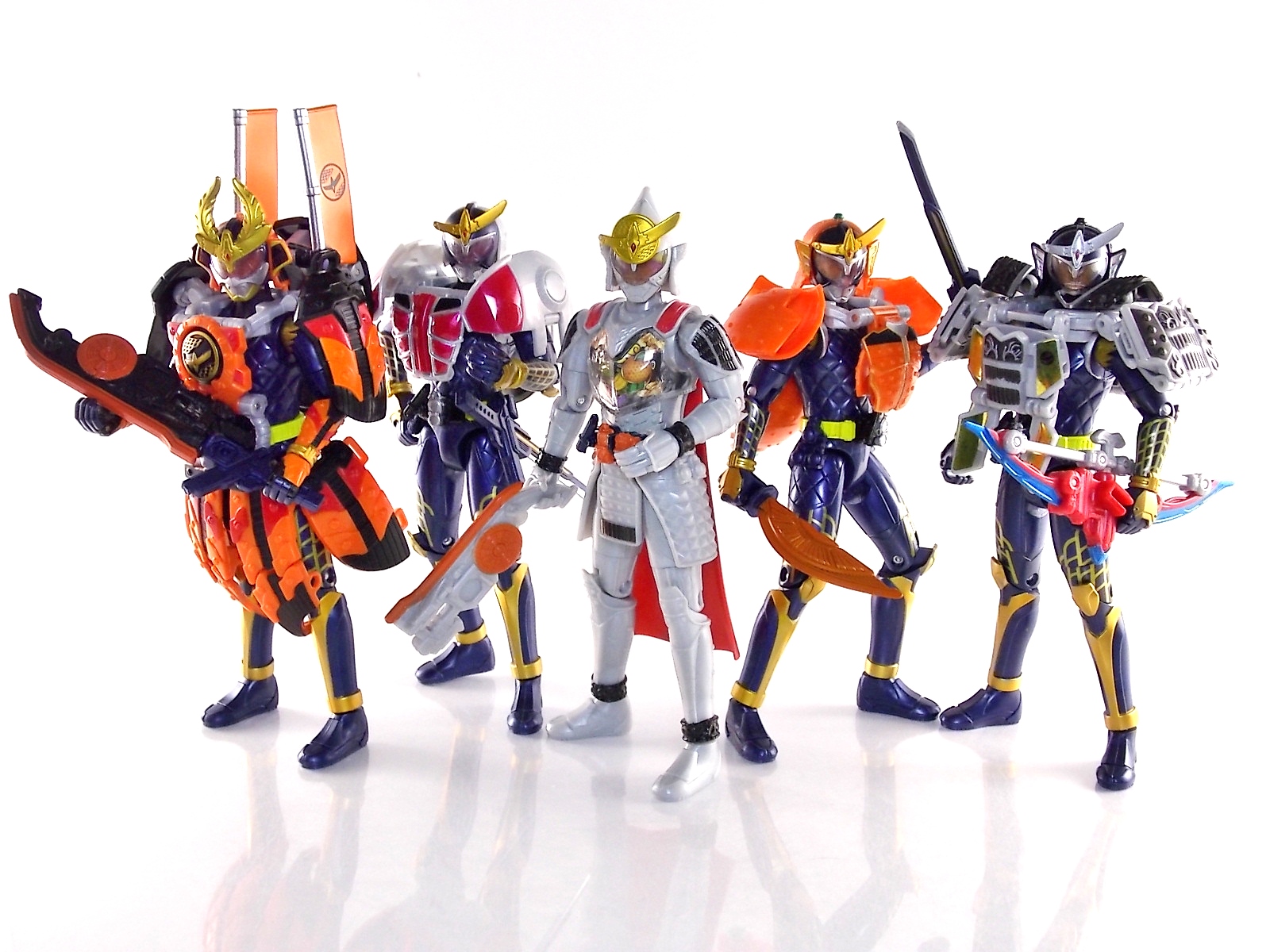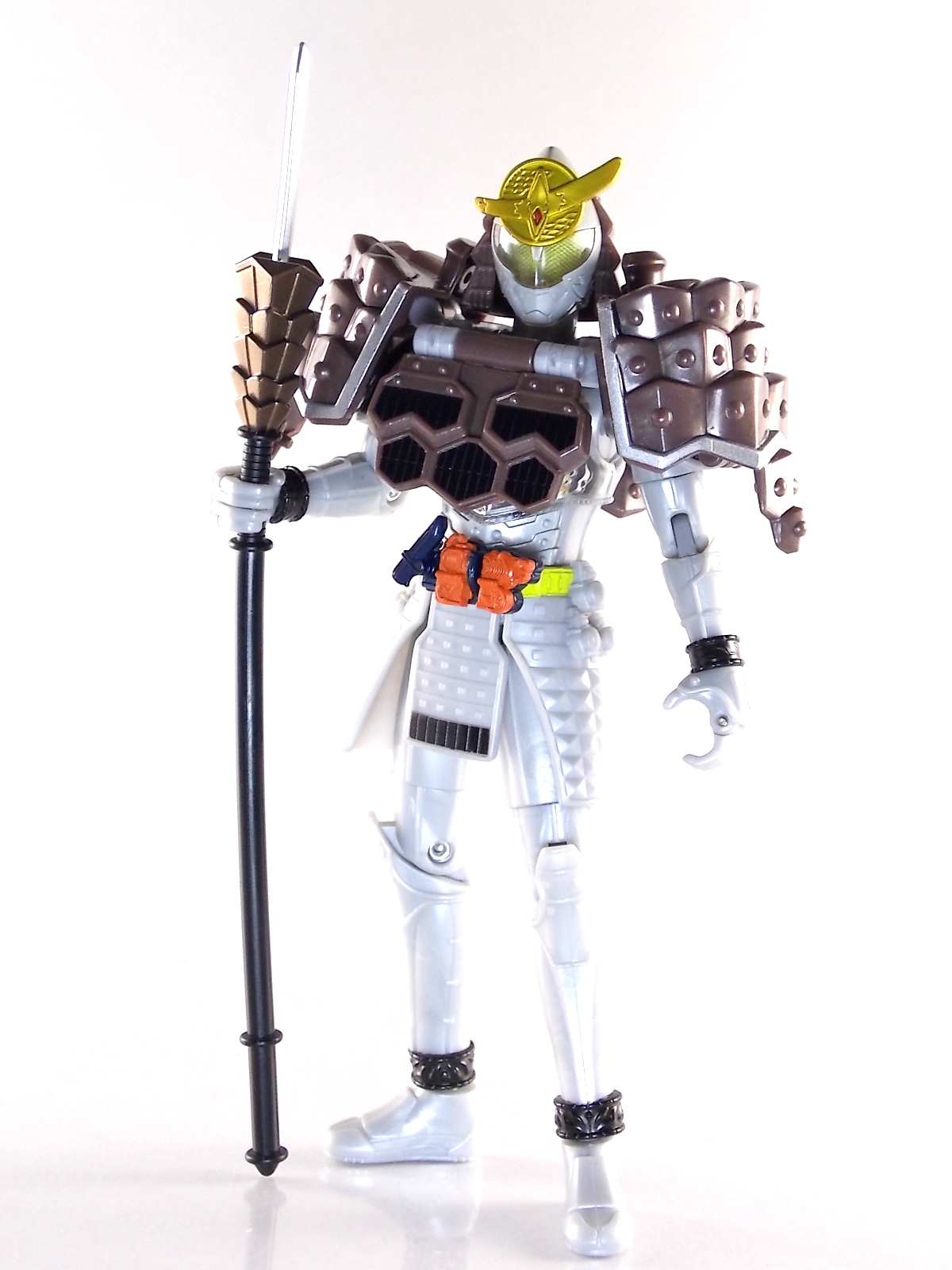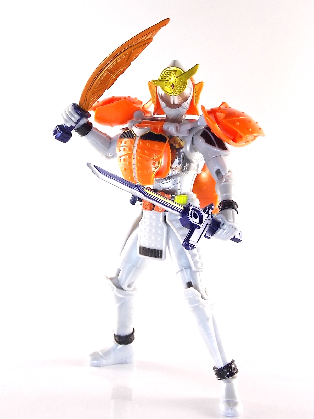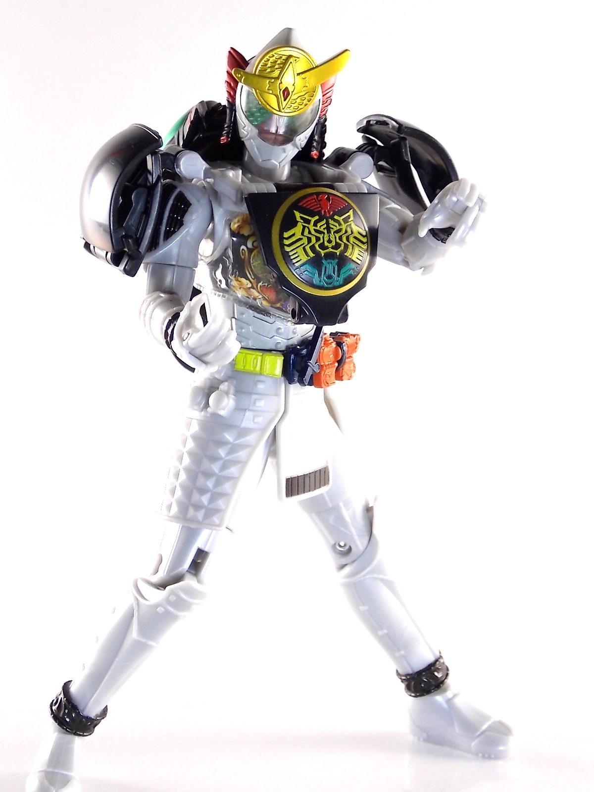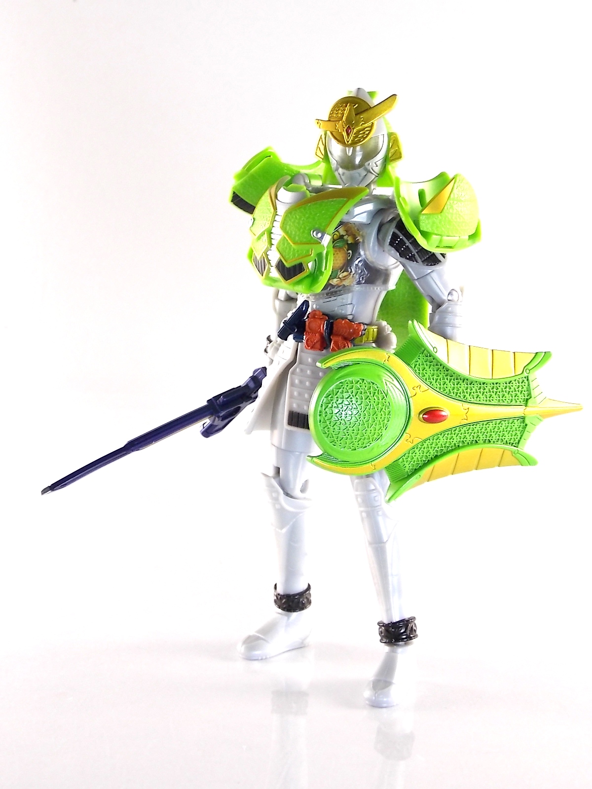 It's time for us take a look at the final retail release in Bandai Of Japan's magnificent Arms Change toy line! The mighty ultimate form of Gaim has finally been released, AC13 Kamen Rider Gaim Kiwami Arms! Below are over 50 images of this figure, but be sure to check out a video review on our front page by good friend baltmatrix! *Post #2 contains additional images! So let's lock on, or rather open, and dive into the review! Packaging AC13 is a unique release in this line. Rather than being a standard figure with a set of arms intended to used with it, you have a figure with a dummy set of arms meant to be "cast off" from it. So there isn't a nice tiny fruit to pack in here but rather a full set of additional armor molded in a single position. As such the packaging for Kiwami is about twice the width of standard AC boxes. Main Figure This form put a lot of fans off at first. The more muted color choices and deviation from Gaim's previous forms seemed to put people off. But thankfully seeing it in action in show really helped convey the level of badass this form represents. The figure really accomplishes this as well. When you take Kiwami Arms Gaim out of the box he's more or less all set to go in his basic form. Nothing needs to be attached or removed to represent this final combo. Looking at just this basic figure Bandai made sure to sculpt in plenty of detail since it's a primarily gray base body. Though according to the show it should be a more vibrant silvery/white. It shares minor elements with previous AC bodies but is mostly a creation all it's own. The chest emblem is actually really nicely done as well. It appears to be a single decal set into the chest with a clear shield over it. While not as shiny or awesome as the real thing, on a budget toy like this it gets the effect across just fine. The chest showcases Ichigo, Melon, Banana, Grape, Suika, & Orange. This version of Gaim also has a really nice rainbow colored visor inside his helmet. Of course this piece can be taken out of Kiwami and given to other AC figures as it fits the standard size of all their visor/faceplates. Removing it from Gaim let's you swap other AC arms onto him. But you'll also need to remove the neck/shoulder guard to expose the universal AC clips on the shoulders. Oh and the cape needs to be removed too. Yay for show accuracy from that one episode where he used it like a Matador! This allows you to put any Arms you choose onto Gaim. In the gallery below we've put every single Arms on him currently available. Aside from Blood Orange Arms & Durian Arms whose figures are in transit to me currently. As you can see this figure pulls of the look of most arms quite well. Much like Zangetsu & Shin Zangetsu, Kiwami Arms has a very basic color scheme making it compatible with almost anything. However due to the way the new chest is designed on Kiwami it sticks out a bit further than the other more flat AC figures. So the chest pieces for certain arms can't actually rest flat against his chest. Mango is the worst one for this issue followed closely by Lemon Energy. Either way the ability to use these Arms with Kiwami Arms helped bring this whole line and the gimmick full circle, even if this ability won't be demonstrated in the show. Accessories As mentioned before Kiwami Arms Gaim includes a very unique accessory. A full set of "dummy Kachidoki Arms! This is included of course to help replicate the "cast off" style transformation from Kachidoki to Kiwami Arms. In show Gaim uses the Kiwami Key to literally open the Kachidoki Lock on his belt. In doing so the armor shoots off and the suit changes color in the process. Now there's simply no way to have a toy version of that suit that's one color before a transformation and another color after. So the toy makes a compromise. The included Kachidoki armor, or rather "Crappydoki" as named by friend of the site Monkie Ranger, is cast in a translucent orange. This armor is pegged together via the back piece which has peg holes on the top and bottom to attach the torso and skirt armor to. Using this armor on Kiwami allows you to create a sort of mid transformation state just before the armor shoots off to create Kiwami Arms. And to help with that the armor is actually spring loaded. By turning a dial on the back of the Kachidoki you can shoot off the two forward sections. The back piece needs to be pulled off as it's physically connected to Kiwami Arms' cape. Again this armor is just a stand in piece to convey a gimmick. It's not meant to be a great Kachidoki Arms figure. If you want that then go by the real one like you're supposed to. The gimmick of this set of armor is literally to be a stand in for a set of magical CG armor about a second before it shoots off of a guy into the air and he goes into super badass mode. So I think it's hard to complain that this is a bad toy or a bad feature. If you don't like it you clearly aren't getting what it represents nor the primary point of the toy. If you want a proper Kachidoki Arms you should probably buy Kachidoki. This armor does exactly what it's supposed to here. And while it can be used on other Arms Change toys it isn't nearly as secure since it locks onto Kiwami via the cape peg and would have nowhere to do so on other figures. Also included with Kiwami Arms are both version of the DJ Gun! The standard DJ Gun form and the combined form created with the Musou Saber, Taiken Mode. Now both of these are cast in the wrong colors, predominantly white with some orange. The reasoning for this is that the figures main body and weapons are likely cast on the same runner at the factory. While they are a bit inaccurate both in color and size they work just fine. just like the ones included with Kachidoki Arms itself you get two versions. Though Taiken Mode here is literally one molded together combined piece rather than separate Gun & Musou Saber. Final Thoughts Kamen Rider Gaim's Arms Change line has been one of the most refreshin