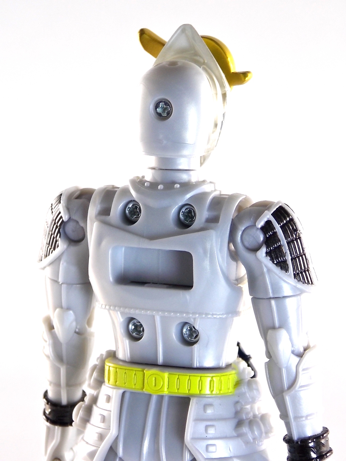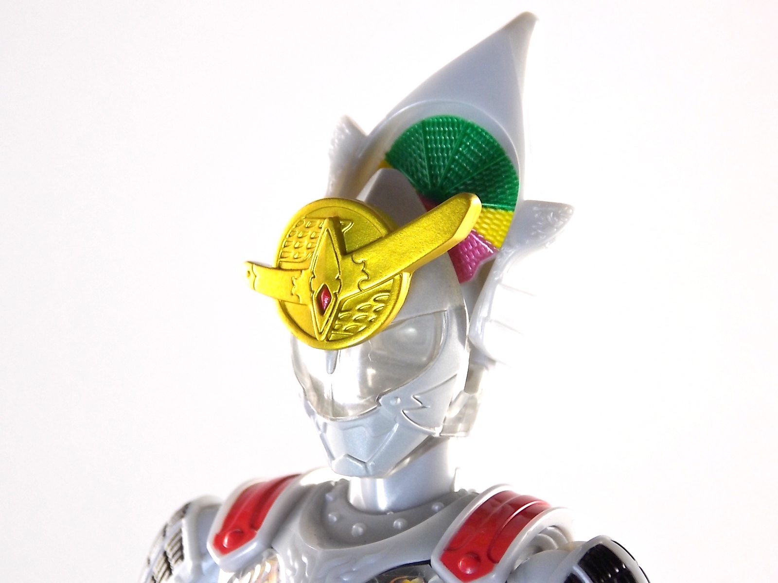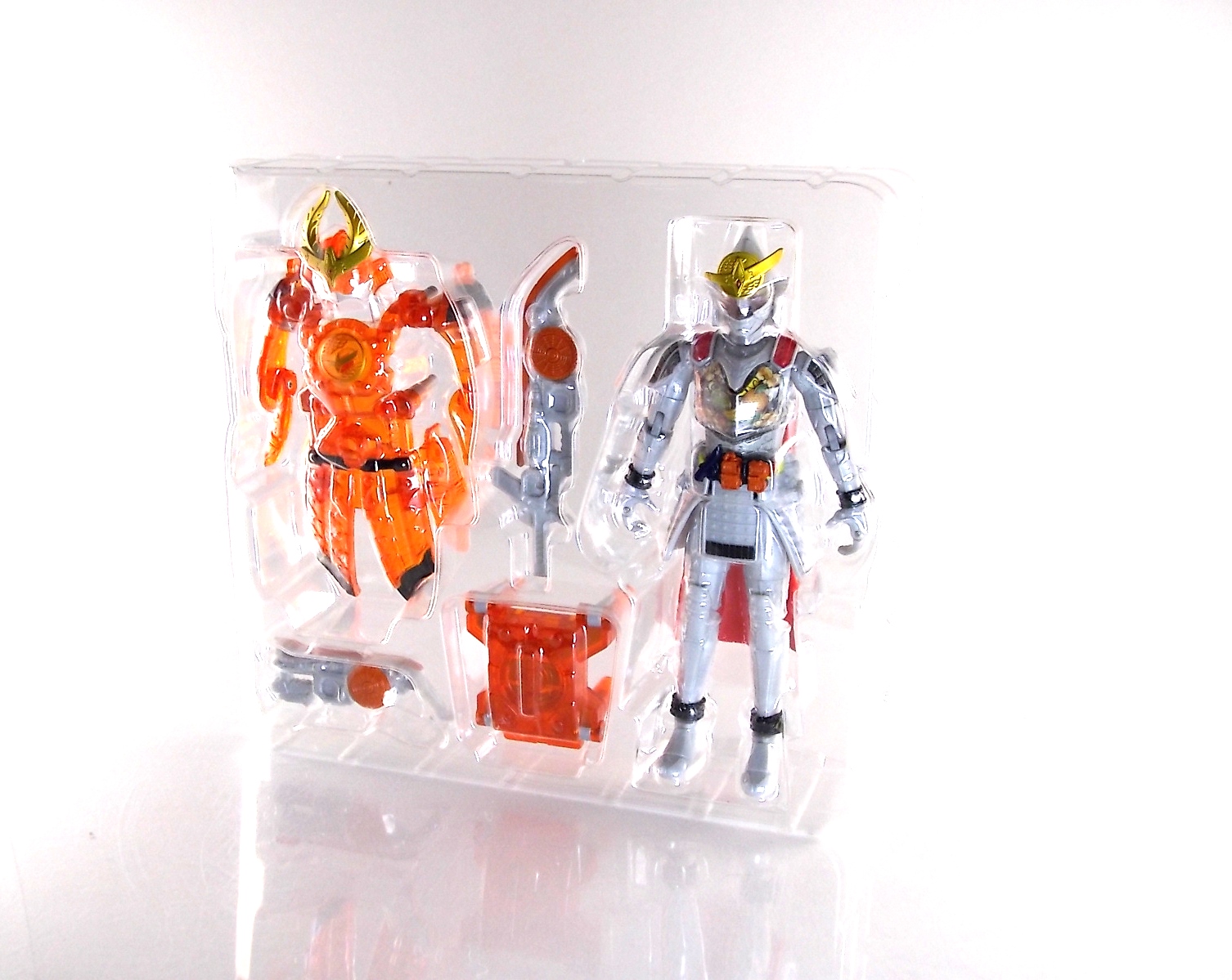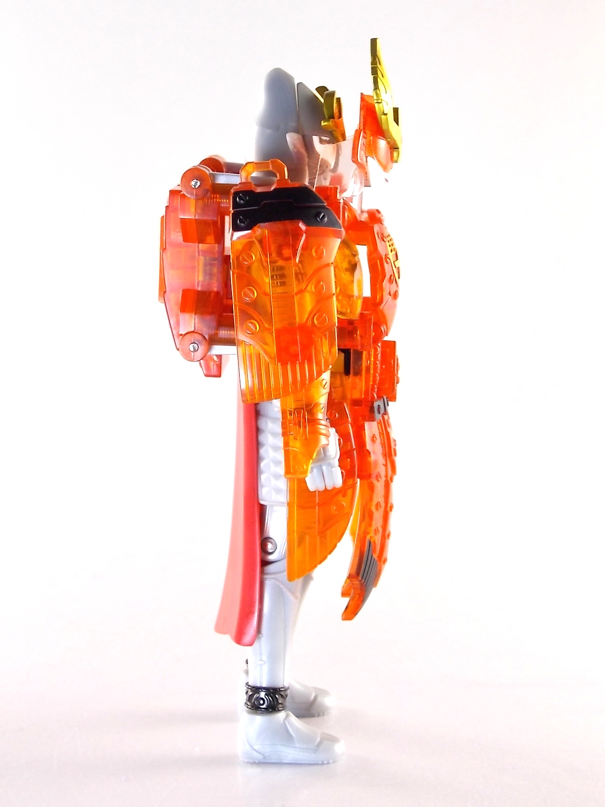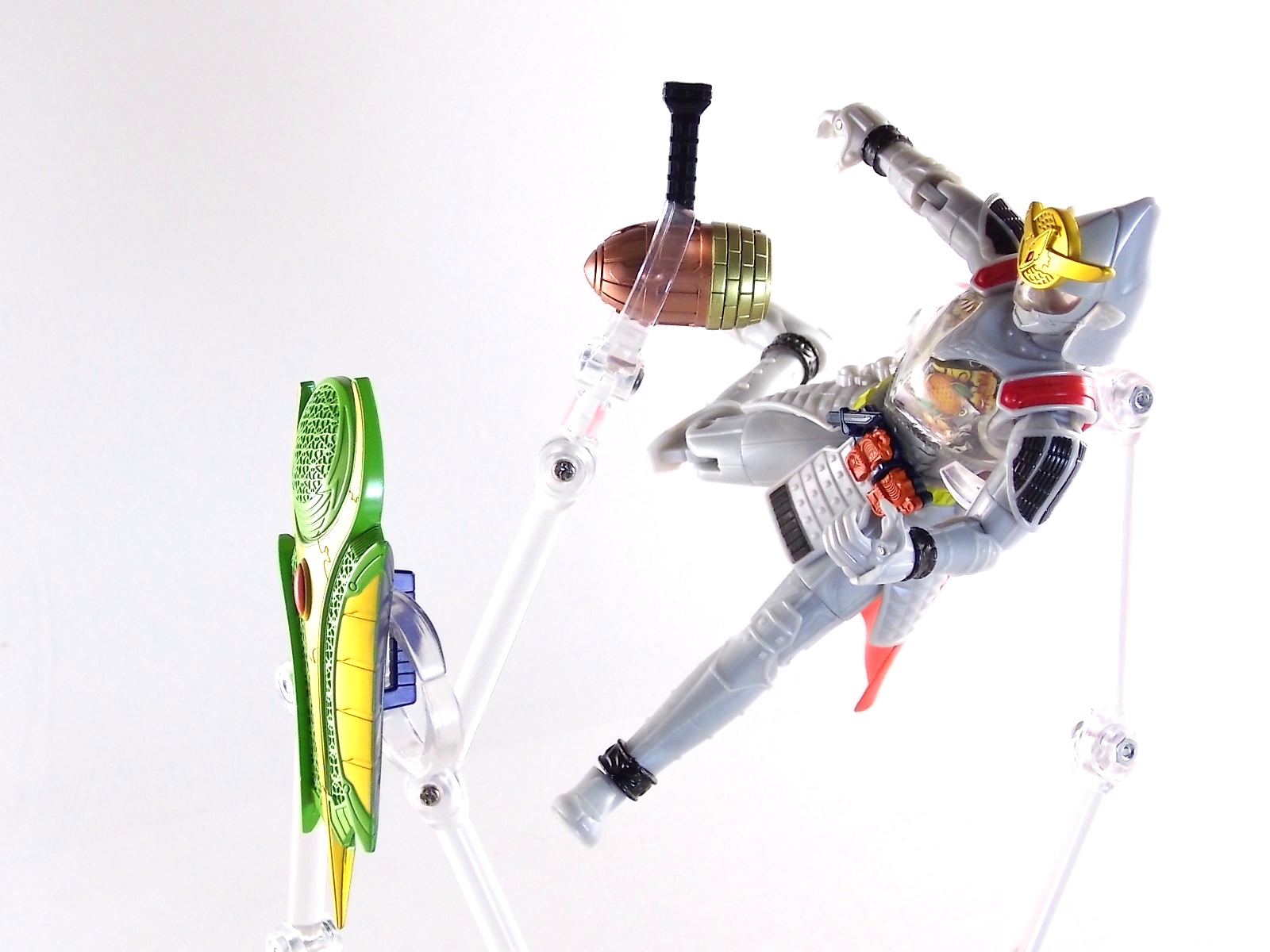 It's time for us take a look at the final retail release in Bandai Of Japan's magnificent Arms Change toy line! The mighty ultimate form of Gaim has finally been released, AC13 Kamen Rider Gaim Kiwami Arms! Below are over 50 images of this figure, but be sure to check out a video review on our front page by good friend baltmatrix! *Post #2 contains additional images! So let's lock on, or rather open, and dive into the review! Packaging AC13 is a unique release in this line. Rather than being a standard figure with a set of arms intended to used with it, you have a figure with a dummy set of arms meant to be "cast off" from it. So there isn't a nice tiny fruit to pack in here but rather a full set of additional armor molded in a single position. As such the packaging for Kiwami is about twice the width of standard AC boxes. Main Figure This form put a lot of fans off at first. The more muted color choices and deviation from Gaim's previous forms seemed to put people off. But thankfully seeing it in action in show really helped convey the level of badass this form represents. The figure really accomplishes this as well. When you take Kiwami Arms Gaim out of the box he's more or less all set to go in his basic form. Nothing needs to be attached or removed to represent this final combo. Looking at just this basic figure Bandai made sure to sculpt in plenty of detail since it's a primarily gray base body. Though according to the show it should be a more vibrant silvery/white. It shares minor elements with previous AC bodies but is mostly a creation all it's own. The chest emblem is actually really nicely done as well. It appears to be a single decal set into the chest with a clear shield over it. While not as shiny or awesome as the real thing, on a budget toy like this it gets the effect across just fine. The chest showcases Ichigo, Melon, Banana, Grape, Suika, & Orange. This version of Gaim also has a really nice rainbow colored visor inside his helmet. Of course this piece can be taken out of Kiwami and given to other AC figures as it fits the standard size of all their visor/faceplates. Removing it from Gaim let's you swap other AC arms onto him. But you'll also need to remove the neck/shoulder guard to expose the universal AC clips on the shoulders. Oh and the cape needs to be removed too. Yay for show accuracy from that one episode where he used it like a Matador! This allows you to put any Arms you choose onto Gaim. In the gallery below we've put every single Arms on him currently available. Aside from Blood Orange Arms & Durian Arms whose figures are in transit to me currently. As you can see this figure pulls of the look of most arms quite well. Much like Zangetsu & Shin Zangetsu, Kiwami Arms has a very basic color scheme making it compatible with almost anything. However due to the way the new chest is designed on Kiwami it sticks out a bit further than the other more flat AC figures. So the chest pieces for certain arms can't actually rest flat against his chest. Mango is the worst one for this issue followed closely by Lemon Energy. Either way the ability to use these Arms with Kiwami Arms helped bring this whole line and the gimmick full circle, even if this ability won't be demonstrated in the show. Accessories As mentioned before Kiwami Arms Gaim includes a very unique accessory. A full set of "dummy Kachidoki Arms! This is included of course to help replicate the "cast off" style transformation from Kachidoki to Kiwami Arms. In show Gaim uses the Kiwami Key to literally open the Kachidoki Lock on his belt. In doing so the armor shoots off and the suit changes color in the process. Now there's simply no way to have a toy version of that suit that's one color before a transformation and another color after. So the toy makes a compromise. The included Kachidoki armor, or rather "Crappydoki" as named by friend of the site Monkie Ranger, is cast in a translucent orange. This armor is pegged together via the back piece which has peg holes on the top and bottom to attach the torso and skirt armor to. Using this armor on Kiwami allows you to create a sort of mid transformation state just before the armor shoots off to create Kiwami Arms. And to help with that the armor is actually spring loaded. By turning a dial on the back of the Kachidoki you can shoot off the two forward sections. The back piece needs to be pulled off as it's physically connected to Kiwami Arms' cape. Again this armor is just a stand in piece to convey a gimmick. It's not meant to be a great Kachidoki Arms figure. If you want that then go by the real one like you're supposed to. The gimmick of this set of armor is literally to be a stand in for a set of magical CG armor about a second before it shoots off of a guy into the air and he goes into super badass mode. So I think it's hard to complain that this is a bad toy or a bad feature. If you don't like it you clearly aren't getting what it represents nor the primary point of the toy. If you want a proper Kachidoki Arms you should probably buy Kachidoki. This armor does exactly what it's supposed to here. And while it can be used on other Arms Change toys it isn't nearly as secure since it locks onto Kiwami via the cape peg and would have nowhere to do so on other figures. Also included with Kiwami Arms are both version of the DJ Gun! The standard DJ Gun form and the combined form created with the Musou Saber, Taiken Mode. Now both of these are cast in the wrong colors, predominantly white with some orange. The reasoning for this is that the figures main body and weapons are likely cast on the same runner at the factory. While they are a bit inaccurate both in color and size they work just fine. just like the ones included with Kachidoki Arms itself you get two versions. Though Taiken Mode here is literally one molded together combined piece rather than separate Gun & Musou Saber. Final Thoughts Kamen Rider Gaim's Arms Change line has been one of the most refreshin