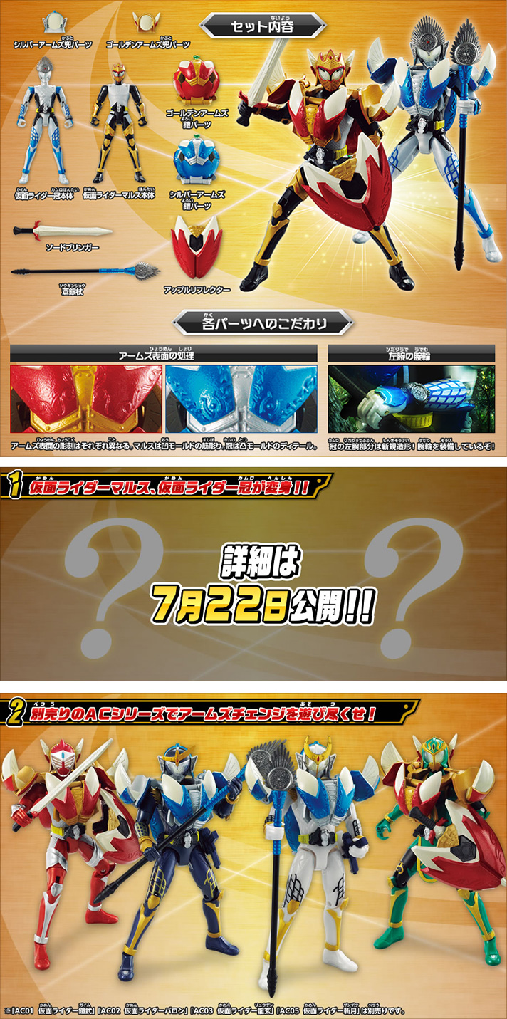 AC PB05 Kamen Rider Mars & Kamen Rider Kamuro Pre-orders start today 7/18 and last through 9/1 Scheduled release for the set is November On 7/22 Bandai will apparently "reveal" the transformation for these two figures. Not another 2 pack as had been speculated. Also be sure to check out this excellent commercial for the entire Arms Change line!