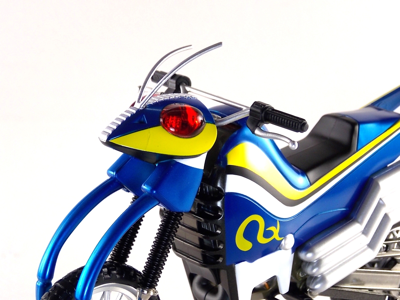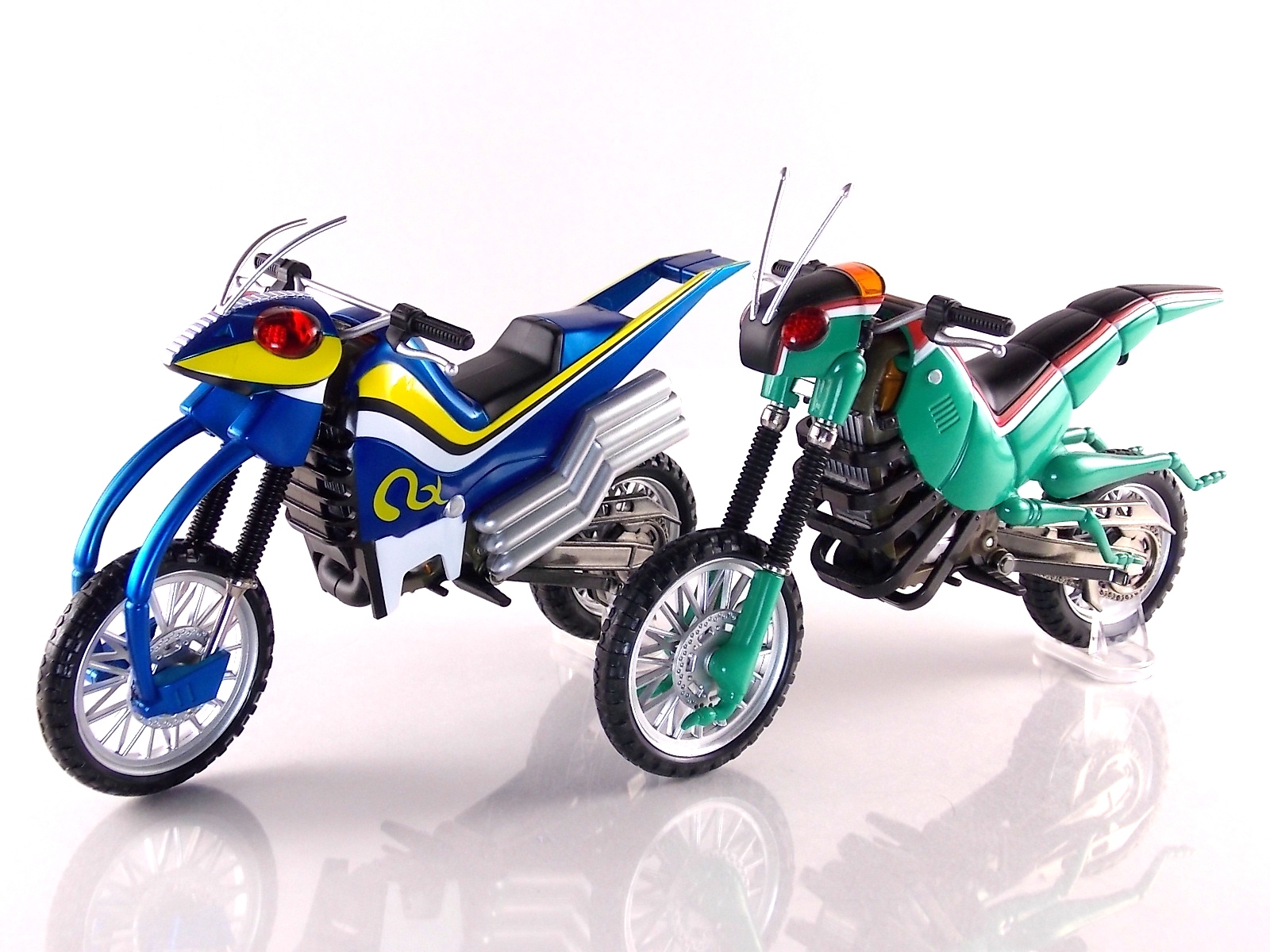 **Post #2 contains some additional action & bonus shots & the Acrobatter part of the gallery. Much like the Black/Battle Hopper Renewals the RX/Acrobatter Renewals seek to improve upon their original release counterparts and for the most part succeed in doing so. Here's the breakdown. Packaging I no longer have the original S.H. Figuarts RX & Acrobatter for comparison but the packaging here is hands down better. The original RX was released at a time when S.H. Figuarts were generally packed in plain grey boxes with black lettering and a shot of the character across the front. As the line has expanded so has it's creativity, so the boxes for both RX & Acrobatter Renewal both feature quite a bit nicer art and far more color than the originals did. Main Figure (rider & bike) Kicking things off let's take a look at Black RX himself. As with the original release of Black, the original release of Black RX was in sore need of accessories. Moreso than Black Renewal, RX Renewal gets the job done. The figure also attempts to update the design of the figure with the more modern complexities that SHF line enjoys today. Going with the trend Black RX Renewal features some of the same type "real suit" detailing that Black Renewal had. Folds in fabric that give the suit a very realistic feel. Where Black did it very well, I feel RX isn't quite as nice. It may simply be that looking at RX I don't see as many of these details being present, or it may be even as simple as the details looking better on the all black suited Black, but I don't think RX pulls it off as well. The waist are has the look down, but the arms and legs seem to feature this detail only half heartedly. Now also as with Black, Bandai sought to improve on the articulation of the orignal RX with this renewal. As with Black I feel this is a mixed bag. Some people disagreed with me before but I still definitely feel that Black has some clearance issues, and RX is sadly no different. It's undeniable that the overall figure captures the look and feel of the character more truthfully than any other toys of RX ever has. However his movements feel very robotic on this figure. On my copy at least the joints are a bit too stiff to feel comfortable enough to move properly. While on RX the shoulders aren't as bad as they are on Black, the armor is still a little cubersome. The only real issue I have with the arms is that they can barely achieve, and I mean they have to be bent and forced, into his signature poses. The intended use of the alternate Revolcane and Sunriser belt parts is to replicate RX literally pulling the sword out of his belt. Because the arms can't swivel as properly to the side as they should this can be quite difficult to achieve. My other gripe is with the legs. What have you done Bandai? Despite continuing to improve hip design over the years, RX Renewal feels like a total step backwards. Even when compared to the original RX SHF. Compared to Black Renewal I have to wonder who designed the legs on RX Renewal. He has a serious case of diaper crotch. Rather than going with a smooth integrated hip that wouldn't break up the design (similar to nearly EVERY Ryuki rider) they instead chose to have drop down hips, but the ugliest ones I've seen. They just are not pleasing to look at. Otherwise the sculpt on RX Renewal is absolutely gorgeous, but I do think the legs are an eyesore. Acrobatter Renewal is nearly identical to the original release. Albeit with minor tweaks to the paint job. Not even a remold that I can see, Battle Hopper renewal at least had that. Accessories (rider & bike) As I mentioned above Black RX Renewal succeeds in finally including a nice selection of accessories. A grand total of 5 extra sets of hands are included to allow you to replicate a variety of action and signature poses. Compared to the original releases bare minimum of hands these are like a dream come true. Also included are two deconstructible versions of the Revolcane, Black RX's trademark sword. One version is fully painted in accurate colors while the others is cast in all translucent blue. This version is meant to replicate it's formation as it's pulled from within RX's Sunriser and powerful attacks. However BOTH versions of the Revolcane can also be swapped around to create an accurate version for nearly any scene. A short version of the energized blade is included to further and more accurately replicate the Revolcane's birth from RX's belt. And being able to switch out the full length blades, if you so choose, lets you replicate signature attack moments when the Revolcane is fully powered up. Rounding out RX's accessories is a slightly altered version of the Sunriser. You can remove the original (with a little difficulty) and use this version to replicate the moment when he begins to create the Revolcane from the belt. A small peg on it lets you link up either version of the Revolcane handle to the Sunriser to further this recreation. A very nice touch indeed. Bewtween the two versions of Revolcane and the extra Sunriser RX has basically everything he could possibly need! As with Battle Hopper Renewal, Acrobatter Renewal really doesn't bring much to the table for accessories. In the old days a bike like this would have included alternate hands for the rider to grip the the handlebars. Seeing as most riders and bikes come out roughly the same time these days the rider usually already has the proper hands to accomplish this. So Acrobatter is reduced to merely including a clear "wheel base" and a tamashii stage adapter for jumping or flight poses. Final Thoughts In another bid to improve upon where their line has been before Bandai/Tamashii have tried to make this this all in one RX/Acrobatter package. They mostly succeed in that. I'd actually say like 95% succeed if I had to put a number on it. S.H. Figuarts Black RX Renewal is excellent despite the molds flaws. While I do tkae serious issue with his hips and slightly limited arms, the overall lo