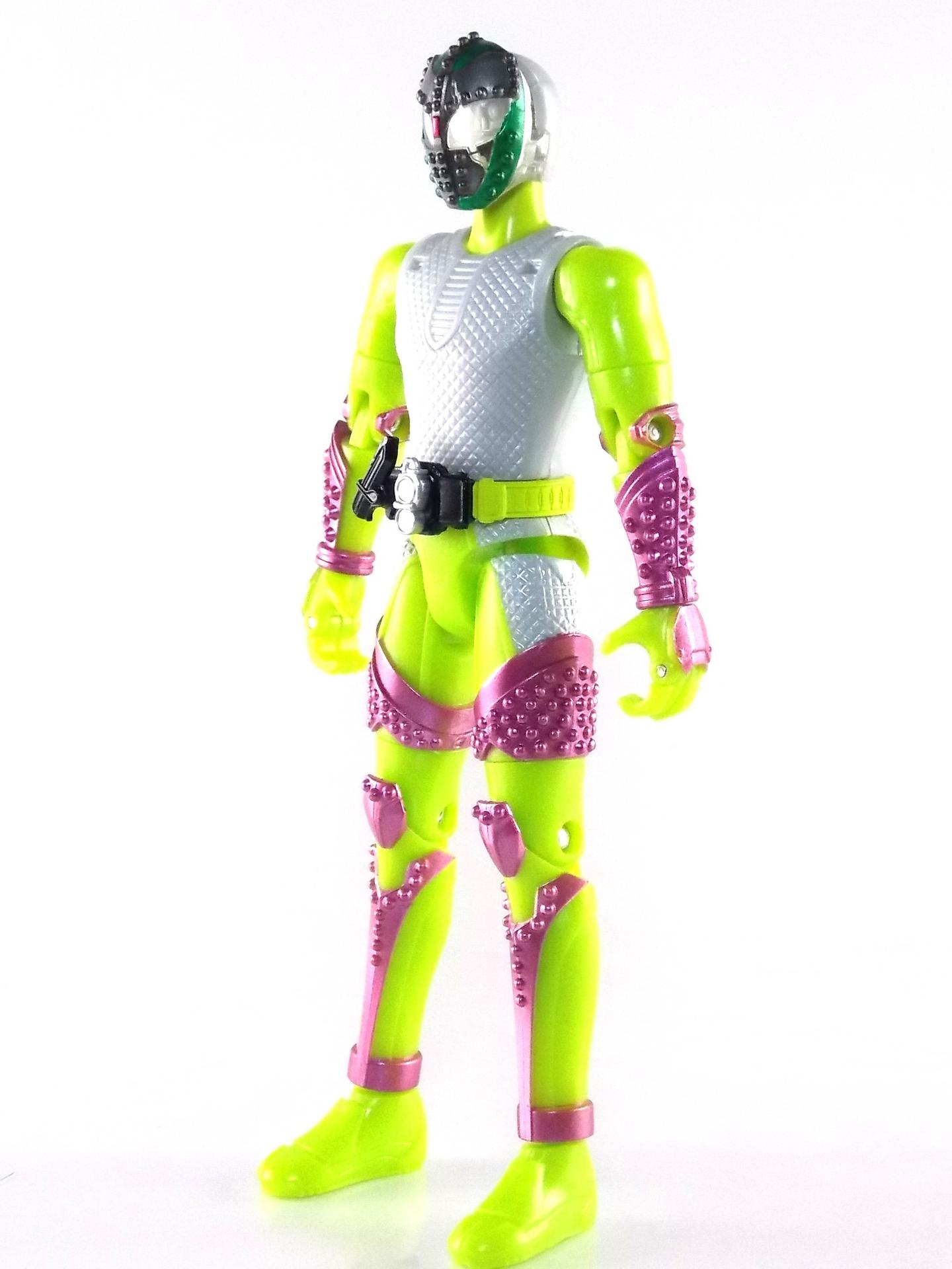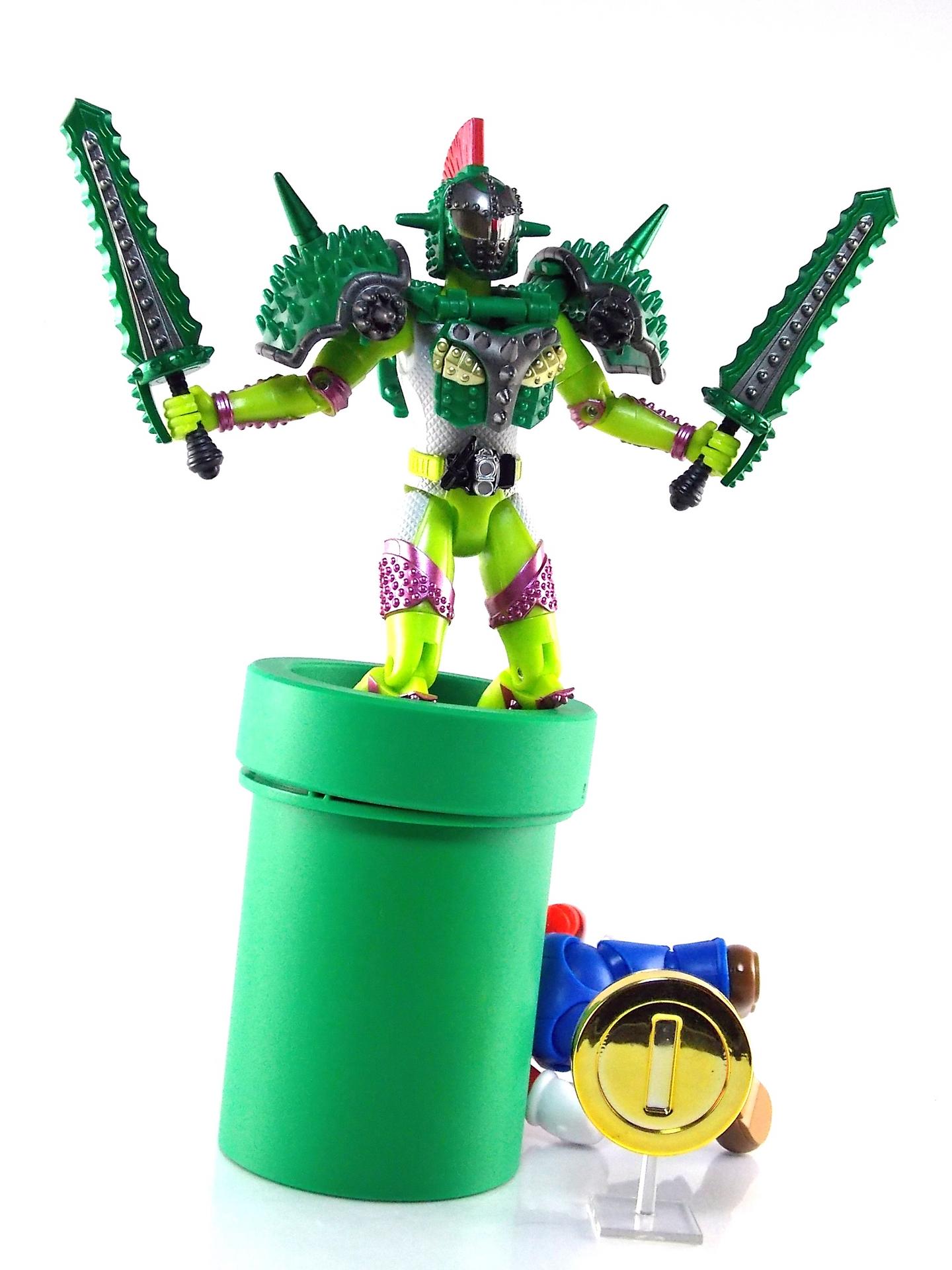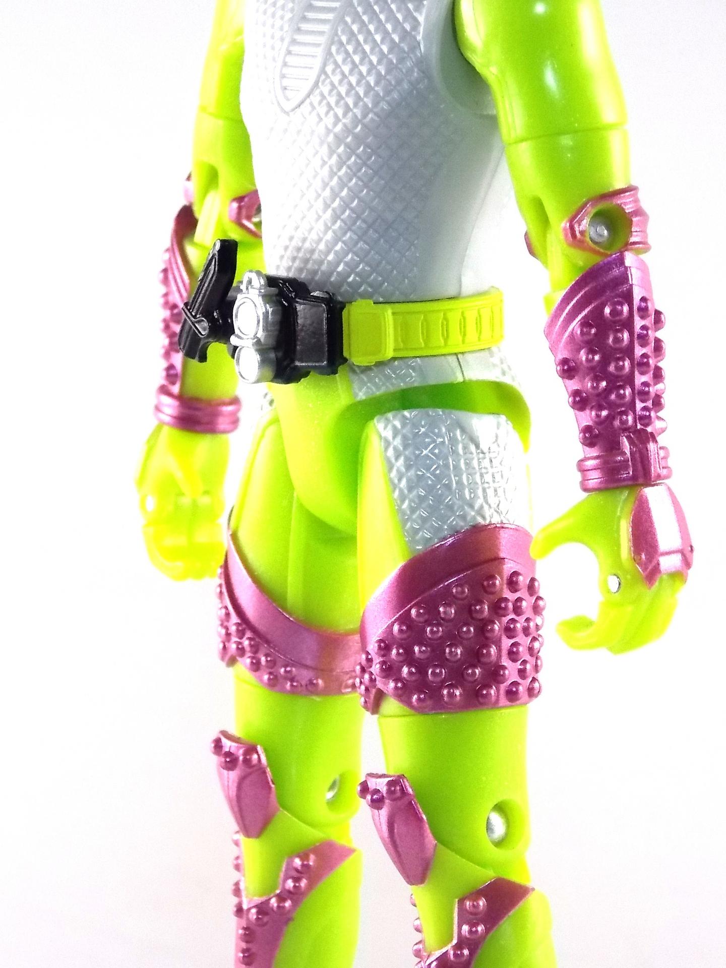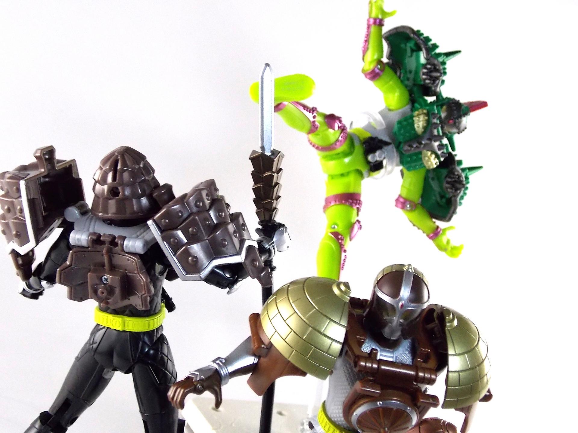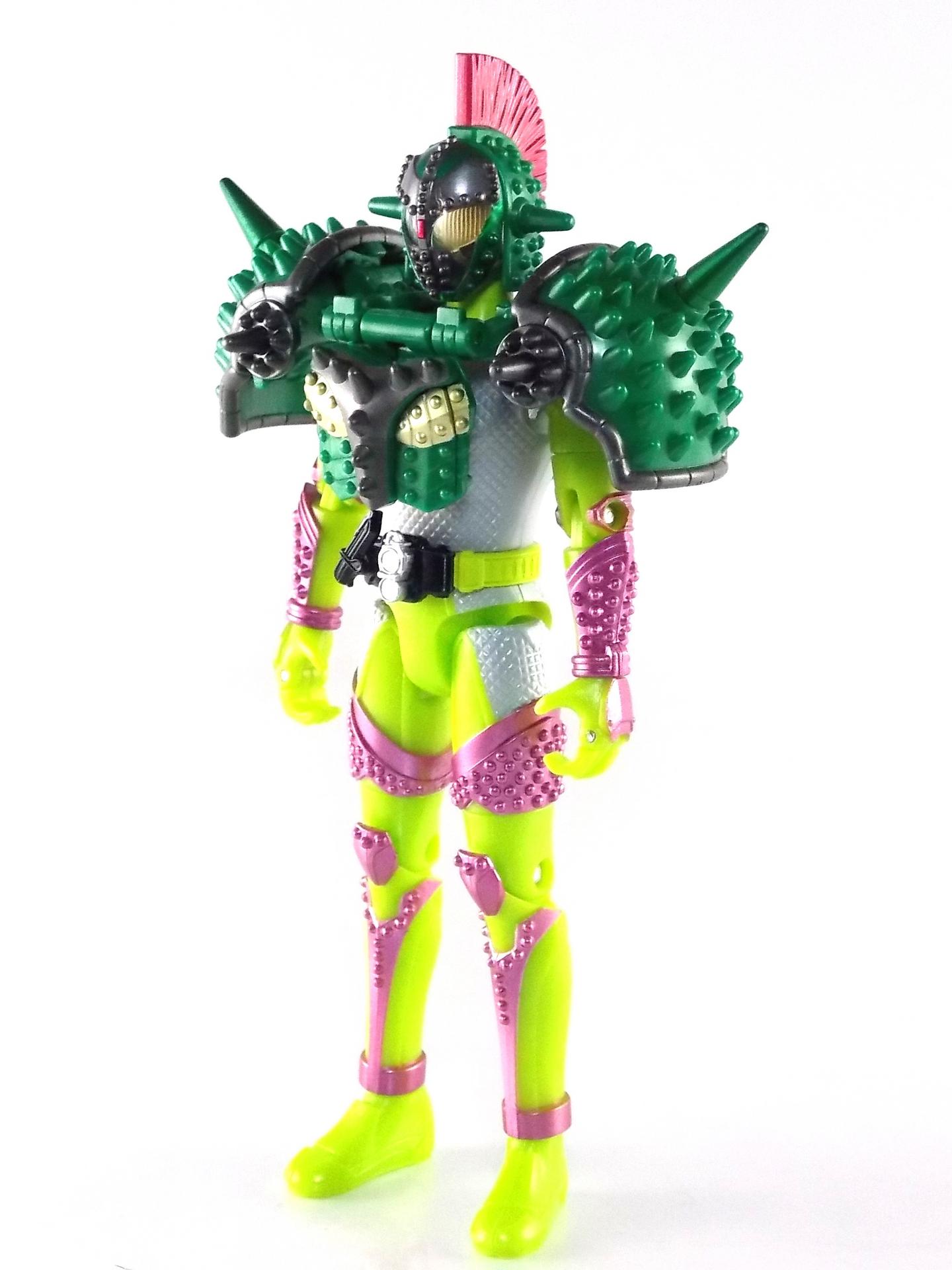 Misteeerrrrrr Dangeroussssss!! The Arms Change line of Kamen Rider Gaim continues with another Premium Bandai Exclusive release! Last time we checked out the first premium rider, Bujin Gaim, but today we want to take a look at the most peculiar Armored Rider of them all. ACPB02 Kamen Rider Bravo! Oren Pierre Alfonzo, the awesome ex-patriated, ex-military, re-patriated, pastry chef/mercenary of doom. He's certainly one of if not the most memorable characters in Kamen Rider Gaim. So it's only fitting this his rider form, Kamen Rider Bravo, is also one of the most outlandish and memorable designs in the series. Let's dive in to see how the toy holds up compared to it's on screen counterpart. Before you check out this gallery be sure to hit our front page and check out our good friend Baltmatrix's video review of Bravo! Post #2 features an additional 40 images including every alternate Arms Change for Bravo! Packaging Continuing the trend that started with Bujin Gaim, Kamen Rider Bravo also comes in a windowless box that's become the standard of many Tamashii Web & Premium Bandai exclusives recently. Aside from showcasing some alternate Arms Changes and a battle scene on the back, there really isn't much more to say about the box. It's Bravo, so it's a winner by default. Main Figure Though this figures body has had quite a few cosmetic changes compared to his mold mates, at a basic level you can still see where Bravo inherits much of his design. Just like in the series itself the bottom line is that Bravo is a repaint/remold of the Baron/Gridon/Duke body. Sharing much of their same standard molding, what sets Bravo apart is his garishly awesome color scheme, I mean it's like Transformers G2 awesome. And I mean that in a completely non-sarcastic way. Seriously I love it. Looking closer we also see that Bravo's wrist guards, shins, knee pads, hip armor, elbow pads, and head all feature brand new unique molding to set them apart from other uses of this mold. Covered in the unique Durian "spikes" Bravo gives the impression of being far more detailed than other figures in the line. This figure is so far the first to really embrace it's premium nature. And I couldn't be more in love with it. The head is especially striking as a lot of care went into making sure that head sculpt was accurate. Right down to the natural "scar" across the left eye. In this pre-Arms state we can already see Bravo is worth the price of admission. Arms/Accessories The main event so to speak of this figure is the glorious brand new Durian Arms! This set of Arms is an entirely new mold/design, but then it had to be. Early into Gaim's run speculation ran wild that this figure would simply never exist because of how these Arms cheated with a CG transformation. While the toy may not be able to do some of the CG magic the show can, it more than faithfully represents Bravo's trademark armor. When attached and folded out we see Kamen Rider Bravo Durian Arms in all his glory. If you couldn't tell by now Bravo's suit is based on a Roman Centurion, right down to the gnarly mohawk down the middle of his helmet. The insert piece of his helmet has a nice golden paint application that really helps it shine through his eyes. The scar molding allows a little more extra light into the visor that other figures don't get the advantage of. But it really helps bring this figure to life more. As you can see the Durian Arms are rather big. Perhaps inaccurately so, but not disappointingly. We all knew from the get go when Arms Change was a retail line that it would make compromises, and even now that the line is being finished up as exclusives, I still think it's reasonable to allow for some small inconsistencies from screen to toy. Needless to say whether the Arms are too big or not they look amazing on Bravo. I will say that they do hinder the upward motions of the arms to a degree so it can be just a little difficult to manage some poses. Now also included with Bravo are this forms signature weapons, a pair of Duri Noko. This pair of saw like weapons has been wonderfully sculpted and exquisitely painted, they are absolutely awesome. And they have some surprising heft to them. Unlike a lot of AC weapons they also have knuckle guards. So when you put them in a riders hands the guards help stabilize them so they hold much more tightly. Some other AC riders would have greatly benefited from their weapons having a design like this. Looking at you Ryugen. In any case this is a fantastic looking form, and when you get to swapping around these arms to other figures you're going to discover some beautiful combos. Bravo looks decent enough in most arms actually, though his colors will clash with nearly anything. Durian Arms however looks great on a ton of riders. Of particular note is the absolute match made in heaven combo of Ryugen Durian Arms. Seriously look at that image, it's like it was made for Ryugen. But it also looks fantastic on Zangetsu, Gaim, and even Kiwami Gaim. Final Thoughts The first release in this premium line, Bujin Gaim, was an admirable start. As a simple repaint it tested the waters to see how much interest people would have. Clearly that paid off as we got this wonderful brand new figure as a second release. ACPB02 Kamen Rider Bravo is an excellent figure. It's hands down my personal favorite Arms Change figure released thus far. It has beautiful crisp paint apps, a plethora of new molding, and a ton of personality to it. I'm in love.