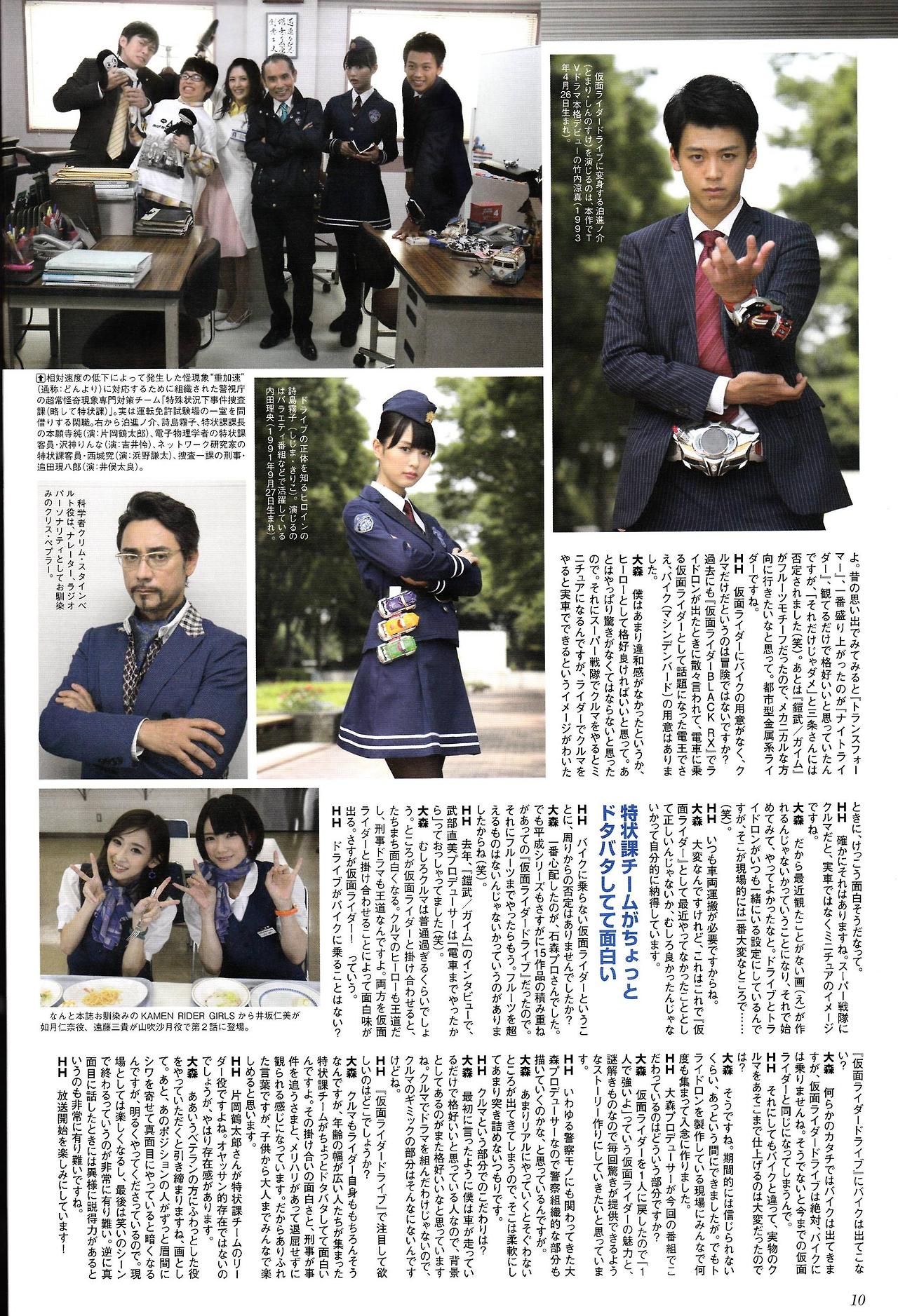 Rio Uchida who will be playing Kiriko Shijima in Kamen Rider the main female lead support cast will be more of a active female cast stated in October issues of Hyper Hobby Magazine. She will also offer support to Kamen Rider Drive by carrying around Shift Cars of her own for him to use in battle.