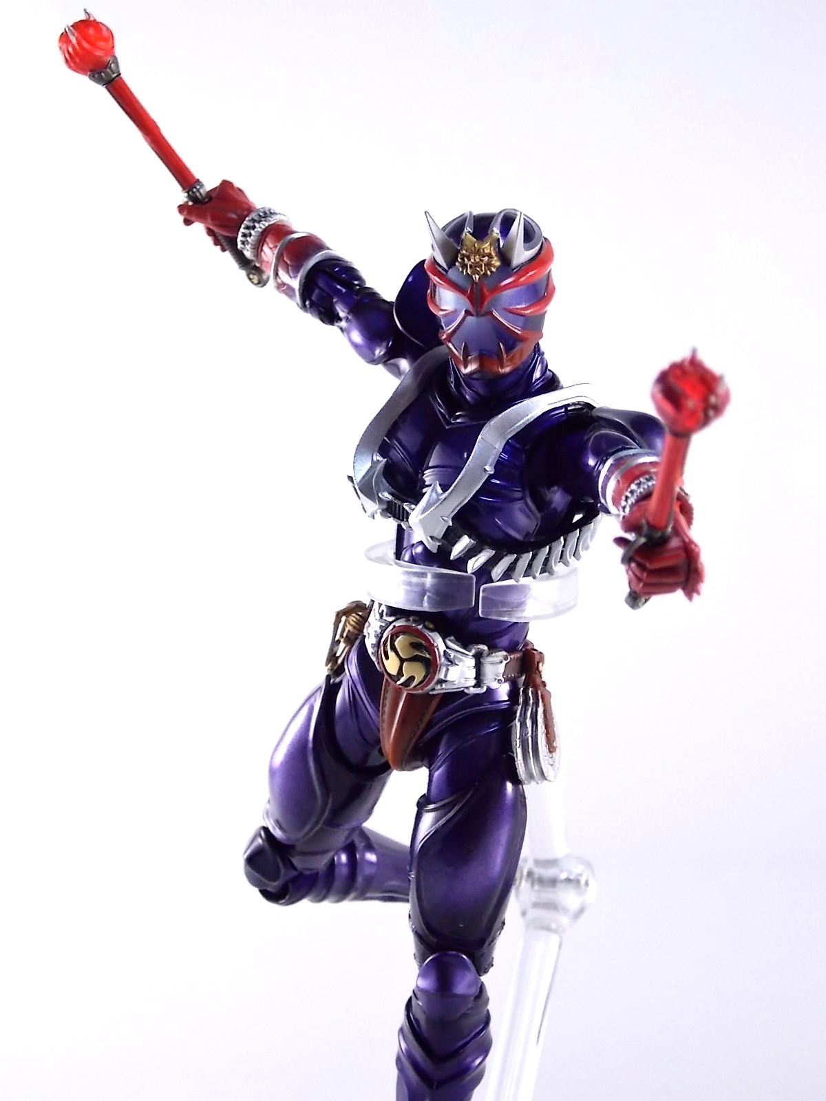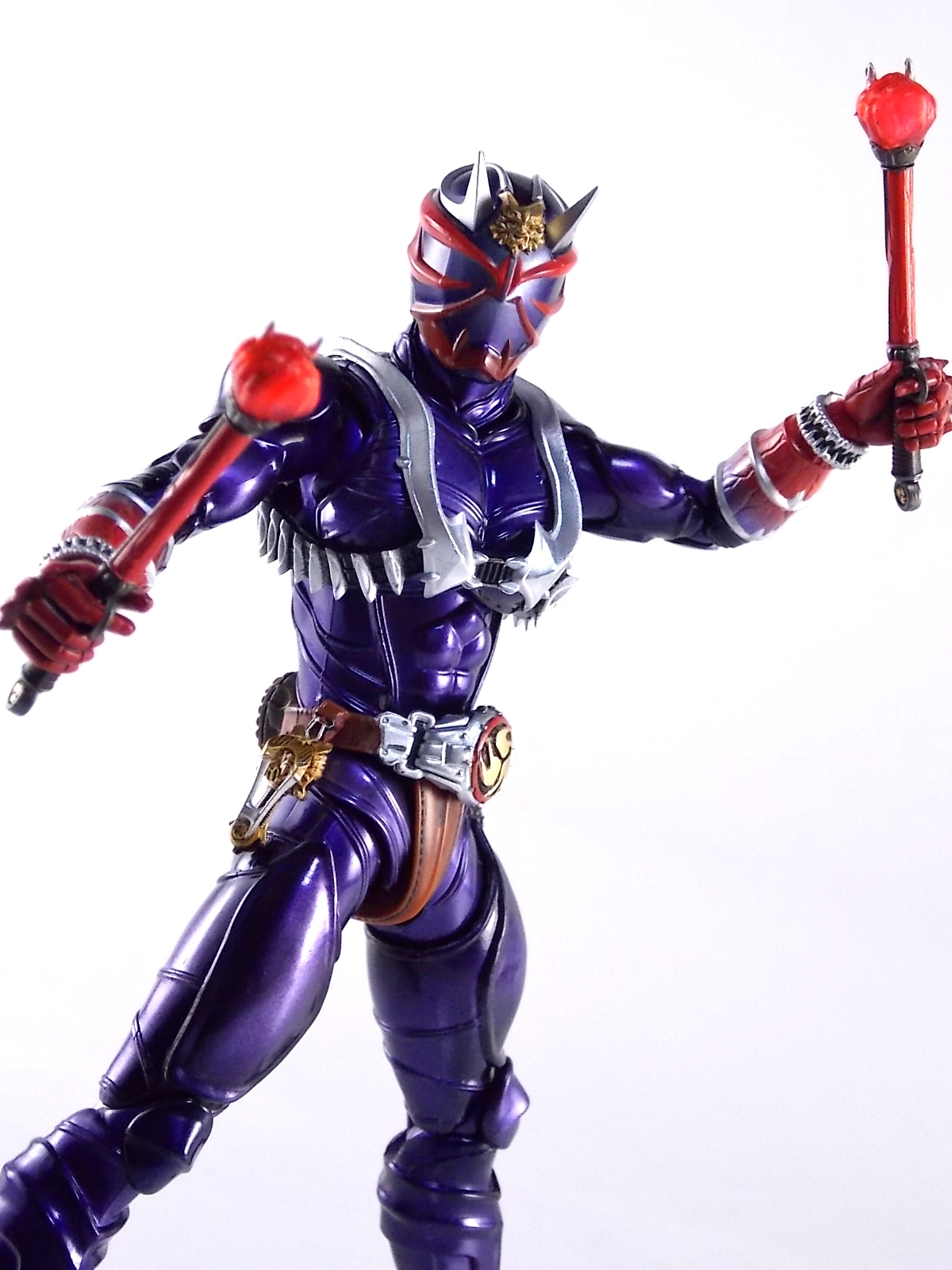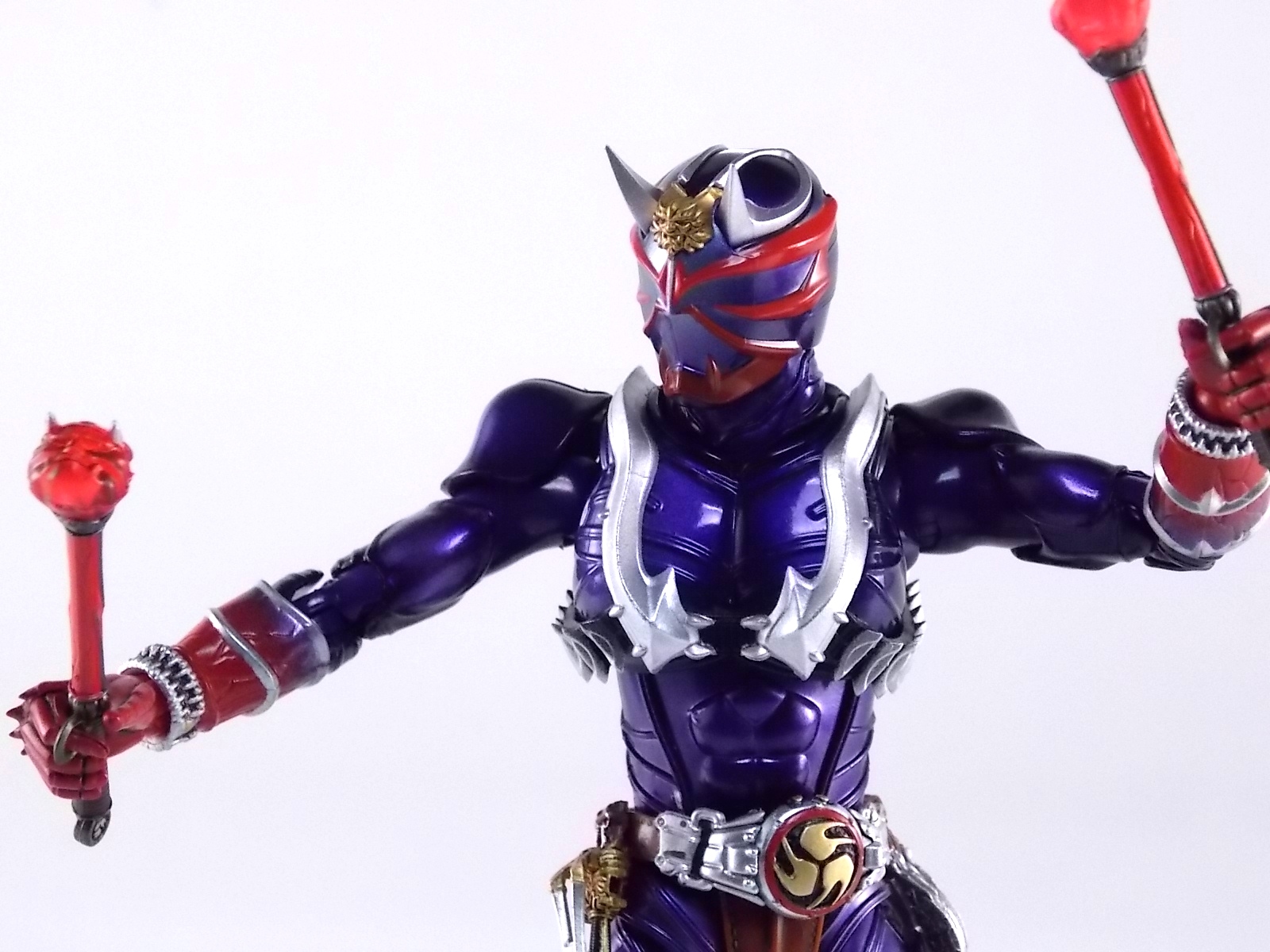 A long time coming, S.H. Figuarts Kamen Rider Hibiki finally makes his appearance! After many years of this line continuing without all the main riders, we're one step closer to having them all! Released in the same premium style as the recent S.H. Figuarts Kabuto Renewal Hibiki aims to deliver an incredible product and for the most part it succeeds. Let's take a look at exactly what this figure is like. Post #1 contains 40 images with over 30 more in post #2! Packaging S.H. Figuarts Hibiki comes in identical packaging to Renewal Kabuto. The exact same type of rectangular box, with stacked white plastic trays. It's a little odd that Hibiki would be given the same premium treatment Renewal Kabuto was, considering this is the first SHF Hibiki to be made. So far these two figures are the only ones to feature this packaging which seems odd, we'll see if it continues down the line. Main Figure First things first, Hibiki is drop dead GORGEOUS. The sculpting on this bad boy is absolutely perfect. In every way imaginable it captures the look of the on screen suit right down to the textured musculature. The details are near perfection. Seriously I can not say enough about the new sculpting process used for Hibiki that was first introduced on Kabuto Renewal. Like Kabuto we see from the included concept book that the sculpt for this figure began from the ground up with a skeletal inner frame. And that extra work really pays off, especially when compared to other main line S.H. Figuarts. The only issue I really have with Hibiki, which is isolated to the one I have, is errant paint applications. Just above his belt on mine there are several significant splotches of silver. And there's another on his inner thigh. Based on how tight some of the joints are I think it's safe to say that the purple paint all over the figure may flake off over time as well. The thighs/hips and upper body were pretty darn tight too. The interesting new hip design makes me think they could break pretty easily as well. But that's just catious speculation on my part, it really feels like there could be issues with the figure down the line. As is, the main body of the figure looks gorgeous. Again it really does look incredibly faithful to the onscreen counterpart. The articulation is pretty superb as well. The way the shoulder pads unhinge up and over the shoulders themselves, the innovative way the hips angle out with a filler piece that fills the gap (itself reminiscent of Toy Biz Marvel Legends joints), and the traditional peg style hands with pretty open wrist cuffs that won't hinder their movement. It should be noted that Hibiki DOES NOT use the "figma style" wrist peg system that Kabuto Renewal does. It has the traditional ball jointed wrists that nearly all Figuarts do. So far the only releases that have featured this new system are Kabuto and the Anti-Piracy figures. I am hugely thankful of this. The peg system introduced with Kabuto is in my opinion pretty terrible. I'm very happy to see a return to standard ball joins again. Accessories S.H. Figuarts Kamen Rider Hibiki is fully loaded! Aside from the excellent sculpt of the figure it's also armed to the teeth with accessories. Including much more than the pre-requisites of more standard fair releases, the accessory count is what really bumps Hibiki into the premium SHF territory. Included with Hibiki are: 4 - sets of alternate hands. As usual this gives you all you need for nice static, dynamic, and signature poses, including the perfect pair for Hibiki to hold his weapons. 2 - different sets of Ongekikou Rekka. One set molded into a holster. This set can be plugged into the back of his belt in place of the standard "empty" holster pouch. The second set of Ongekikou Rekka are magnificent. These full fledged versions of the weapons slide into Hibiki's holding hands and actually looped around the forefingers just as the real rider himself would hold them. They really are excellent. 2 - flame effect parts for the Ongekikou. To use them you need to pop the head of each Ongekikou off and pop these on. These flame effects look fantastic and really help the figure pull off it's dynamic look even better. Great for dynamic shots and poses. 2 - different versions of the Onkaku Tuning Fork. One version is molded in a folded down position to be plugged onto the right side of the belt in the same manner the Ongekikou on the back. The second Onkaku is the proper unfolded version for the figure to hold in hand. Though I don't feel any of the included hands can really hold it that well. 1 - Disk Animal holster molded with the appearance of 3 discs in it. Again meant to be plugged onto the belt in place of the bare plug that's normally there. 3 - Disc Animals in disc form. Though they don't transform, at this scale I'm not sure that would be possible. They'd almost certainly break. As is they look really nice for their size/sculpt/Paint. The 3 you get are Steel hawk, Azure Wolf, & Green Ape. So as you can see, Hibiki gets a boat LOAD of accessories. Seriously this is basically everything he could possibly need. These accessories really make it the premium release it should be. As a bonus the the Ongekikou Kaentsuzumi buckle on his belt can also be removed to replicate at least the first part of the Ongeki Da finisher. The figure should have included a giant version of this accessory but that's a bit of a dream honestly. You can always pick up the old Final Form Rider Hibiki to replicate it if you wish. Final Thoughts S.H. Figuarts Kamen Rider Hibiki really does feel like just as much of a Premium release as Kabuto Renewal did. Though mine suffers from some unfortunate QC issues, don't let that affect your opinion of it. It really is an excellent figure. It has the sculpt down perfectly, and for the most part the paint apps are incredible. It has a wealth of accessories that really are just incredible. With Hibiki's release we are now officially 1 rider away from having ALL the Heisei 
