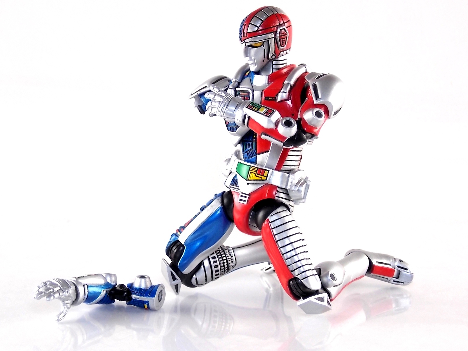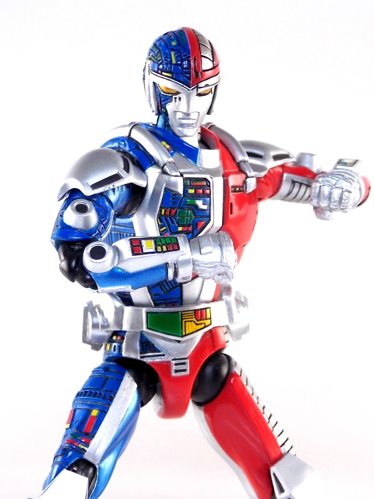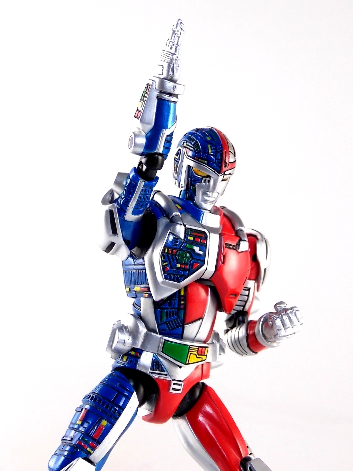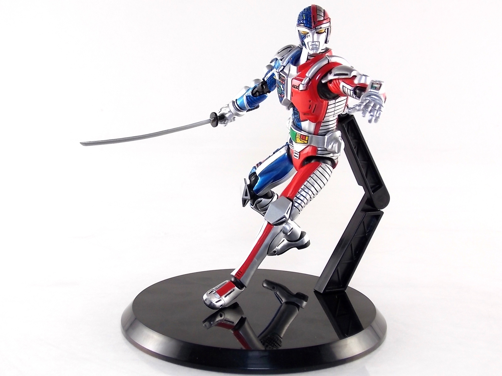 Metalder footage was used for the character Ryan Steele primarily in season 1 here in the US. But since Metalder is the shortest of the Metal heroes shows, a mere 39 episodes, season 2 began utilizing Shaider footage for Ryan's new upgraded form. Despite quite a bit of fan support here in the US VR hasn't gotten a ton of love over the years though. Especially in the figure department. Much like anything that isn't Power Rangers it's been cast to the wayside a bit. But a few years back there was just enough residual love for Chojinki Metalder left in Japan to produce this figure, Action Works Metalder! Action Works was a toy line competitive to S.H. Figuarts in design at least. Since the two focused on different genres they didn't compete in quite the same way you'd think. Sort of borrowing elements from Bandai's SHF line, Action Works were produced by Megahouse. That is until Megahouse was acquired by Bandai Of Japan. Until they were acquire this line had become a home of sorts for high end Metal Heroes releases including the 3 Space Sheriffs as well as Metalder and even Winspector. But Metalder was the first metal hero released by the company as Toei Hero The Live 01, and even by today's standards, this figure rocks. Here's why. Packaging For starters Action Works came in much larger style boxes than S.H. Figuarts of today do. These releases were more of one offs each time rather than part of an overarching merchandise line. Metalder is the 2nd largest in the packaging department, only being outclassed by the massive Winspector 3-pack. But it's a glorious box evocative of the figure inside with plenty of nice stock photos and a great insert piece for the back of the inner package. Main Figure As I mentioned before Action Works are sort of like figuarts but they were actually better than the first couple years of Figuarts offerings in terms of design and accessory count. These figures were wonderfully sculpted, generously articulated, and included tons of accessories (more on that in a minute). As you can see from the images below Metalder looks damn nice. It really captures the actual character quite well. Now I know there are some glaring black joints there but you have to remember that this figure is from 2009. And yet it still holds up nicely with today's S.H. Figuarts. Joint aesthetics aside they're meaningfully placed. Metalder can pull off some nicely dynamic poses including his most signature ones. Though some Action Works Metalders have become loose over time this one is still in fine working order. A very nice additional feature here is the intentional ability to remove Metalders arm at the bicep for him to hold it as a weapon. That's right folks, in show Metalder has literally beaten enemies to death with his dismembered arm and the toy faithfully replicates it. Automatically goes in the win column. If the articulation wasn't enough to sell you just look at the paint and intricate detailing on this guy. It's just incredible that a toy like this has been around since the early days of S.H. Figuarts and sometimes we still don't get modern SHF's with this level of detail. For those wondering Metalder's 2-tone appearance was meant as an homage to one of Shotaro Ishinimori's earliest creations, Kikaider! The red/blue split design is no coincidence at all, this guy is a blatant homage, right down to him being a robot with a human form rather than a "hensin hero". He even has a motorcycle with detachable side car and plays Jazz Saxophone for fun! Accessories As with all Action Works figures, Metalder comes with everything he could honestly need. Included here are: 5 - additional hands for various action poses. It should be noted that this type of hand has the ball joint attached to the hand itself rather than to the wrist peg allowing for a greater range of movement. Honestly I love this hand system but I can see where it's probably more of a gamble breakage wise, though I've yet to encounter such a problem. 1 - Action Works display base. No these aren't as fancy as modern Tamashii stages but they get the job done and peg directly into the figure. The only downside is that they aren't quite tall enough to leave the figure in a static standing pose when plugged in. They really only work for action shots. 1 - Katana. A seldom used but specific weapon of Metalder's. Including weapons like this is something I greatly appreciate. It may not be something he uses every episode or even more than a hand full of times, but I love having it. Sidenote, the Space Sheriffs released in this line came with multiple energized and standard versions of each of their Laser Blades. 1 - Springer! That's right, Metalder comes with a robot dog, not to be confused with that pesky Transformer! Springer was Metalder's trusty older brother. Built by their creator before Metalder, Springer guards the Silver Caucus base where Metalder operates from. He can even speak human language! Jeb the dog from VR Troopers was based on Springer though he wasn't cybernetic. Though this Springer figure isn't articulated, it's wonderful detailed bonus ton include with Metalder. Final Thoughts If you can't tell, I love this figure. I've owned a few Action Works releasese over the years and this one is by far my favorite right now. For figures released during the early days of the S.H. Figuarts line, Action Works do not disappoint. I've vocalized my disappointment so far with the poor QC of the Space Sheriffs released in the SHF line as they just don't hold up as nicely as their older counterparts. I love Action Works Metalder to pieces. If an SHF was announced I'm not entirely sure I'd need to buy it unless it at least came with everything seen here. But as the SHF line brings more Metal Heroes into the fold like the forthcoming Blue & Black Beet there's always a chance for a Metalder release. In any case if you can find Action Works Metalder I HIGHLY recommend him. He not only is an excellent toy but he fits in perfectly with y