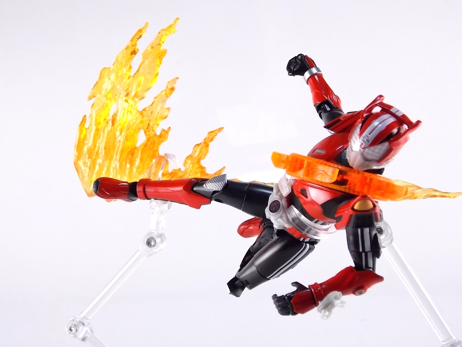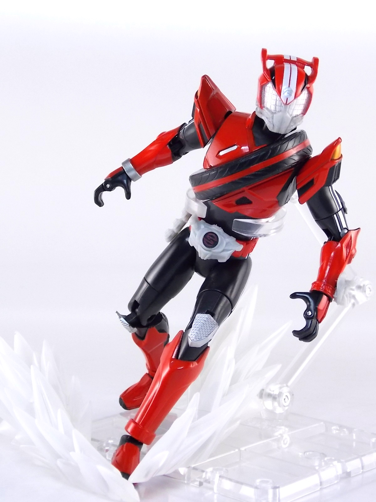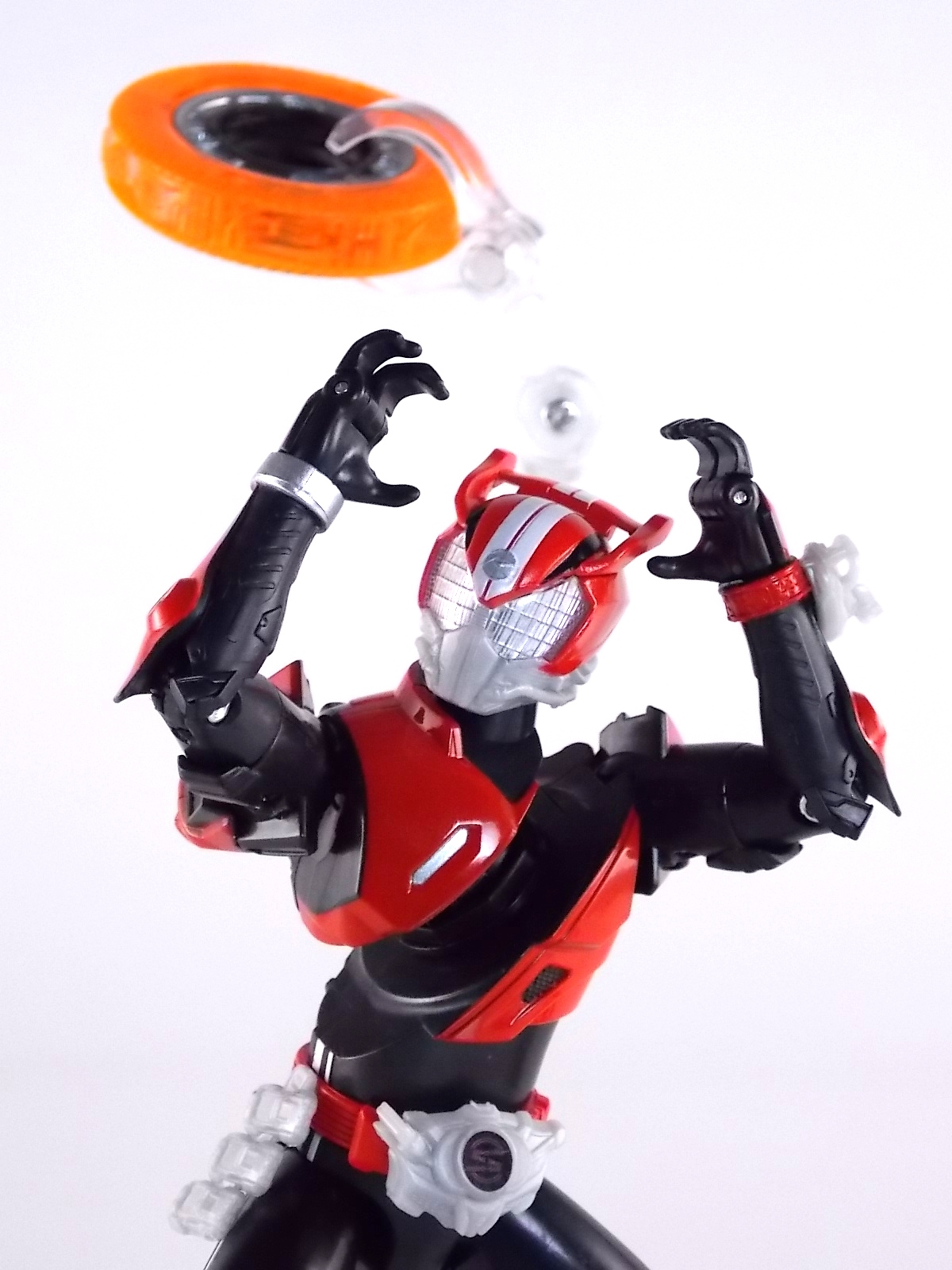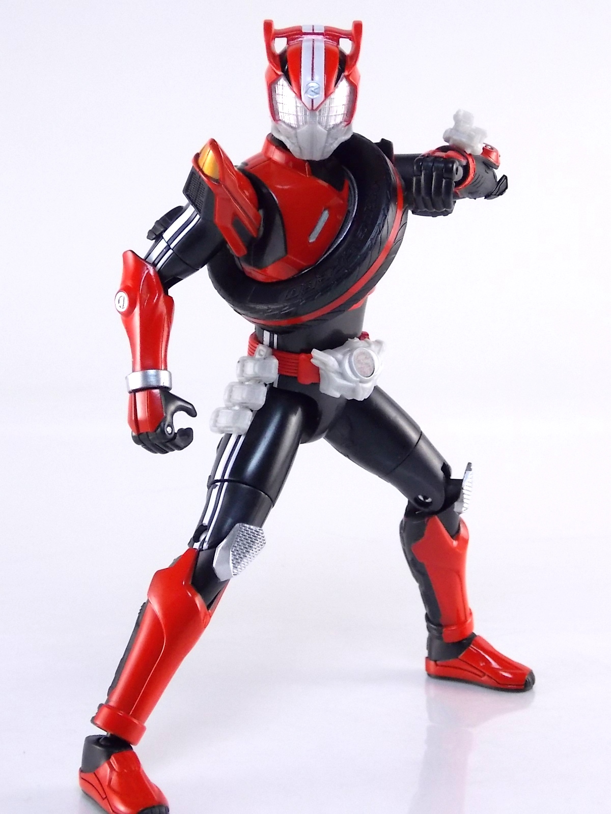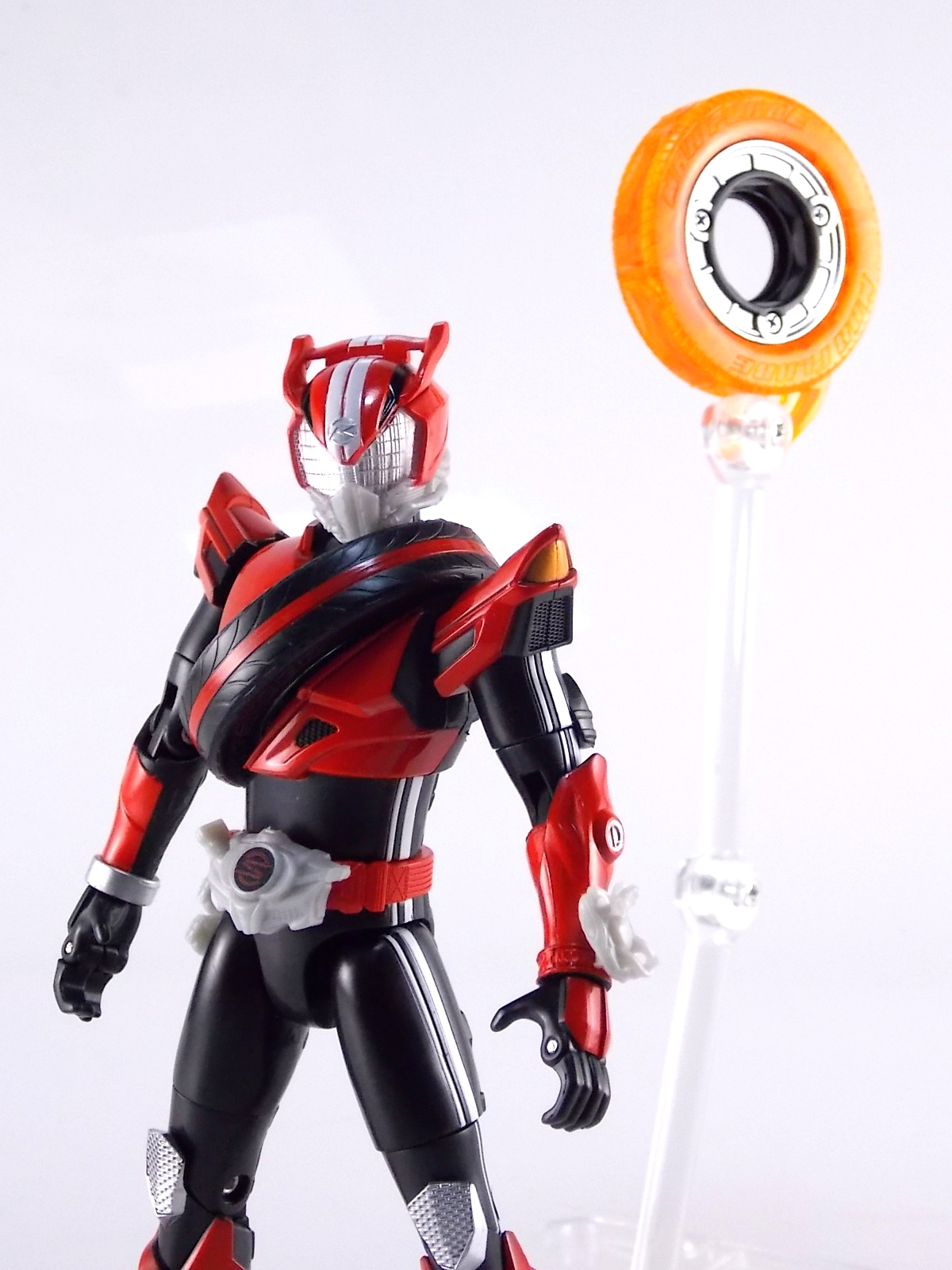 Kamen Rider Drive is finally underway and with the inaugural episode having aired this past weekend, the toyline was released in unison in Japan. Luckily enough some of it has made it's way to our part of the world as well. So today we're taking a look at the very first figure in Drive's gimmick line Tire Koukan! Following up from last years fantastically well received Arms Change line, Tire Koukan has a similar gimmick. Literally you swap various themed tires onto Drive and other compatible future figures by splitting the figure in half. So let's jump right in with TK-01 Kamen Rider Drive Type Speed! Post #2 contains tons of additional images of this wonderful figure! Packaging TK-01 Drive comes packaged in a fairly standard box. The mass retail toylines don't tend to have the fancy bells and whistles of Bandai's collector lines but they get the job done. Drive's box is very similar to that of an Arms Change albeit much slimmer as the Tires aren't nearly as cumbersome as Arms were. The cross sells on the box give us some official looks at the upcoming DX Tridoron & TK-02 Tire Set. Drive himself is packaged in a plastic clam shell and is split into his upper and lower halves with no tire attached. Main Figure Inevitably the comparison between Tire Koukan & Arms Change was going to be made. So let me go ahead and make it. As with most if not all mass retail "gimmick line" rider figures from the last roughly 5 or 6 years the body type is fairly generic. At least in the placement of articulation points and complexity. OCC, FMCS, WAP, AC. These all share basic design structures so Tire Koukan is no different in that regard. Last years AC's brought the retail lines to a new level with it's innovative gimmick, and Tire Koukan is attempting to bring the same magic. I feel it's an admirable successor. Kamen Rider Drive can actually be snapped together without a tire connected to his chest peg funnily enough, though he won't have much of a chest if you do that. There's nothing to fill in the big gap on him like the basic suit used in the show between Koukans. So to really examine the figure as a whole you need to equip the included Speed Tire. Drive's Type Speed is his default form anyway. This basic form of Drive is pretty damn slick. Though this is merely a gimmick figure it absolutely nails most of the details from the suit. You could levy the complaint that the Shift Brace, Drive Driver, and Shift Car holster are unpainted. True enough they aren't and are simply molded in gray plastic. But as a mainline non-SHF figure it's forgivable. The details are still nice on all 3, right down to the three tiny molded cars on the holster. The holster is also removable though that doesn't serve a purpose right now. The back of the figure is where it really shines though. Look at ALL that detailing! Much like the real suit, TK-01 Drive has that incredible car undercarriage detailing on his back. It really does look fantastic. Drive's basic red has a nice gloss to it to make it feel a bit more authentic, and his visor is nice big and open to allow plenty of light in, making the eyes really pop. While on the subject the helmet is also excellently detailed, right down to the (sadly unpainted) piping around the sides. Seriously look at this figures profile, it's fantastic. Many people complain the tires seems too large but if you ask me it looks just right on the Tire Koukan figure. It gives Drive a nice unique shape. It can hinder the leftward movement of the head to a degree, but this figure doesn't have an incredible range of motion to begin with so it isn't a huge loss. As you can see you can get some nice fun poses out of a figure like this and with some already purchased effect parts you can make the most of him. Drive also fits in pretty well with S.H. Figuarts and the like. Though he's a tad bit taller than the standard figuarts, he'll look good with some of your more modern riders, and other law enforcement heroes... Accessories Drive's one additional accessory aside from the necessary Speed Tire is the Max Flare Tire. First seen in episode 1, Max Flare gives Drive access to Fire based powers and attacks even letting him create flamed whirlwinds punches and kicks. Sadly the spikes on this Tire don't pop up automatically when placed on Drive, you do need to flip them out individually. It should also be noted that the Tire's only go on one way. They're molded to only be placed on a figure one direction, with the screws facing down on the "bottom" of the Tire. Max Flare is cast in a nice fiery orange and although the spikes can be a pain when posing, they still don't really affect the figures ability to pose. Again, if you have some effect parts in hand already Max Flare can be just as much fun as Speed. I had some and really had fun with it. Drive will apparently receive actual weapons later on in the show so for now there's no gun or sword or anything like that for him to use. But Max Flare is a good bonus to throw in for now. The TK-02 set will be nothing but extra Tires; Justice Hunter, Mad Monster, & Funky Spike. Final Thoughts Though not quite as snazzy or immediately as playable as the Arms Change line, I feel Tire Koukan is more than a worthy successor. Koukan's focus is on Tire swapping but we do know that later figures will introduce something more like torso swapping as Drive's upgraded forms Wild, Technic, & Dead Heat appear. Recently it was confirmed that Drive will eventually have a Type Gaim/Type Fruit form as well, and a new Arms Change figure in the form of Gaim Drive Arms is forthcoming. TK-01 Kamen Rider Drive Type Speed is only just hitting the market, but as is usually the case when a new rider show begins, basically everything is selling out. Is this figure worth the initial mad dash to own? Perhaps. But much like any gimmick laden figure, it will always be more attainable at a later date. For now I'm more than happy to have this Drive in hand to fool around with and I'd highly reco