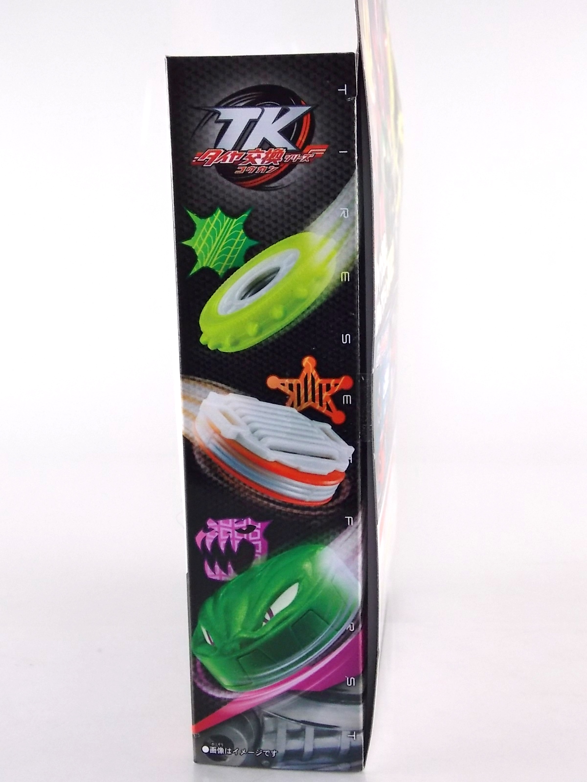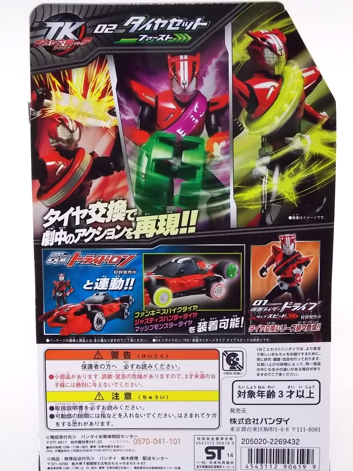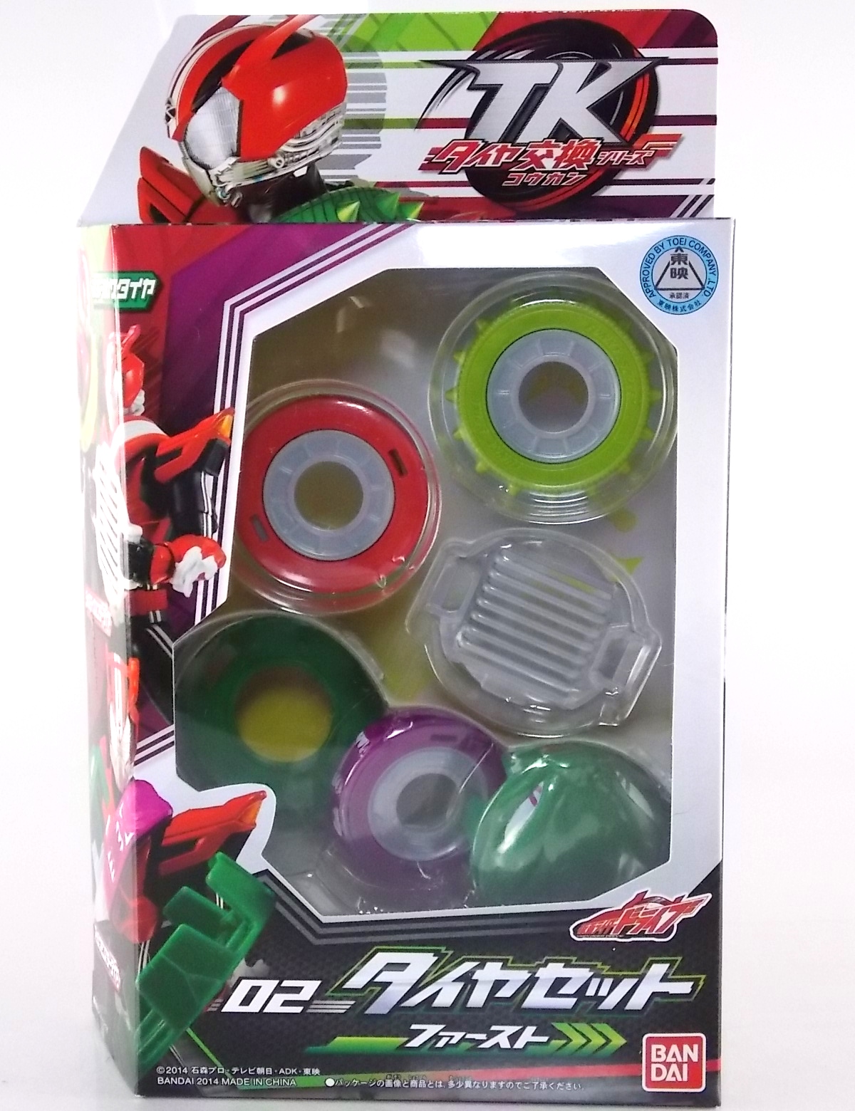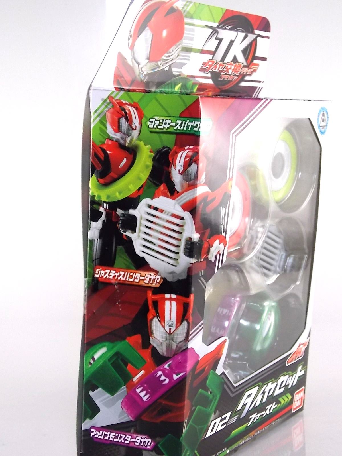 TokuNation returns to start your engine again! Following the very well received inaugural release in this toyline, TK-01 Drive Type Speed, Bandai has just released TK-02! This Tire set features 3 of Drive's handy Tires for different situations. Funky Spike, Just Hunter, & Mad Monster! **Be sure to head over to our front page (or down below) and check my good pal Baltmatrix's video review of this set! Packaging Nothing new to report here since Drives release. The mass retail toylines don't tend to have the fancy bells and whistles of Bandai's collector lines but they get the job done. Yet again this box is very similar to that of an Arms Change albeit much slimmer as the Tires aren't nearly as cumbersome as Arms were. This will be a fairly short and simple review. As this set doesn't really include a figure but just accessories for one. Funky Spike Here we have quite the generic Tire. Funky Spike is easily the one dud in the line thus far. It's a fairly basic dully sculpted tire with what can generously be called spikes on it's outer edge. Frankly it does nothing. Use it as you see fit but it doesn't do anything of significance. Justice Hunter A step in the right direction. Justice Hunter reminds me a bit of a white walled tire on a classic muscle car. The tread's interesting on this one and the colors match Drive's default form quite well. Pegged onto the side of the tire is a grill like weapon called the Justice Cage. Meant to be a blunt weapon for beating Roidmudes the toy is pretty basic. Just an added accessory for more play value. Of course in the show it can become a large person sized cage but there's no way to replicate that in toy form. Massive Monster By far the most interesting tire in this set, or in fact the line thus far, is Massive Monster. Much like Justice Hunter, Monster has an accessory attached to it. Or rather is encased in one giant awesome accessory. Sculpted into the scaly green face of a monster. Remove the two green monster halves encasing the tire and you have the actual Massive Monster, an awesomely sculpted purple tire with a wicked little monster face on it. The two halves, literally just called Monster, make for a pair of almost Gekirin type weapons and can be used for biting attacks. This is by far the neatest tire in the set with the most creativity. Final Thoughts Clearly this set is really only a necessity if you own TK-01 Drive already. Without him the tires won't serve much purpose, unless you have DX Tridoron. Though the TK-02 set requires Drive himself, it's a relatively rewarding set. I'm satisfied with my purchase for Massive Monster alone. Though the other included tires leave much to be desired I've walked (or rather drivem) away happy.
