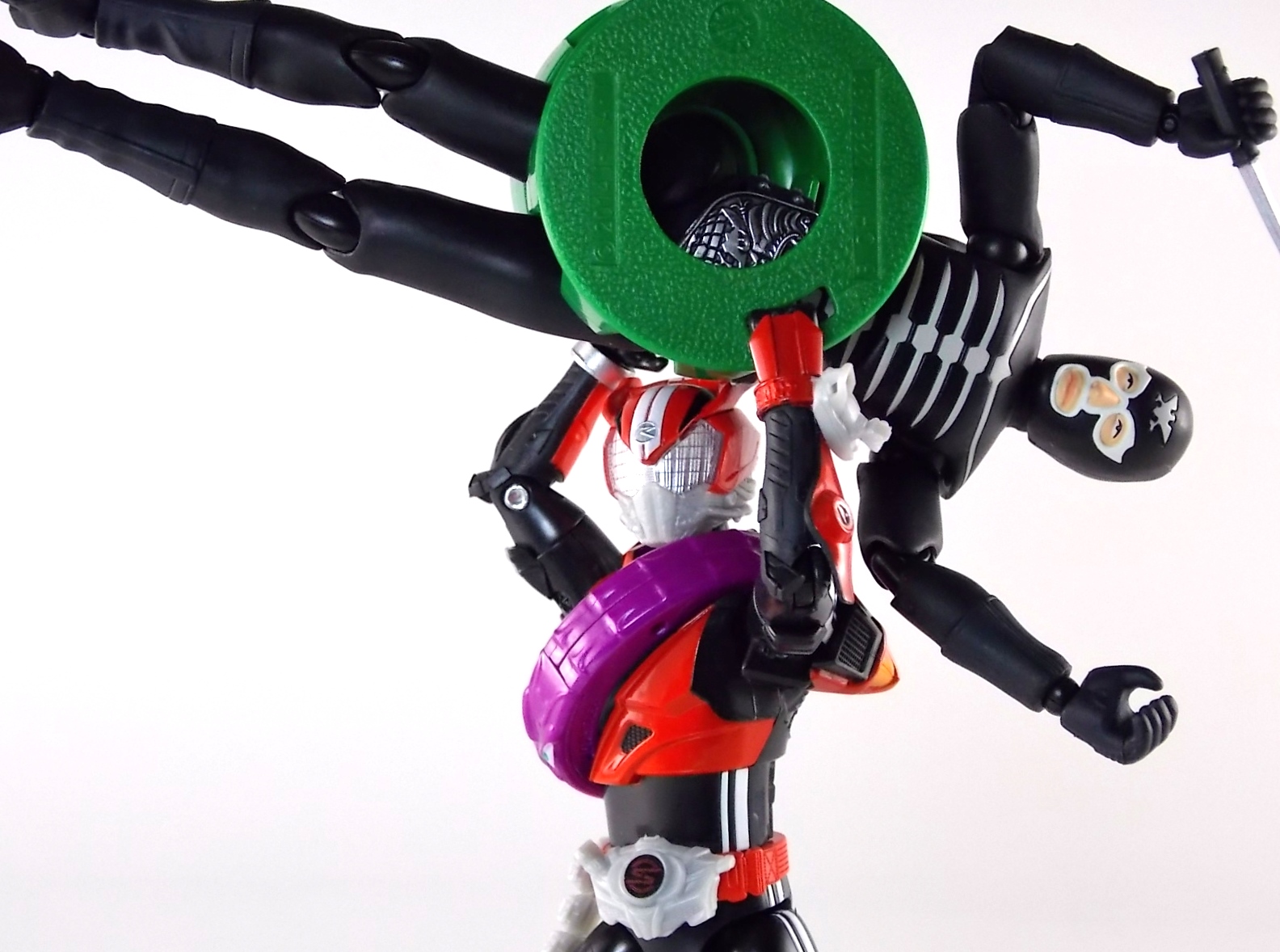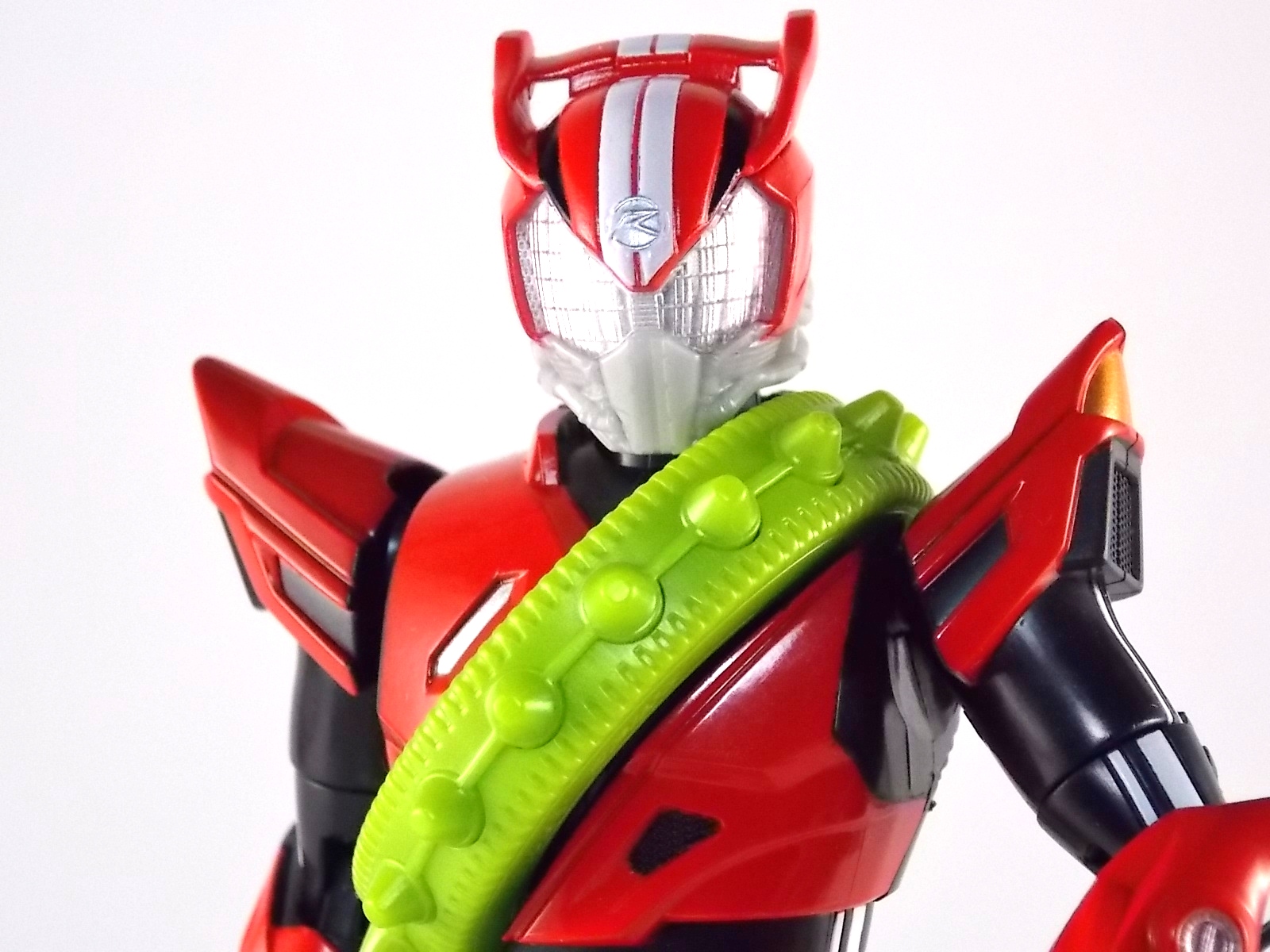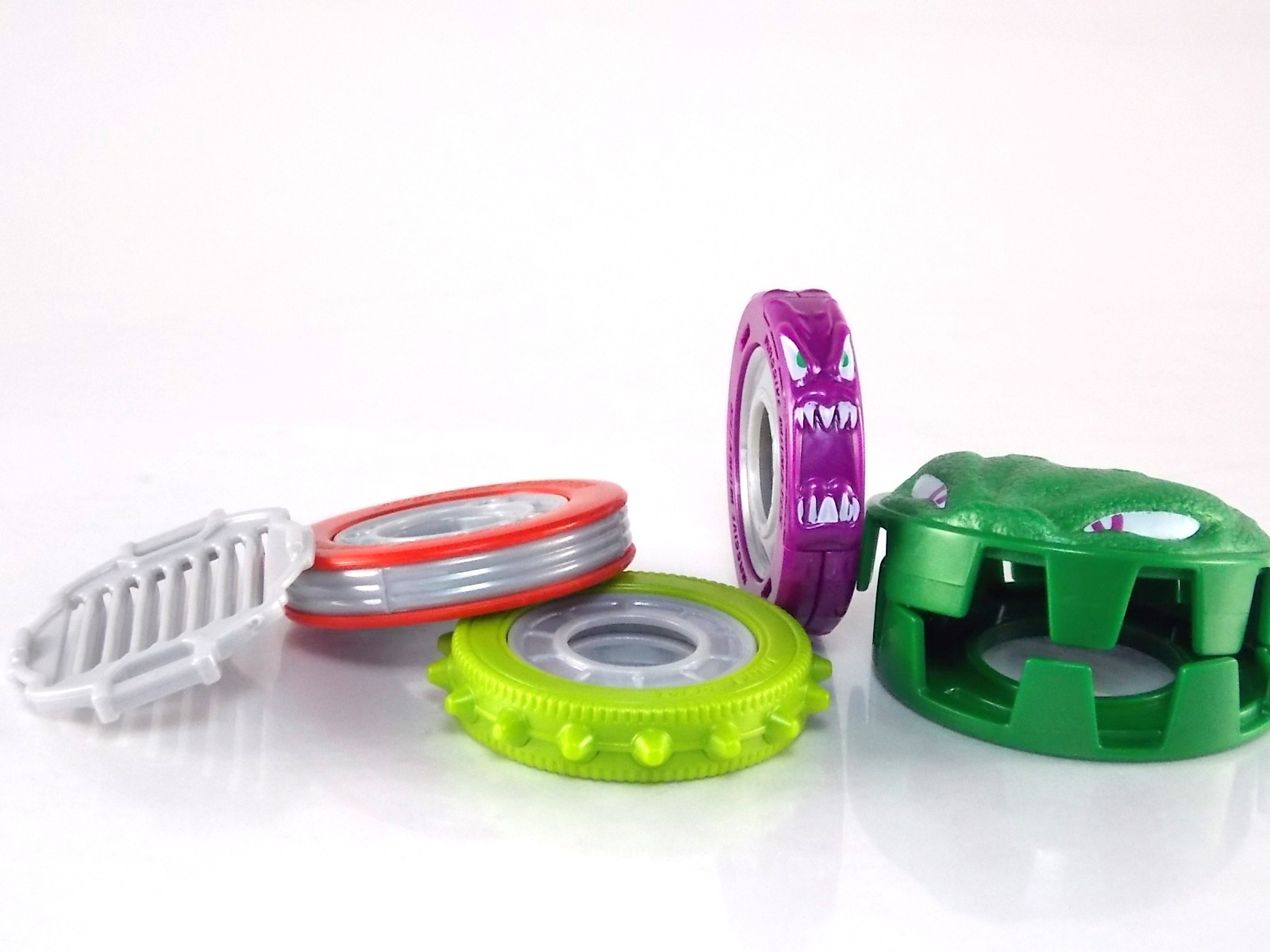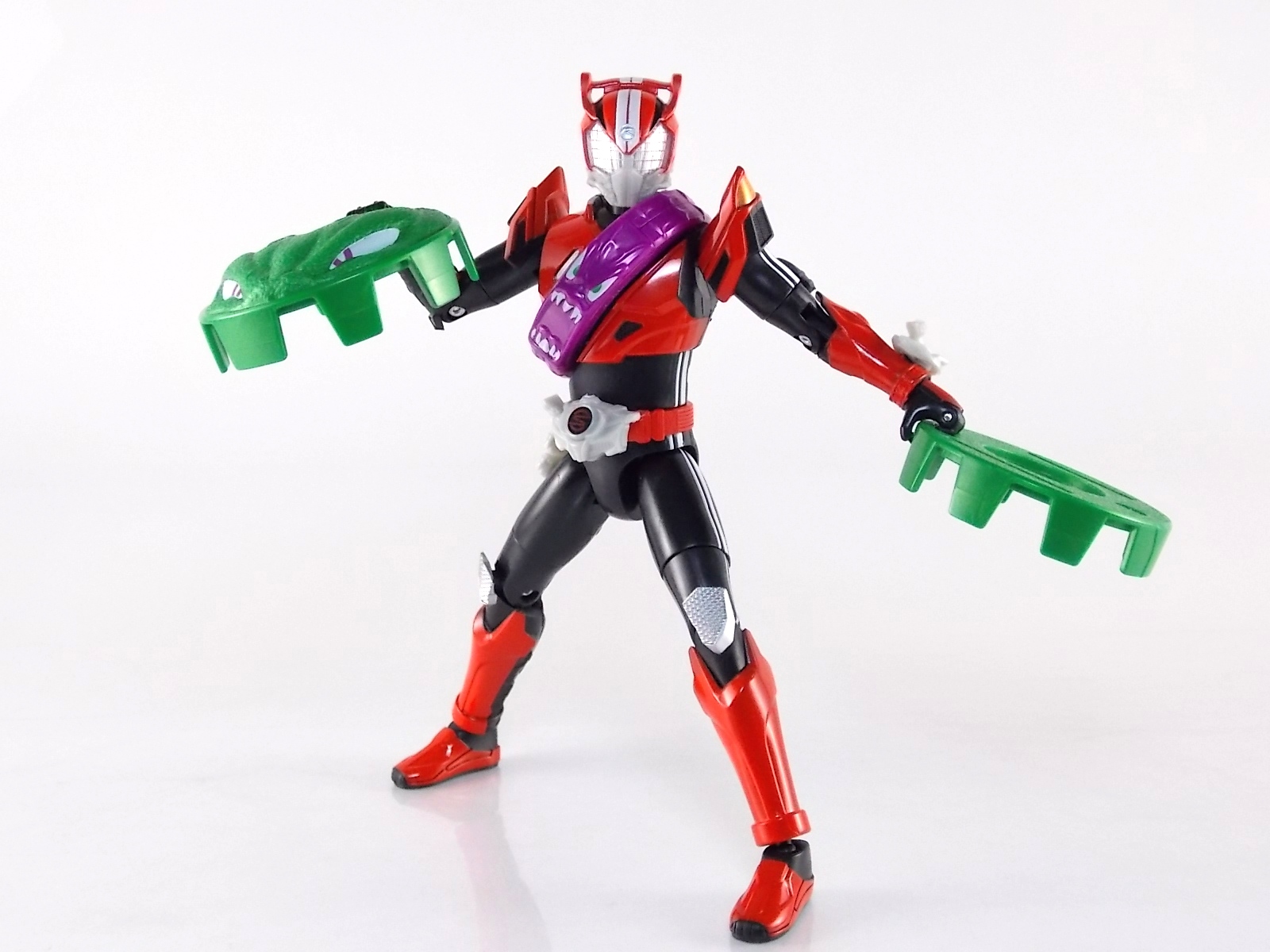 TokuNation returns to start your engine again! Following the very well received inaugural release in this toyline, TK-01 Drive Type Speed, Bandai has just released TK-02! This Tire set features 3 of Drive's handy Tires for different situations. Funky Spike, Just Hunter, & Mad Monster! **Be sure to head over to our front page (or down below) and check my good pal Baltmatrix's video review of this set! Packaging Nothing new to report here since Drives release. The mass retail toylines don't tend to have the fancy bells and whistles of Bandai's collector lines but they get the job done. Yet again this box is very similar to that of an Arms Change albeit much slimmer as the Tires aren't nearly as cumbersome as Arms were. This will be a fairly short and simple review. As this set doesn't really include a figure but just accessories for one. Funky Spike Here we have quite the generic Tire. Funky Spike is easily the one dud in the line thus far. It's a fairly basic dully sculpted tire with what can generously be called spikes on it's outer edge. Frankly it does nothing. Use it as you see fit but it doesn't do anything of significance. Justice Hunter A step in the right direction. Justice Hunter reminds me a bit of a white walled tire on a classic muscle car. The tread's interesting on this one and the colors match Drive's default form quite well. Pegged onto the side of the tire is a grill like weapon called the Justice Cage. Meant to be a blunt weapon for beating Roidmudes the toy is pretty basic. Just an added accessory for more play value. Of course in the show it can become a large person sized cage but there's no way to replicate that in toy form. Massive Monster By far the most interesting tire in this set, or in fact the line thus far, is Massive Monster. Much like Justice Hunter, Monster has an accessory attached to it. Or rather is encased in one giant awesome accessory. Sculpted into the scaly green face of a monster. Remove the two green monster halves encasing the tire and you have the actual Massive Monster, an awesomely sculpted purple tire with a wicked little monster face on it. The two halves, literally just called Monster, make for a pair of almost Gekirin type weapons and can be used for biting attacks. This is by far the neatest tire in the set with the most creativity. Final Thoughts Clearly this set is really only a necessity if you own TK-01 Drive already. Without him the tires won't serve much purpose, unless you have DX Tridoron. Though the TK-02 set requires Drive himself, it's a relatively rewarding set. I'm satisfied with my purchase for Massive Monster alone. Though the other included tires leave much to be desired I've walked (or rather drivem) away happy.