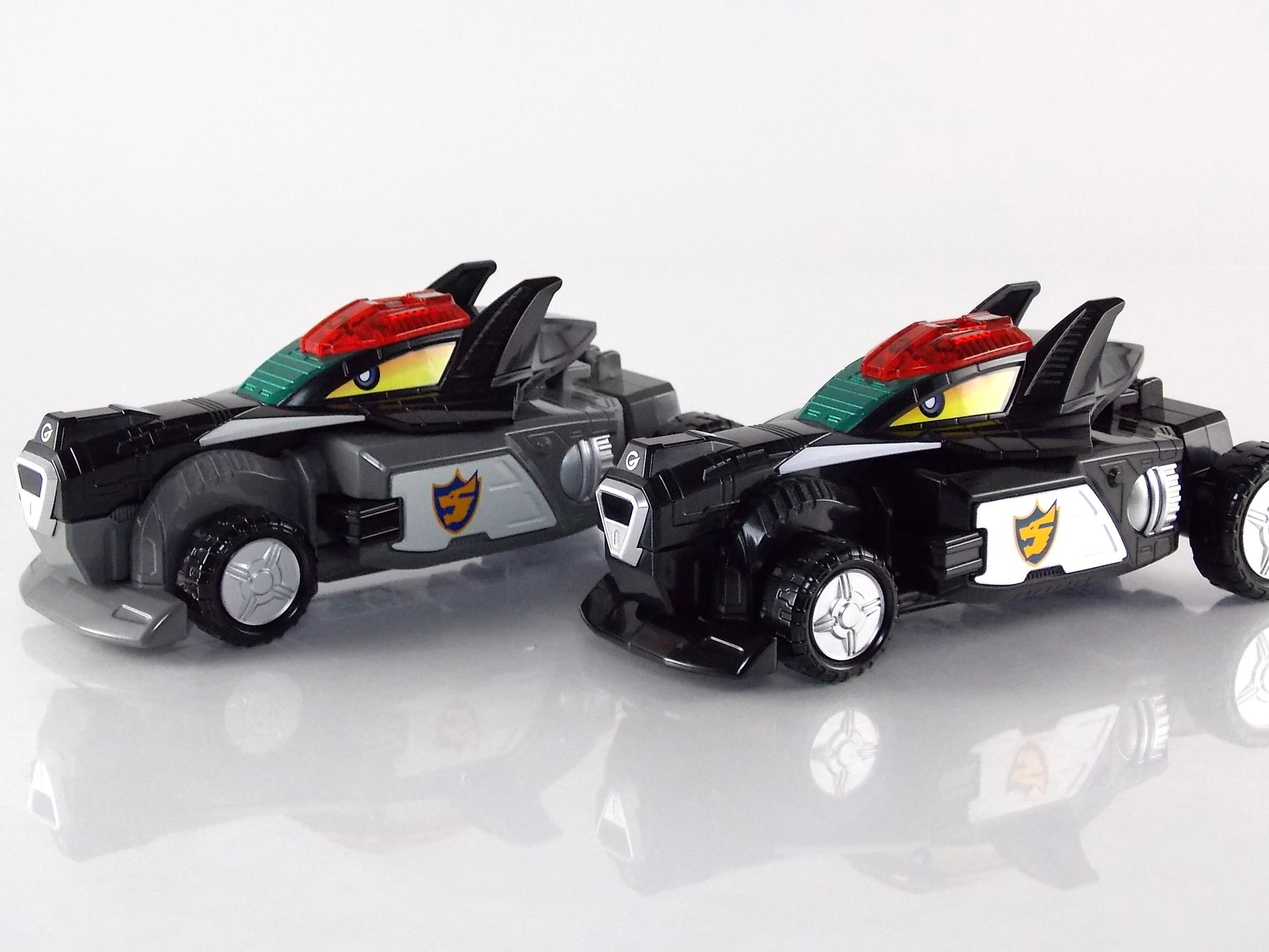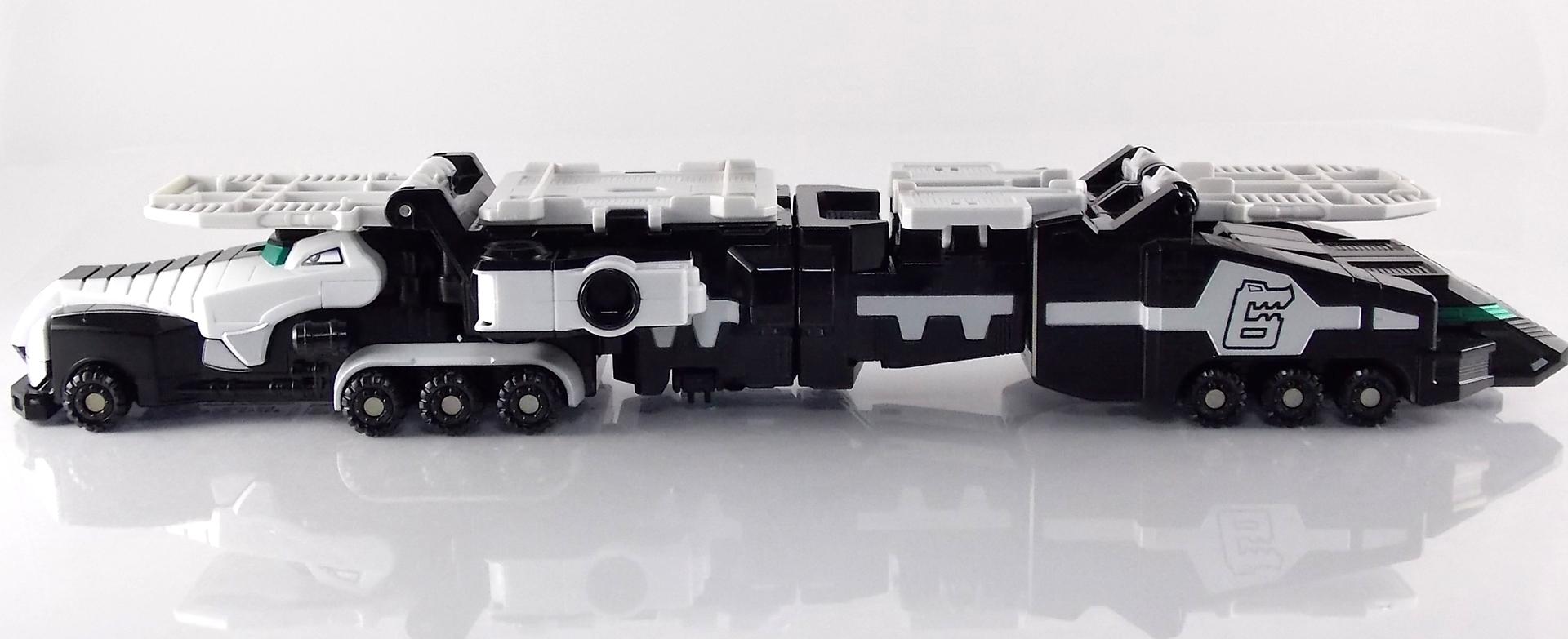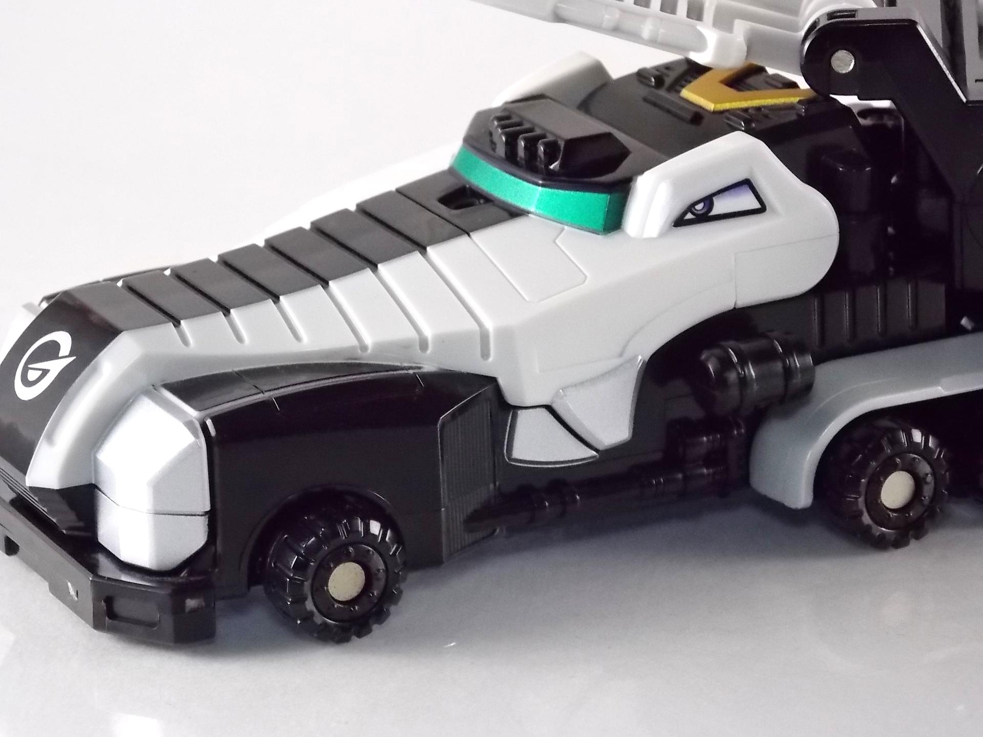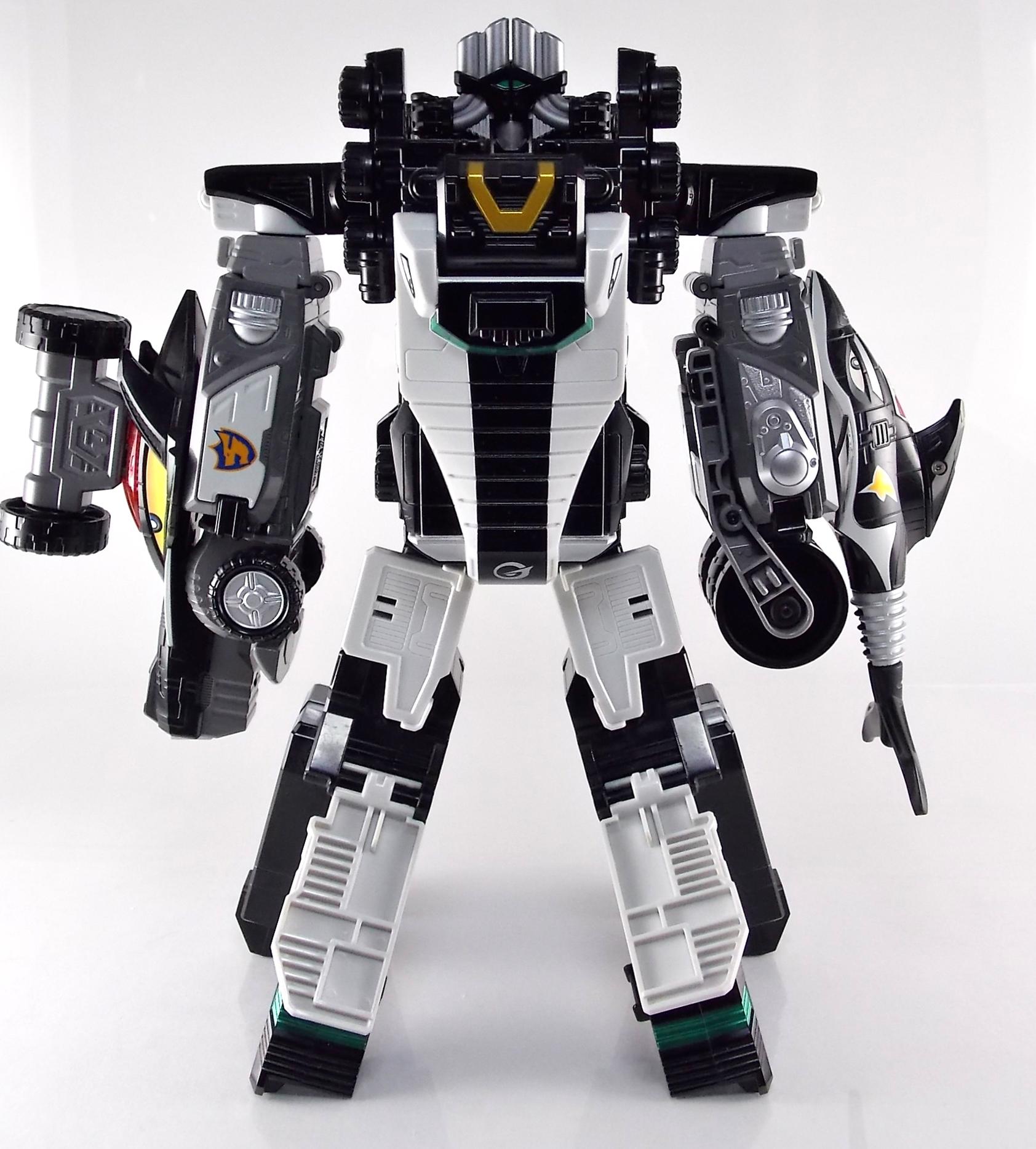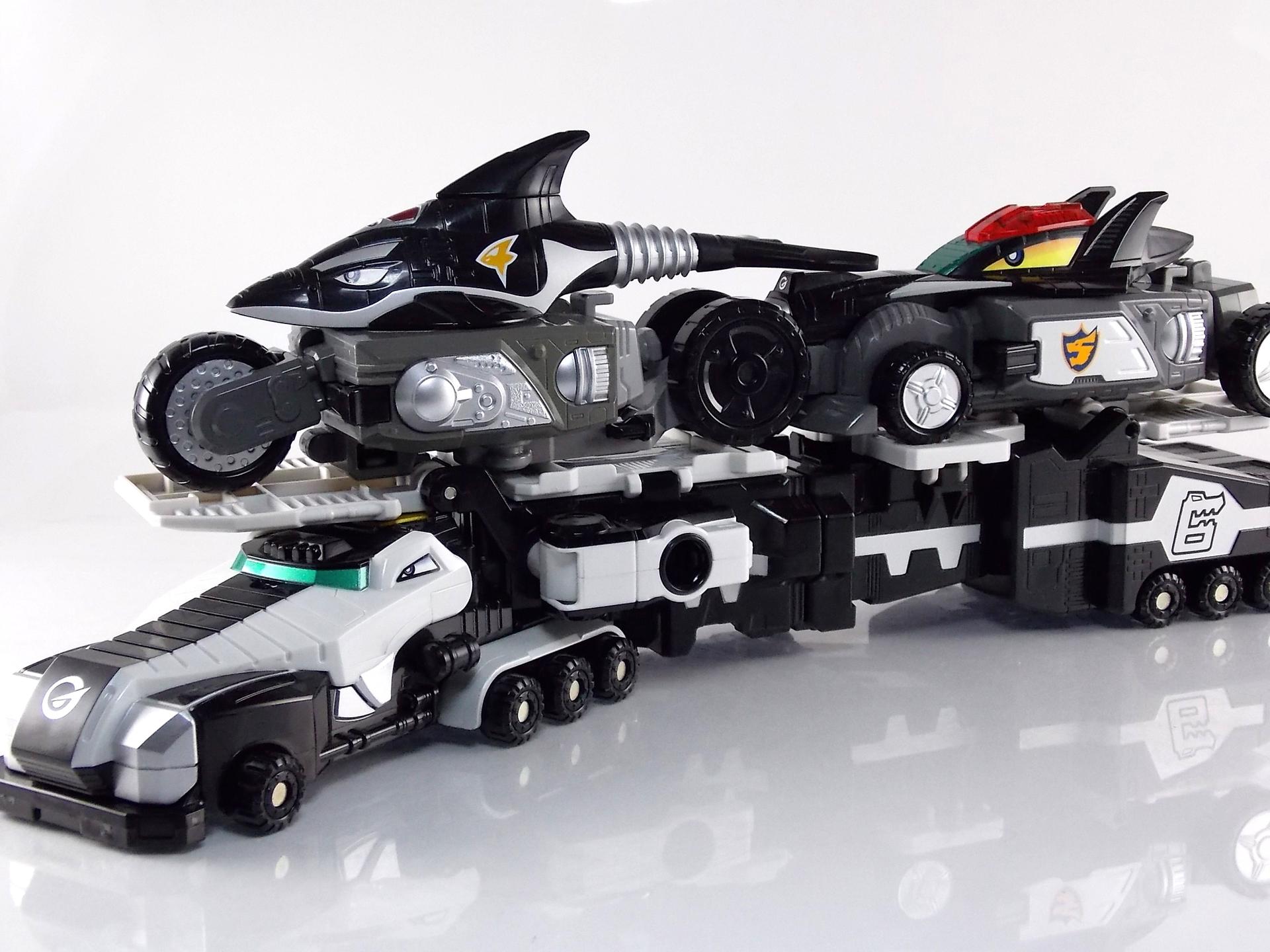 TokuNation is proud to present a long long overdue gallery. Rounding out our COMPLETE series of Engine Sentai Go-Onger DX mecha at last, we bring to you the DX Police Deco Gunbir-Oh! You may recall last year that for the entire month of July we took a look back at the entire Go-Onger toyline and posted galleries for each set and their various combinations. The elusive Toy Dreams Project Police Deco Gunbir-Oh was the final piece of the puzzle I'd been unable to attain until very very recently. Thankfully though I can finally share a full gallery of this wonderful set with the community! It should be noted that as a Toy Dreams Project release this is an entirely toy exclusive coloration. It's solely unique to this toy and has no basis in any show related material. Like basically all Toy Dreams Project releases. Packaging As a special release, Police Gunbir-Oh differs from the standard DX Gunbiroh in that it was sold as a complete 3-piece boxed set. The components of Gunbir Oh were originally sold in 3 individual boxes. As a limited Toy Dreams Project release it's only natural that these figures would be boxed together for sale. The box obviously has a bit more flare to it thanks to it featuring this new deco of Gunbir-Oh as well. It even advertises the altered G6 combination you can make with Engine Oh which is impressive. Birca DX Birca was originally in a mostly bright green color scheme with black for accents. For Police Deco Birca black has flipped from his base to replace all the green, while the base retains a flat gray color. The eyes have also been changed from bright yellow to white with blue pupils. The silver detailing and #4 emblem, as well as all 3 tires are largely unchanged. The Birca Engine Soul has also been changed to an opaque black plastic with a more "sparkly" foil like label on it. Gunpherd The least changed of the 3, Police Deco Gunpherd is only distinguishable from the original because of the gray used for his base. Otherwise it's nearly identical to the original DX Gunpherd. It's kind of understandable though as Gunpherd is already a police car and had the appropriate colors to begin with. It's a similar situation to the Gaohunter Blue Moon release with the mostly unchanged Gao Wolf & Hammerhead. The Gunpherd Engine Soul has also been changed to an opaque black plastic with a more "sparkly" foil like label on it. Carrygator DX Carrygator was a bright orange car carrying alligator robot. Now he's a sleek black & white Police Deco car carrying robot? Yeah alligator car carriers are still a little out there no matter what color they're in. By far this one looks the best of the trio. And oddly it has the easiest color swap. All of Carrygator's orange plastics and paint apps have been swapped for white. And since the basic figure is black with green accents already, boom you have a police gator that looks pretty damn snazzy. It really outshines the standard Carrygator. The Carrygator Engine Soul has also been changed to an opaque black plastic with a more "sparkly" foil like label on it. Gunbir-Oh & Combinations When all combined Police Deco Gunbir-Oh actually succeeds in being a far more cohesive looking robo than the standard version. These colors lend themselves very well to the individual vehicles as is but the combined form is incredibly appealing. The combined forms with the various other Engines benefit from this color change to an extent as well. The one form I was most excited to create with this set involved the DX Engine Dai Shogun. Though it isn't really an official combo nothing else would be either involving Police Gunbir-Oh either. Either way I think it's befitting that 2 repaints of Go-Onger mecha that aren't normally supposed to be combined with anthing, look pretty damn snazy together. It's by far my favorite thing to do with this set. But you can also still create the Engine Oh G6, G9. & G12 with this set as there are no mold differences with it, only color. And while the G6 combo looks fine, and perhaps G9, by the time you get to 12 all of the Police Deco parts are on the feet and don't mesh with anything else sadly. Final Thoughts At the end of the day DX Police Deco Gunbir-Oh is by far a superfluous thing to own. It's gorgeous in these colors don't get me wrong, I'm thrilled personally to have it. But you have to be a huge Go-Onger fan to seek this one out as it's a toy exclusive coloration. Worse yet is that in most cases it's prohibitively expensive, ranging as high as $150-200 on the aftermarket. I love this thing, more than regular Gunbir-Oh by far, but it's definitely for the ultimate Go-Onger collectors.